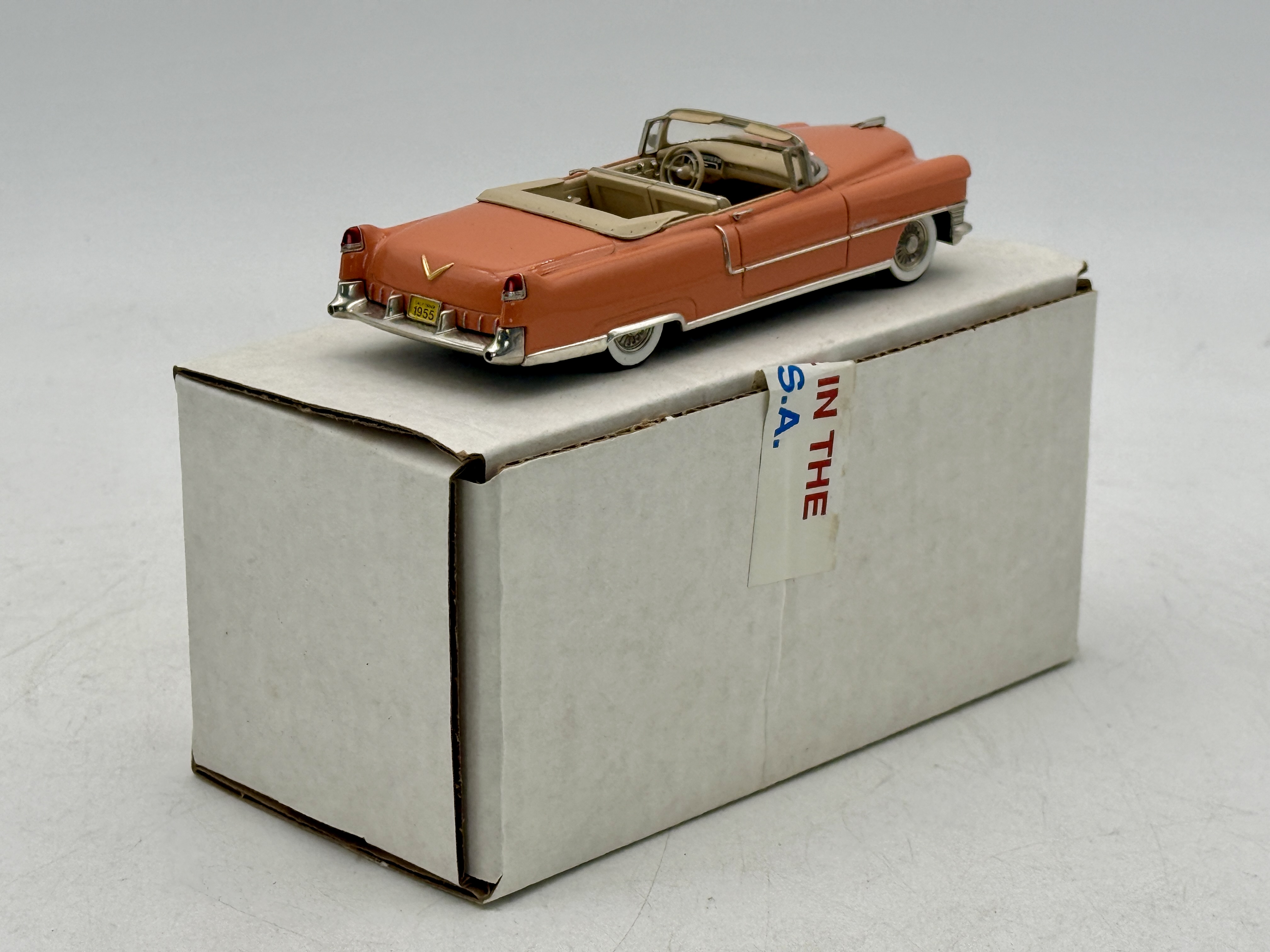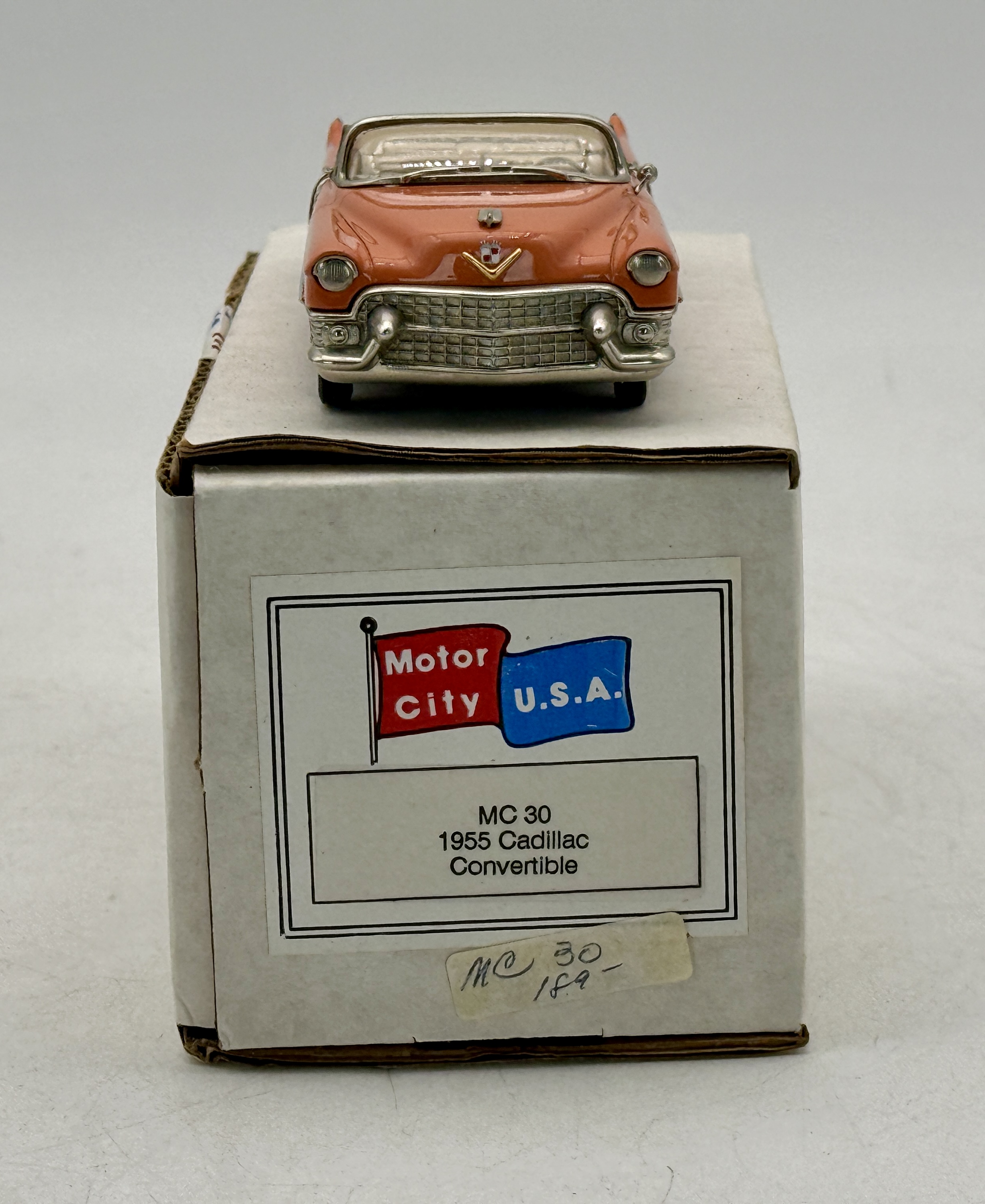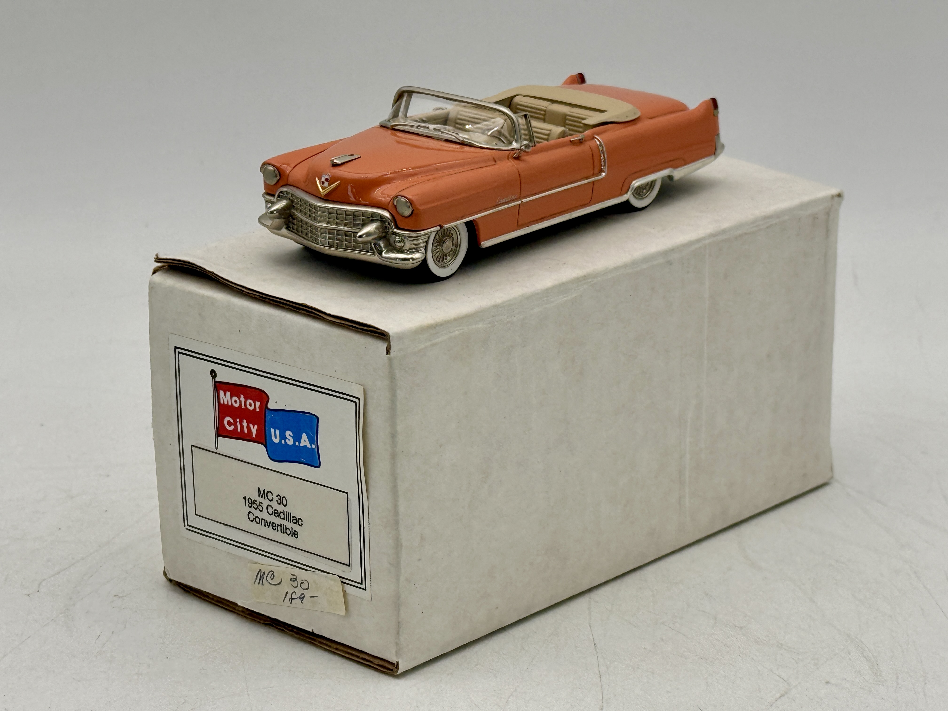 A salmon-colored Motor City U.S.A. MC 30 1955 Cadillac Convertible model car featuring a tan interior and its original white box. white metal, 1:43 scale. OB C9.