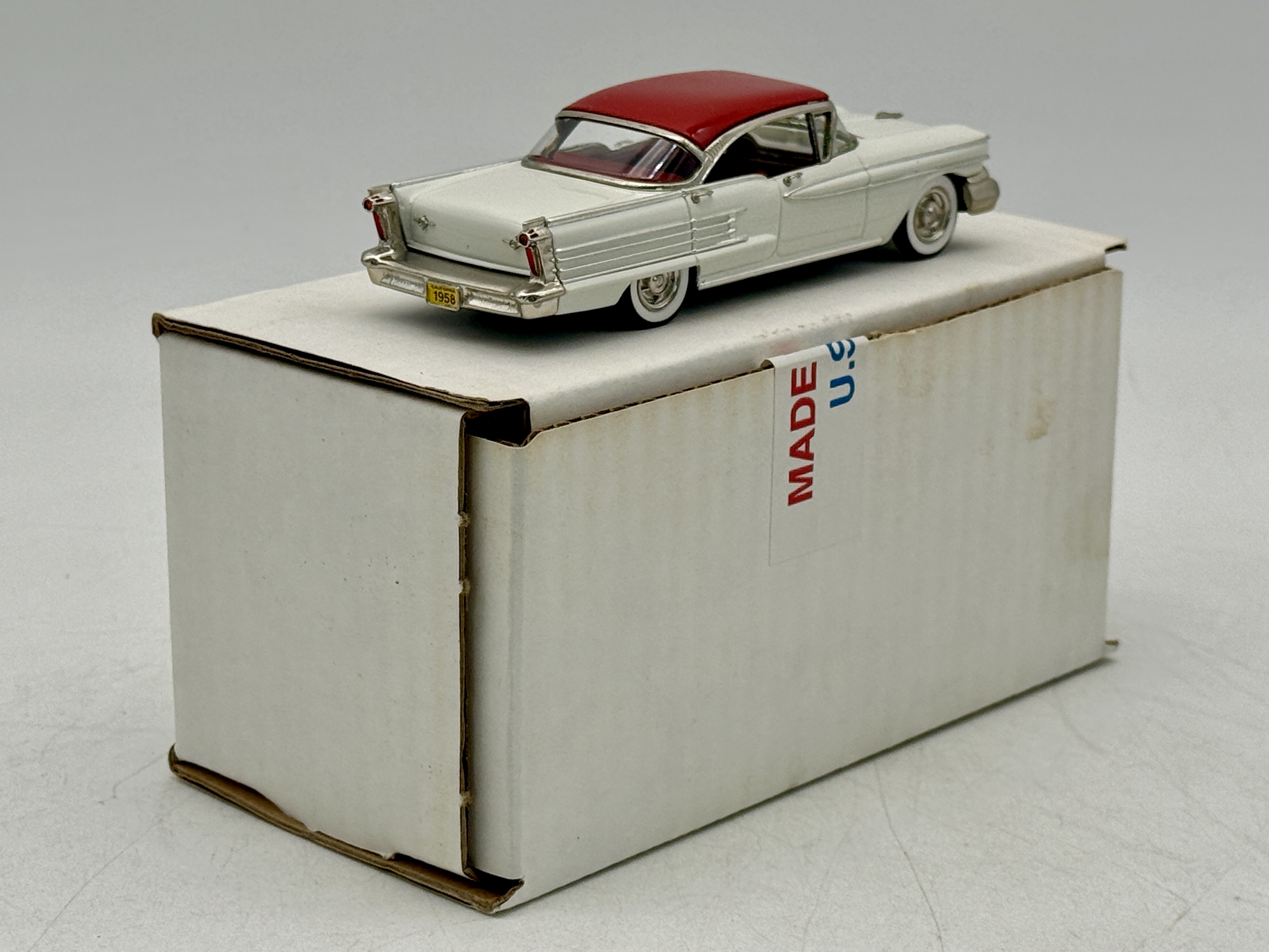 An American Models #10 1958 Oldsmobile 4-door hardtop model car featuring a white body and red roof, accompanied by its original labeled box. whitye metal, 1:43 scale. OB C9