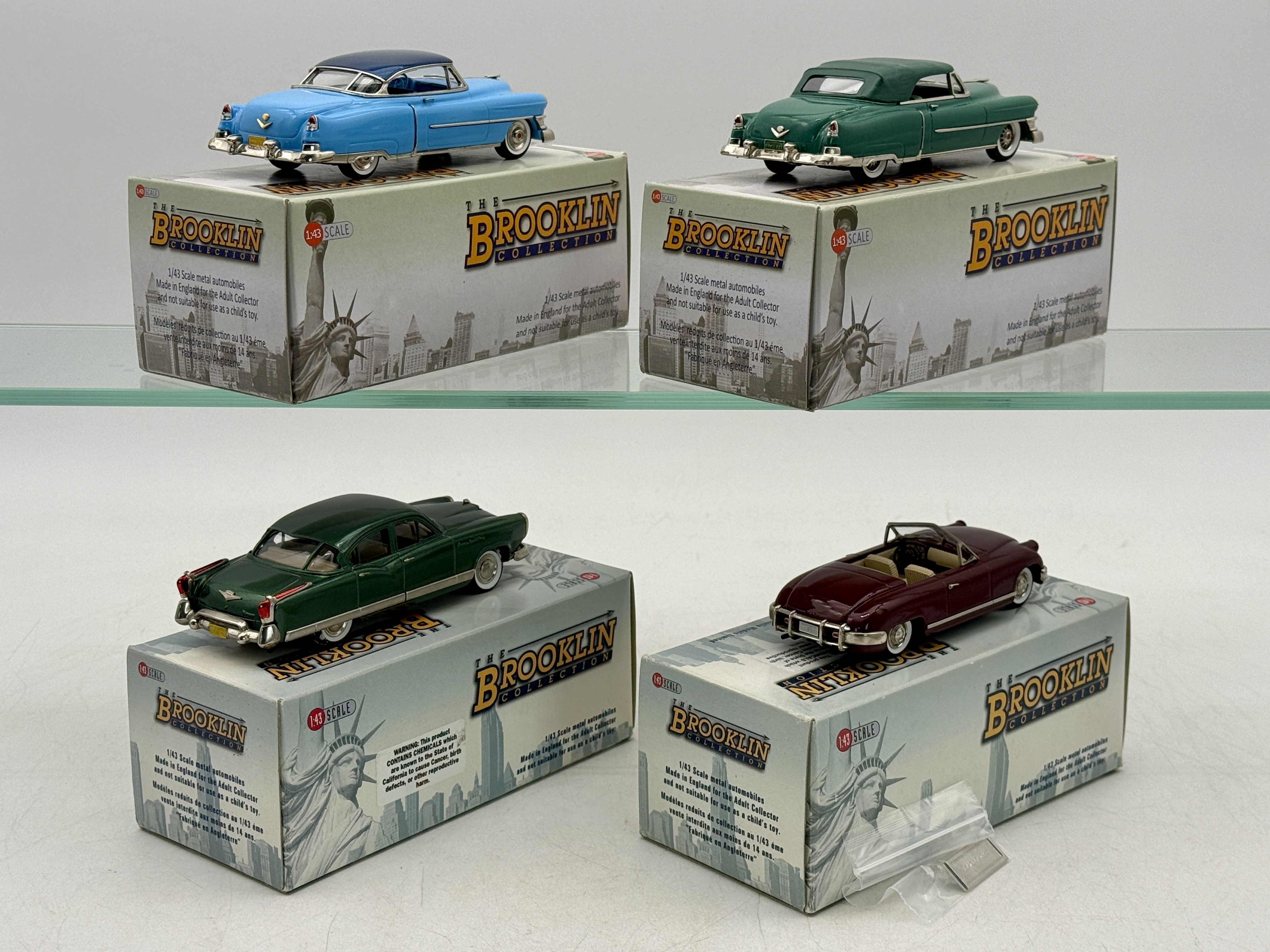 A collection of four 1:43 scale metal model cars including a 1952 Cadillac Series 62 Coupe de Ville BRK181, 1953 Cadillac Series 62 Convertible BRK165x (1 of 175), 1954 Kaiser Manhattan Four-Door BRK29B, and 1952 Muntz Jet Top Down BRK 101 with original boxes. OB’s C9.