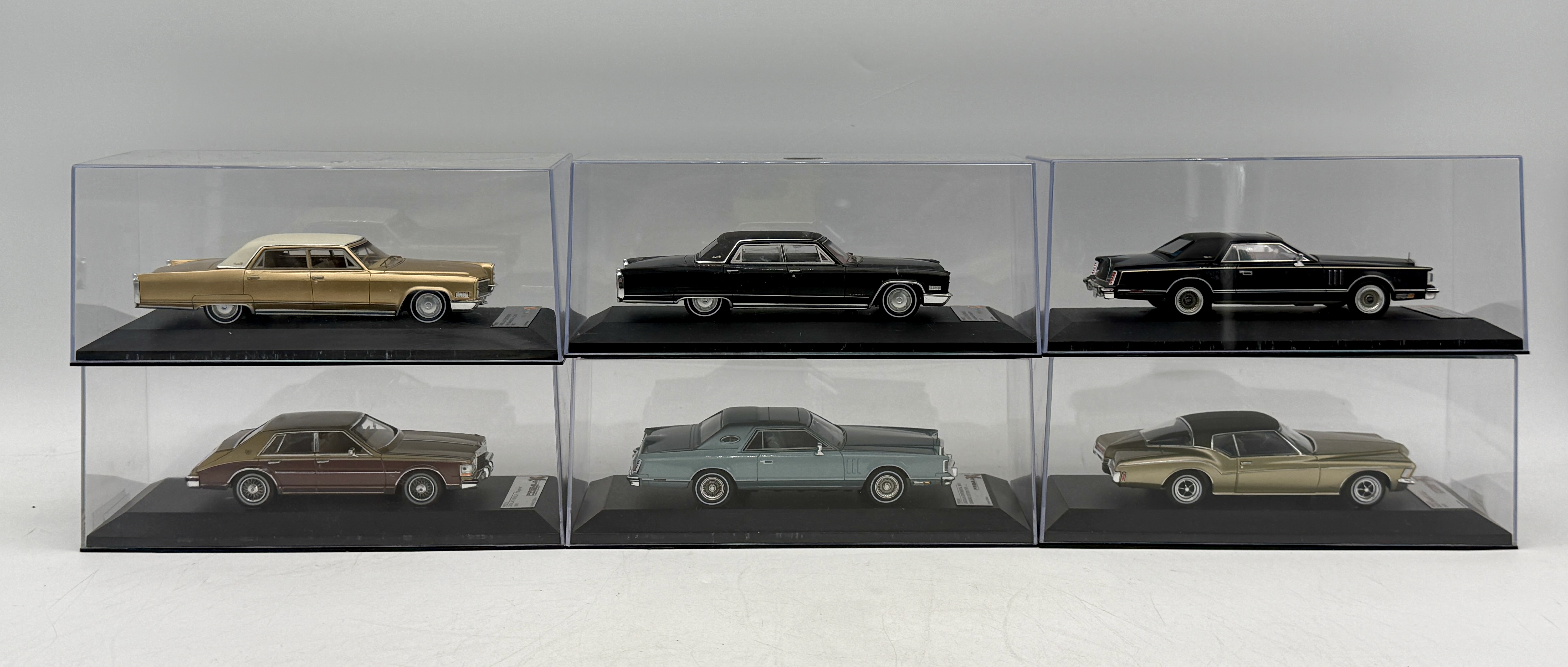Six resin, 1:43 scale model cars PR0013 1967 Cadillac, PR0001 1979 Lincoln, PR0012 1967 Cadillac, PR0070-1972 Buick, PR0025P 1979 Lincoln, PR0110 1980 Cadillac. OB’s missing cardboard sleeves, one plastic case is cracked. C8-9.