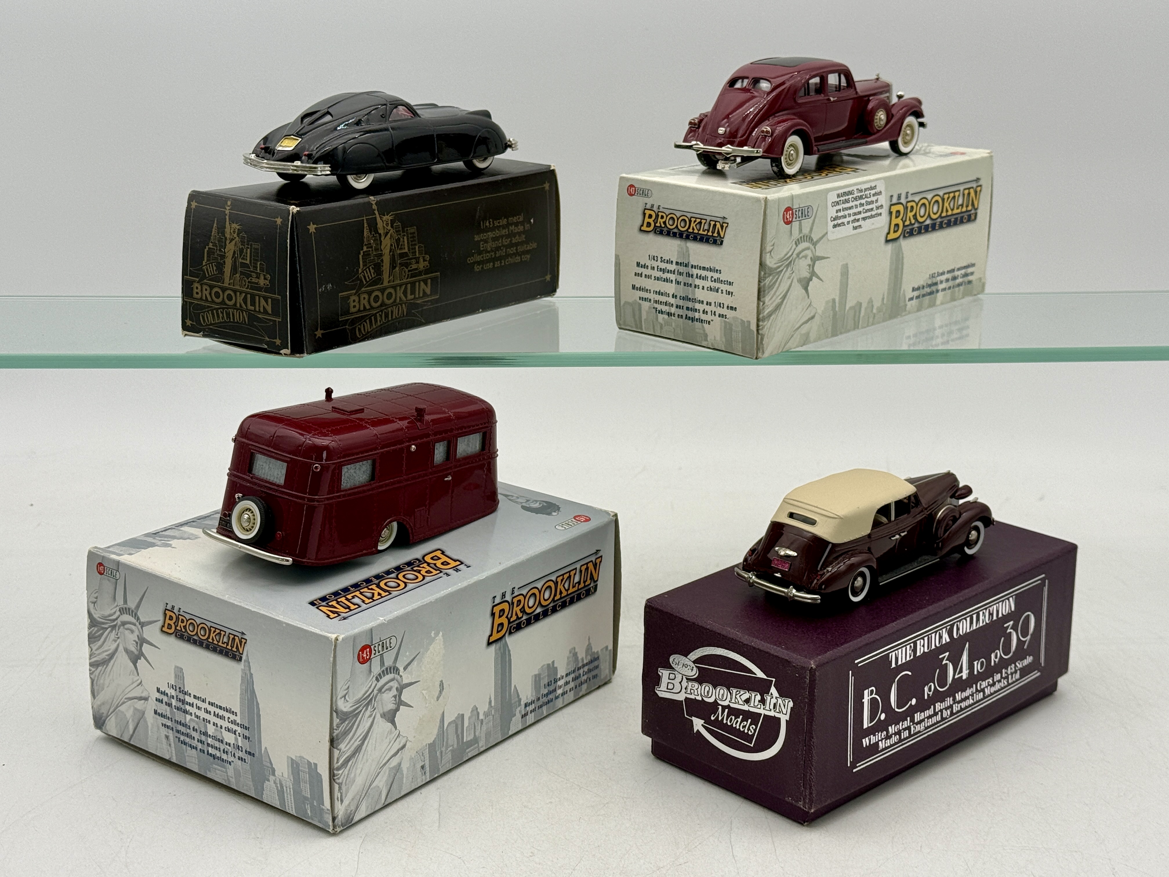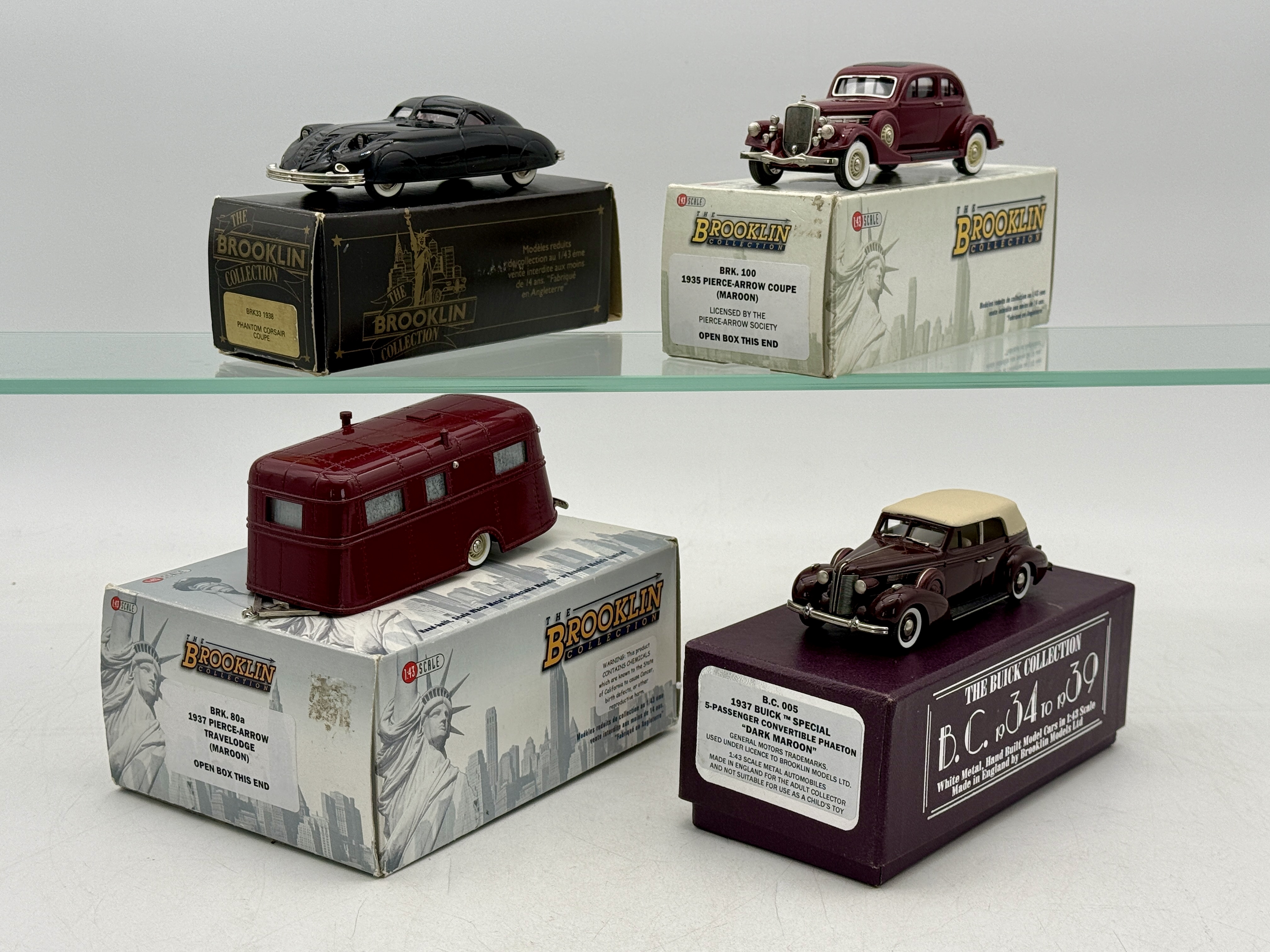 A collection of 4 maroon and black 1/43 scale white metal model vehicles including a BRK33 1938 Phantom Corsair, BRK100 1935 Pierce-Arrow Coupe, BRK80a 1937 Pierce-Arrow Travelodge, and BC005 1937 Buick Special Convertible Phaeton, all with original boxes. OB’s mw C9.