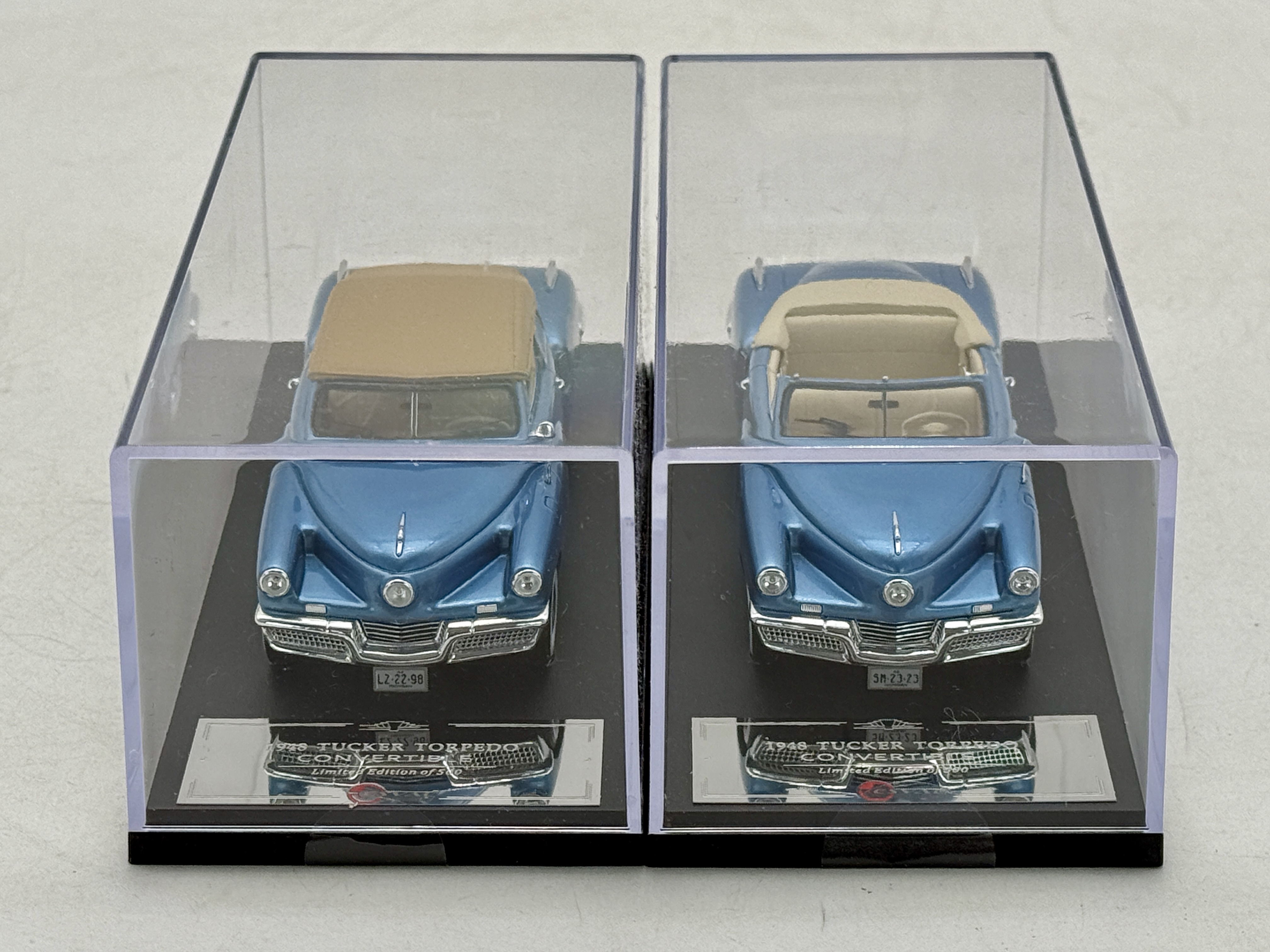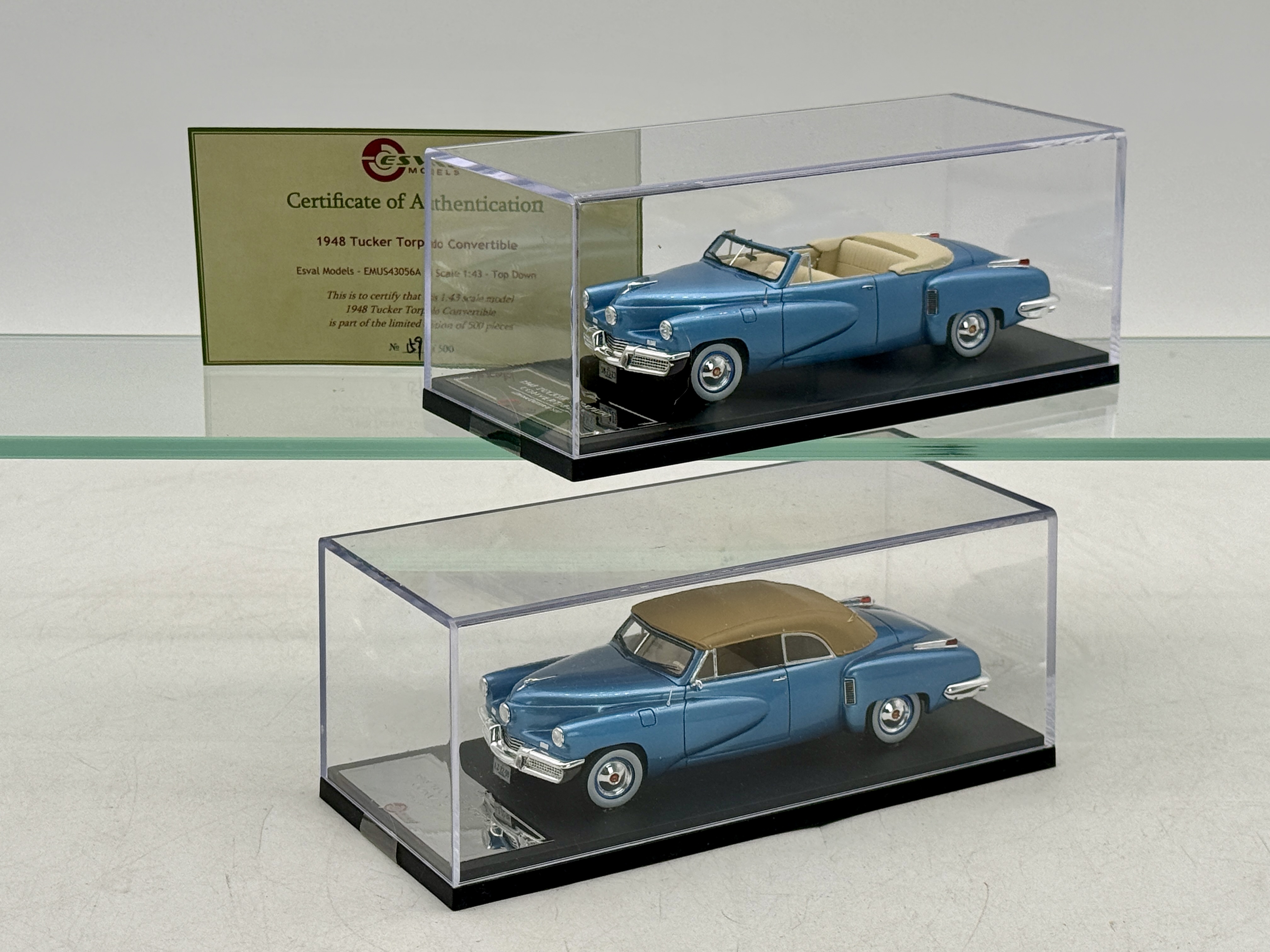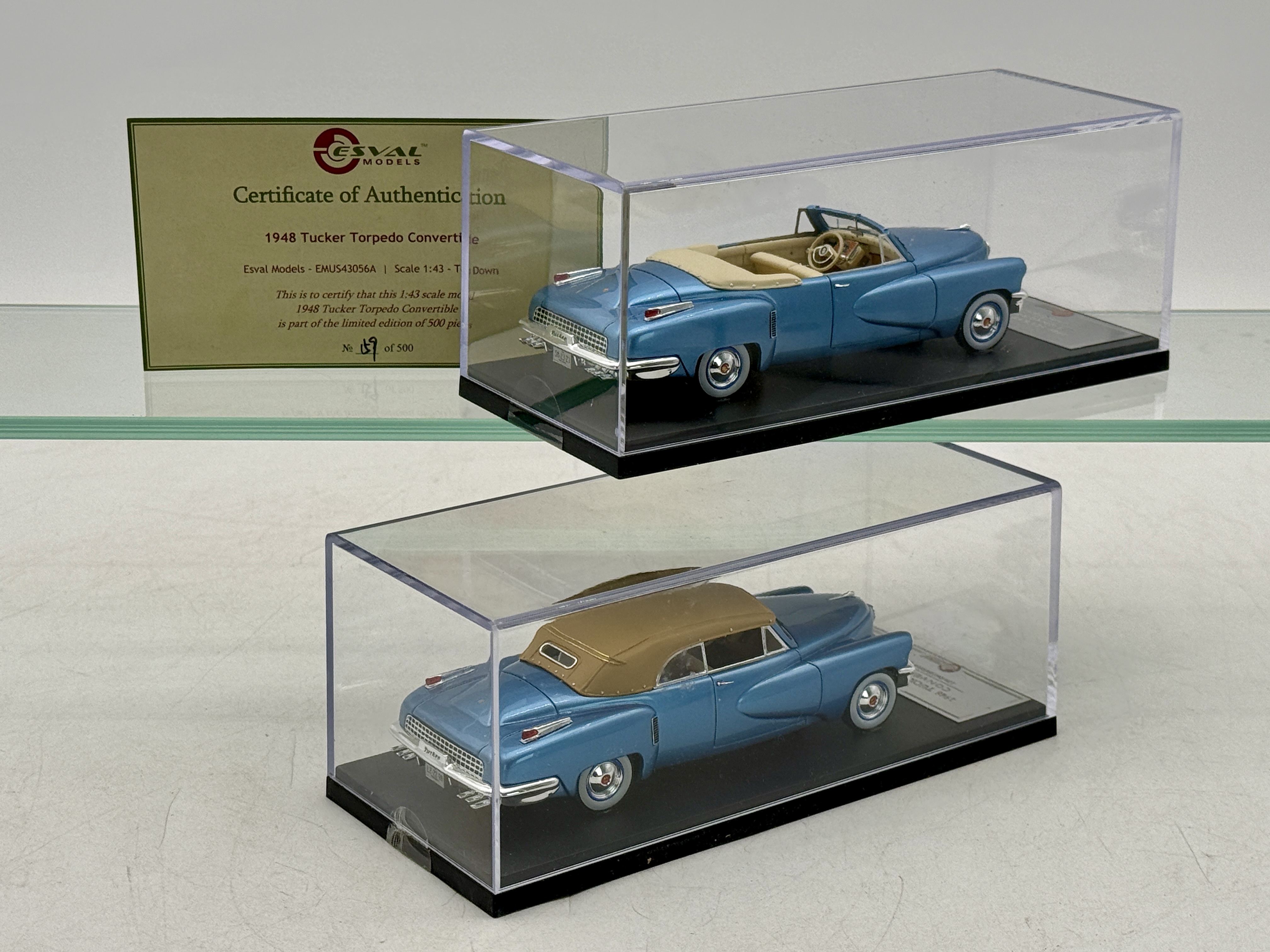 Two blue 1:43 scale 1948 Tucker Torpedo Convertible model cars by Esval Models, featuring one top-up and one top-down version, accompanied by a certificate of authenticity numbered 159 of 500. OB’s missing cardboard sleeves, C9.