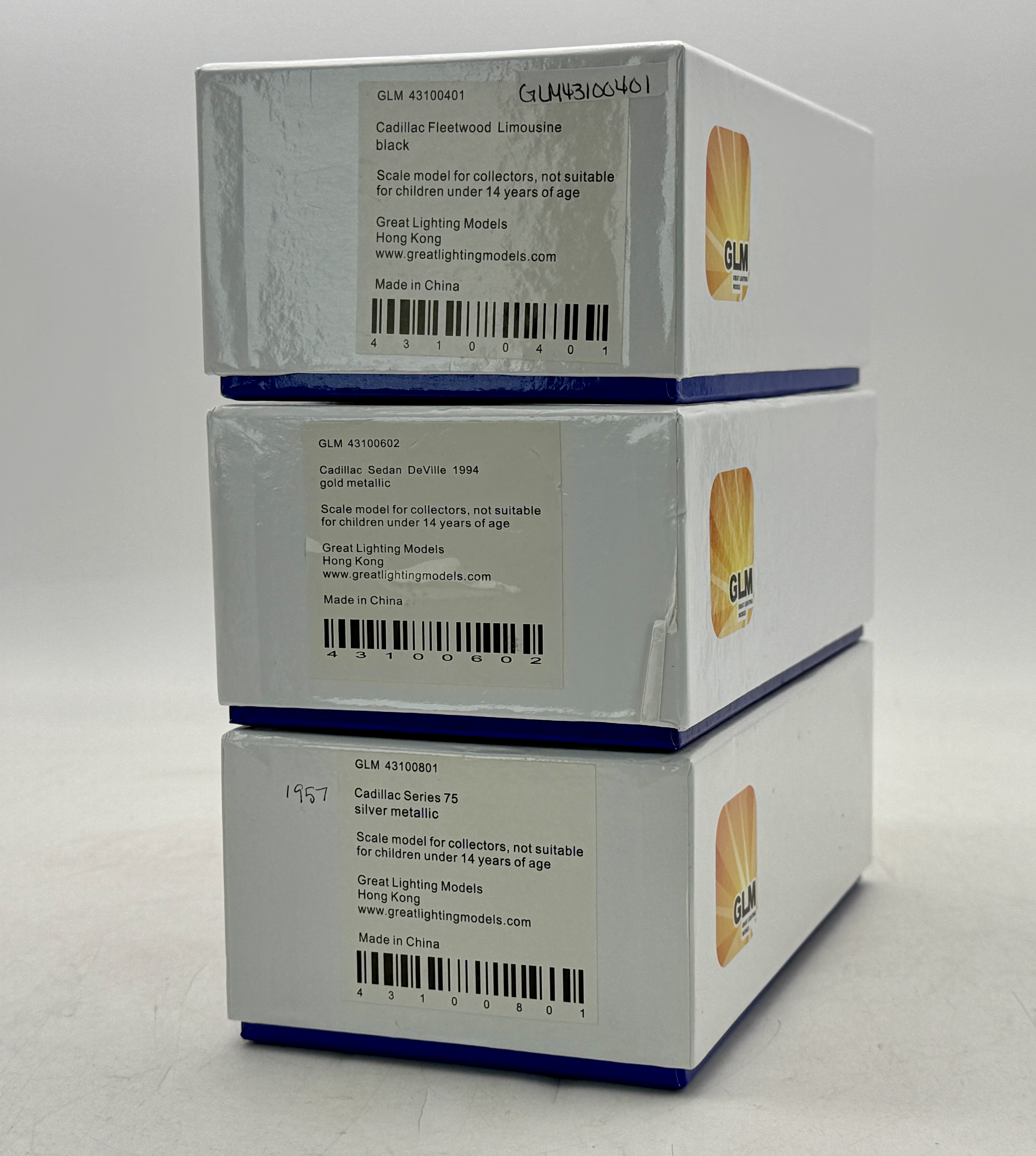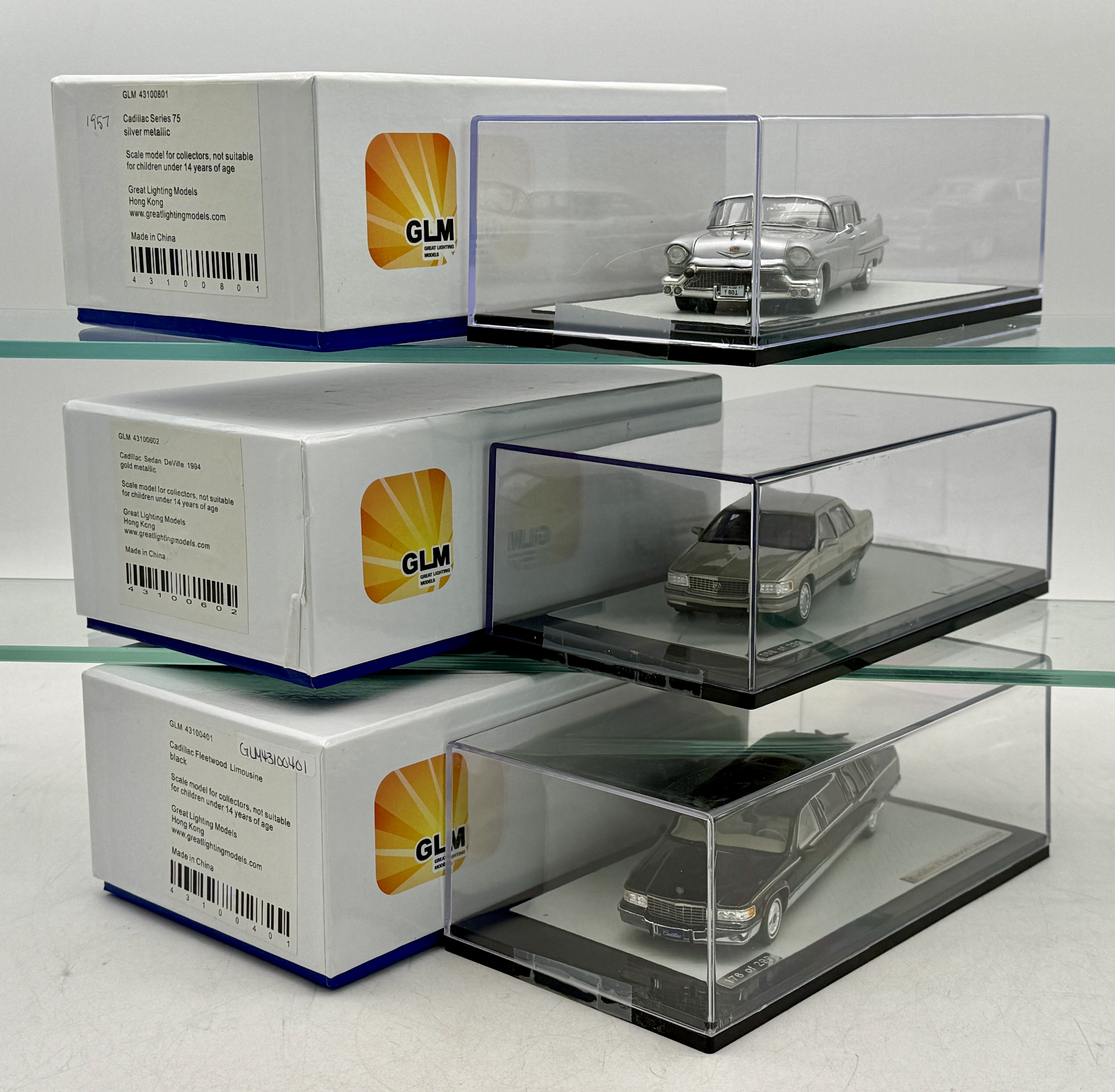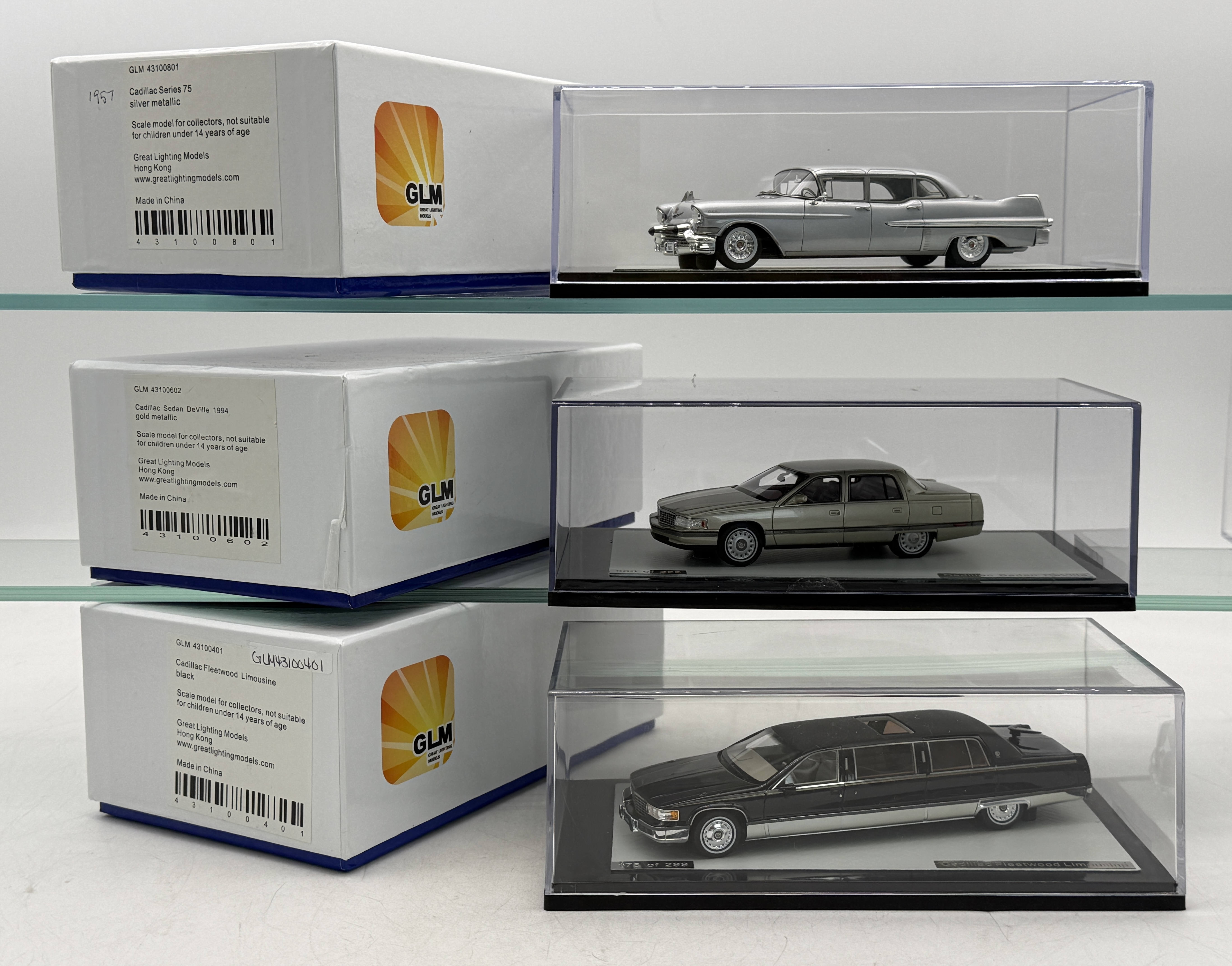 3 GLM 1/43 scale resin Cadillac models including 4310081 1957 Cadillac number 27 of 299, 4310002 1994 Cadillac sedan Deville number 80 of 299, 43100401 Cadillac limousine number 176 of 299 OB’s C9.