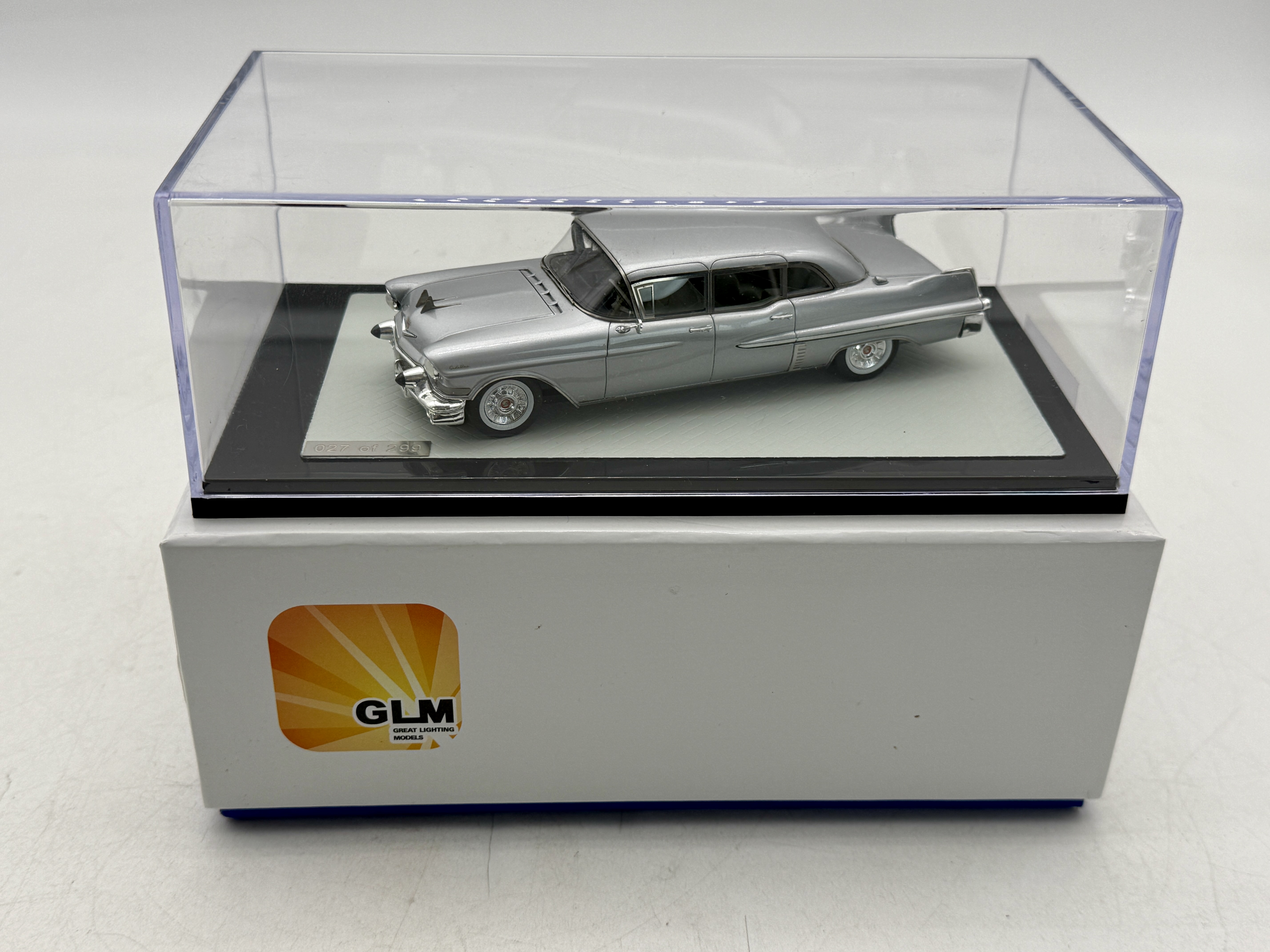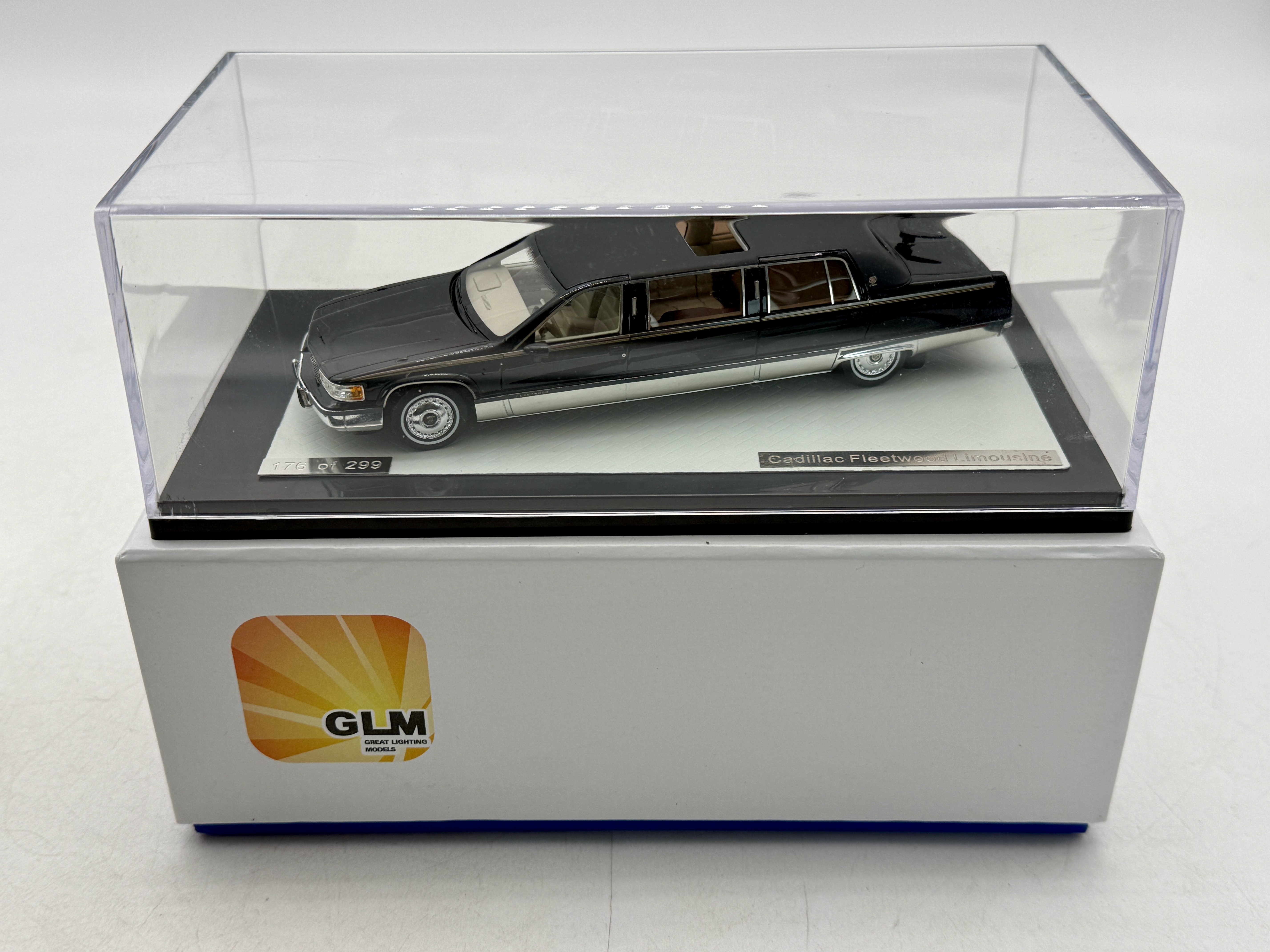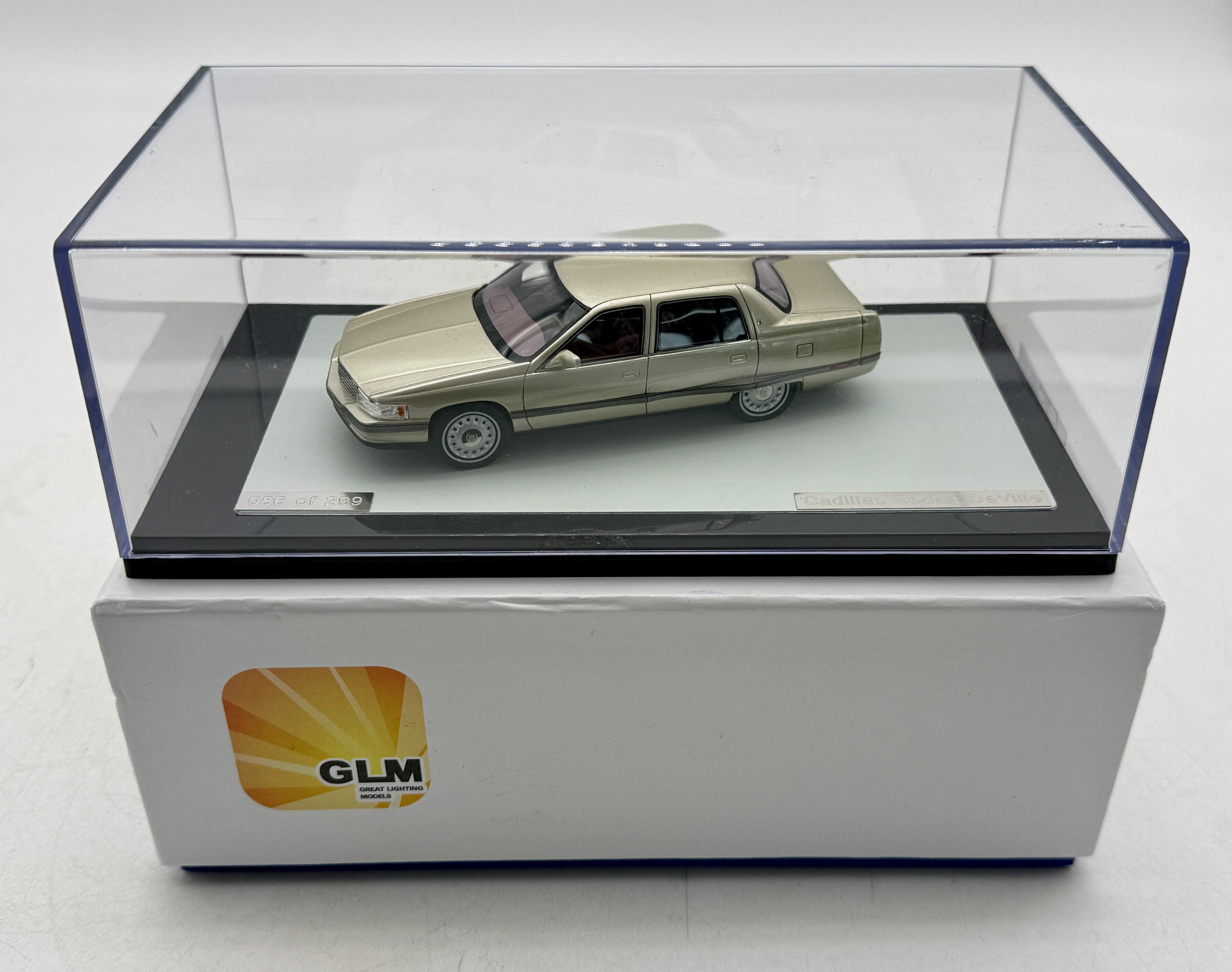3 GLM 1/43 scale resin Cadillac models including 4310081 1957 Cadillac number 27 of 299, 4310002 1994 Cadillac sedan Deville number 80 of 299, 43100401 Cadillac limousine number 176 of 299 OB’s C9.