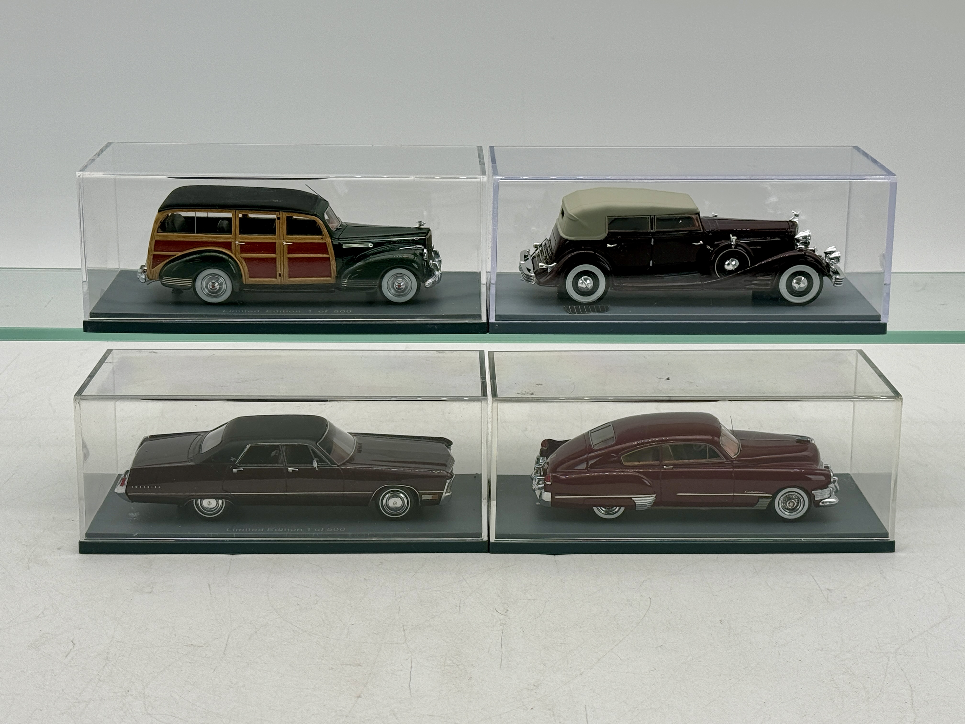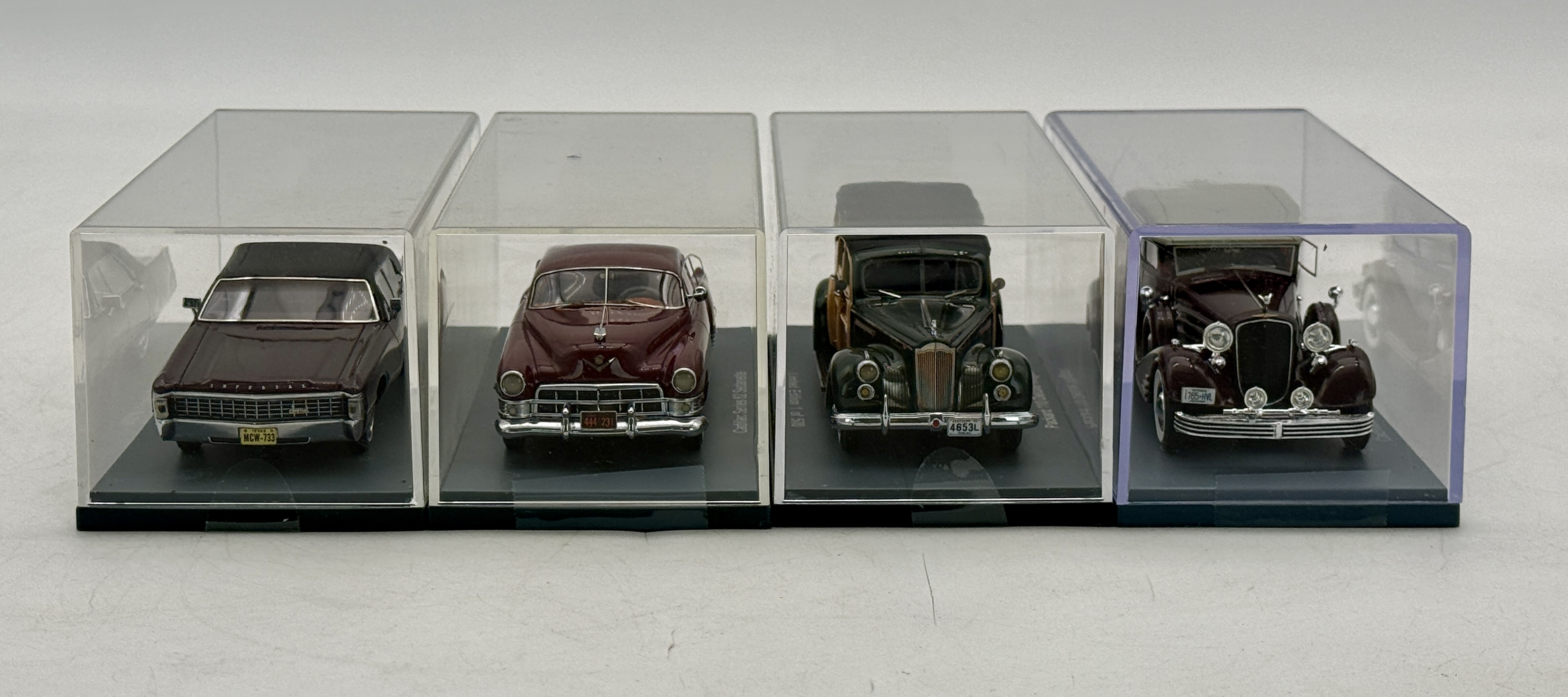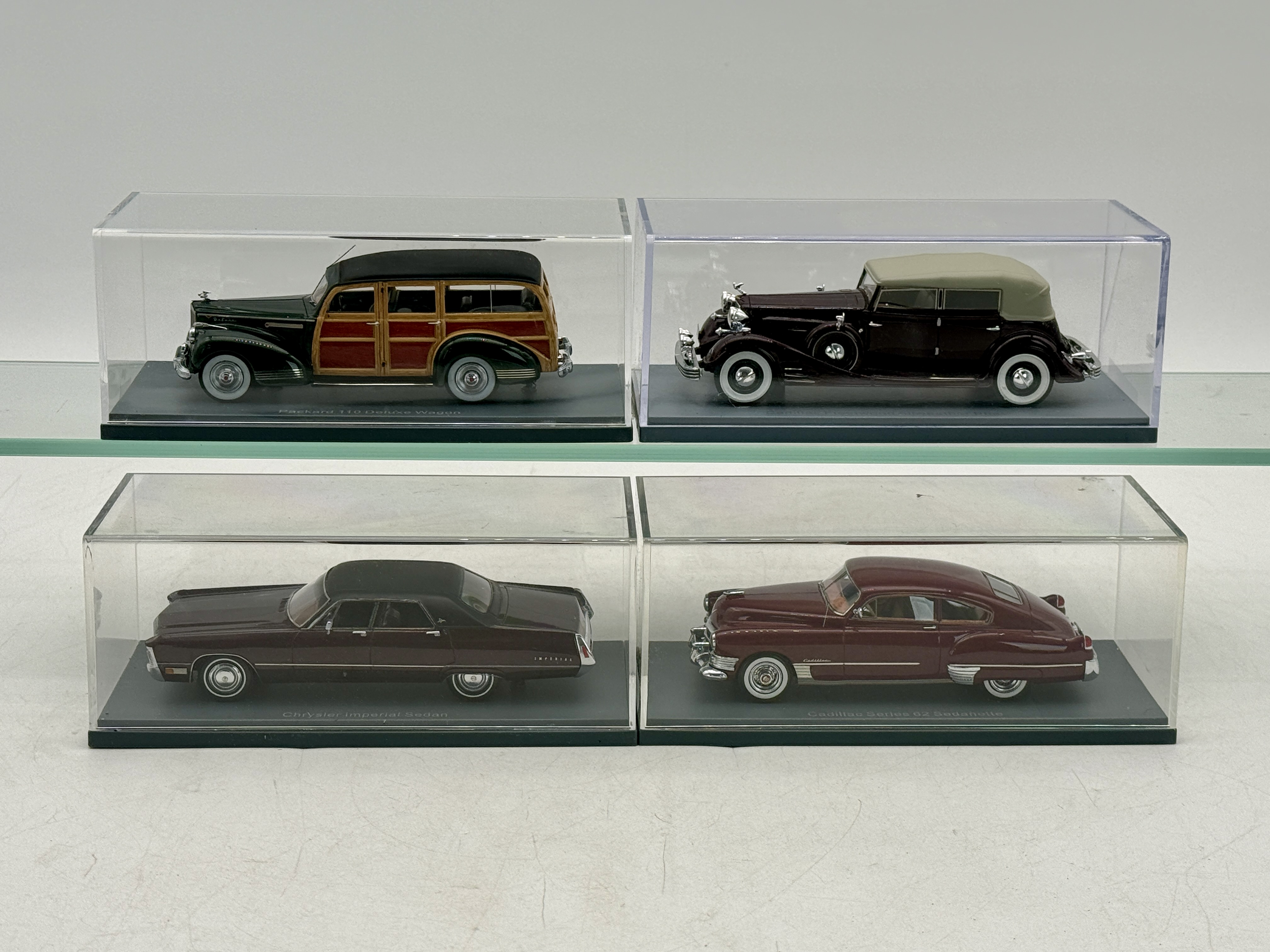 A collection of 1/43 resin scale model cars including a Packard Wagon, Cadillac Phaeton, Chrysler Imperial Sedan, and Cadillac Series 62 Sedanette, featuring limited edition markings and clear display cases missing cardboard sleeves, C9.