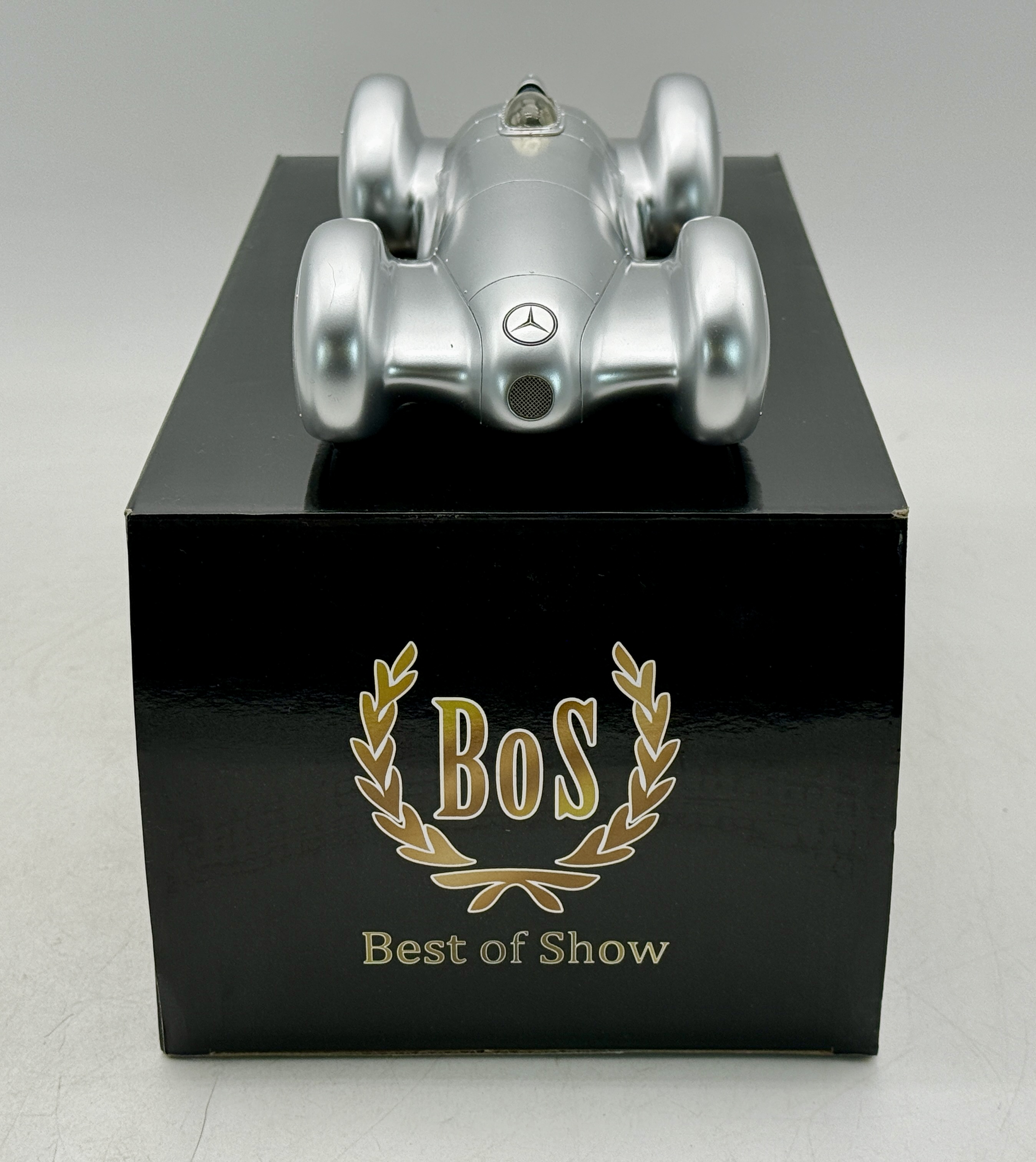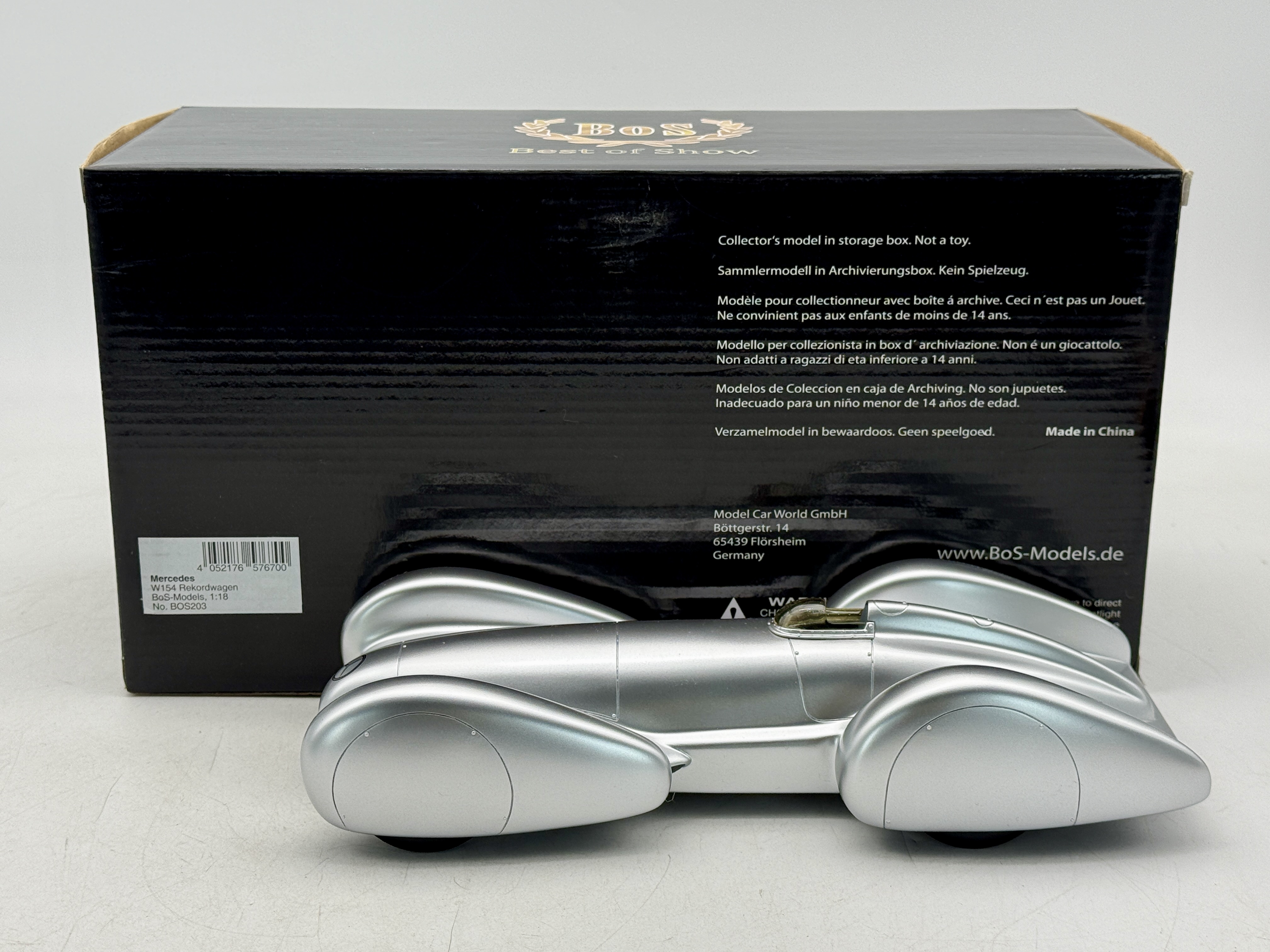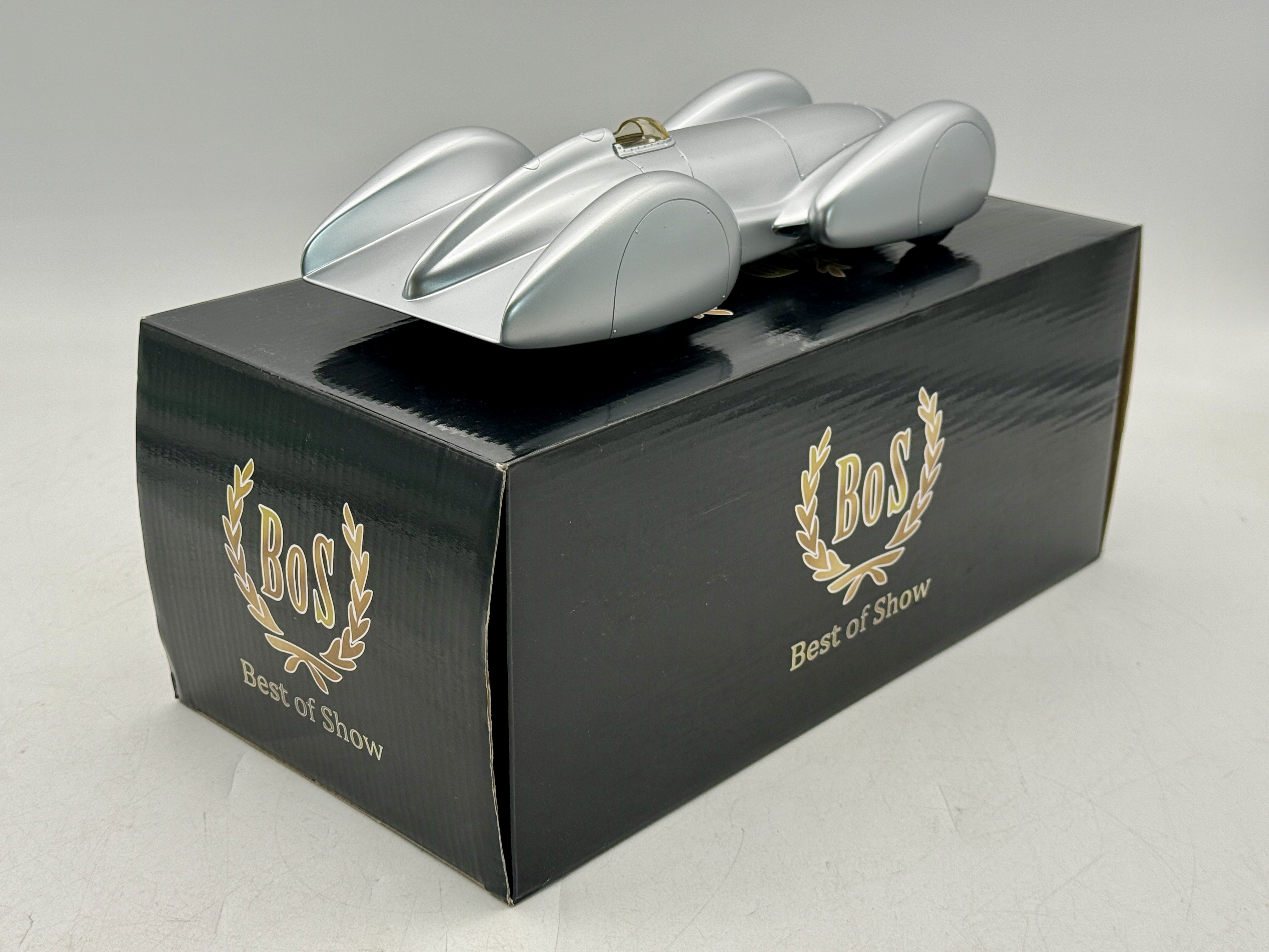 A silver 10 inch Mercedes-Benz W154 Rekordwagen model car by BoS-Models featuring the original black Best of Show collector box, #346 of 1000, C9.