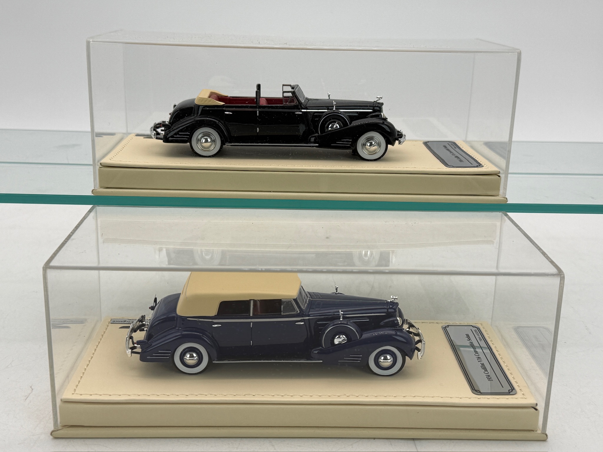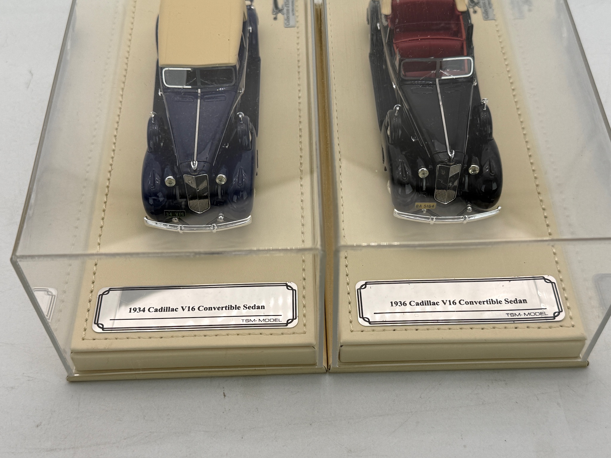 2 1:43 scale TSM-MODEL Collection d’Elegance resin models featuring a blue 1934 and a black 1936 Cadillac V16 Convertible Sedan in labeled display cases. In factory display box missing outer sleeve C9.