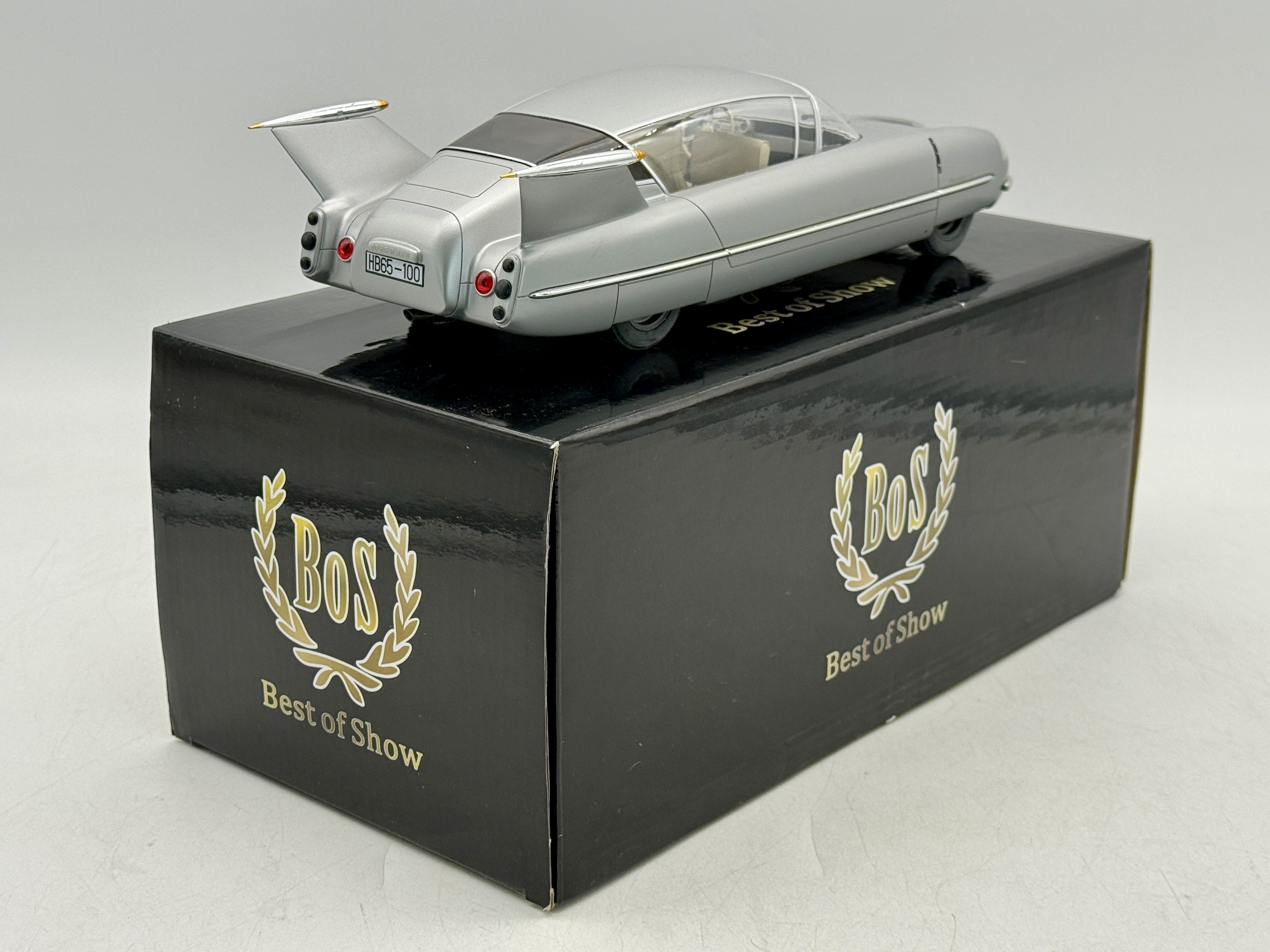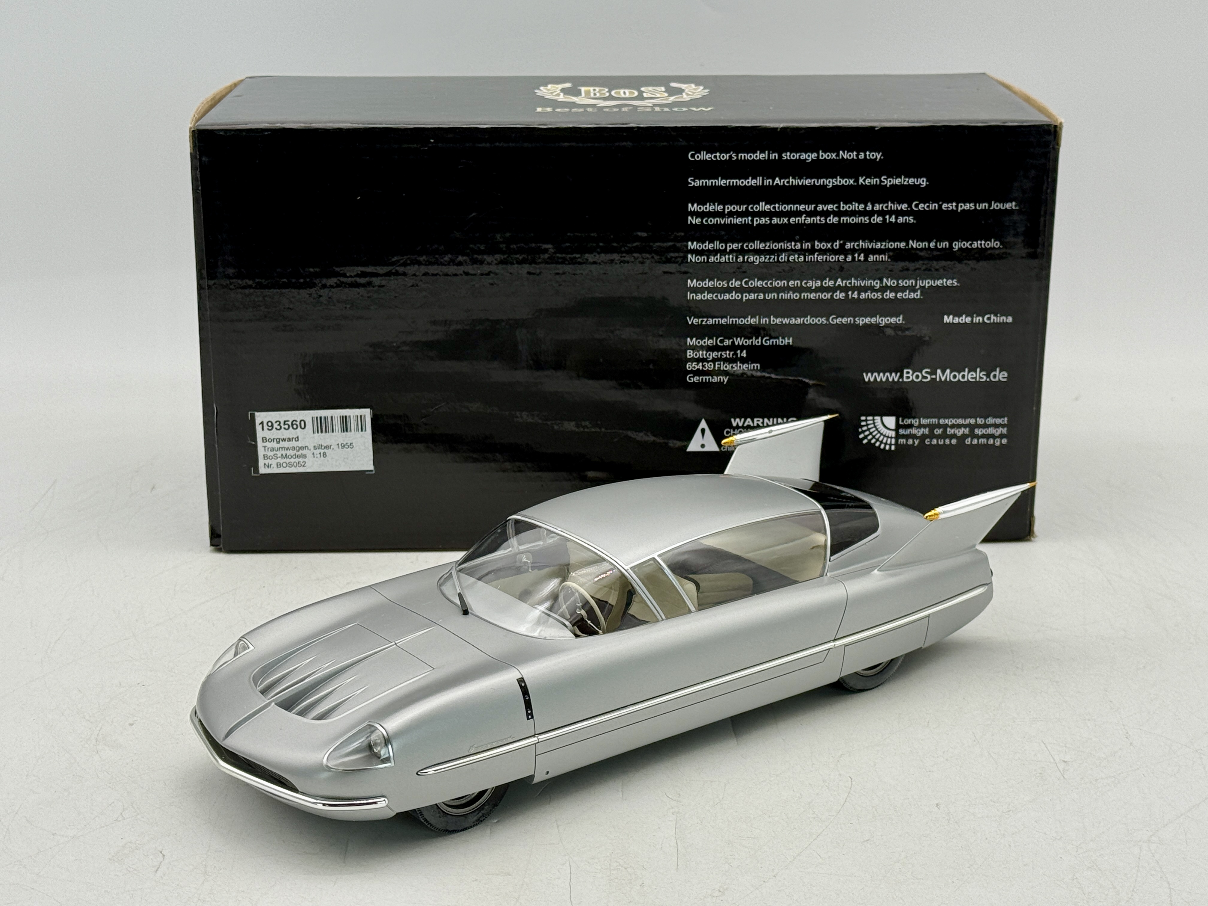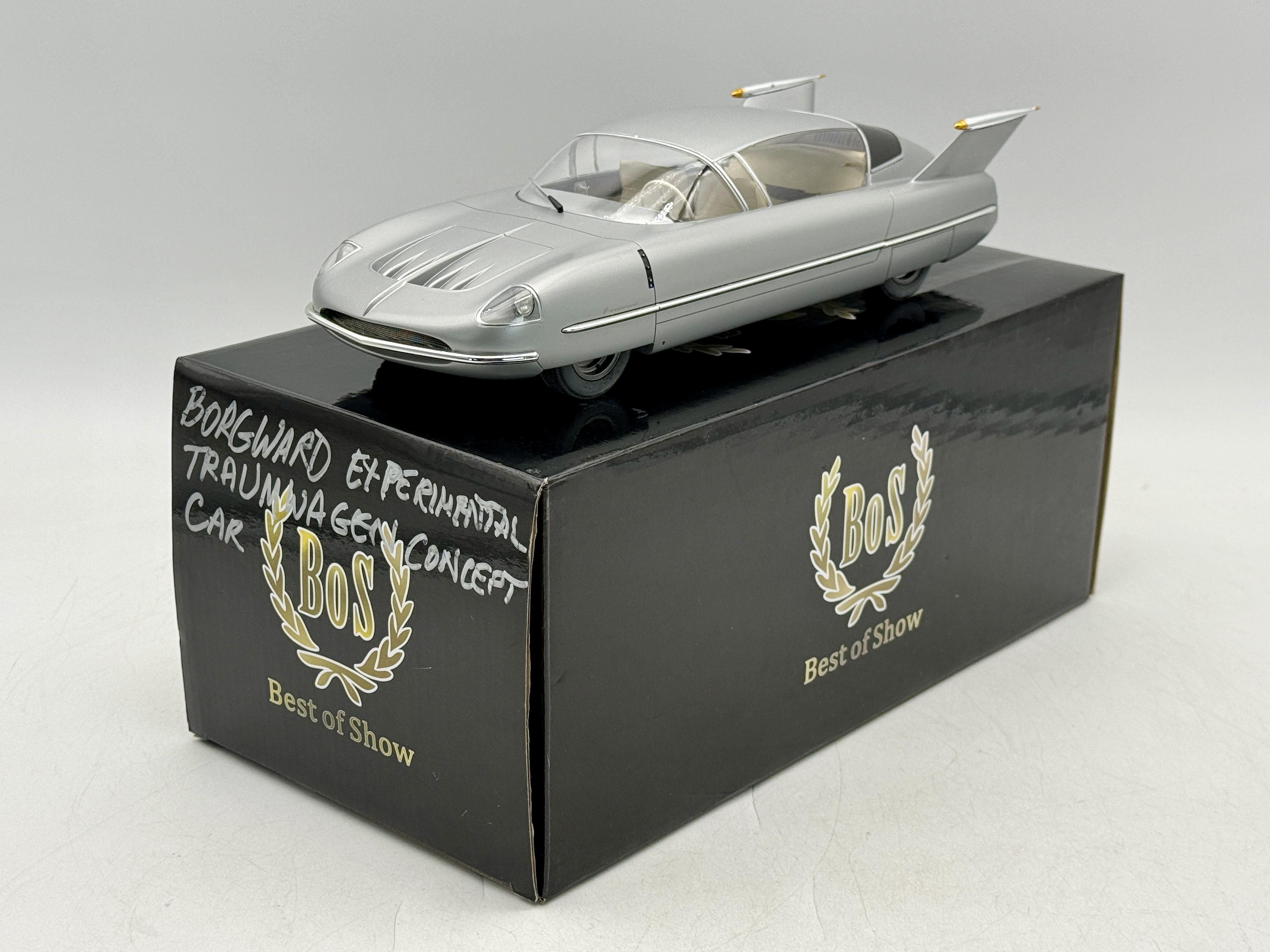A silver BoS-Models 11 1/2 inch Borgward Traumwagen concept model car with original black packaging box labeled Borgward Traumwagen, #643 of 1000. C9.