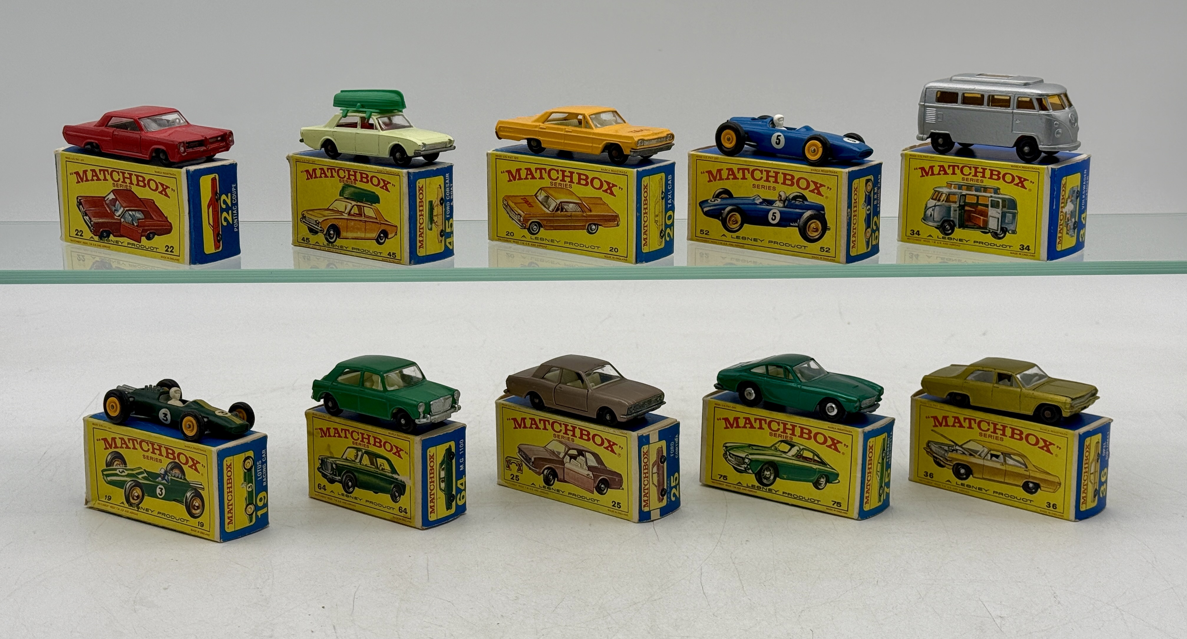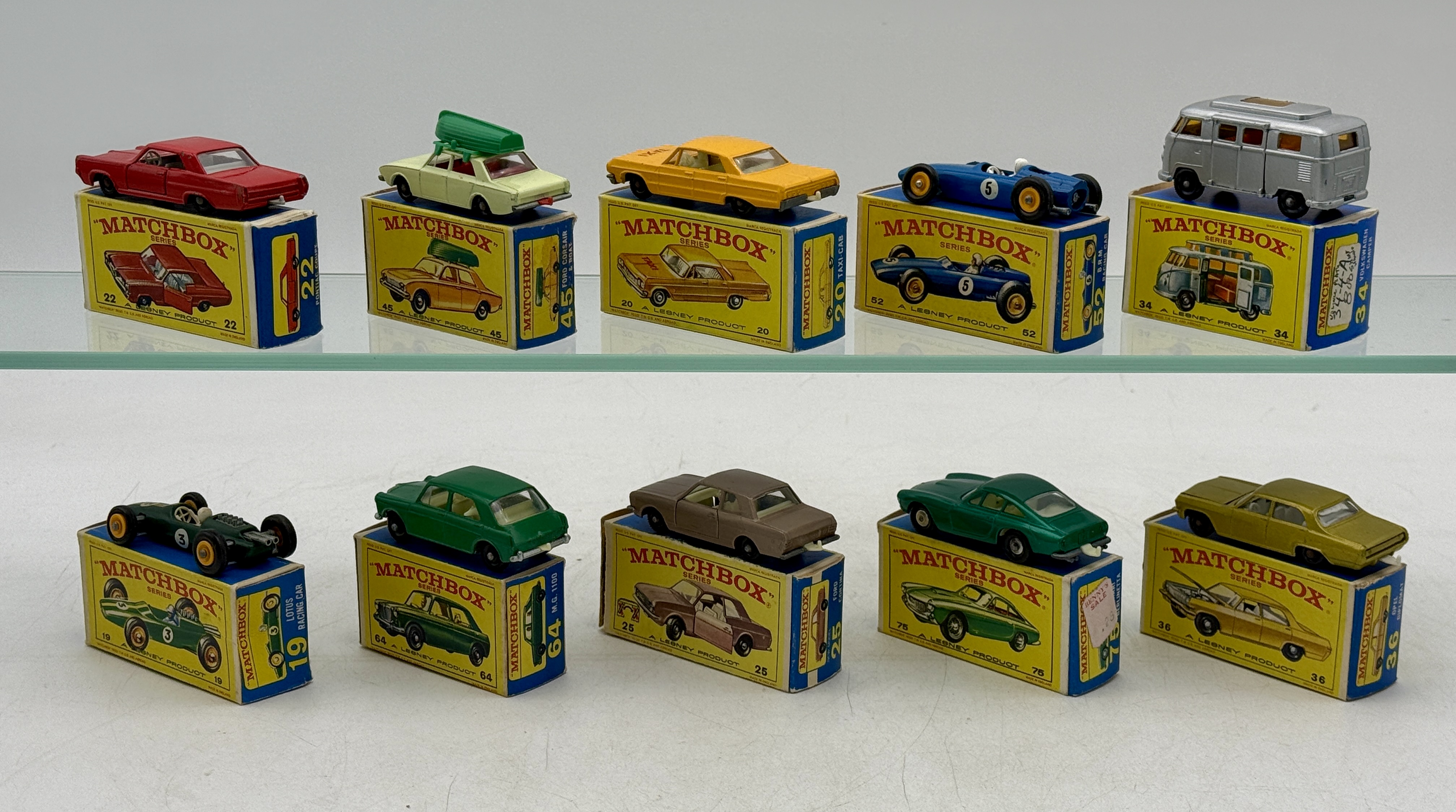 19D3 Lotus, 20C3 Taxi, 22C3 Pontiac, 25D1 Ford, 34D1 Volkswagen, 36C1 Opel, 45B2 Ford, 52B1 BRM, 64B1 MG, 75B4 Ferrari, original boxes minor wear C 8–9.