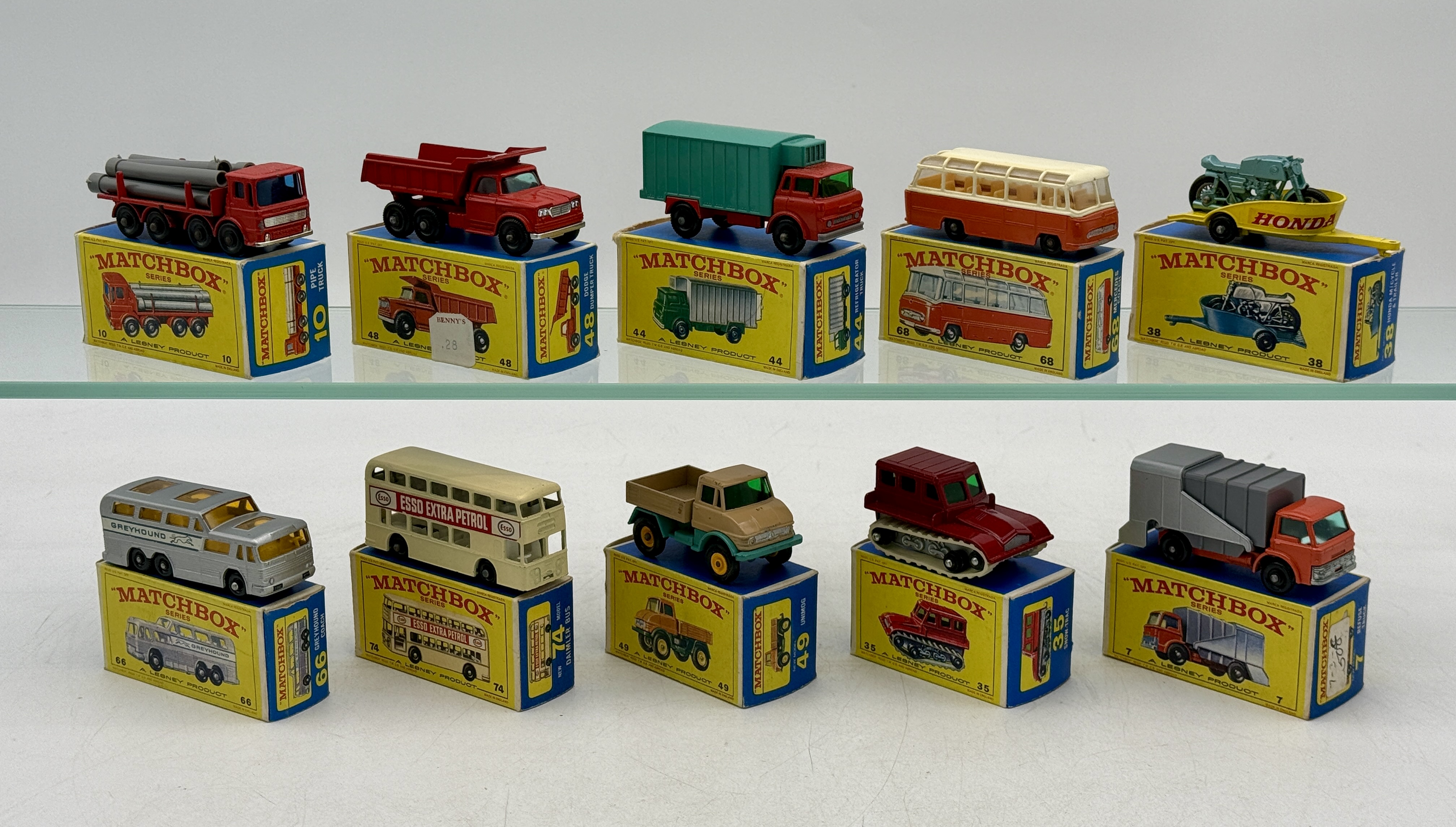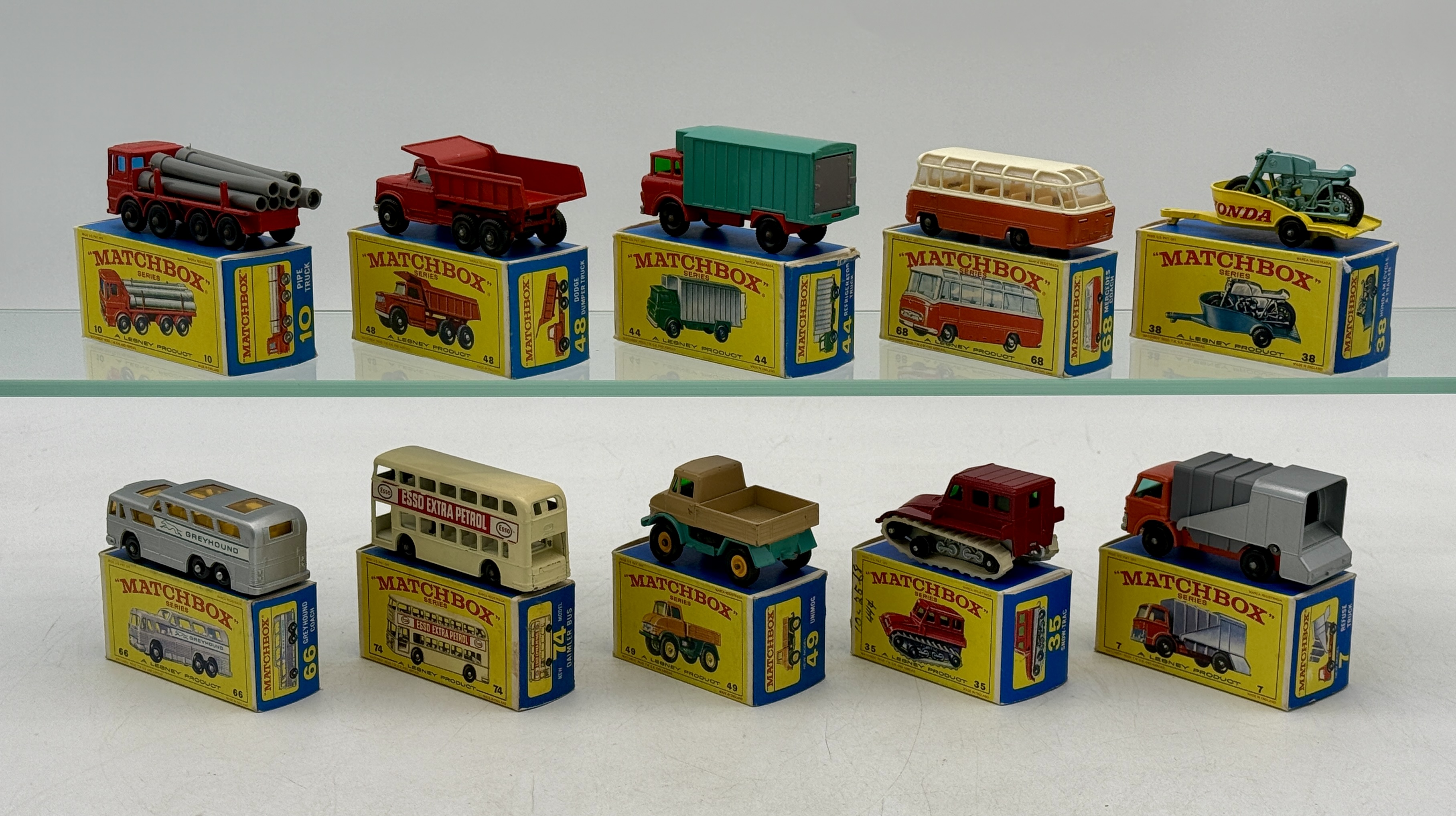 44C1 Refrigerator truck, 48C2 Tipper, 10D1 Pipe truck, 66C2 Greyhound bus, 68B2 Mercedes coach, 49B1 Unimog, 35B2 Snow Trac, 7C1 Refuse truck, 74B2 Bus, 38C3 Motorcycle trailer, original boxes C 8–9.