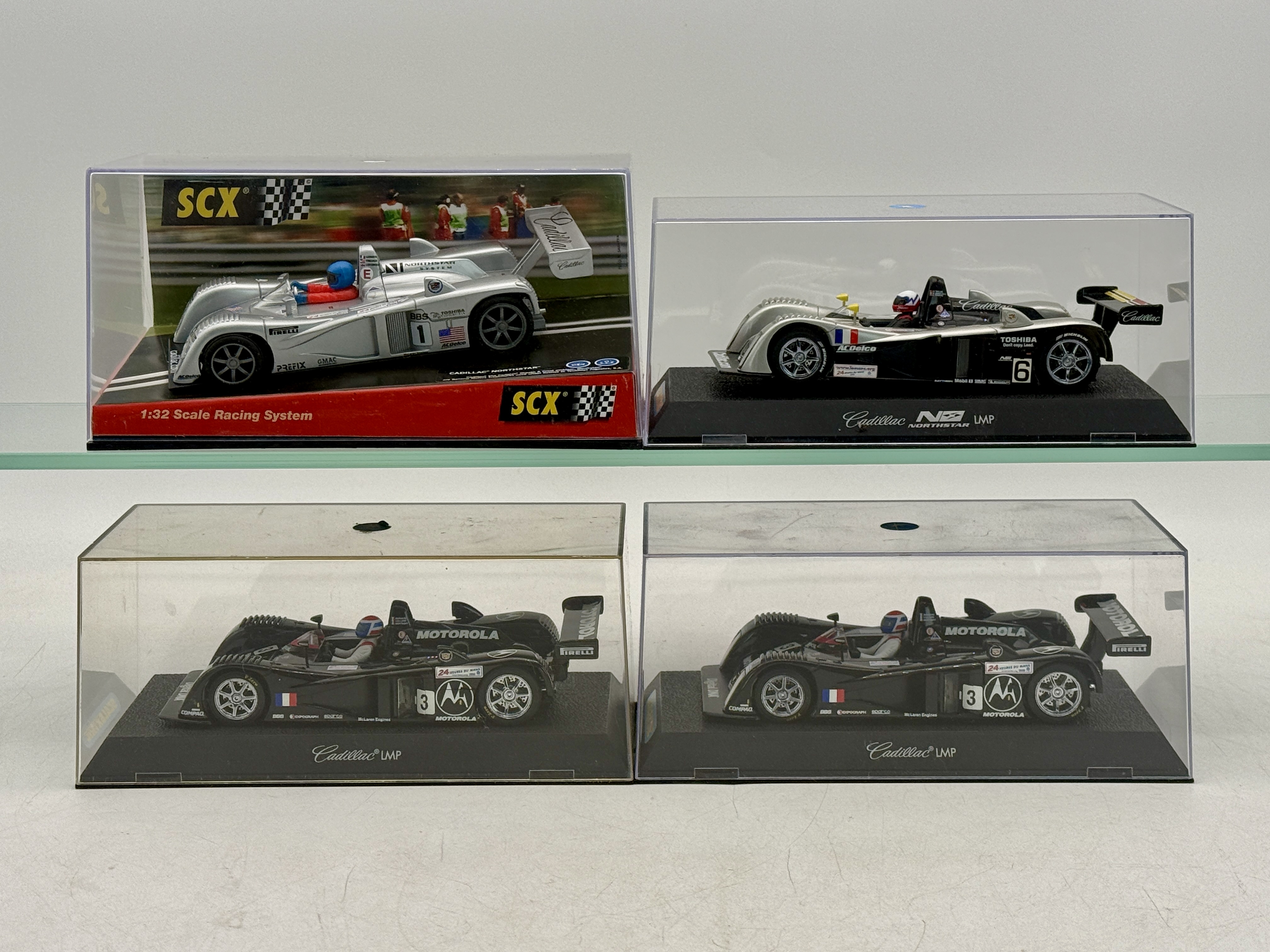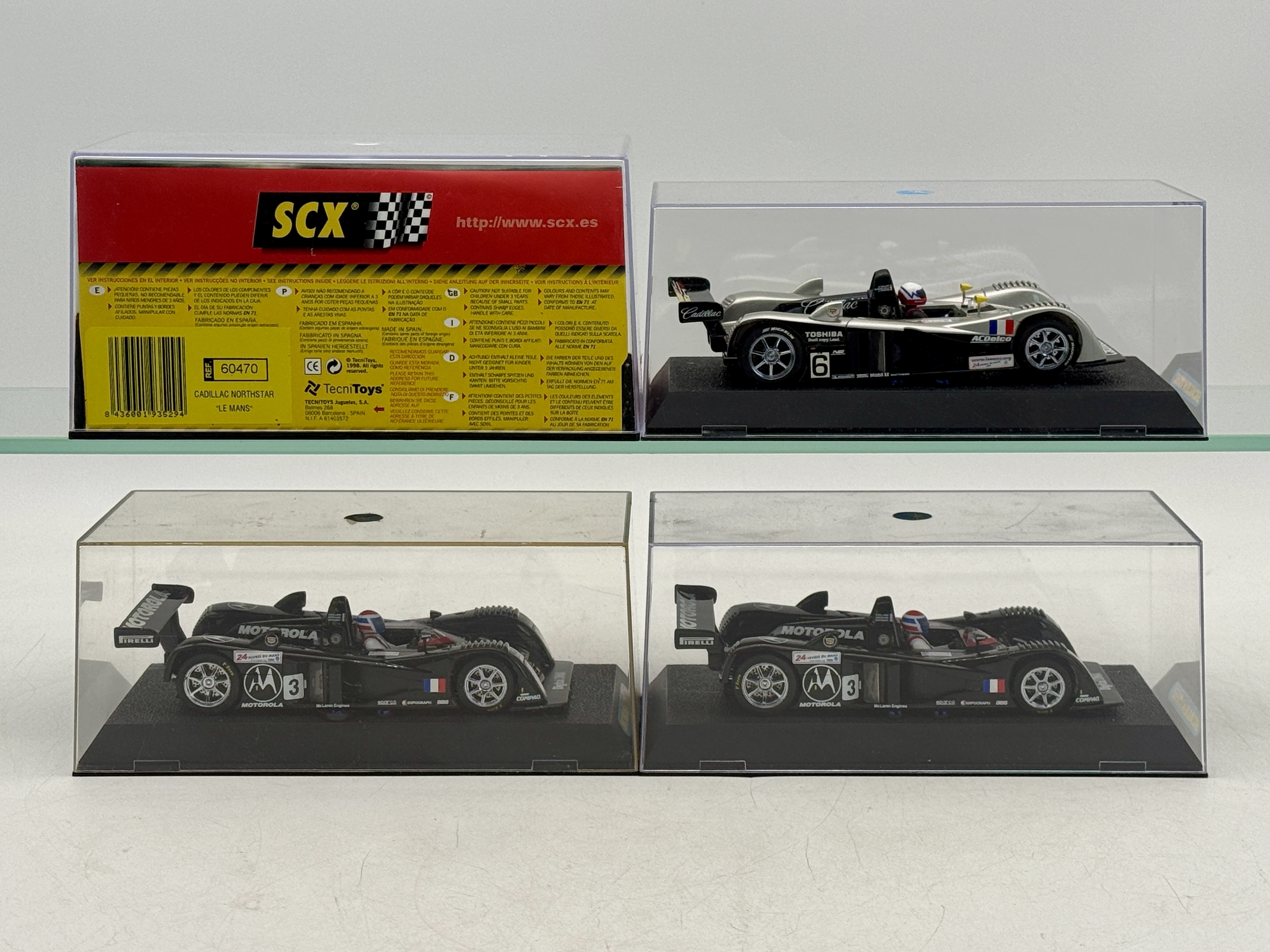 A collection of 1:32 scale Cadillac Northstar LMP slot cars featuring silver and black liveries with SCX and Scalextric branding original boxes C9.