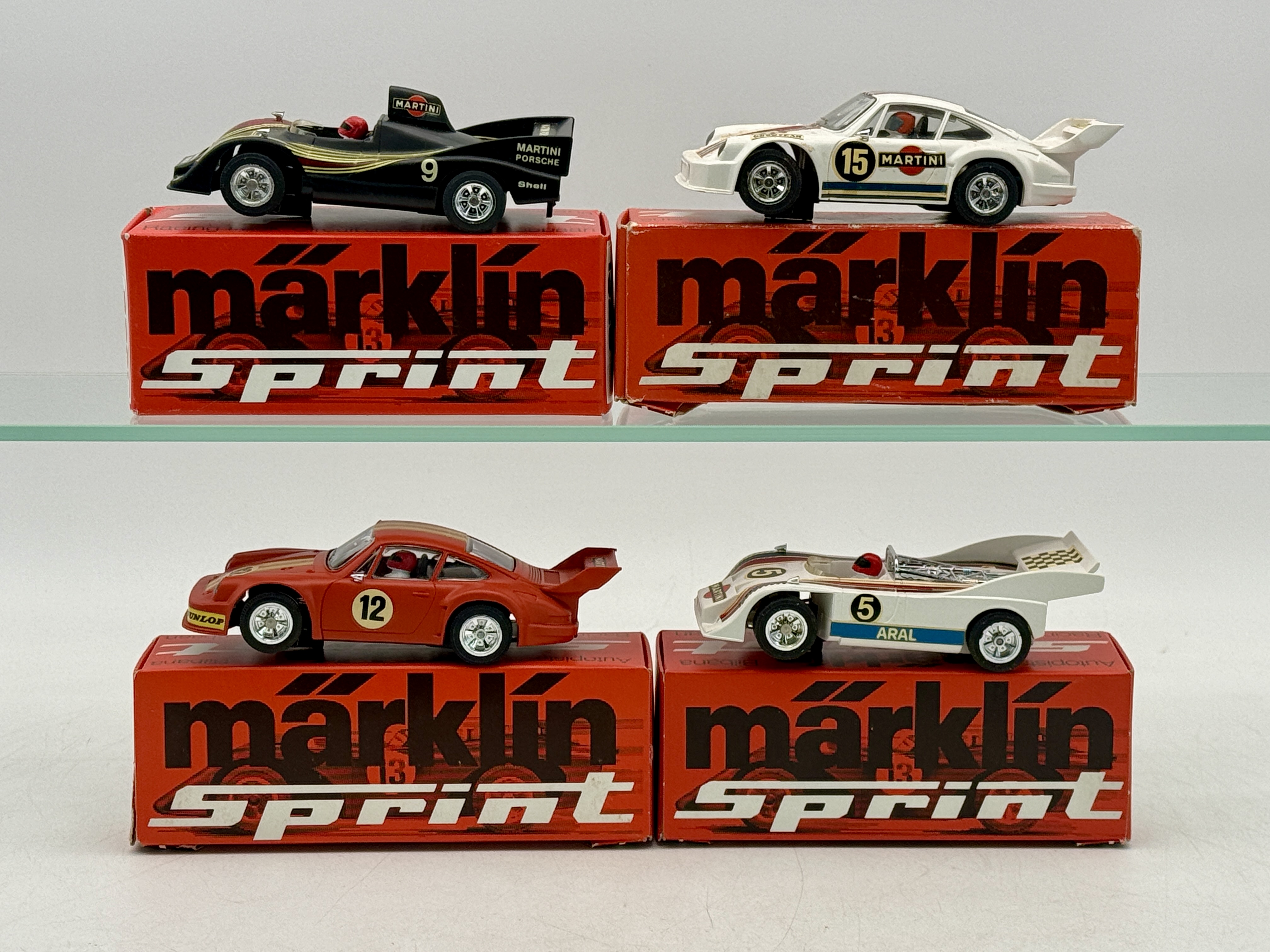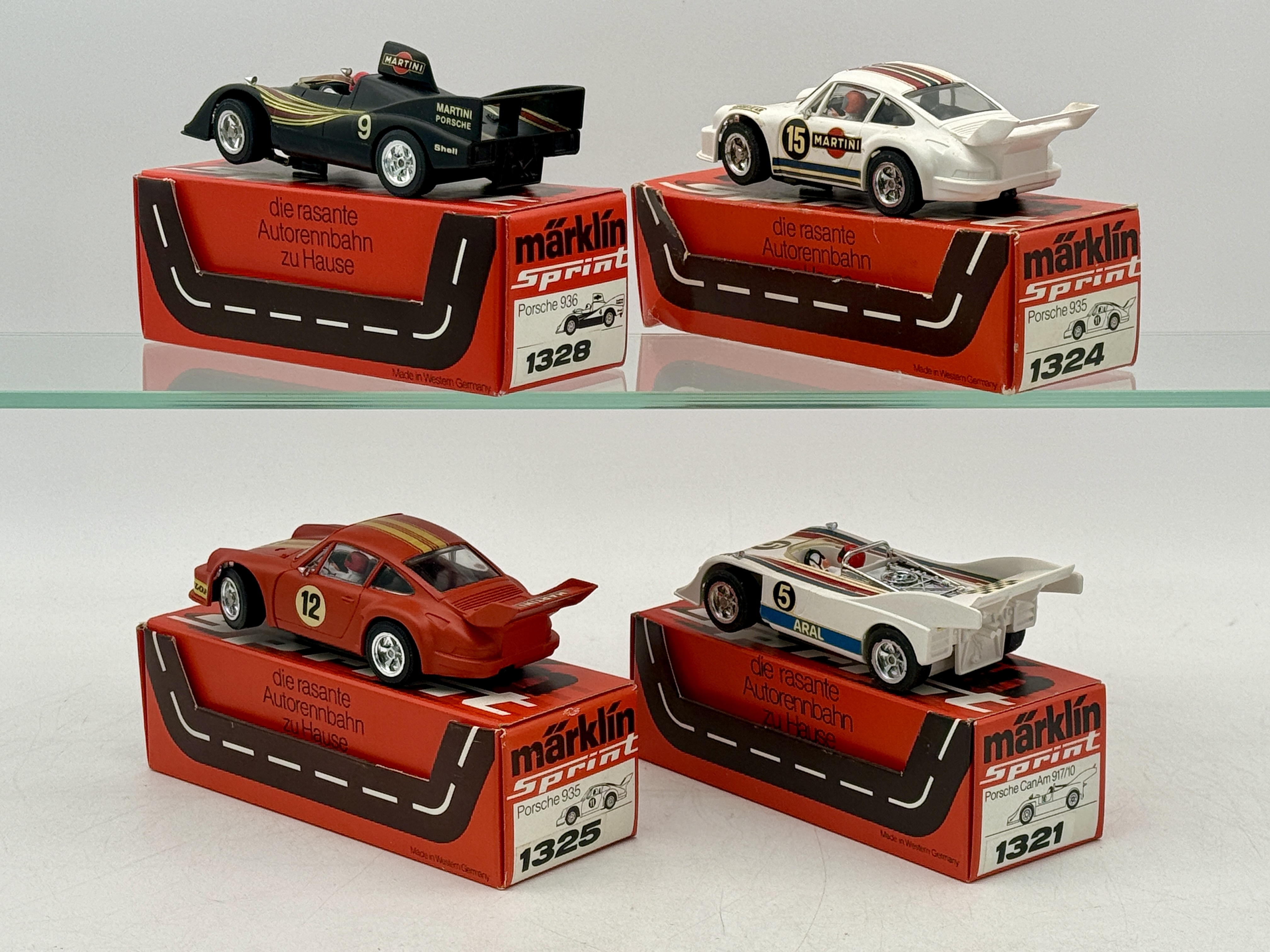 A collection of Märklin Sprint slot cars including Porsche 936, 935, and CanAm 917/10 models in black, white, and red with original boxes numbered 1321, 1324, 1325, and 1328 featuring Martini, Dunlop, and Aral racing decals.