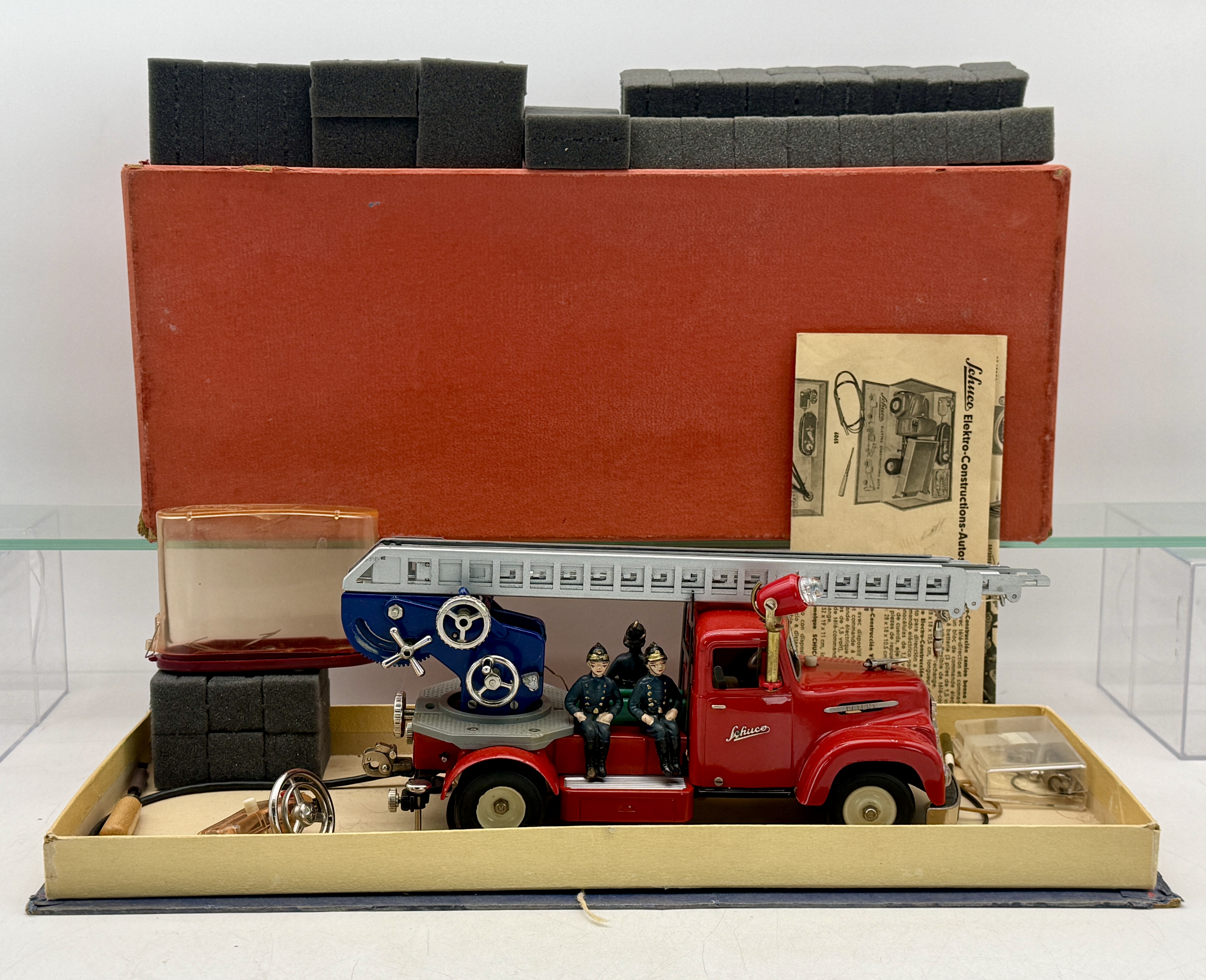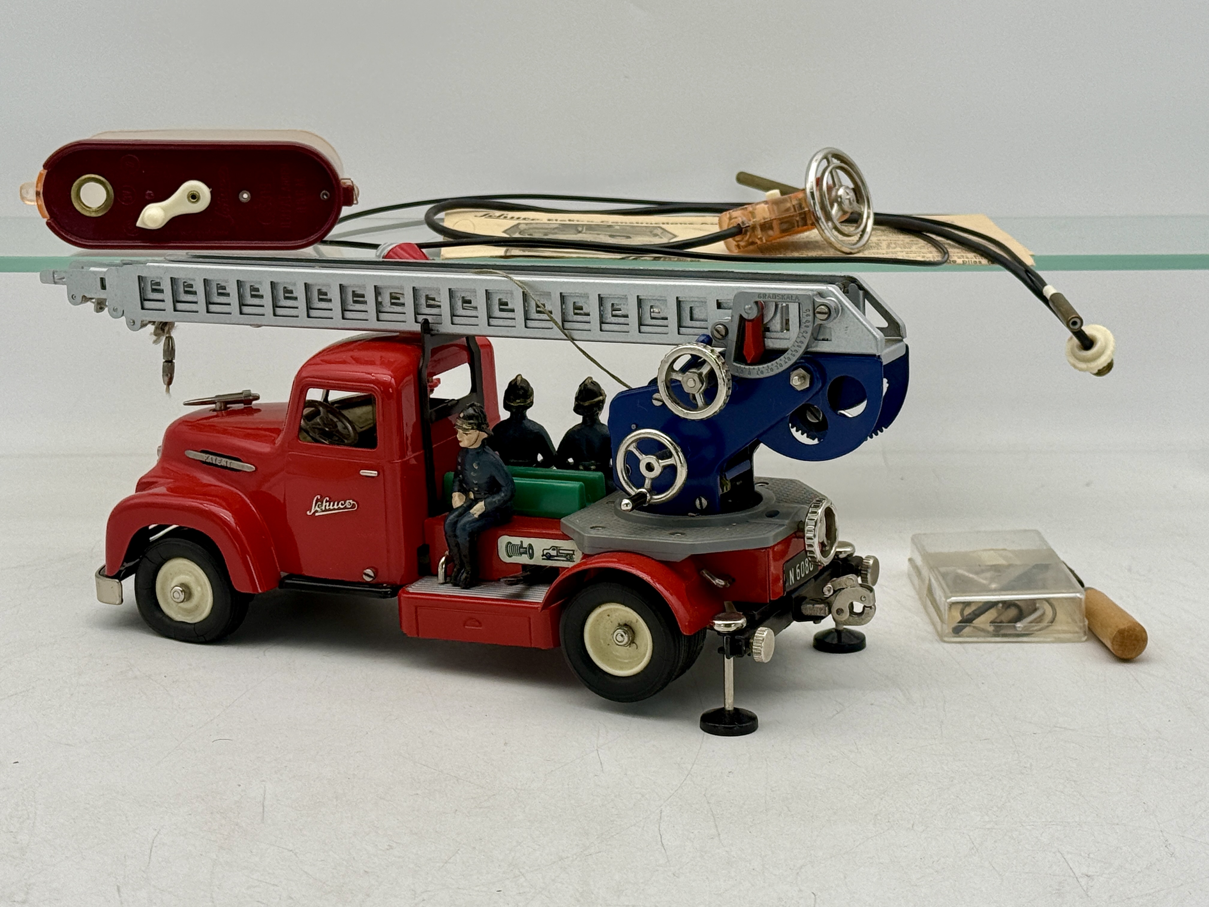 A collection of Schuco Elektro Construction 6080 fire truck items including a red tinplate ladder truck with figures, remote control, and original box, all tires have small flat spots, not tested due to the plastic shrinkage of the battery box, ladder string needs reattaching , original box missing bottom insert C8.