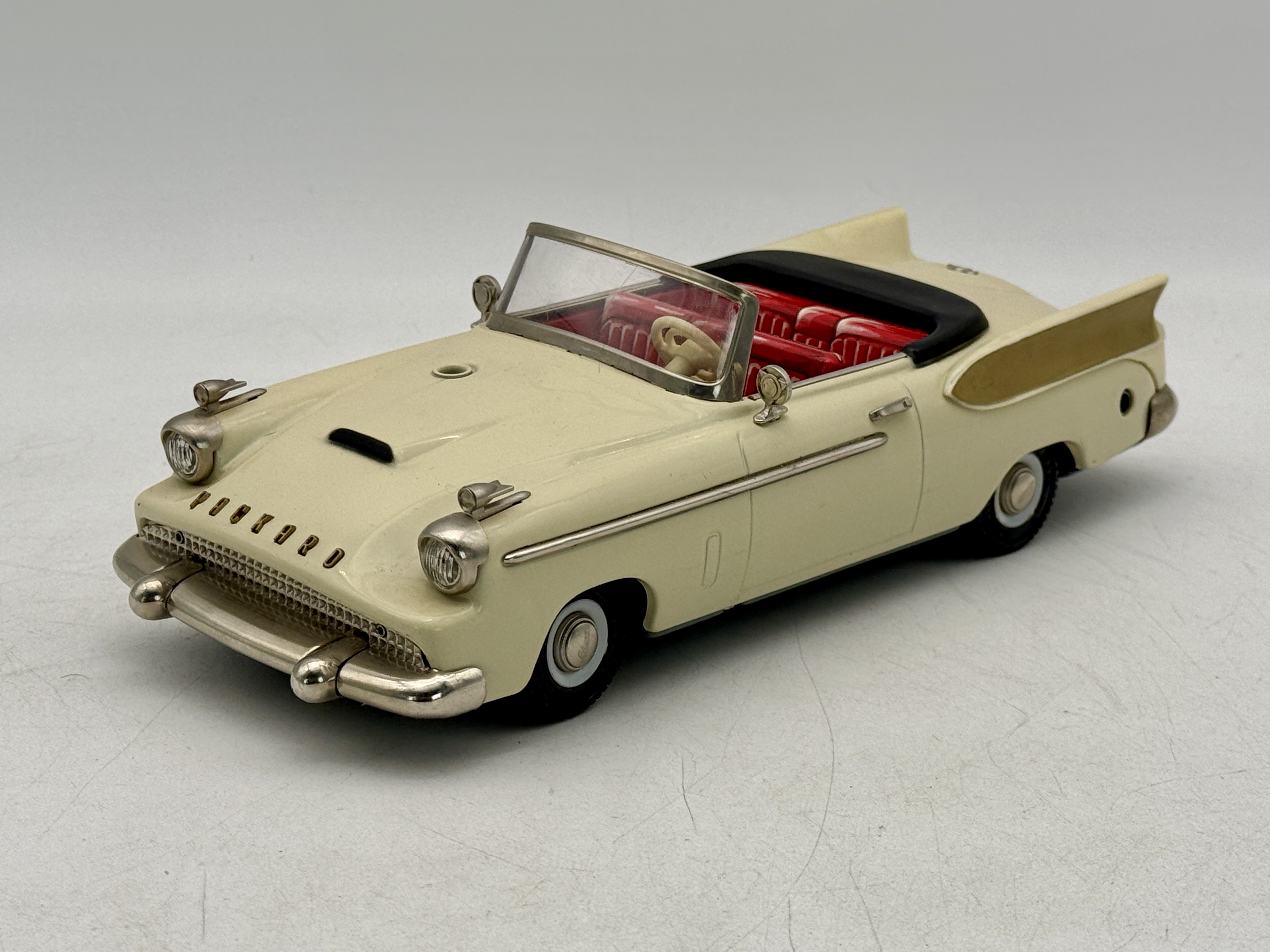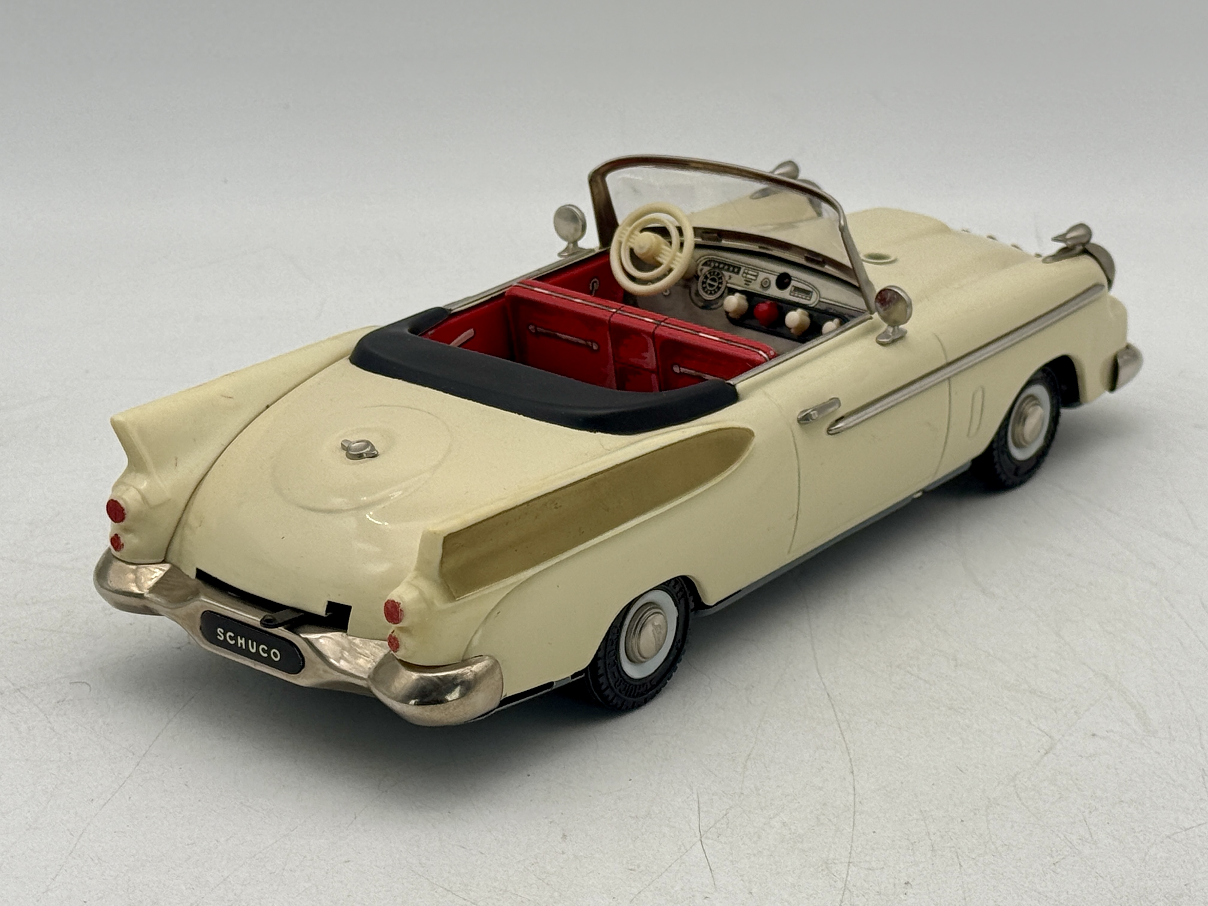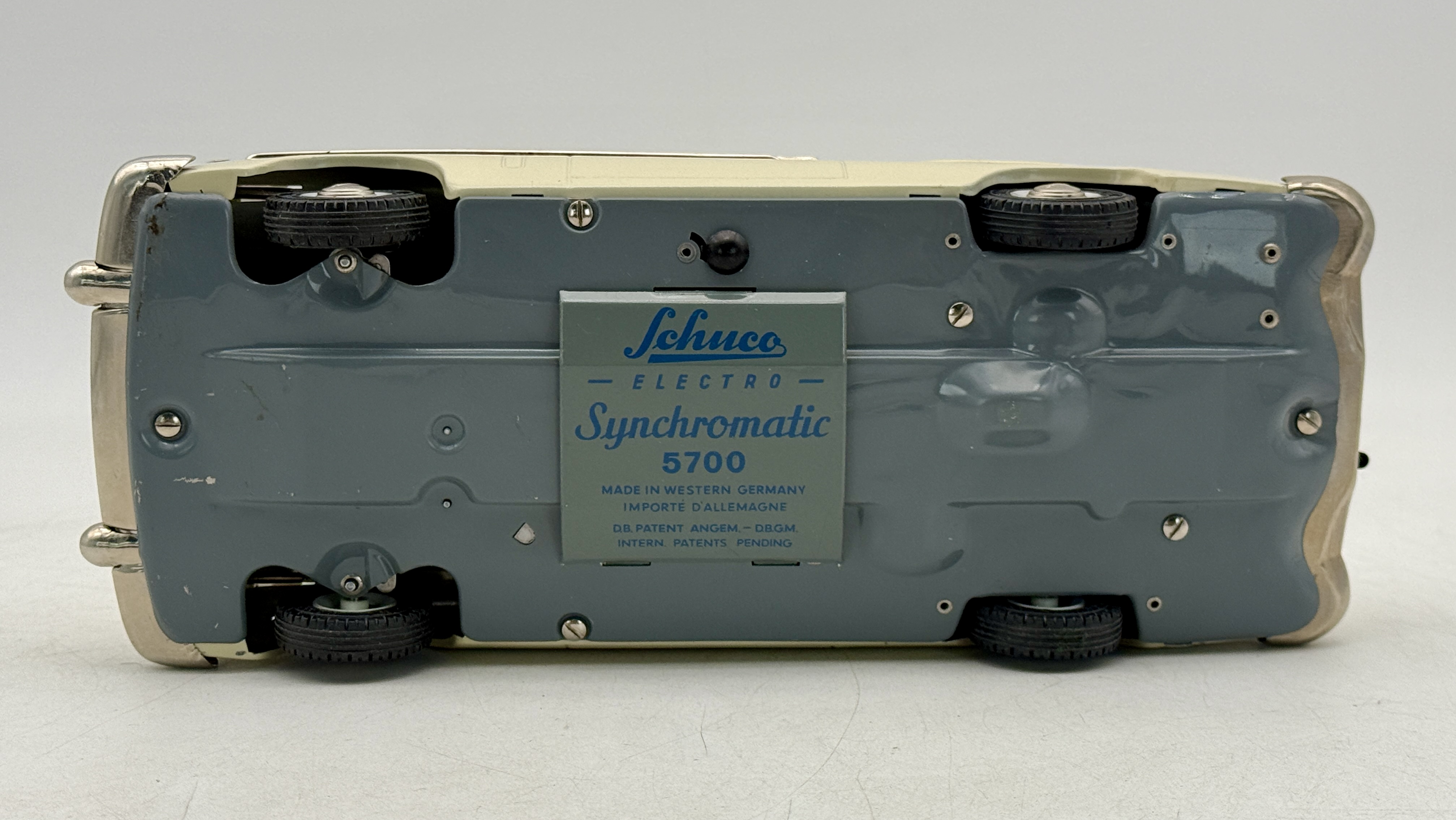 A cream-colored Schuco Electro Synchromatic 5700 Packard convertible toy car featuring a red interior and made in Western Germany, litho tin 10 1/2 inches long, battery operated working, C8-9..