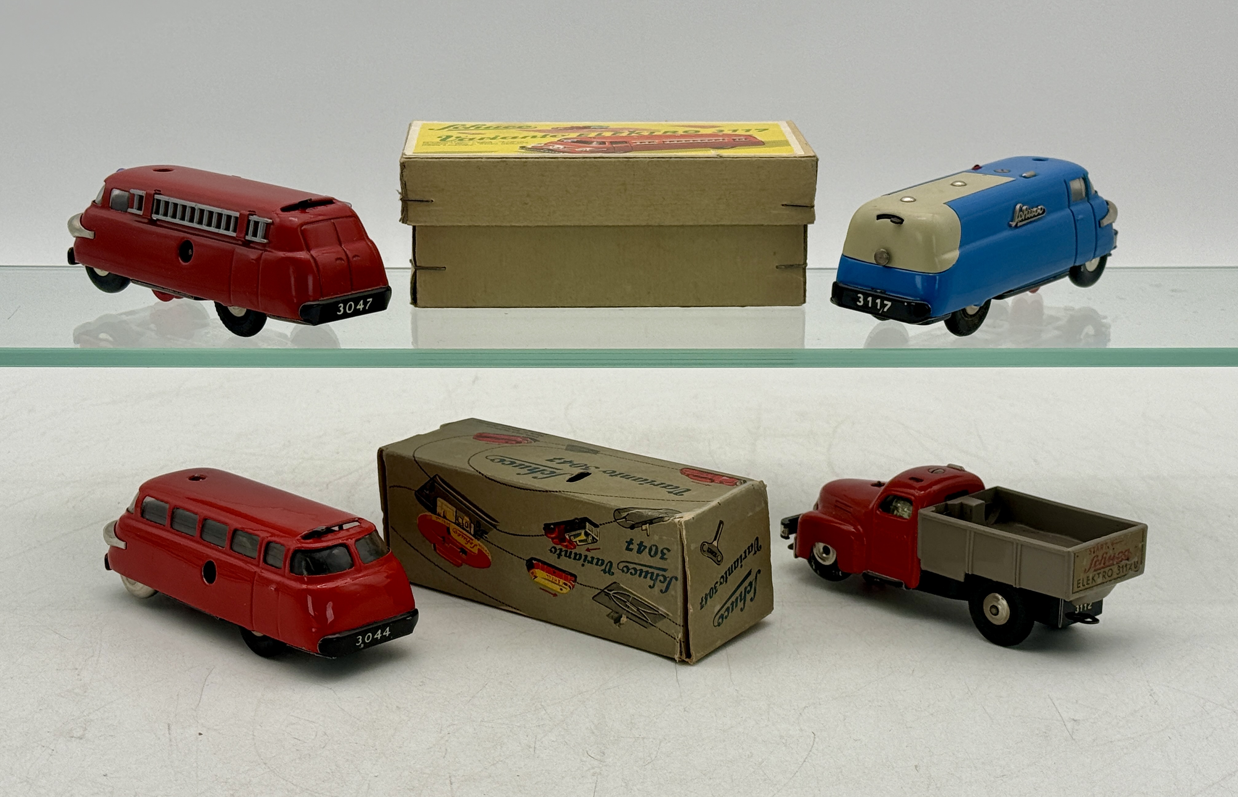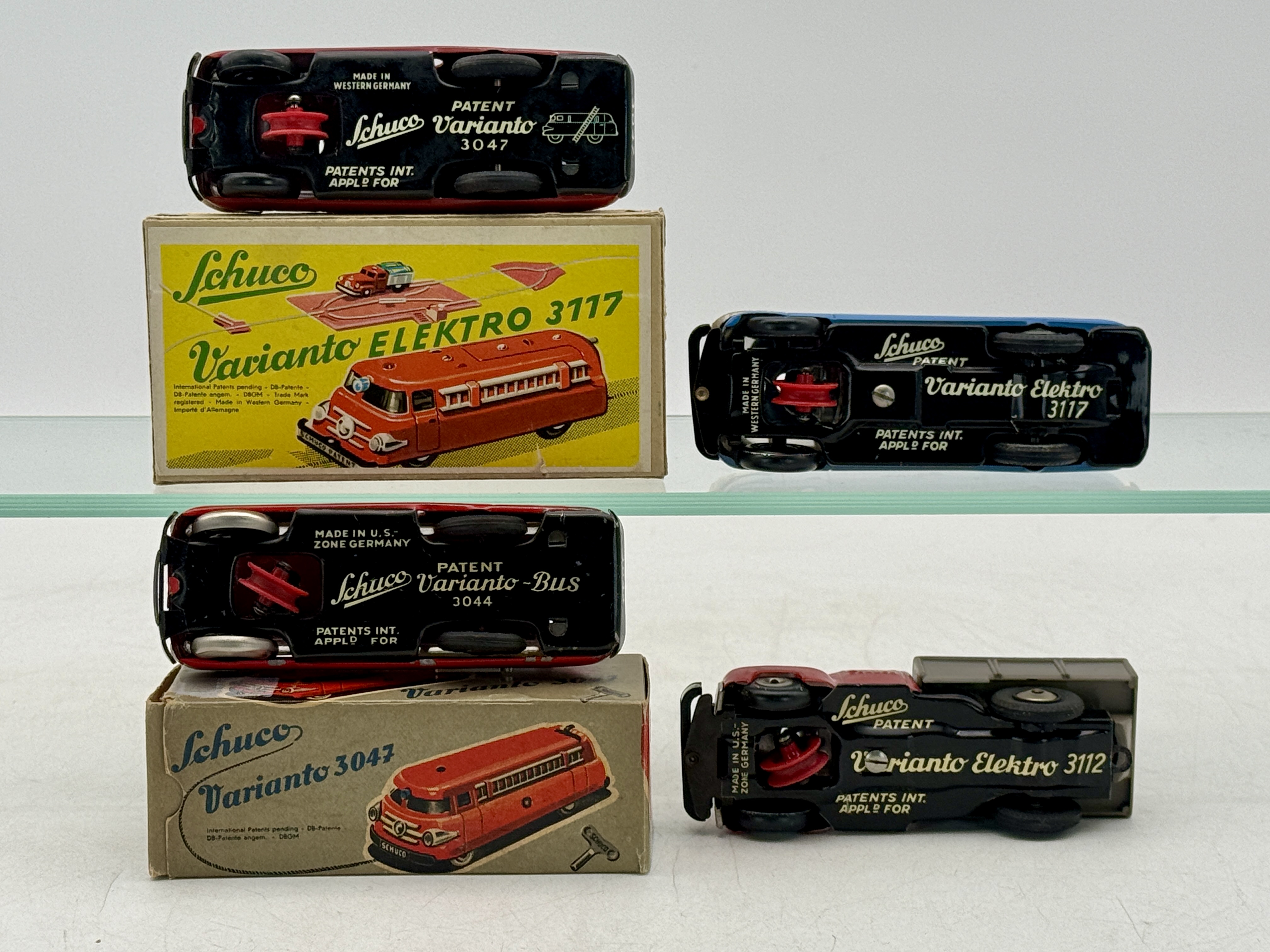 A collection of red, blue, and grey tinplate toy vehicles including Schuco Varianto 3047, Varianto Elektro 3117, Varianto 3044, and Varianto Elektro 3112 models made in Western Germany, accompanied by two original boxes, windups are working, C7-8.
