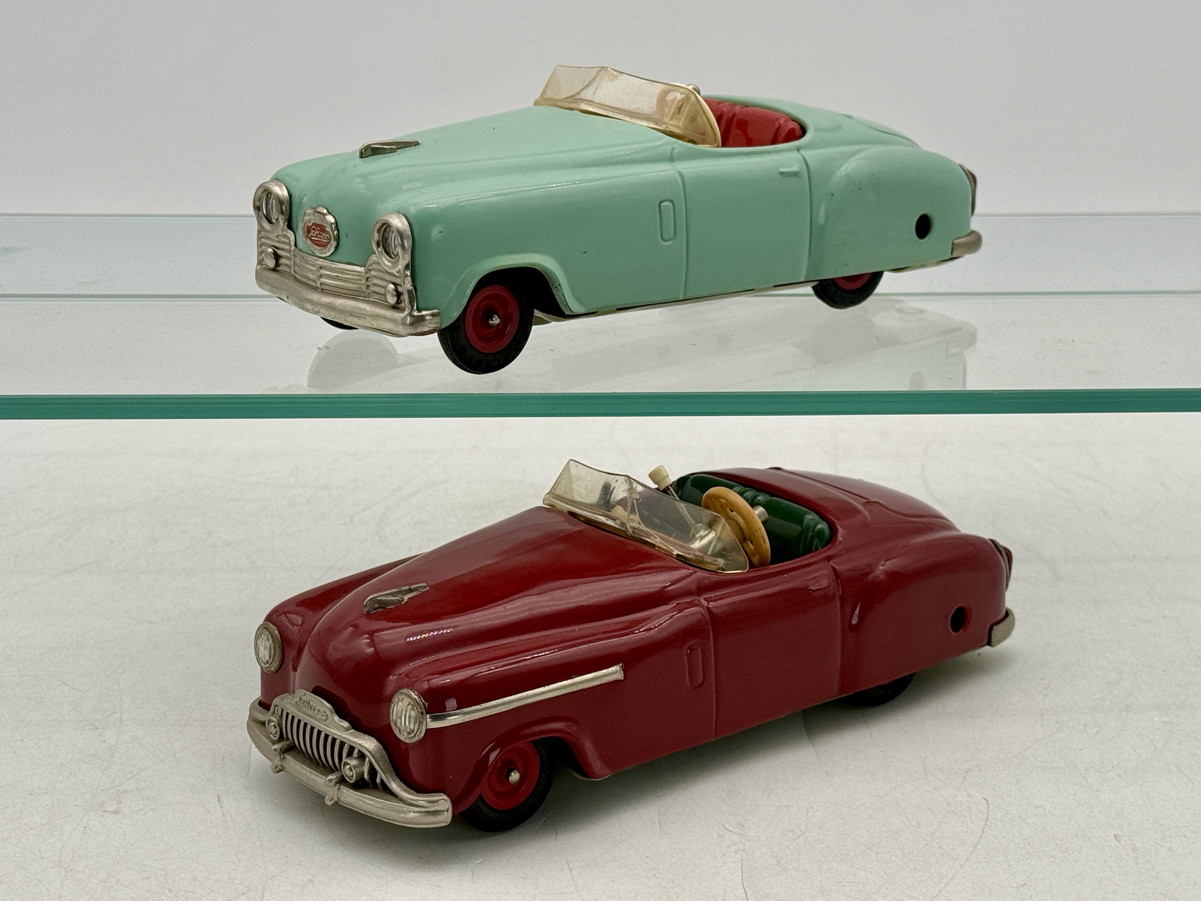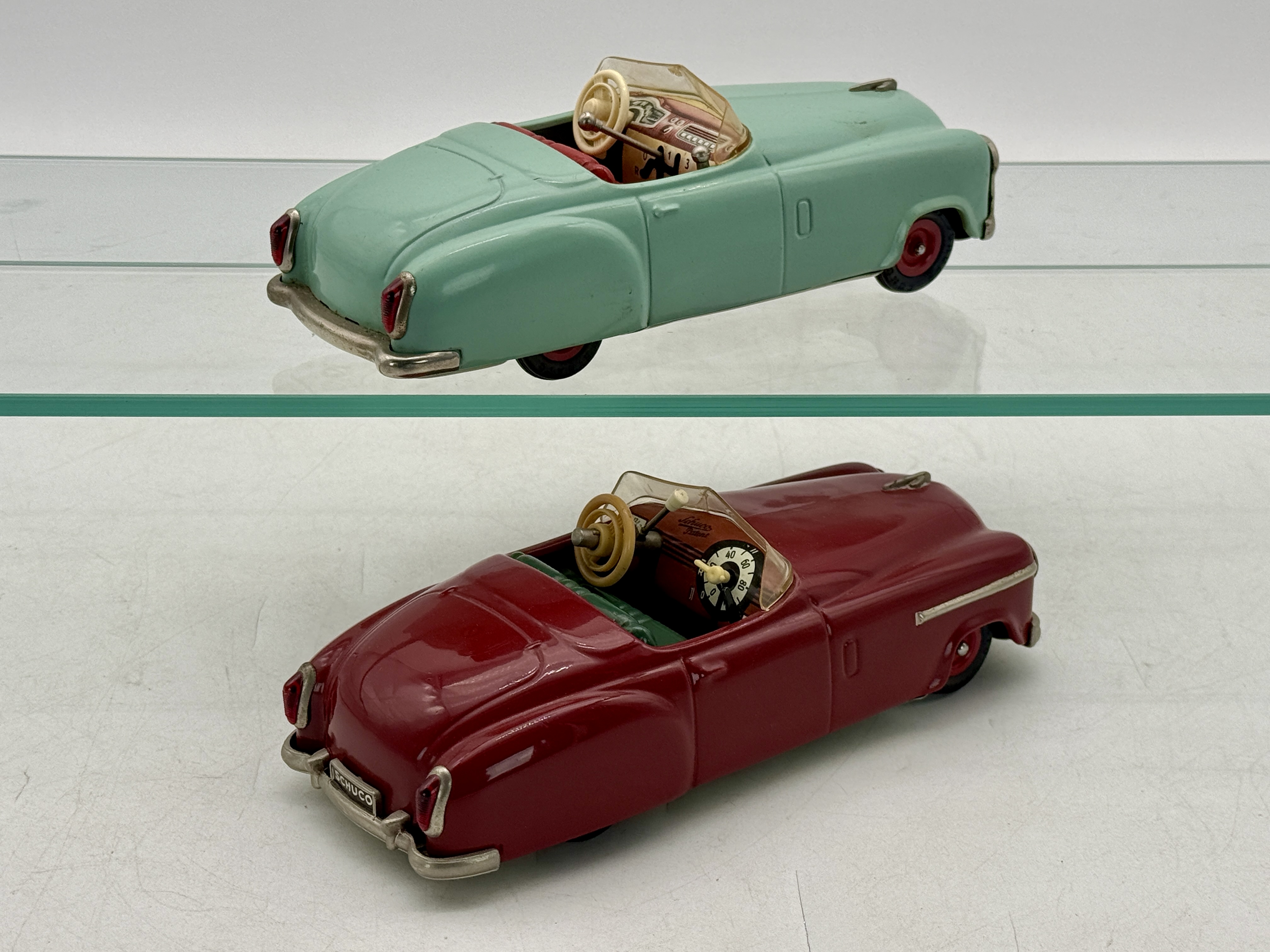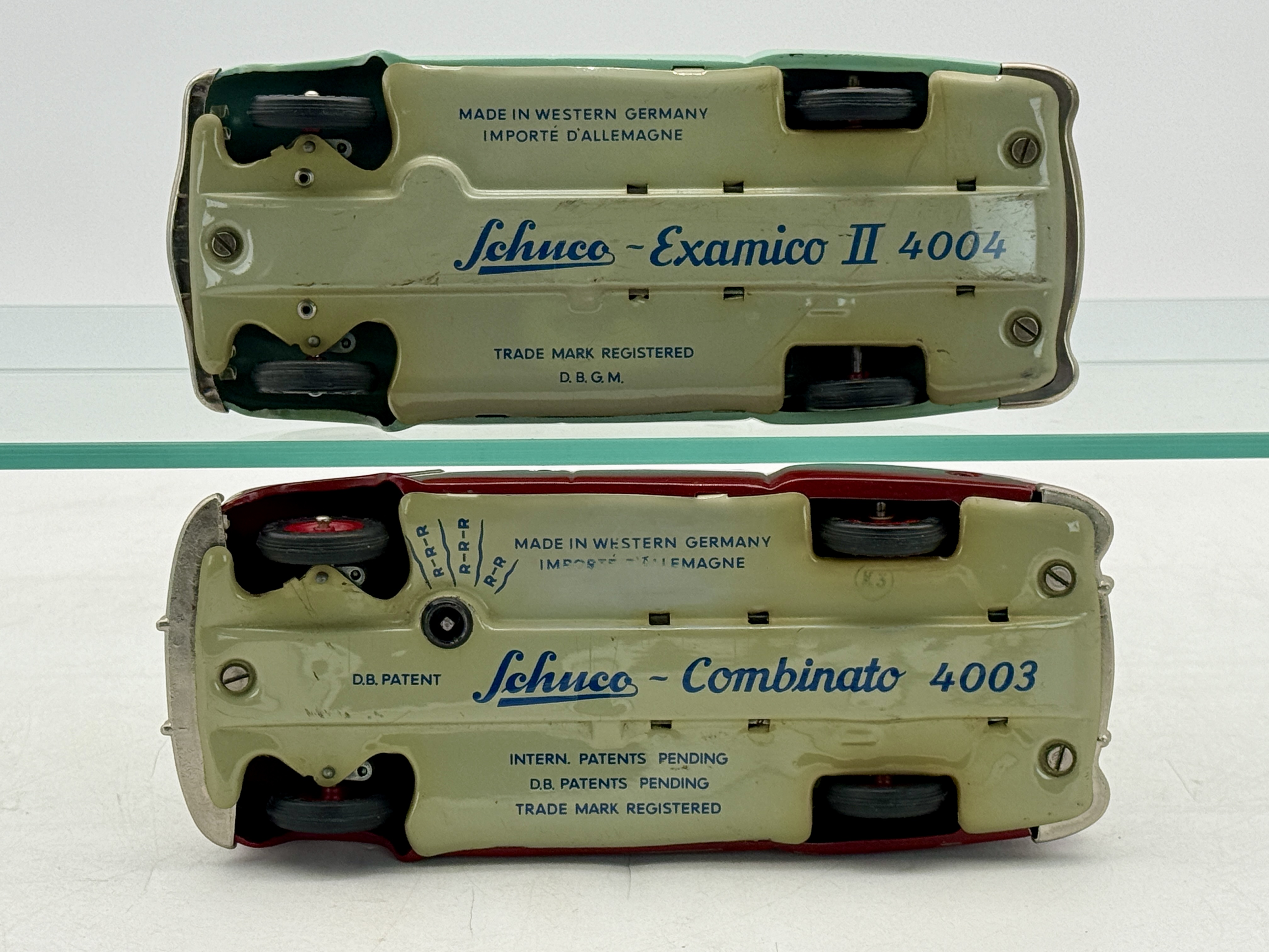 Two Schuco tin toy convertible cars including a light green Examico II 4004 and a dark red Combinato 4003, both marked Made in Western Germany, both are working and they have a small crack in the windshields, C7-8.