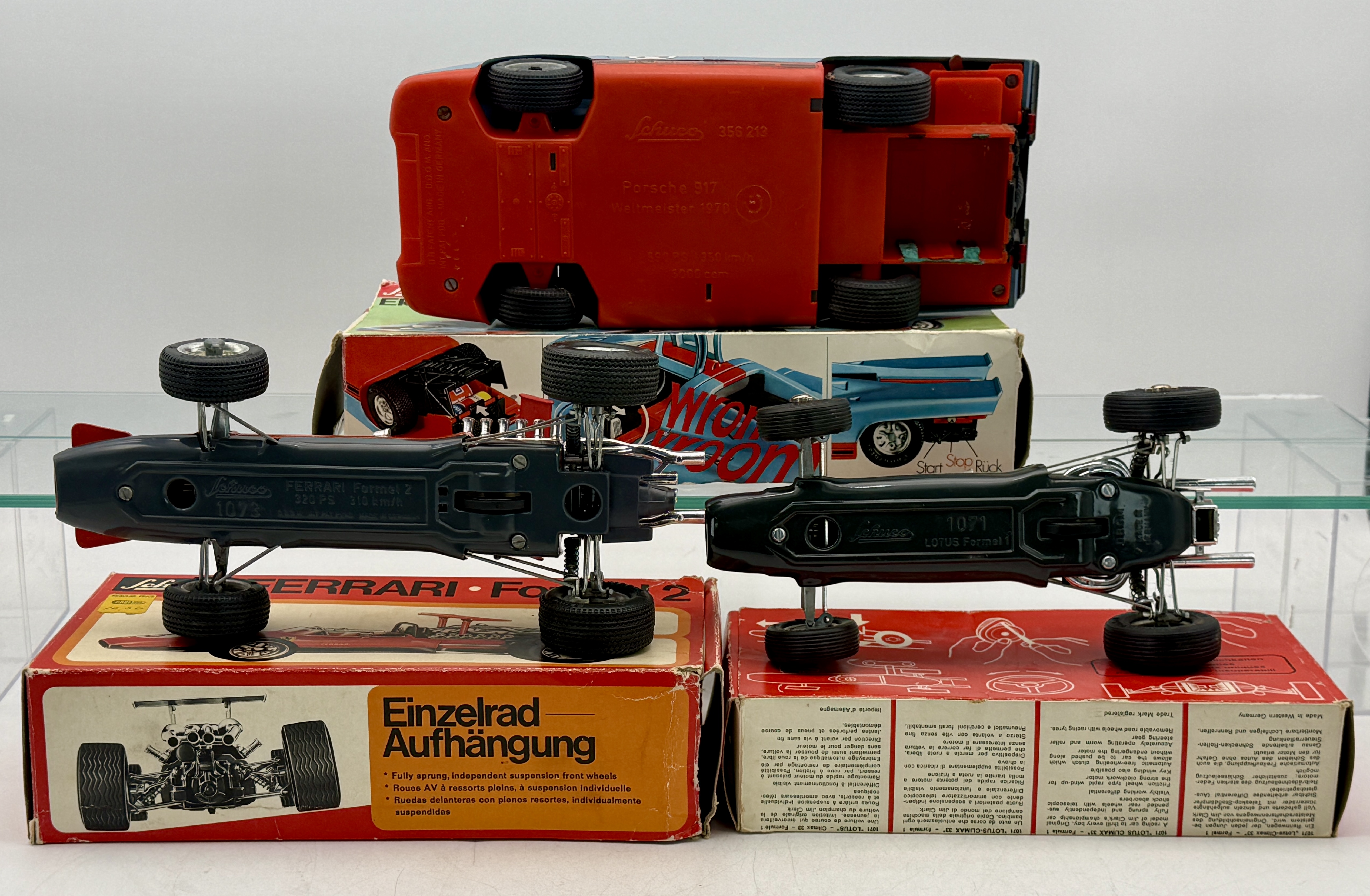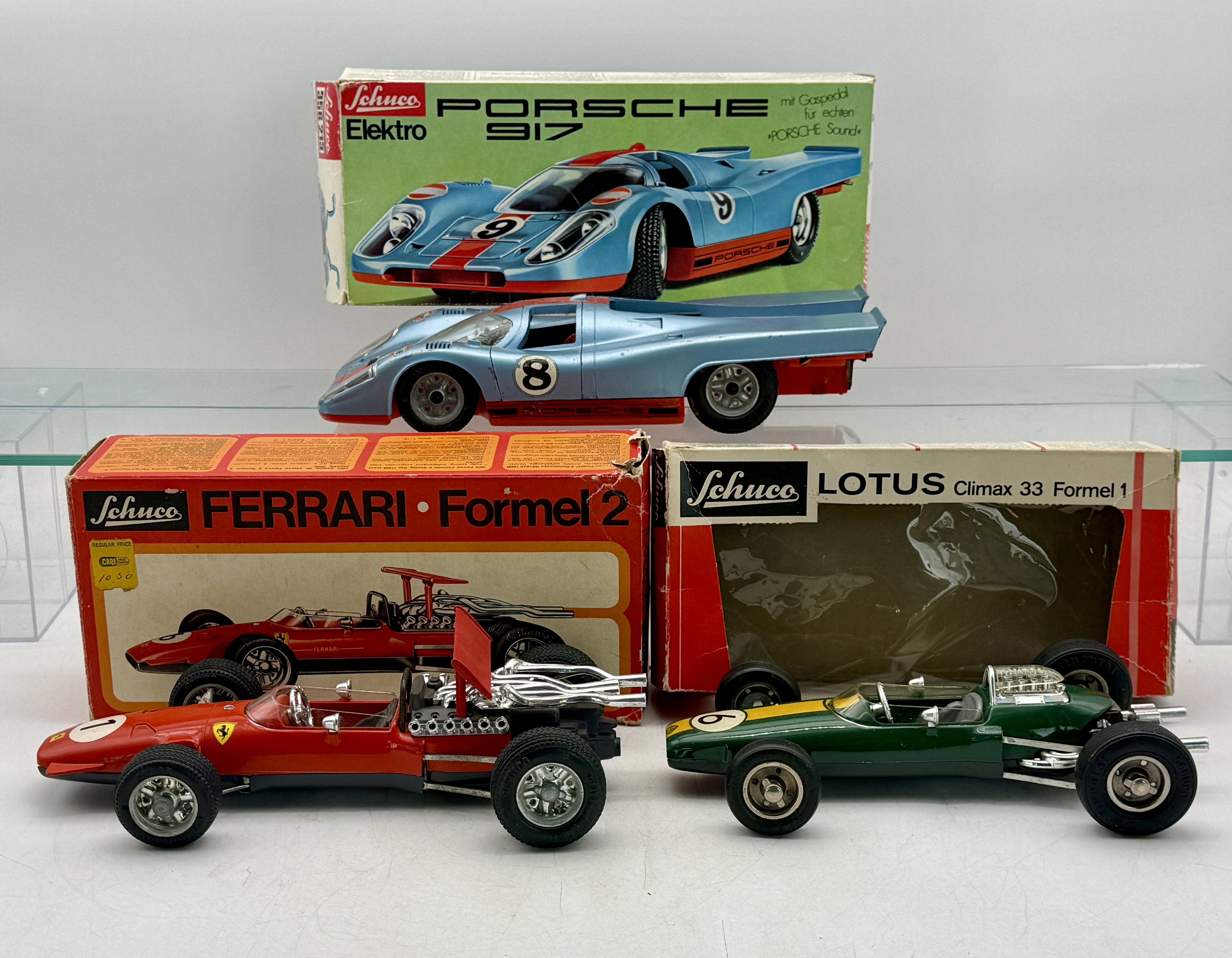 A trio of Schuco toy race cars including a 356-213 Porsche 917, a 1071 Lotus Climax 33 Formel 1, and a 1073 Ferrari Formel 2, all with their original packaging, all are working, C7-8.