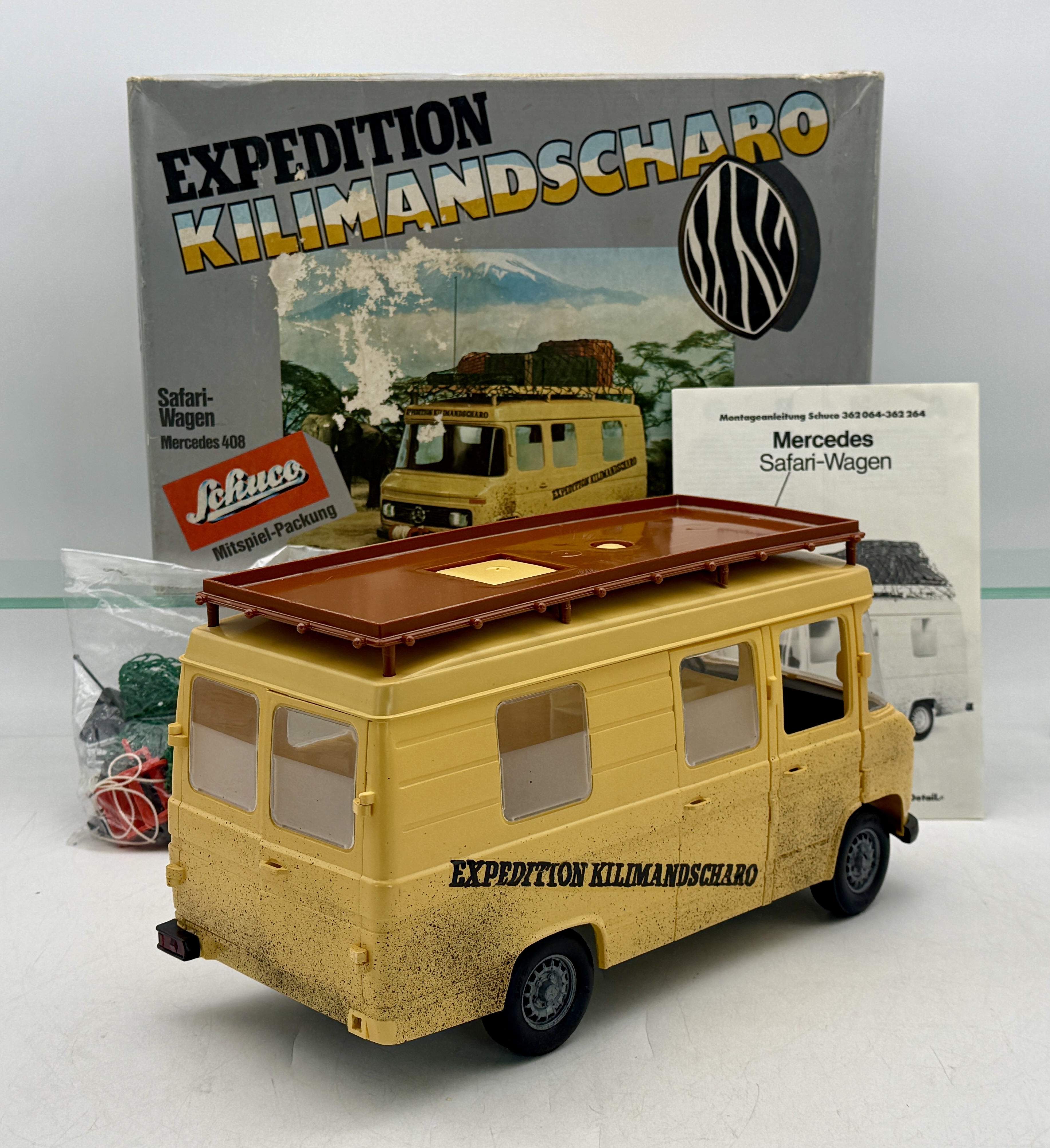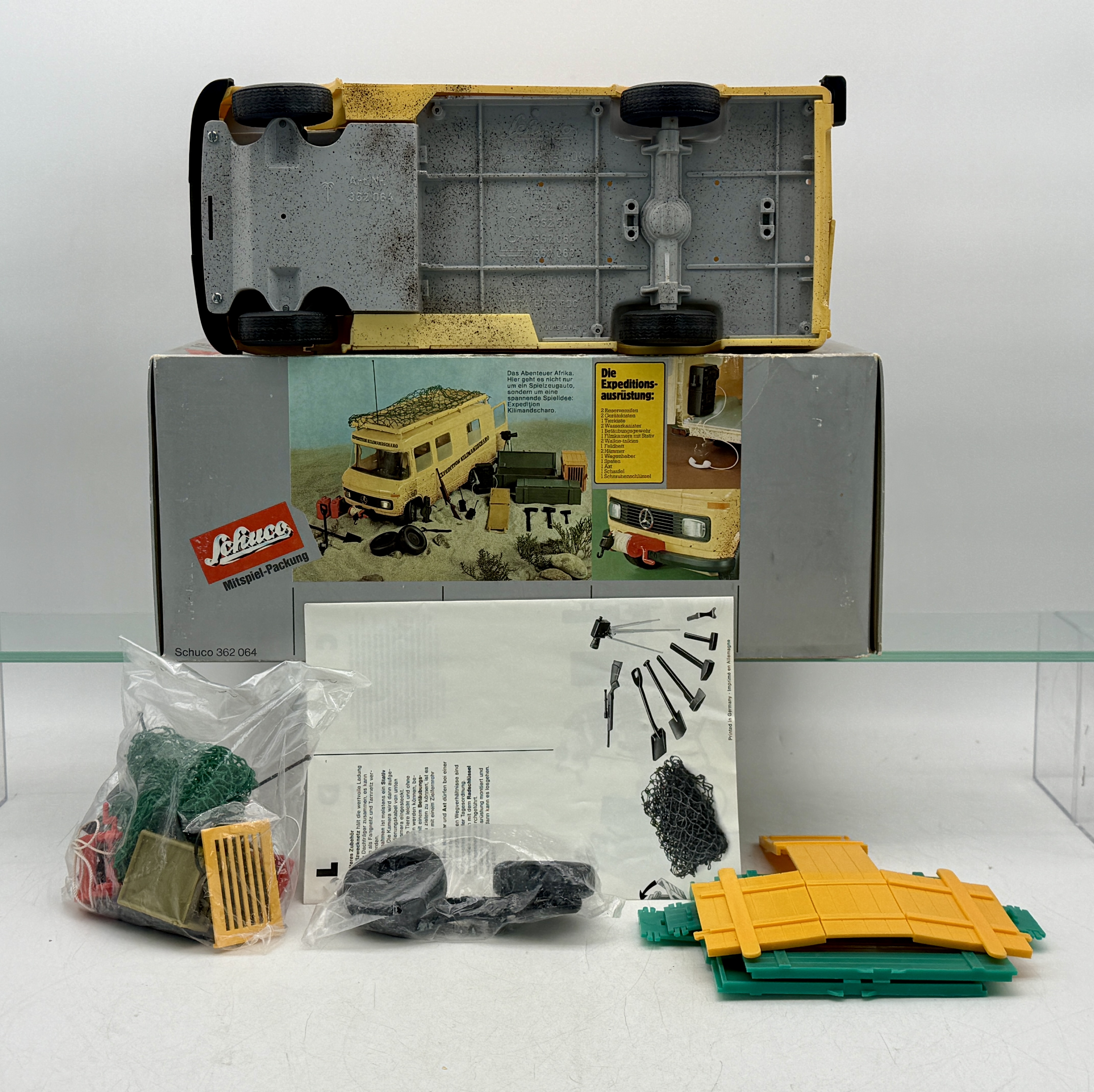 A collection of Schuco toy components featuring a yellow Mercedes 408 Safari-Wagon with its original box, assembly instructions, and assorted accessories and parts, C9.