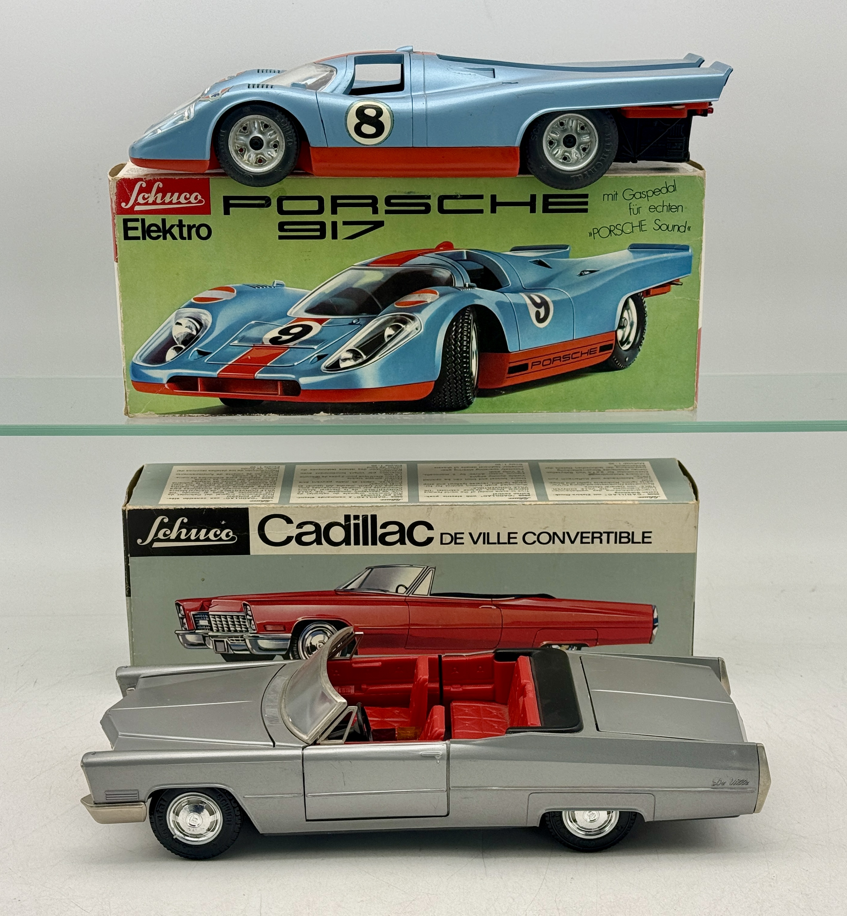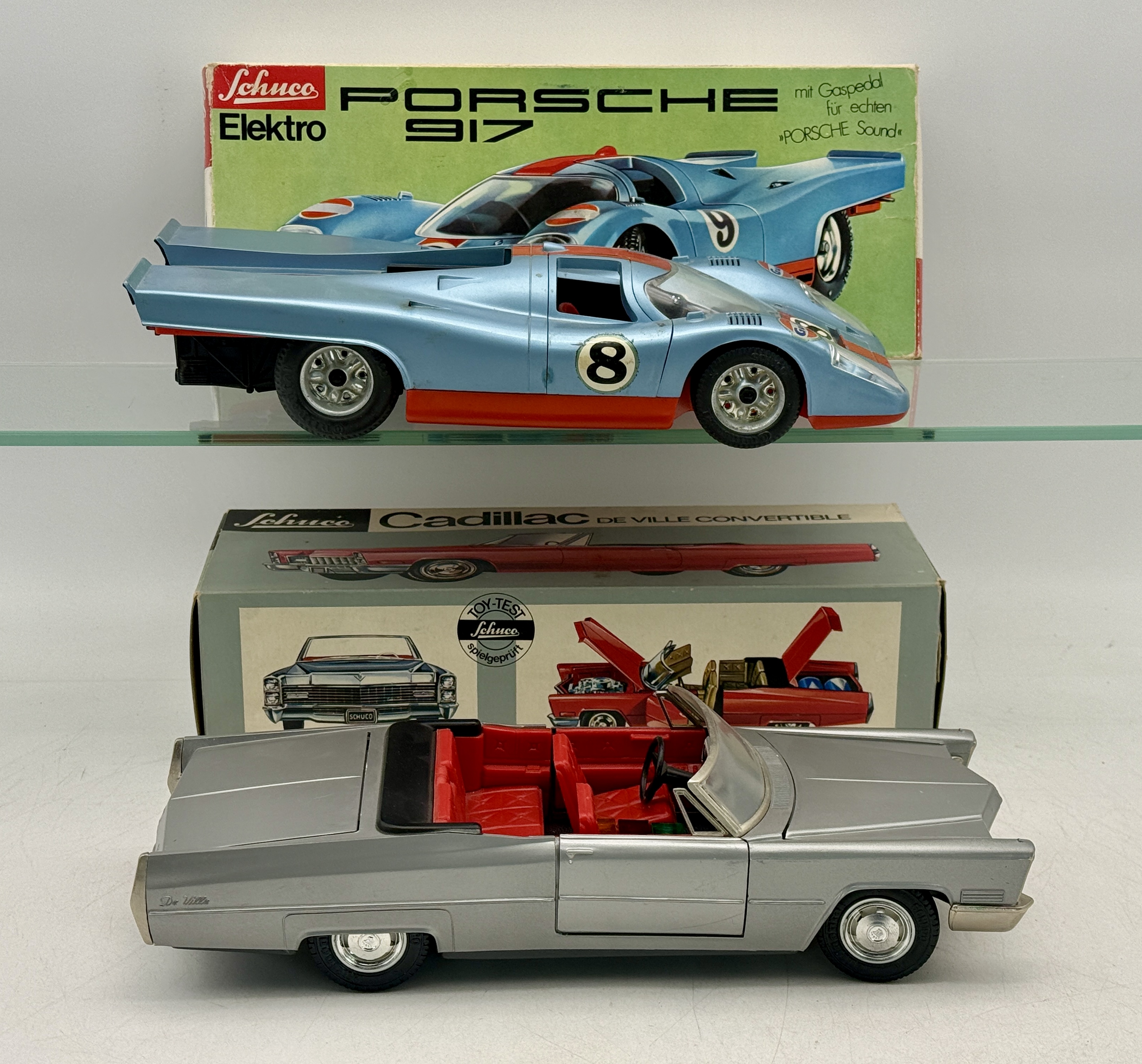 Two Schuco model cars including a light blue and red 356-213 Porsche 917 Elektro Weltmeister 1970 and a silver 5505 Cadillac De Ville Convertible with red interior, both with original boxes both are working, C8.