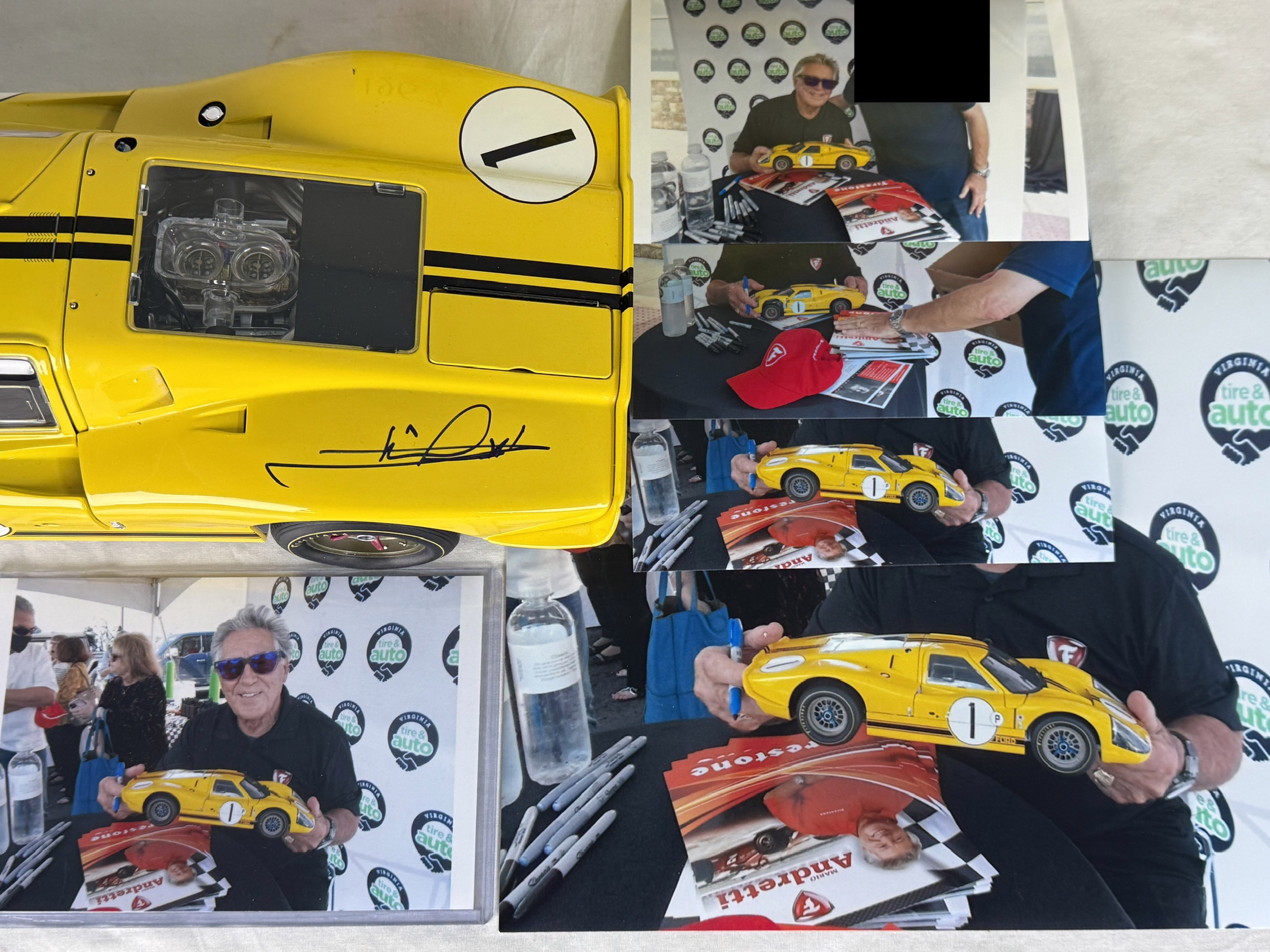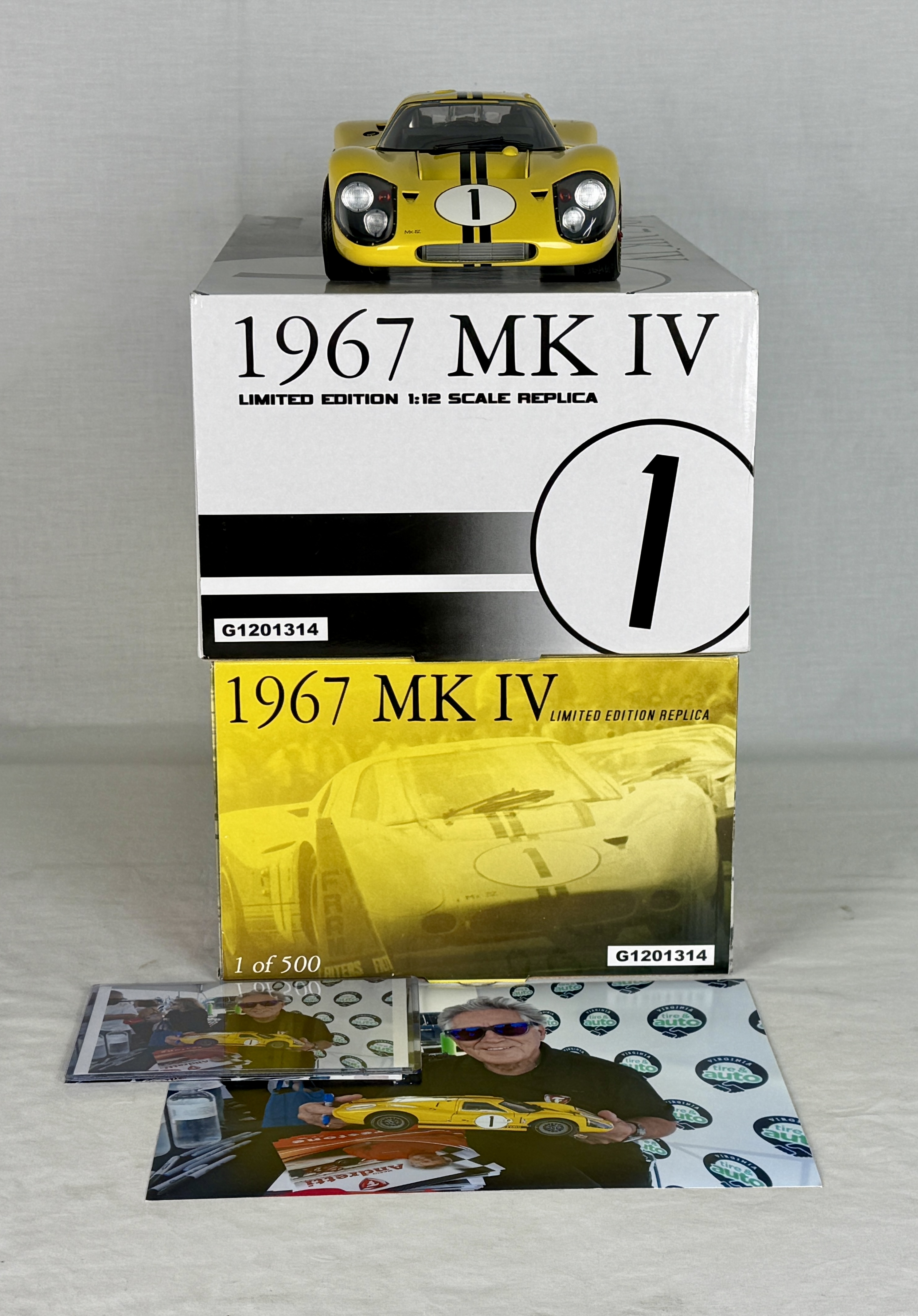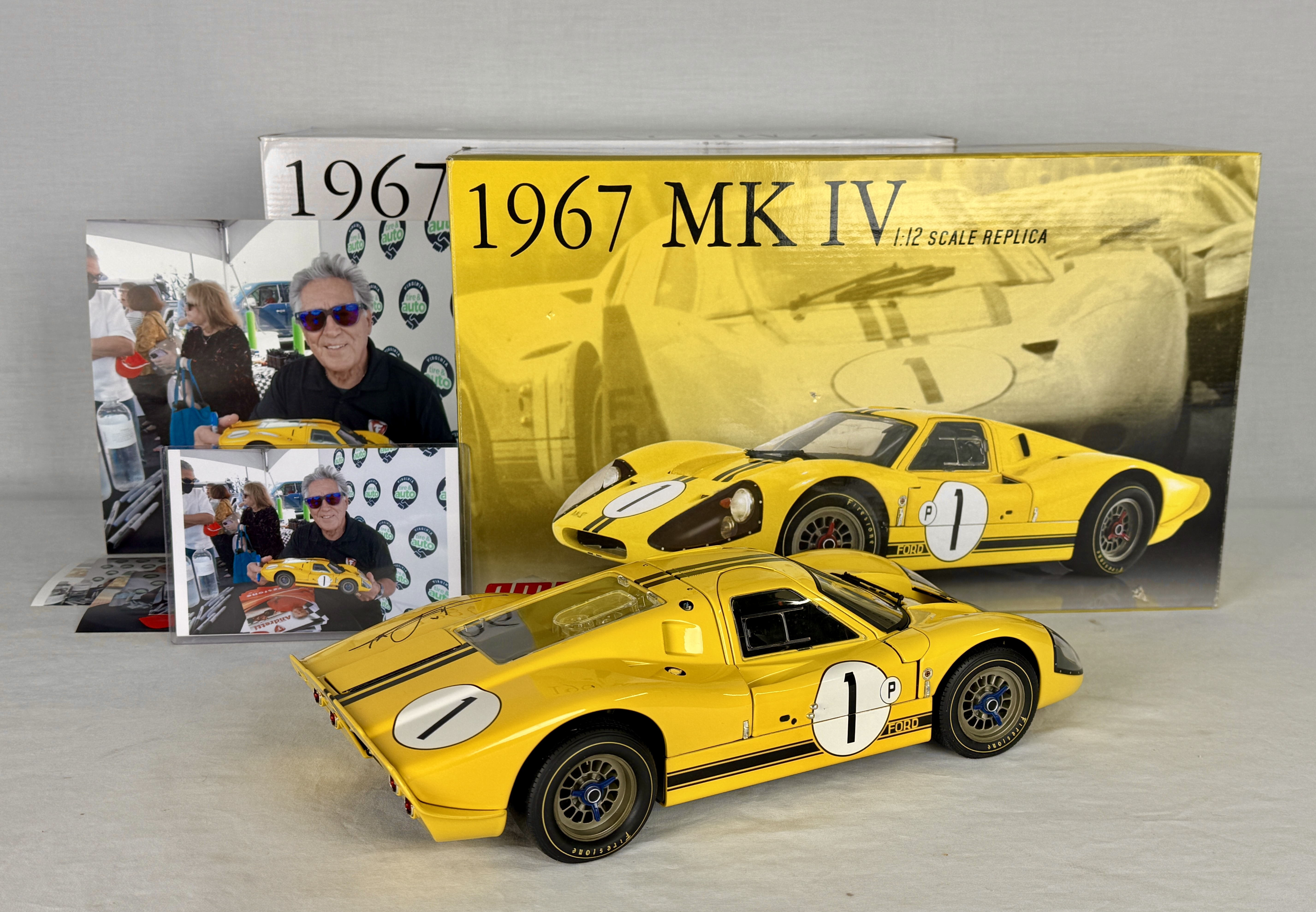 A yellow 1:12 scale GMP replica of a 1967 Ford MK IV race car signed by Mario Andretti with original packaging and signing photographs, C9.