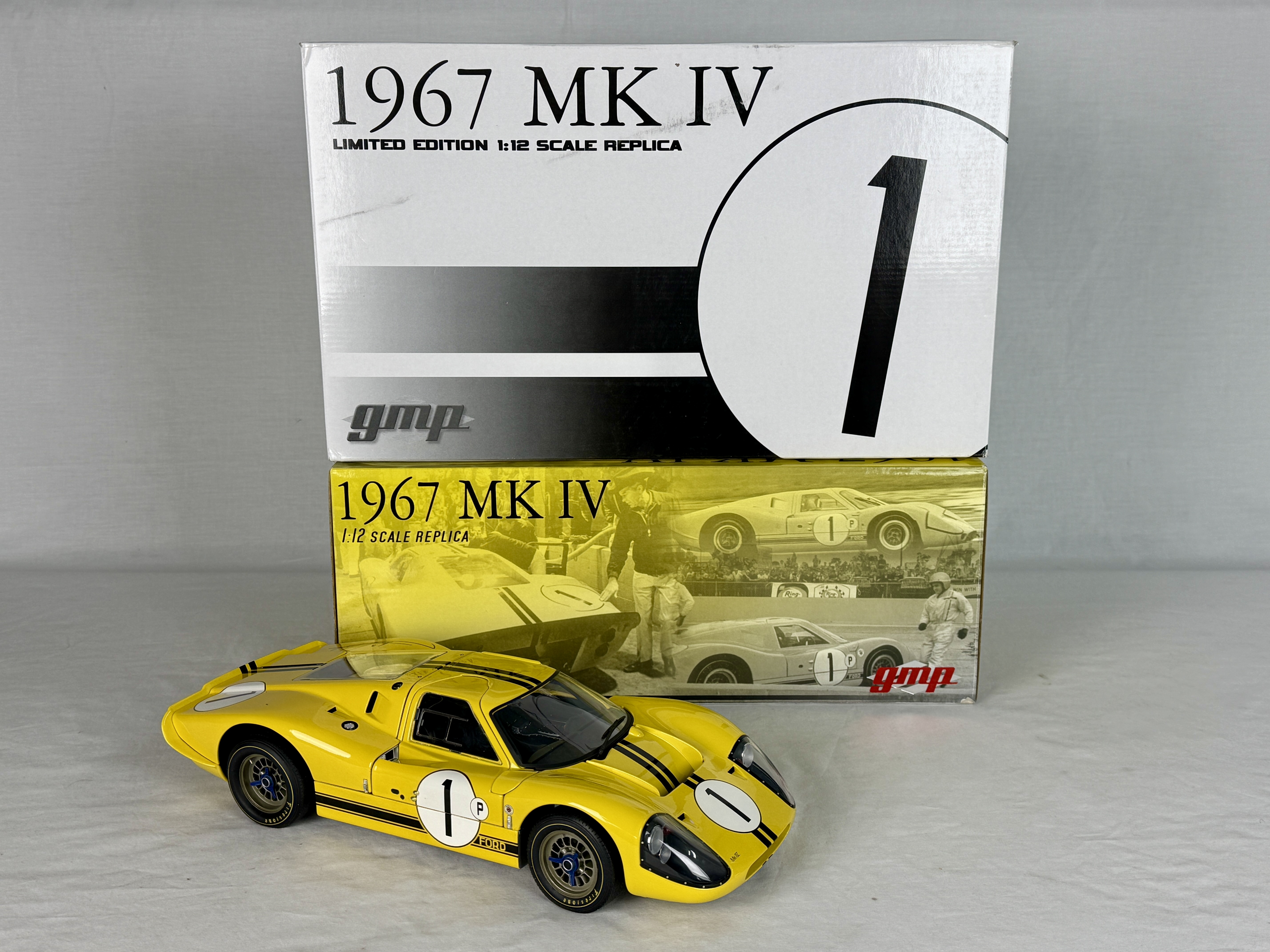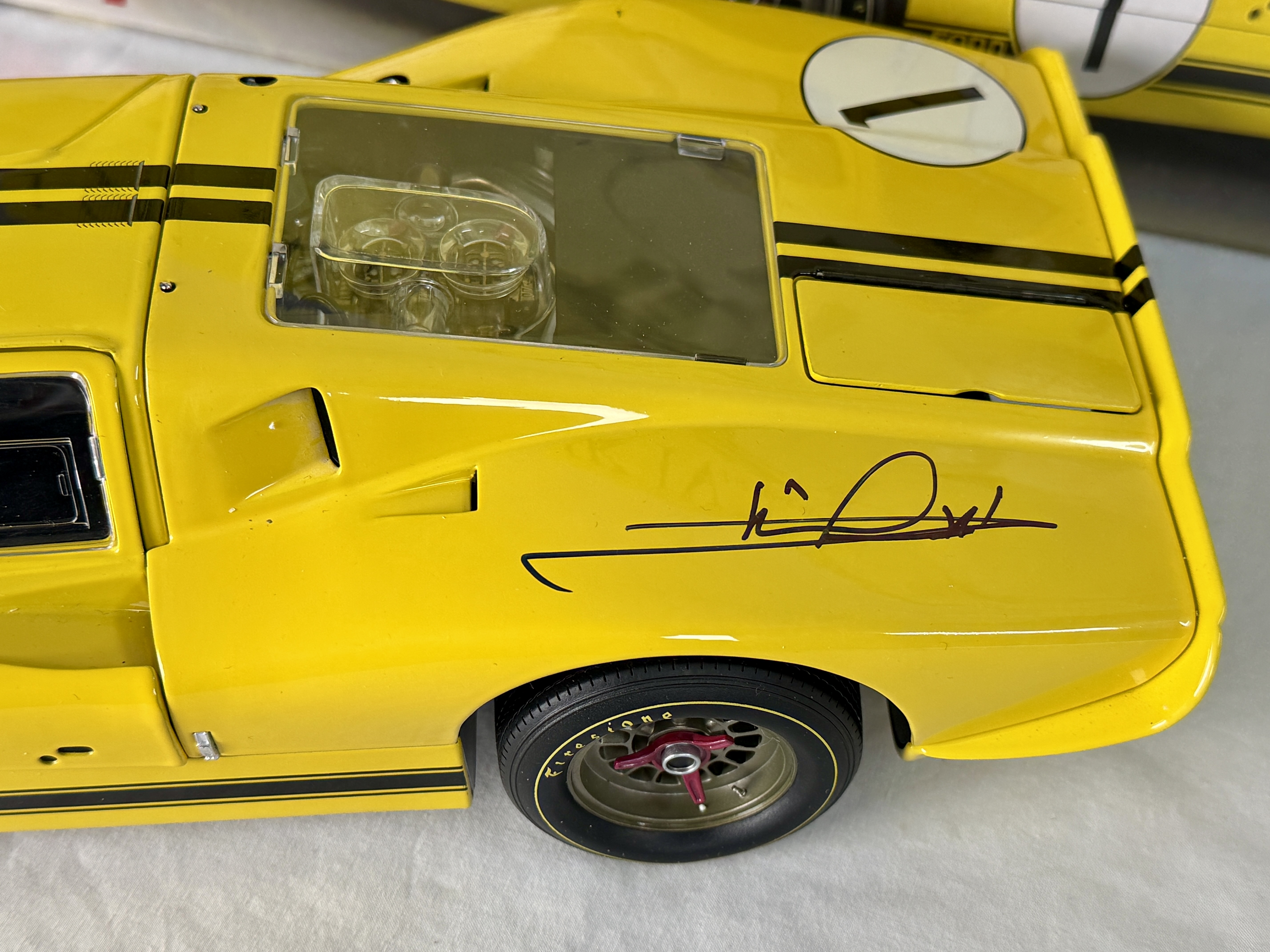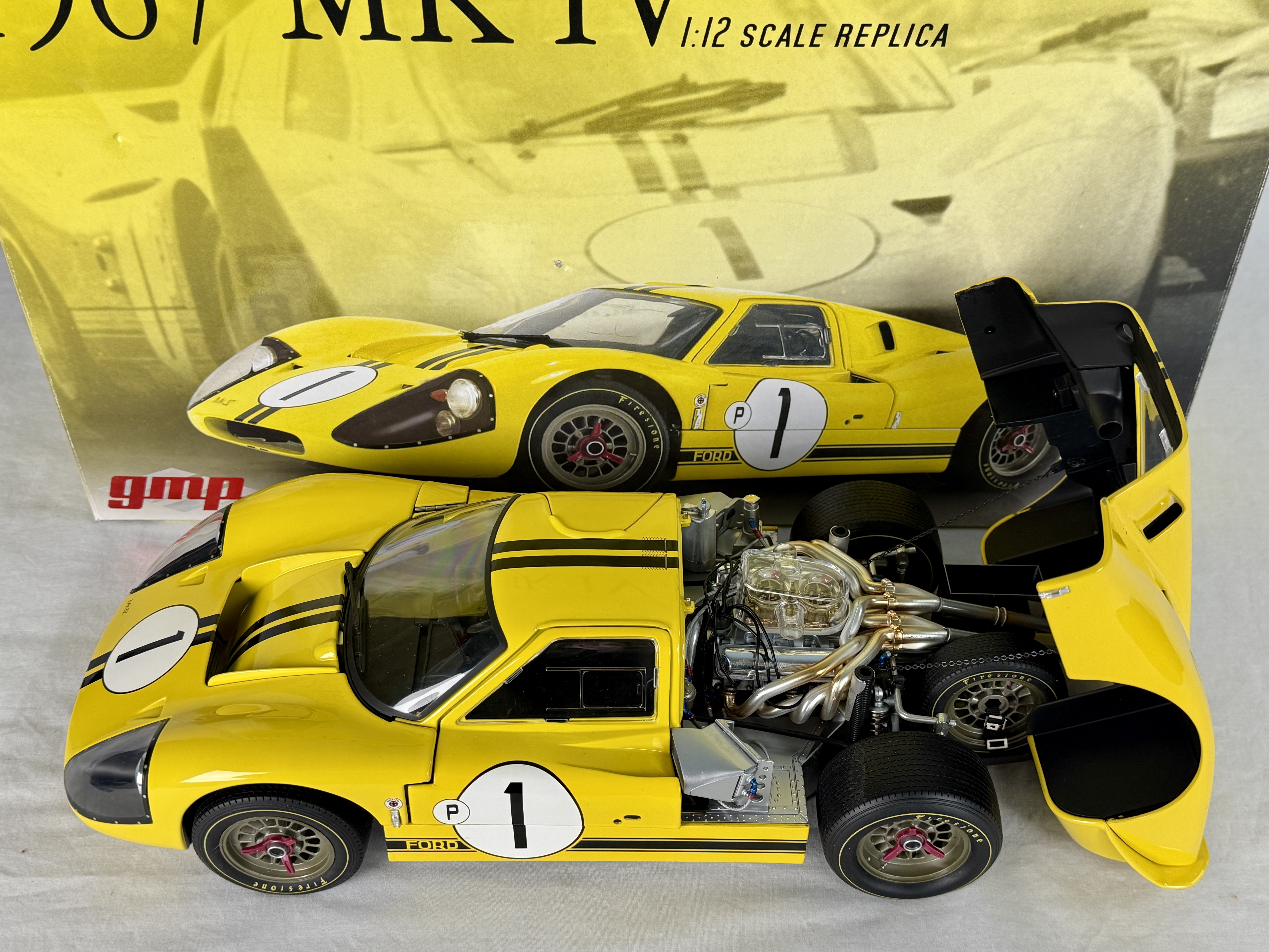 A yellow 1:12 scale GMP replica of a 1967 Ford MK IV race car signed by Mario Andretti with original packaging and signing photographs, C9.