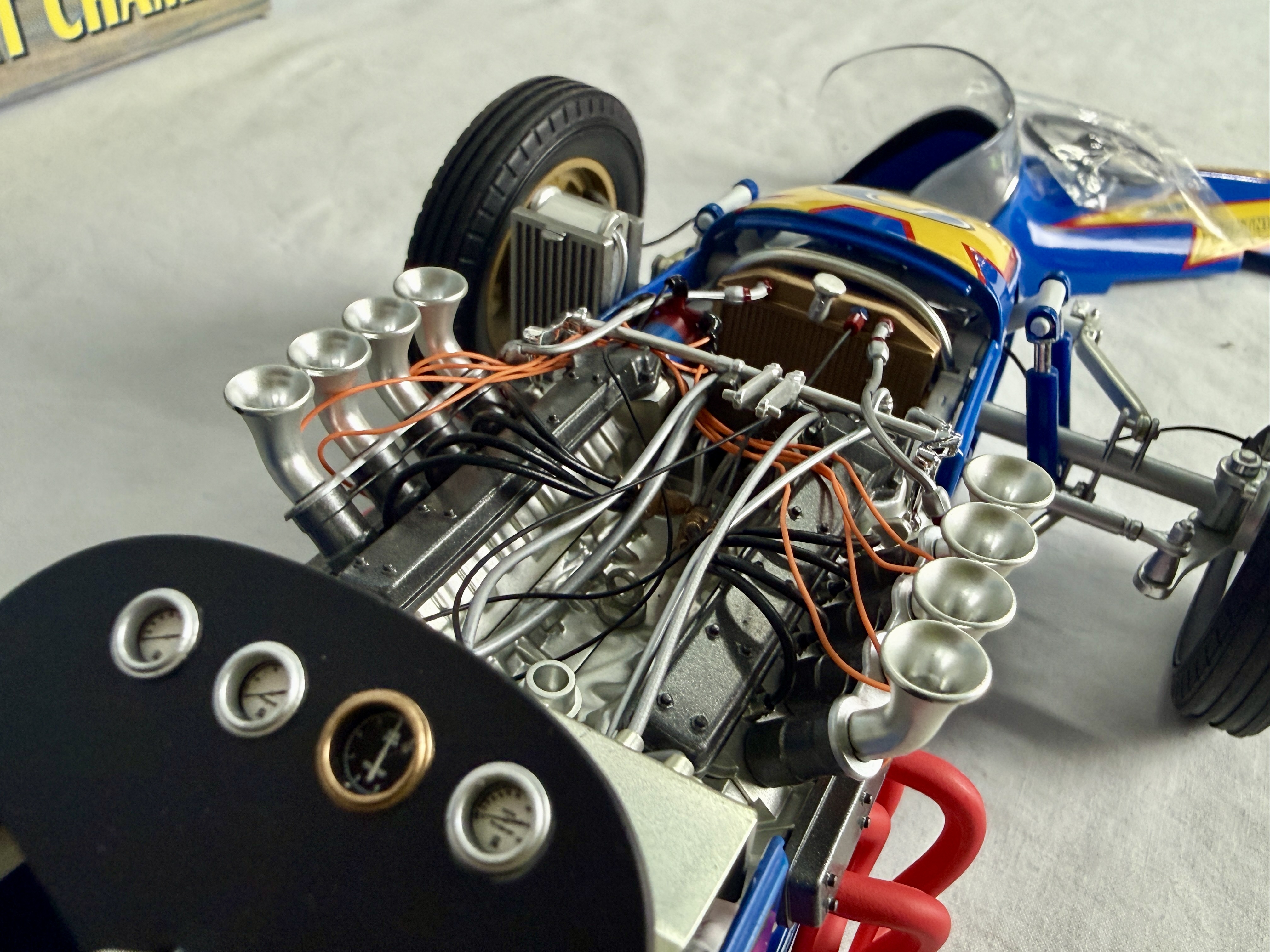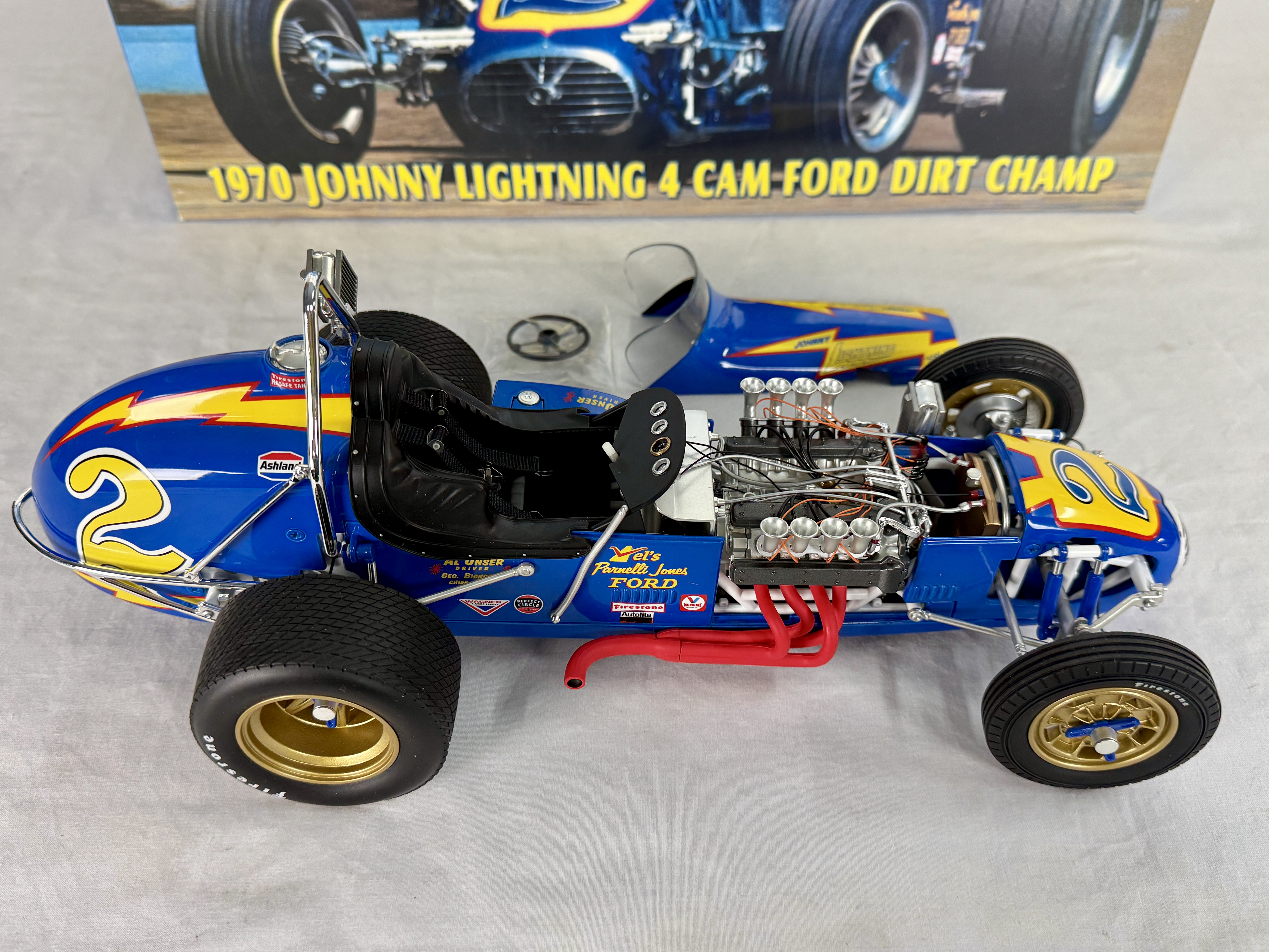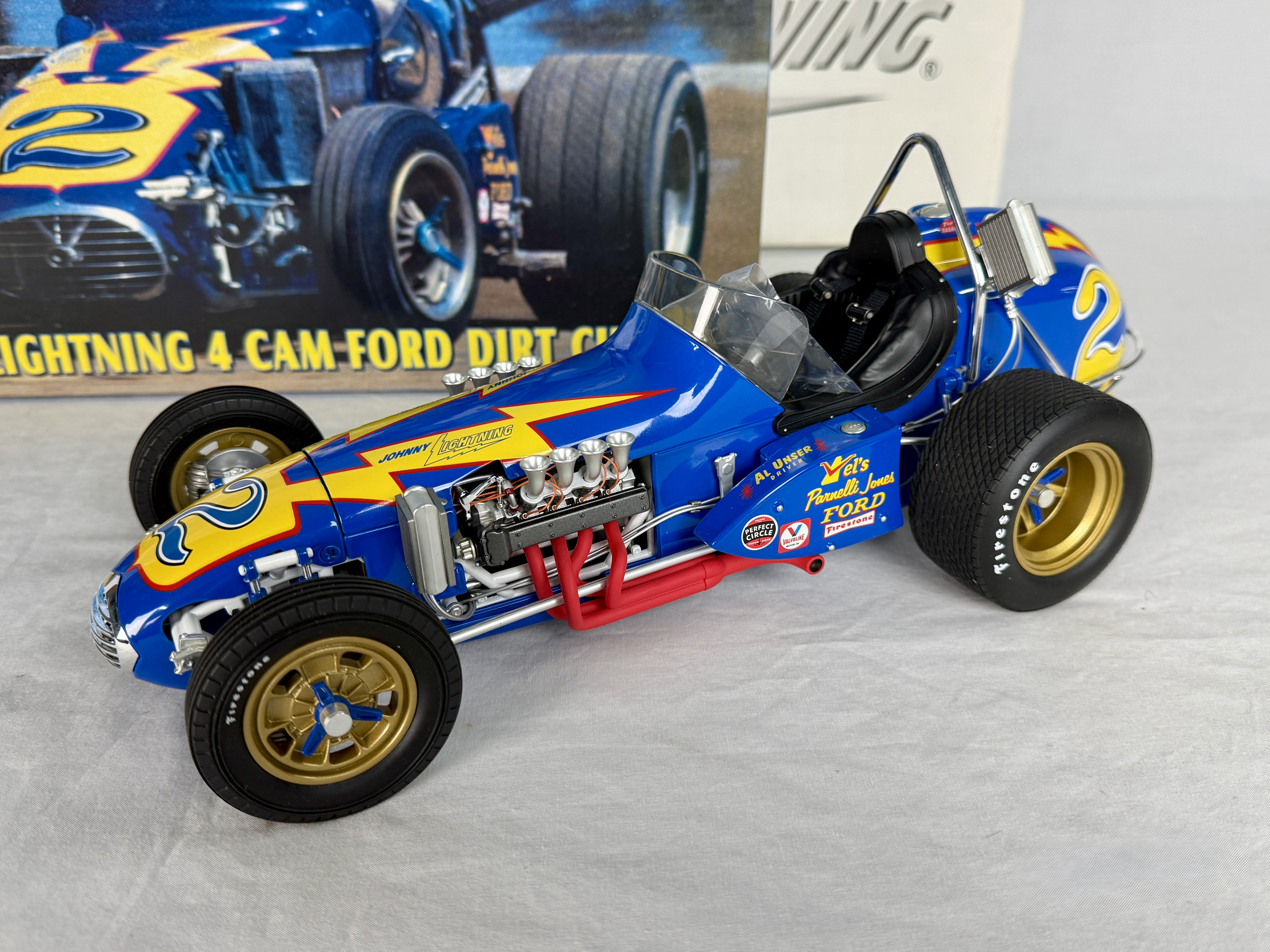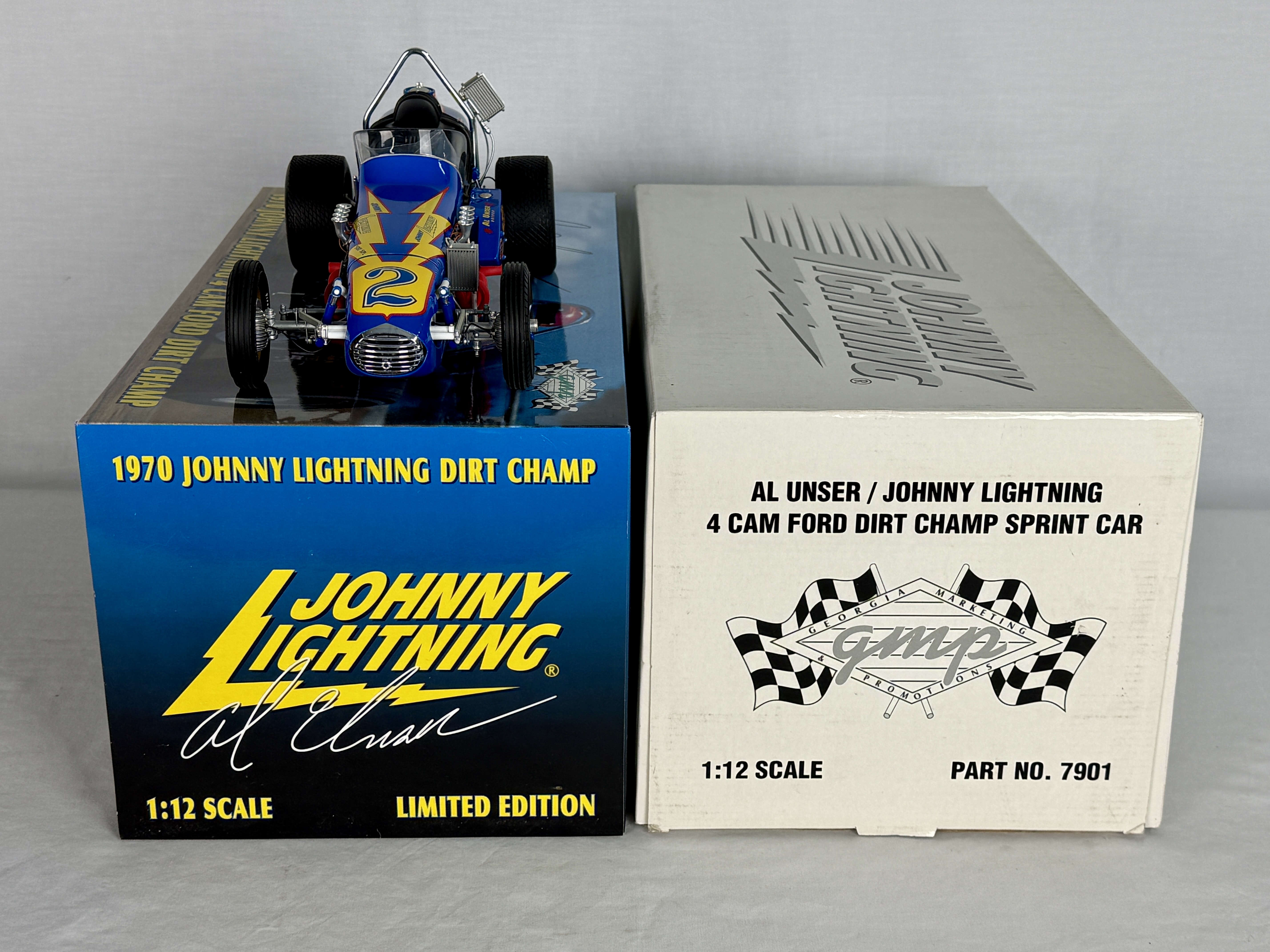 A 1:12 scale blue and yellow die-cast model of the 1970 Johnny Lightning 4 Cam Ford Dirt Champ sprint car driven by Al Unser, including its original packaging, C9.