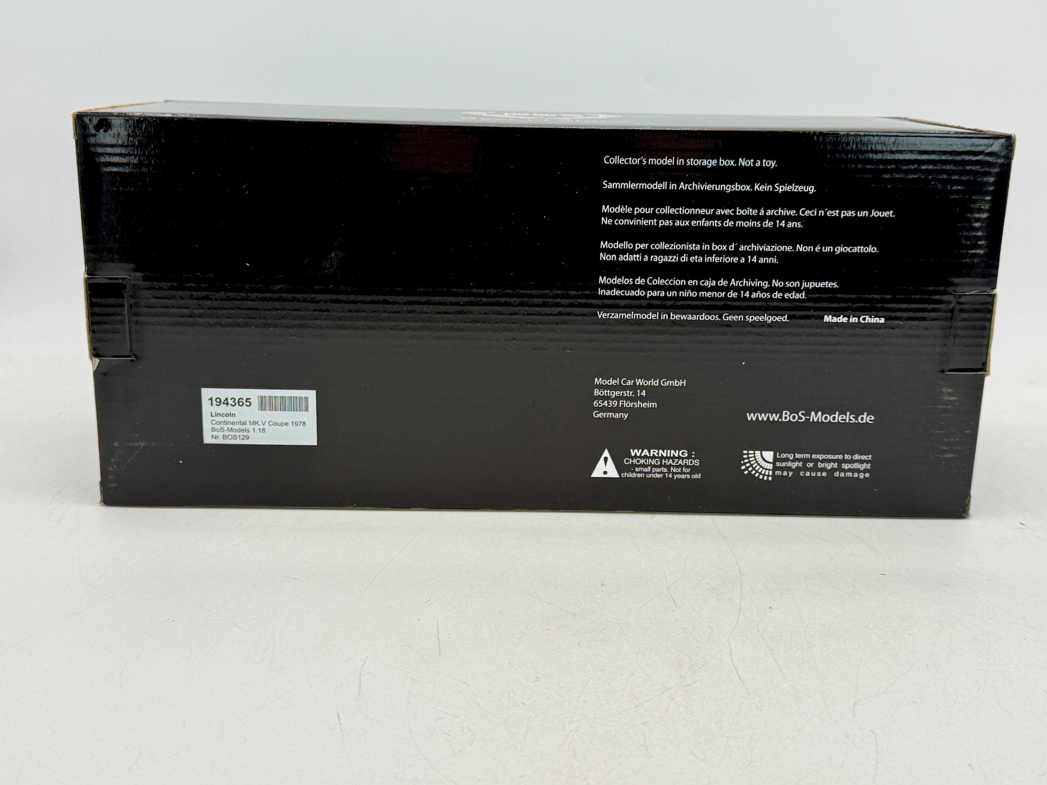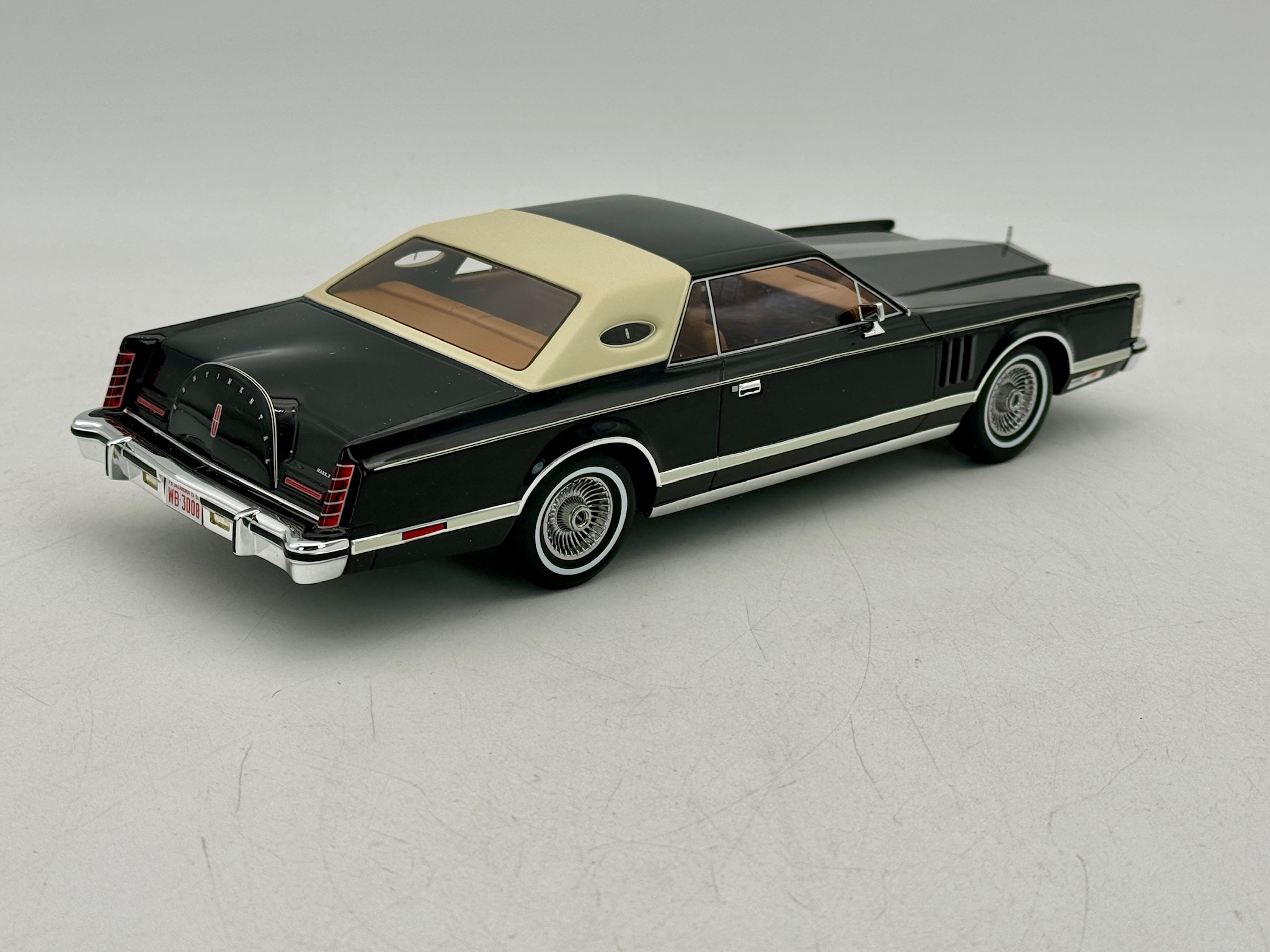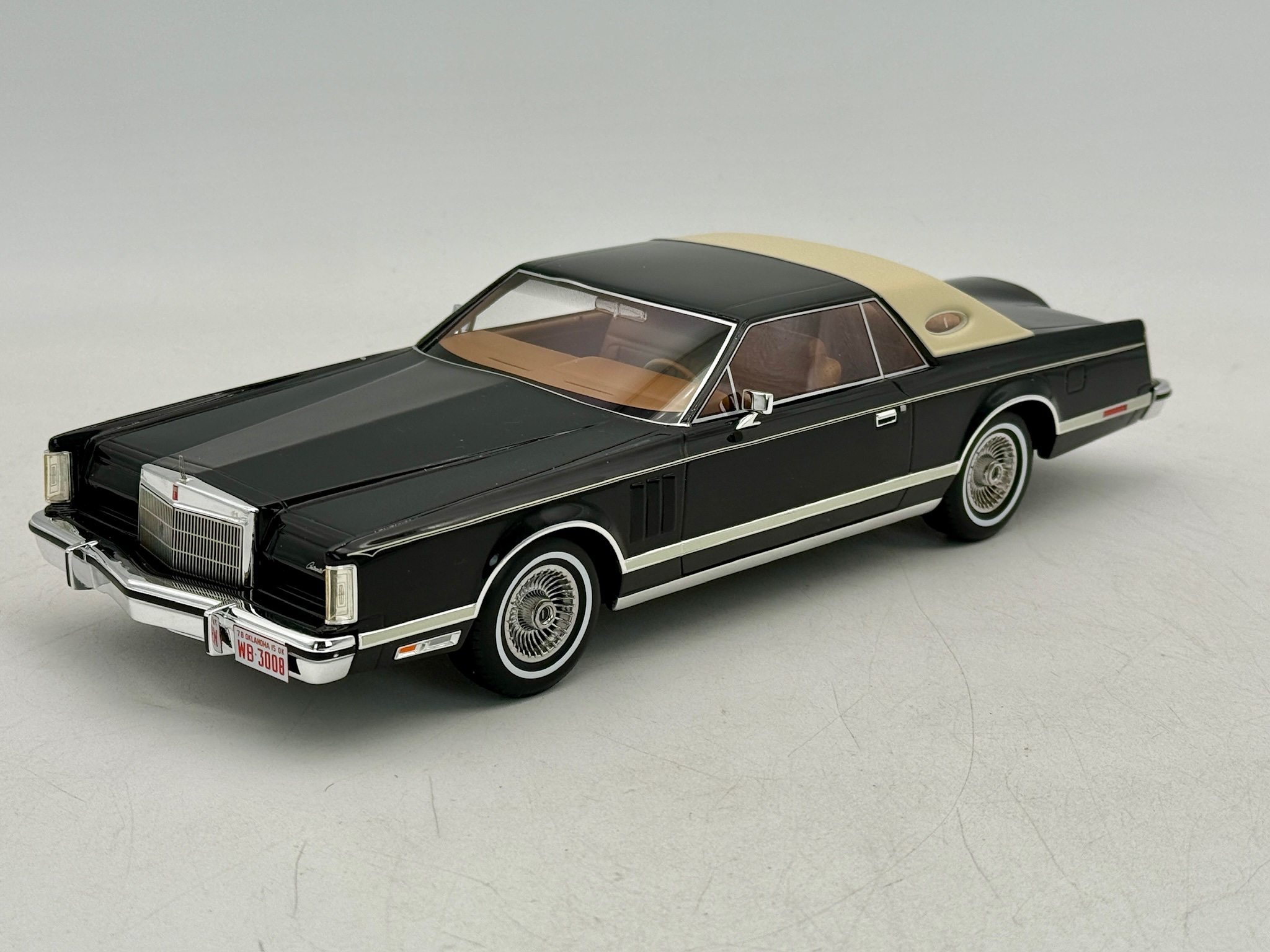 A 1:18 scale black and tan 1978 Lincoln Continental MK.V Coupe model car featuring an Oklahoma license plate and original Best of Show packaging. Resin and diecast, 13 inches long, OB and insert with graffiti, number 866 out of 1000 C9.