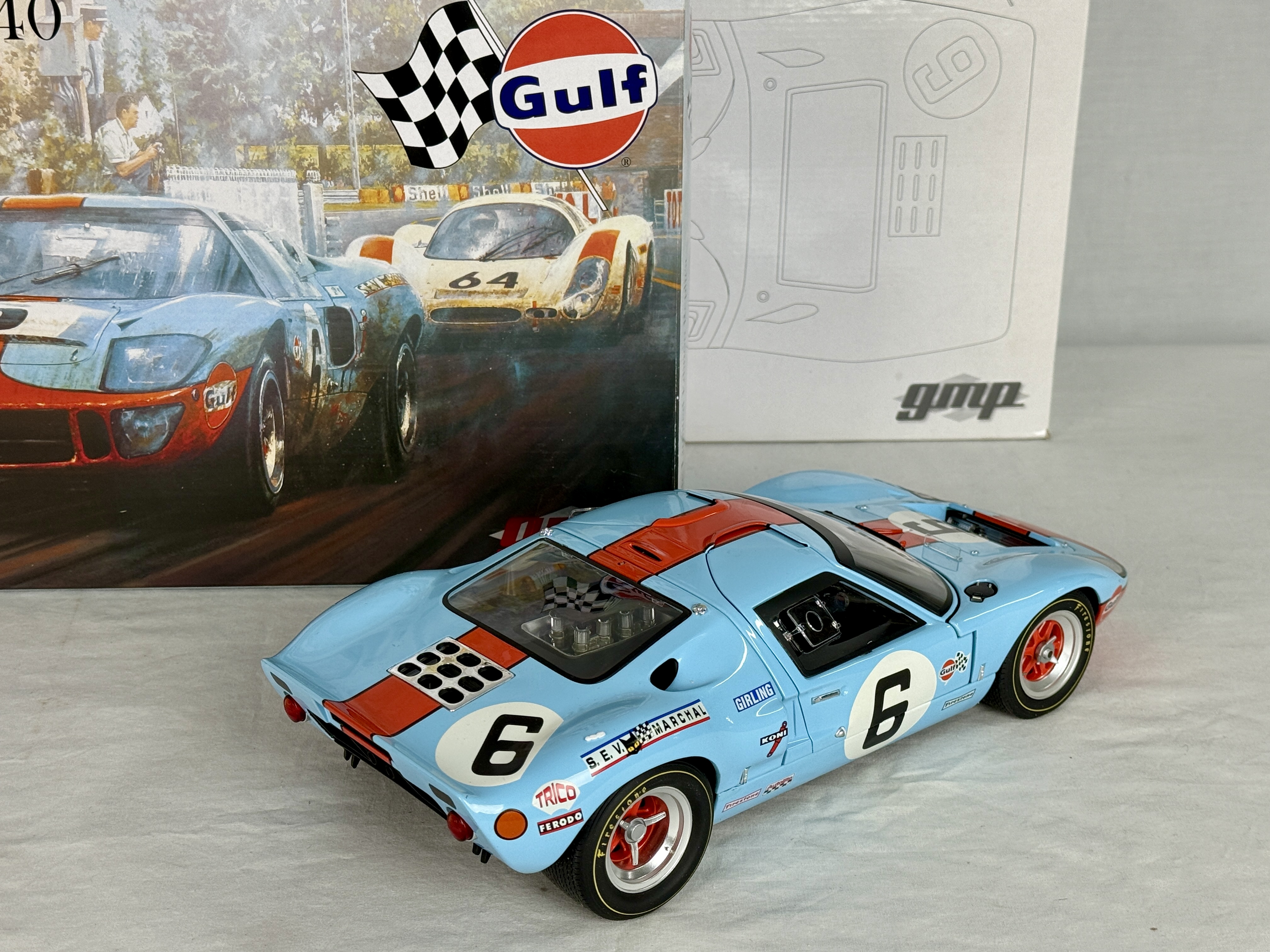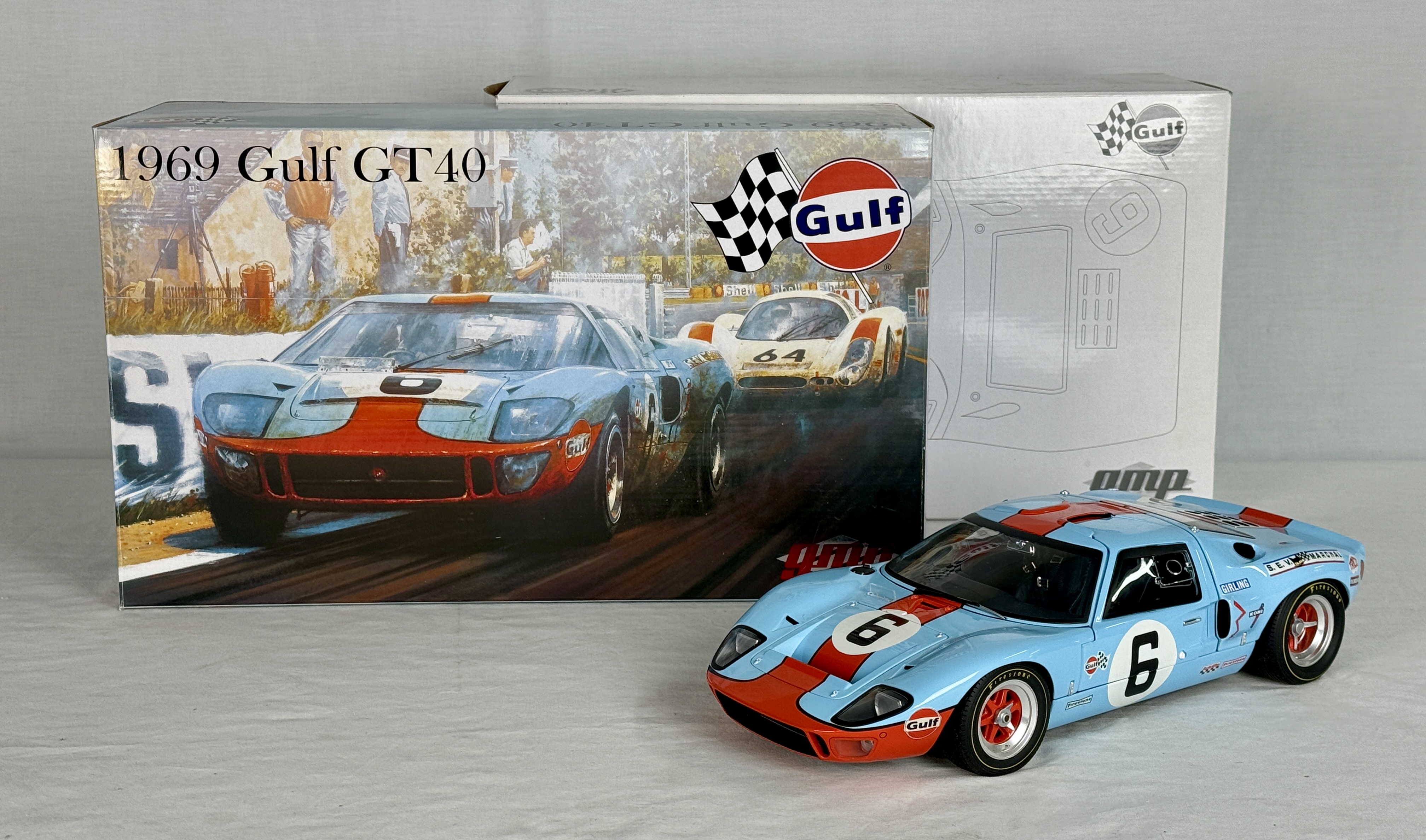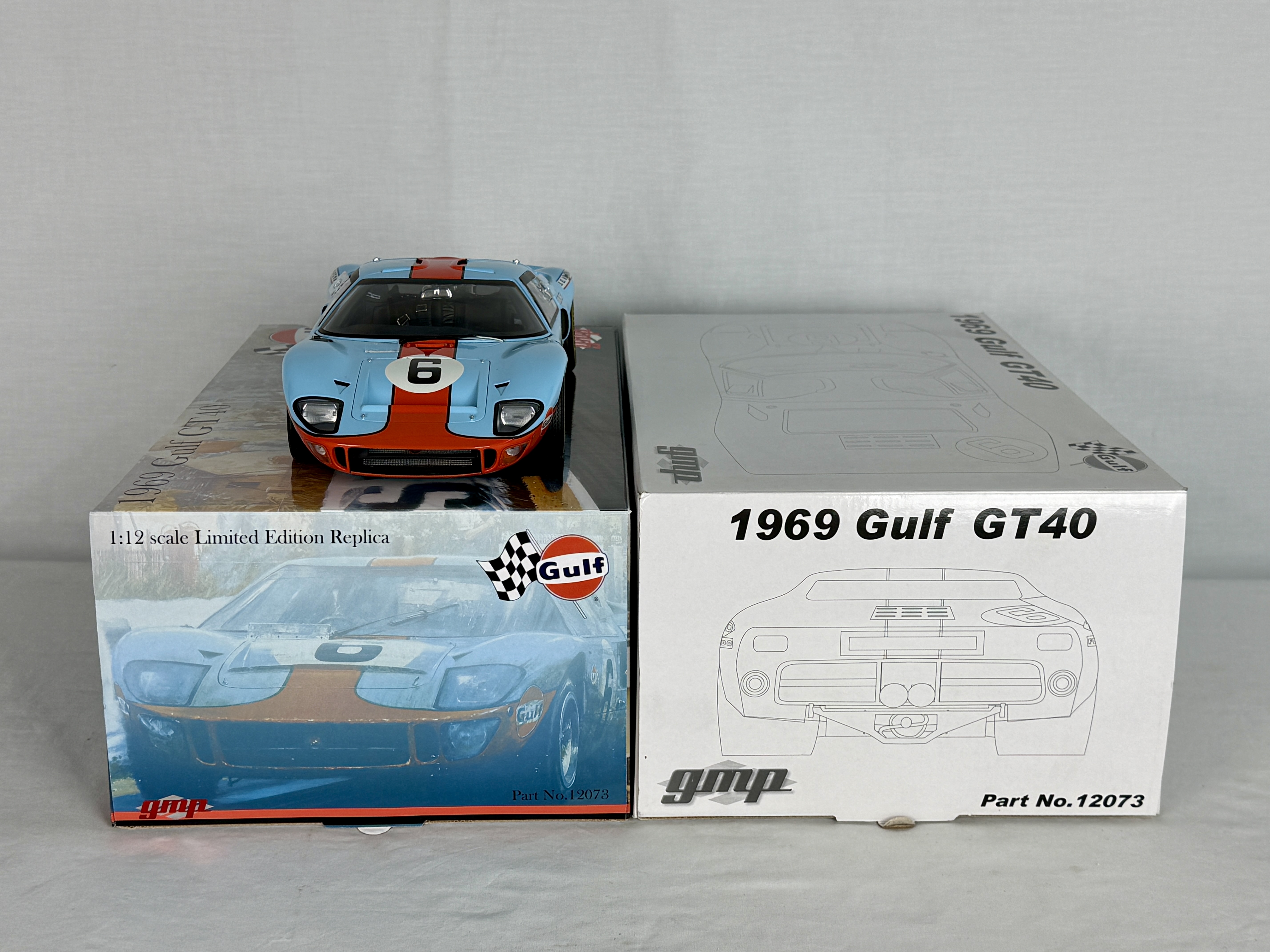 A 1:12 scale GMP limited edition replica of a 1969 Gulf GT40 in light blue and orange with racing number 6 and sponsor decals, accompanied by its original boxes bearing part number 12073, C9.
