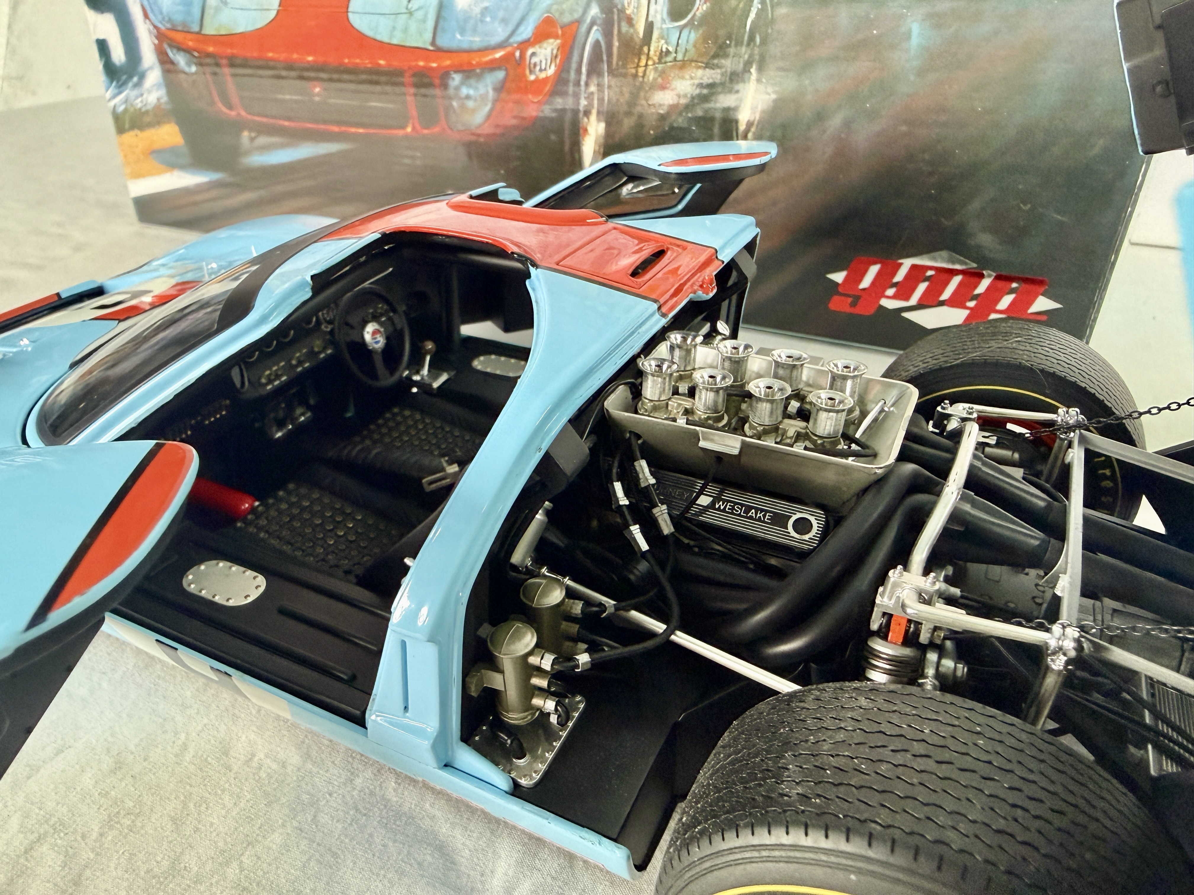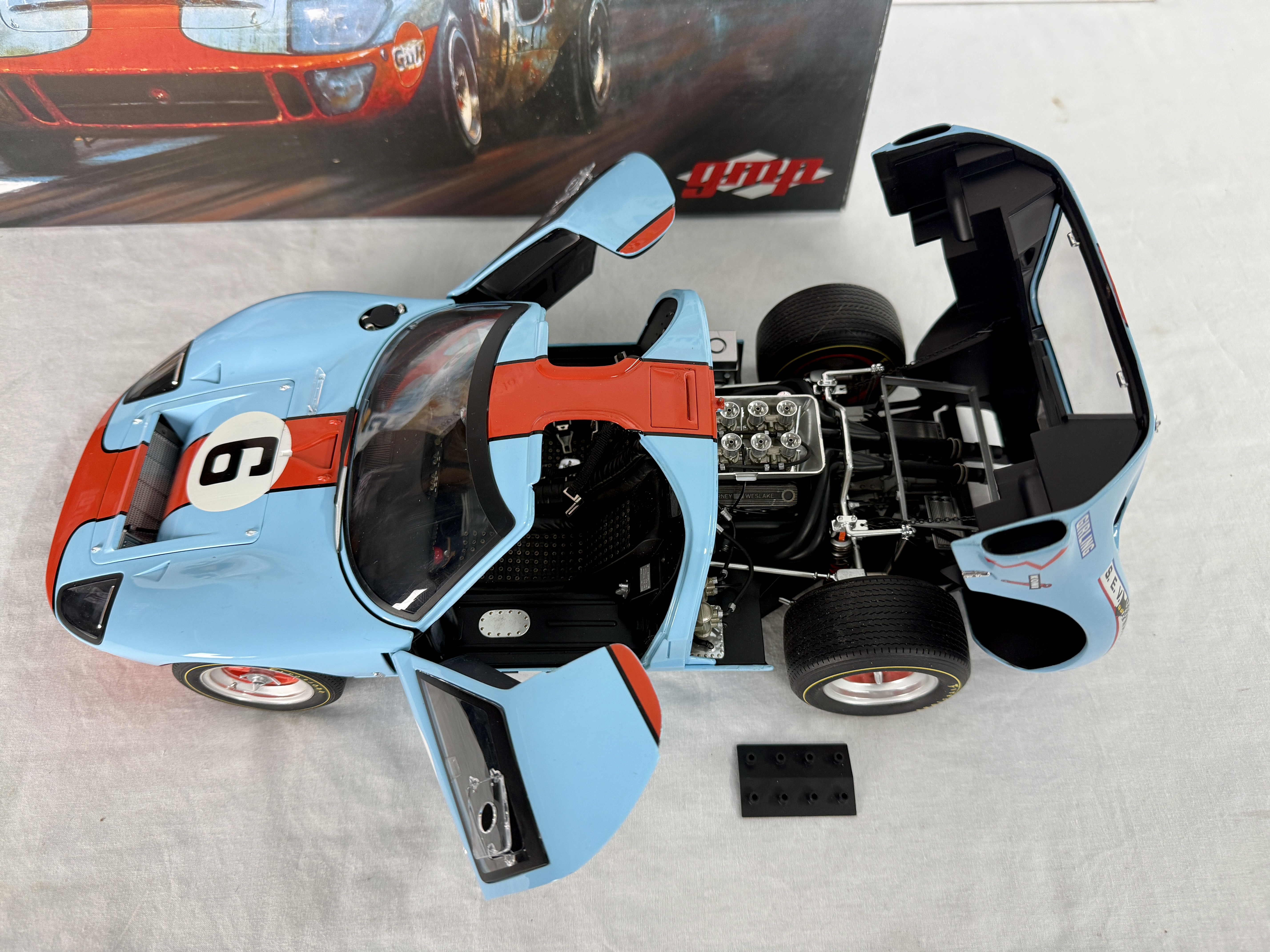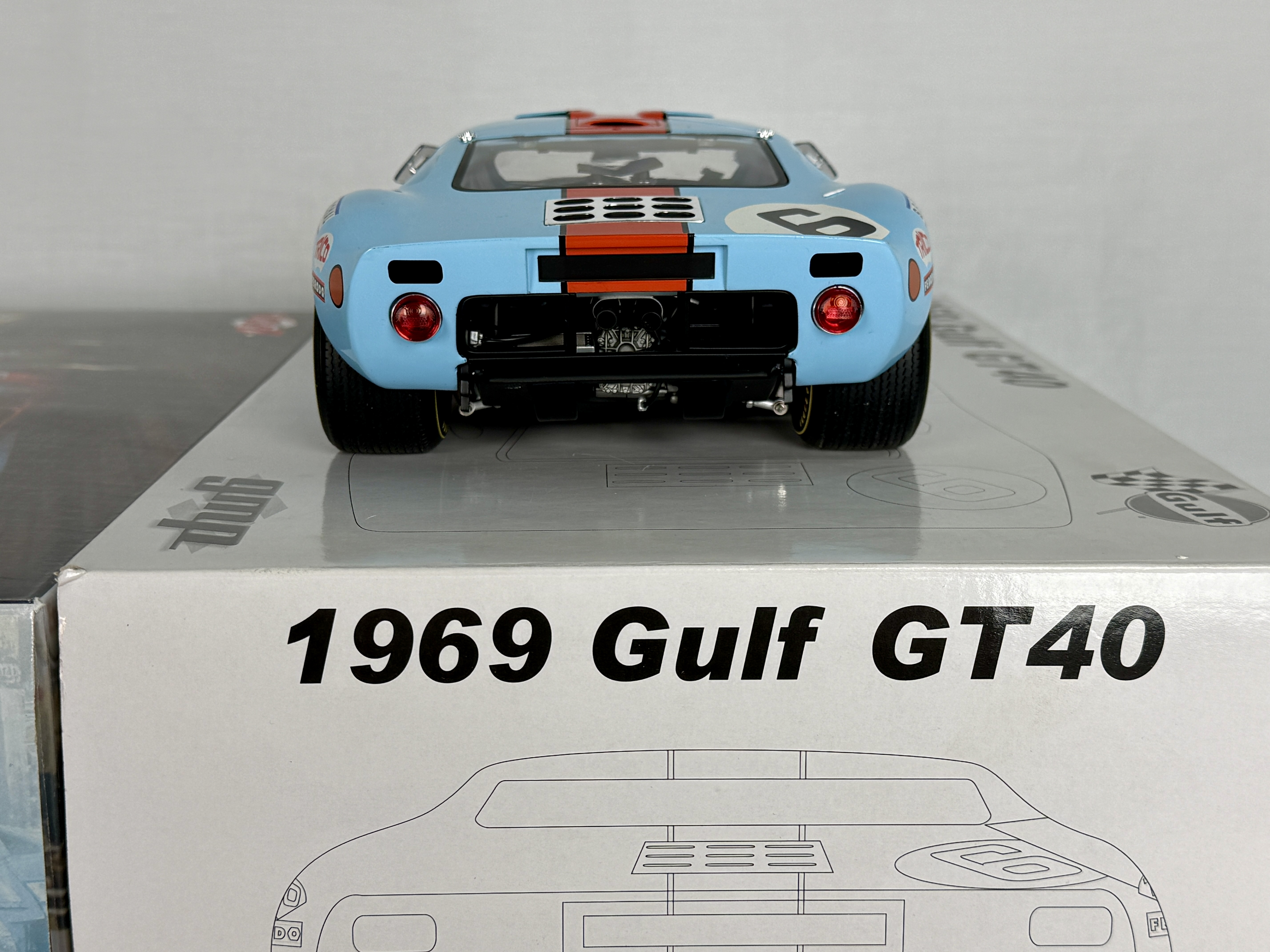 A 1:12 scale GMP limited edition replica of a 1969 Gulf GT40 in light blue and orange with racing number 6 and sponsor decals, accompanied by its original boxes bearing part number 12073, C9.