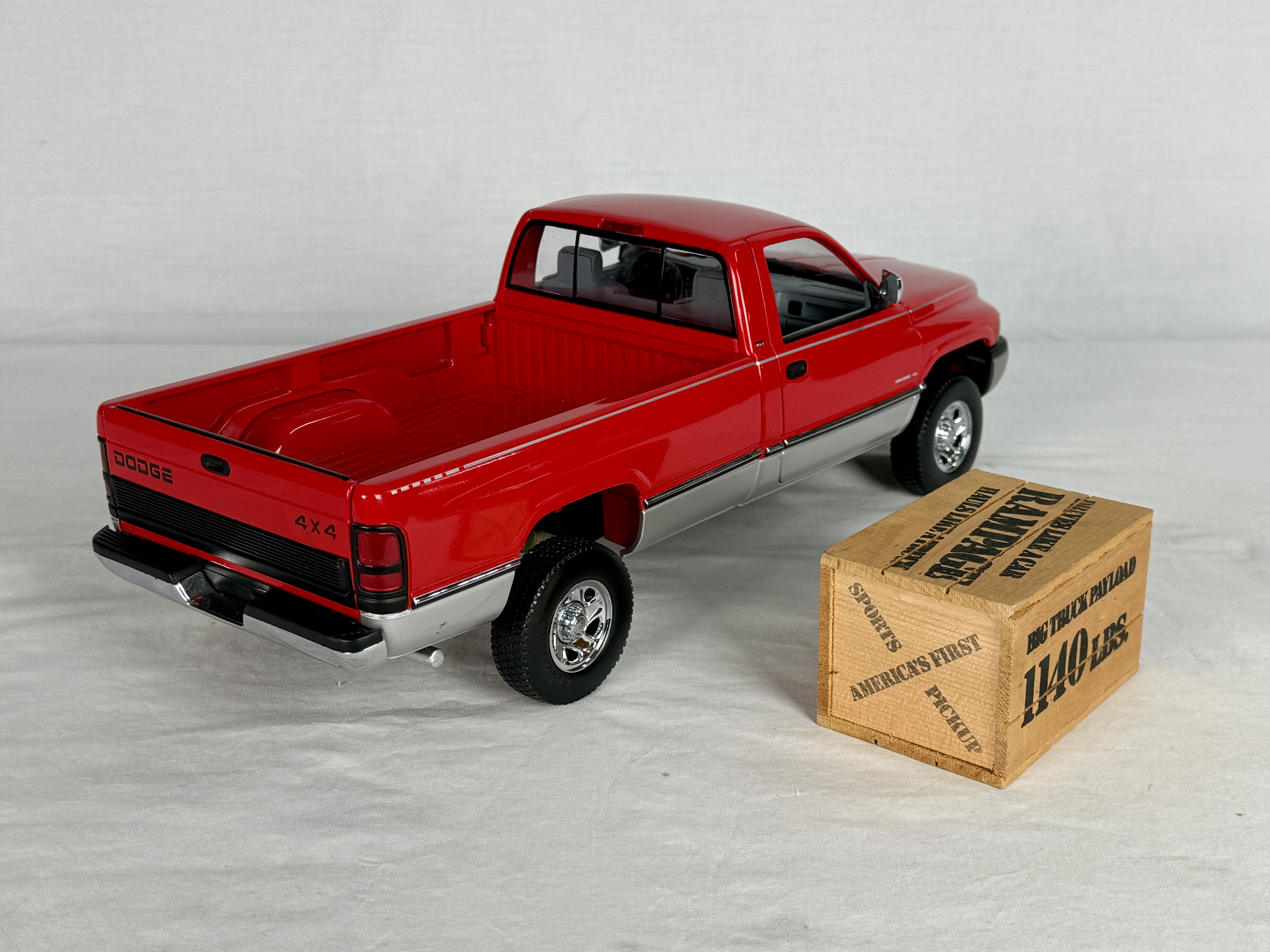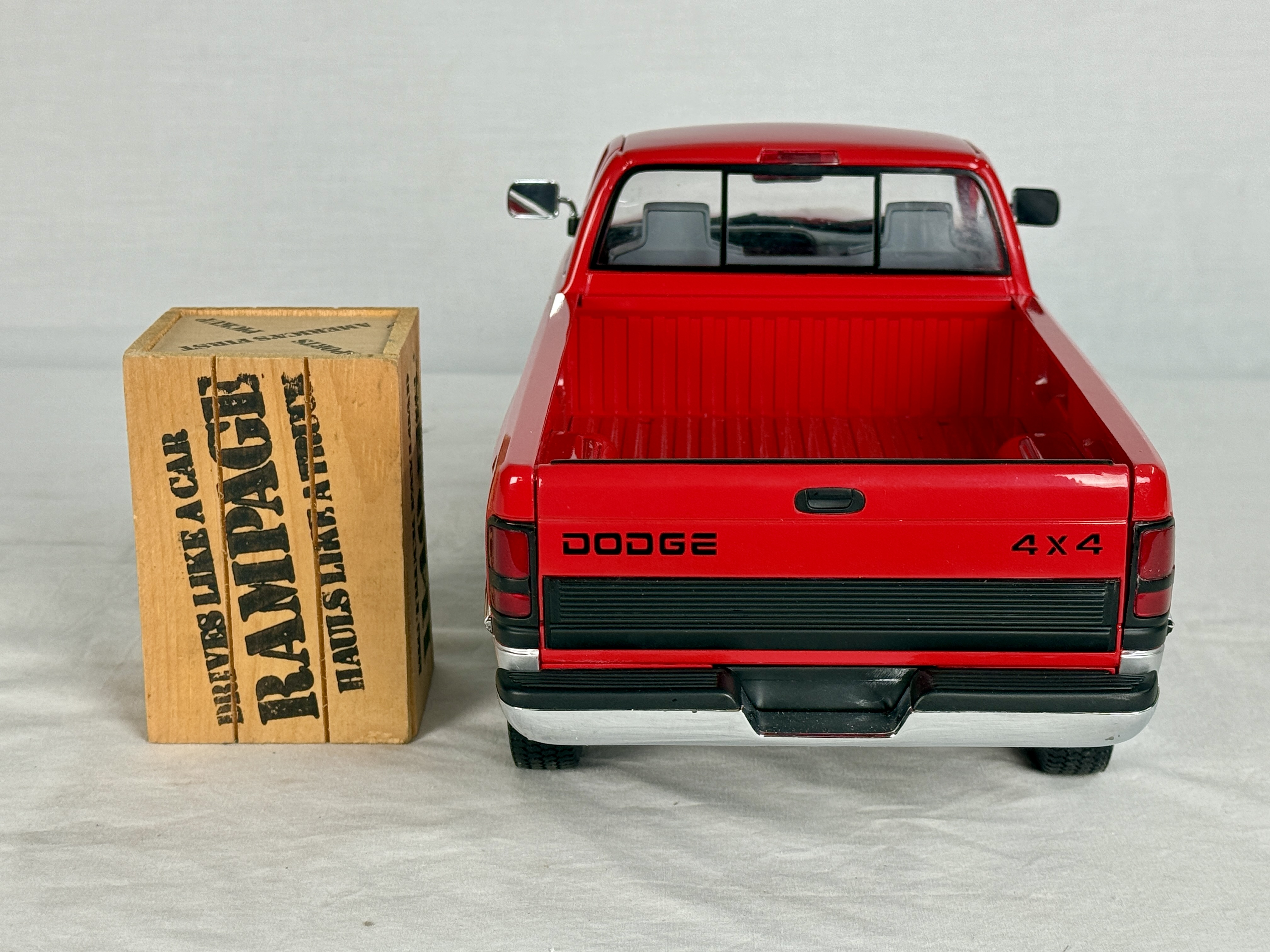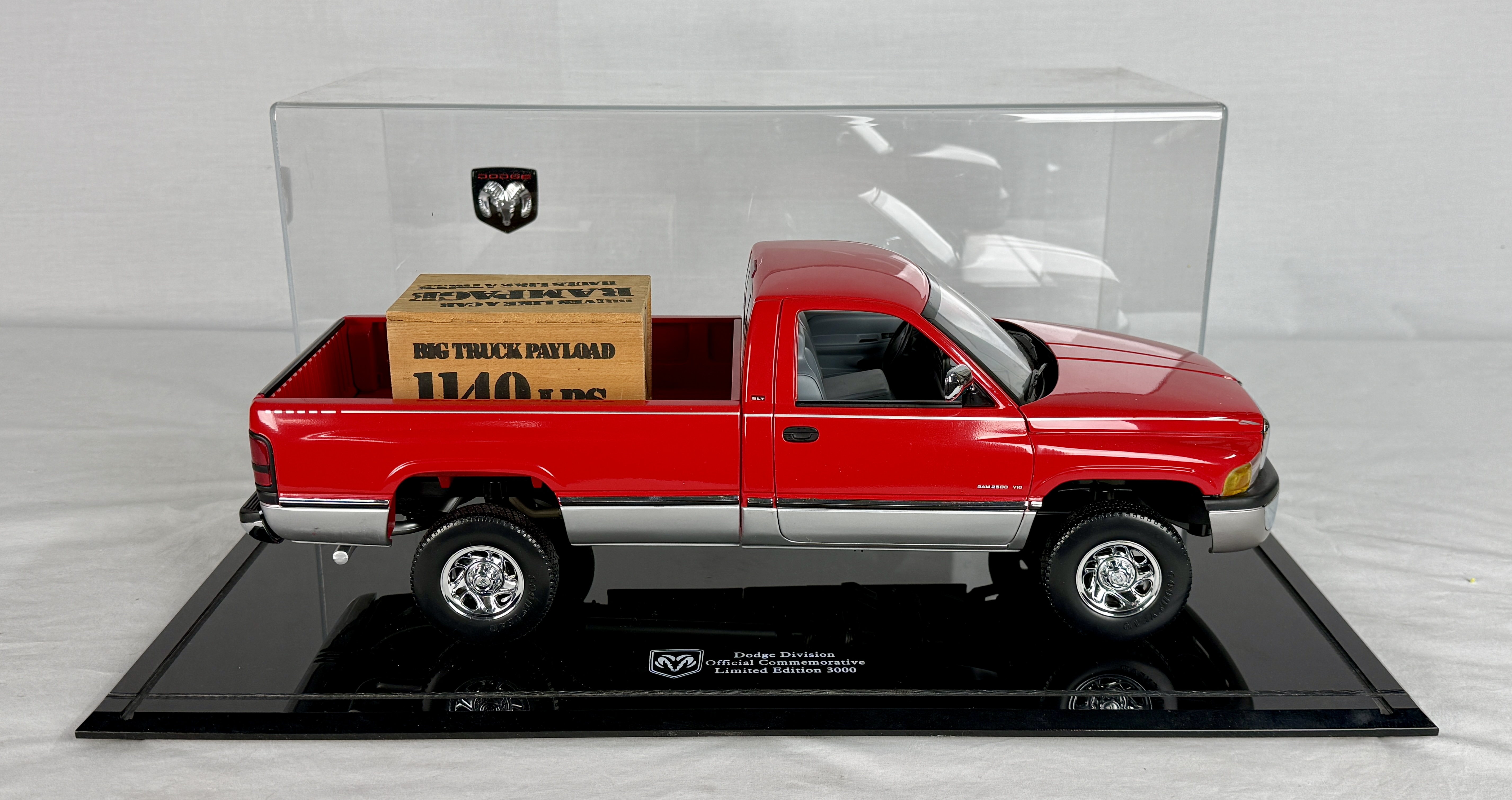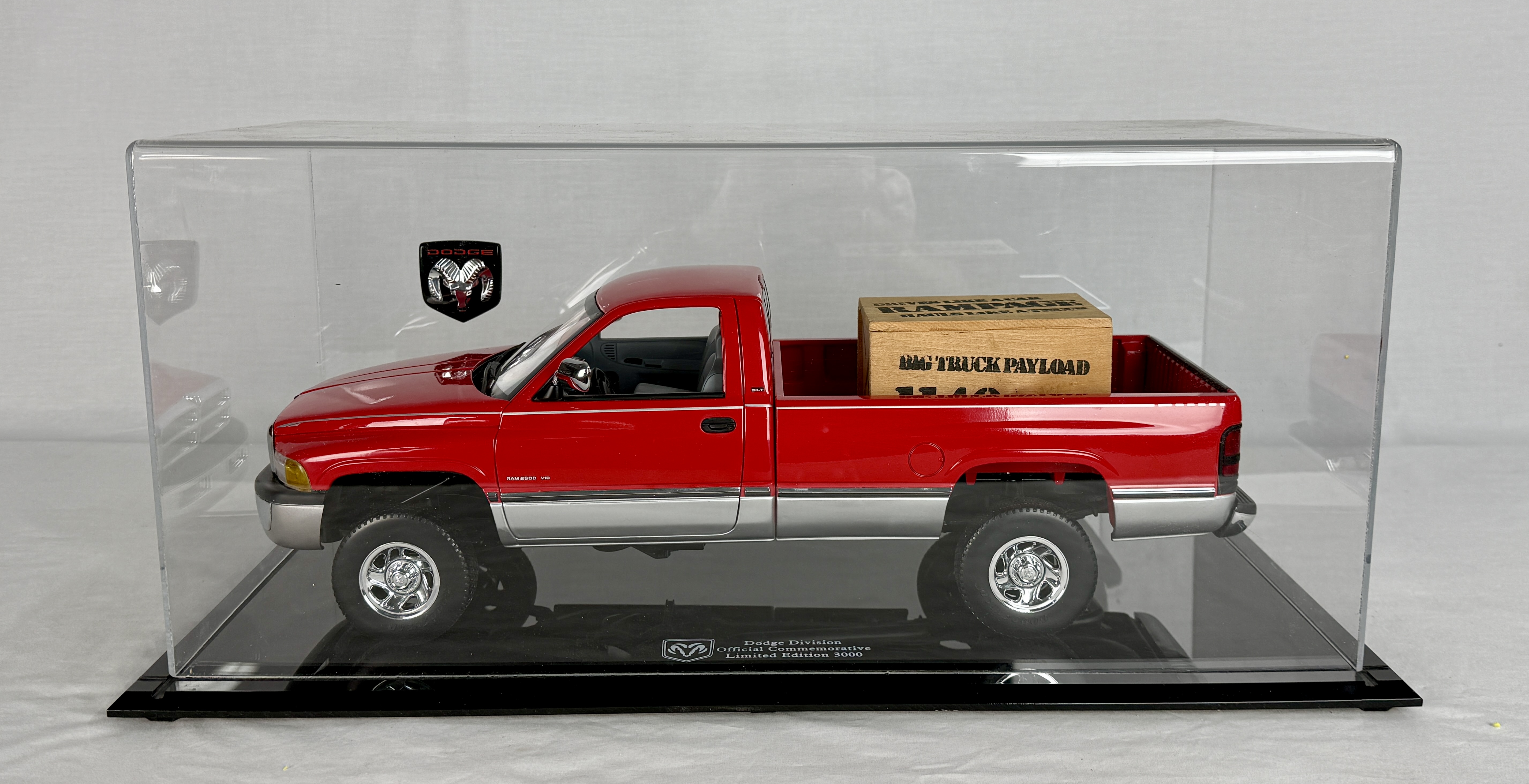 A red and silver Dodge Ram V-10 commemorative 18 inch model truck featuring a clear display case, wooden crate accessory, and original shipping box, C9.
