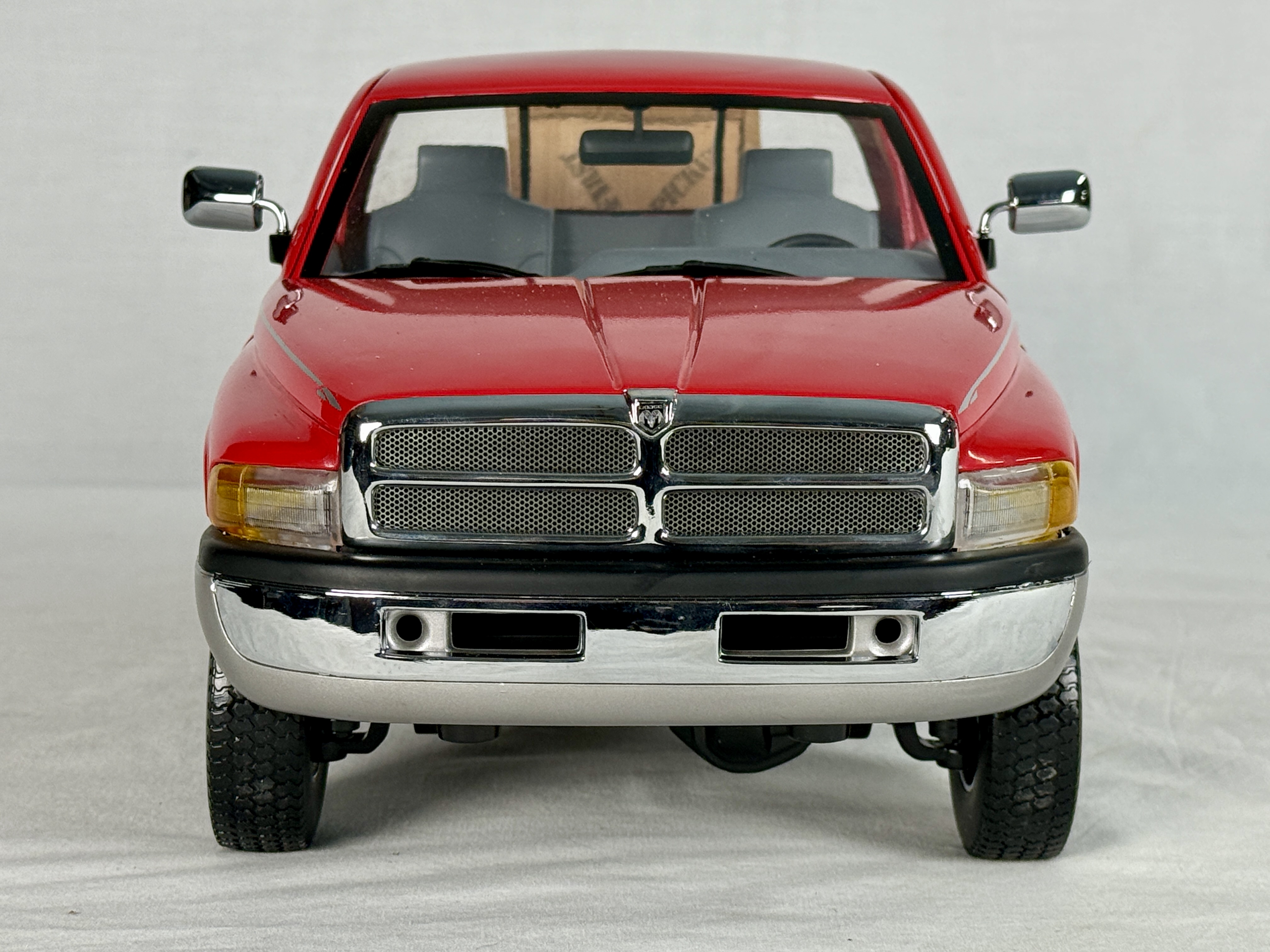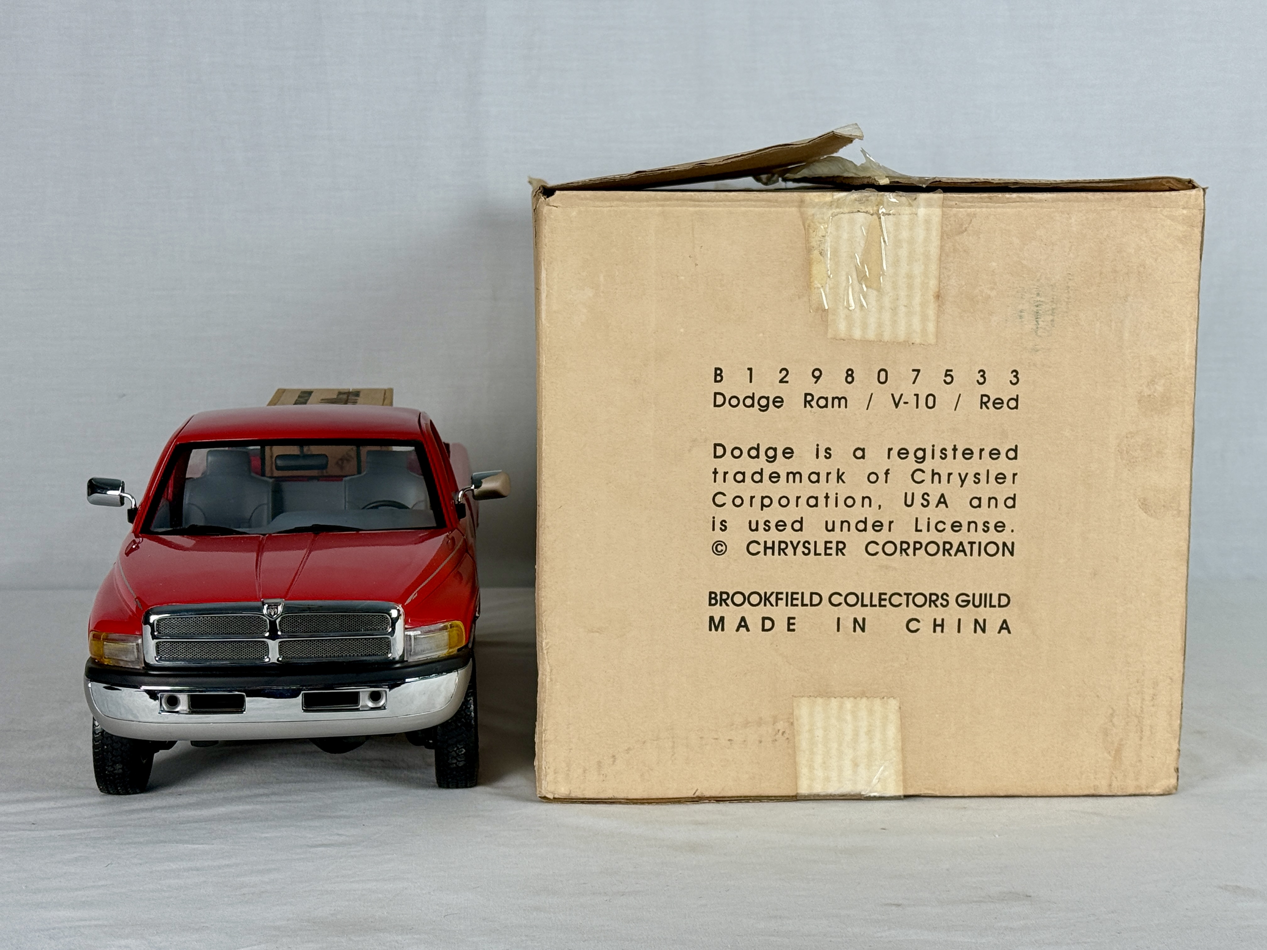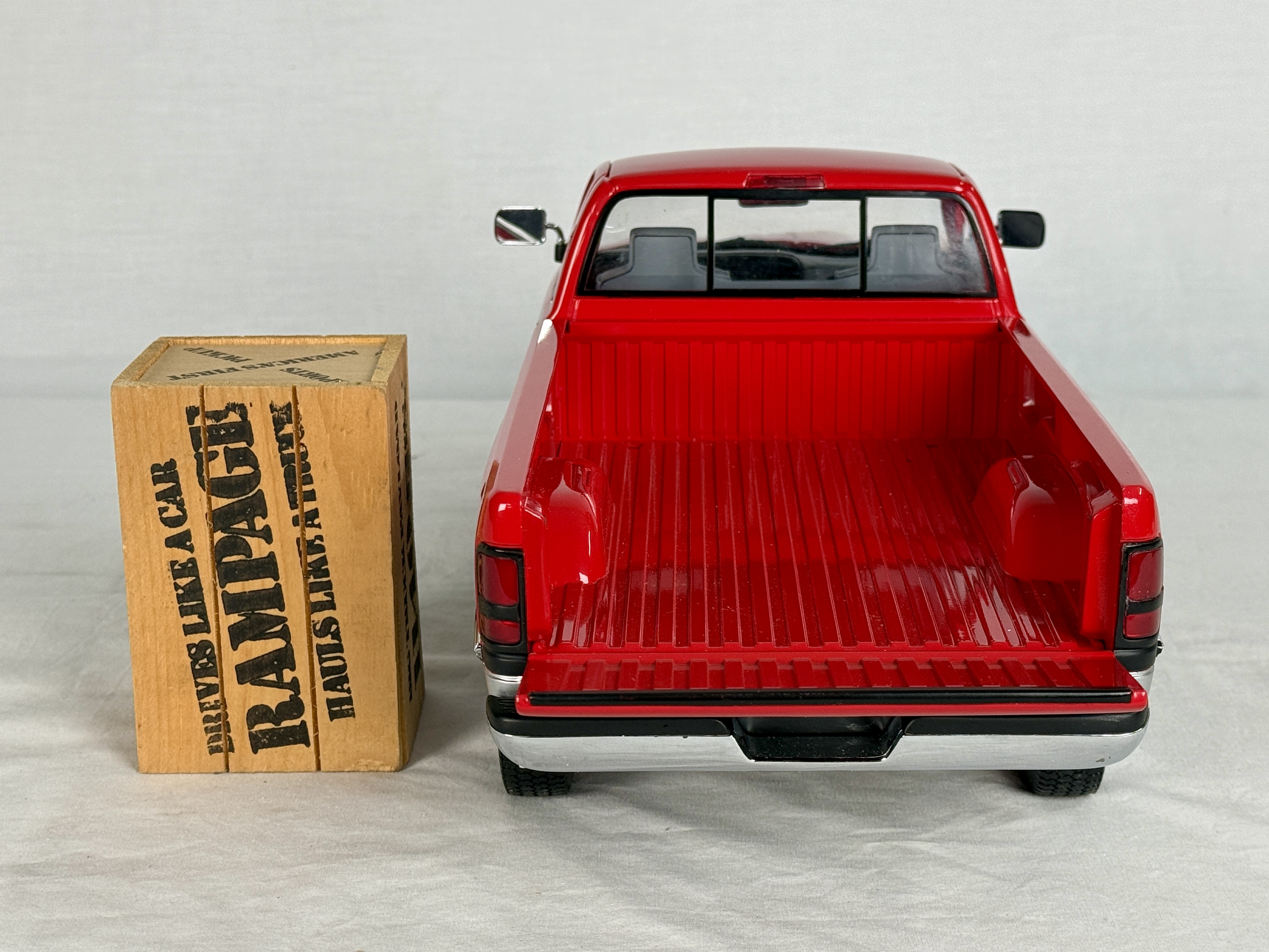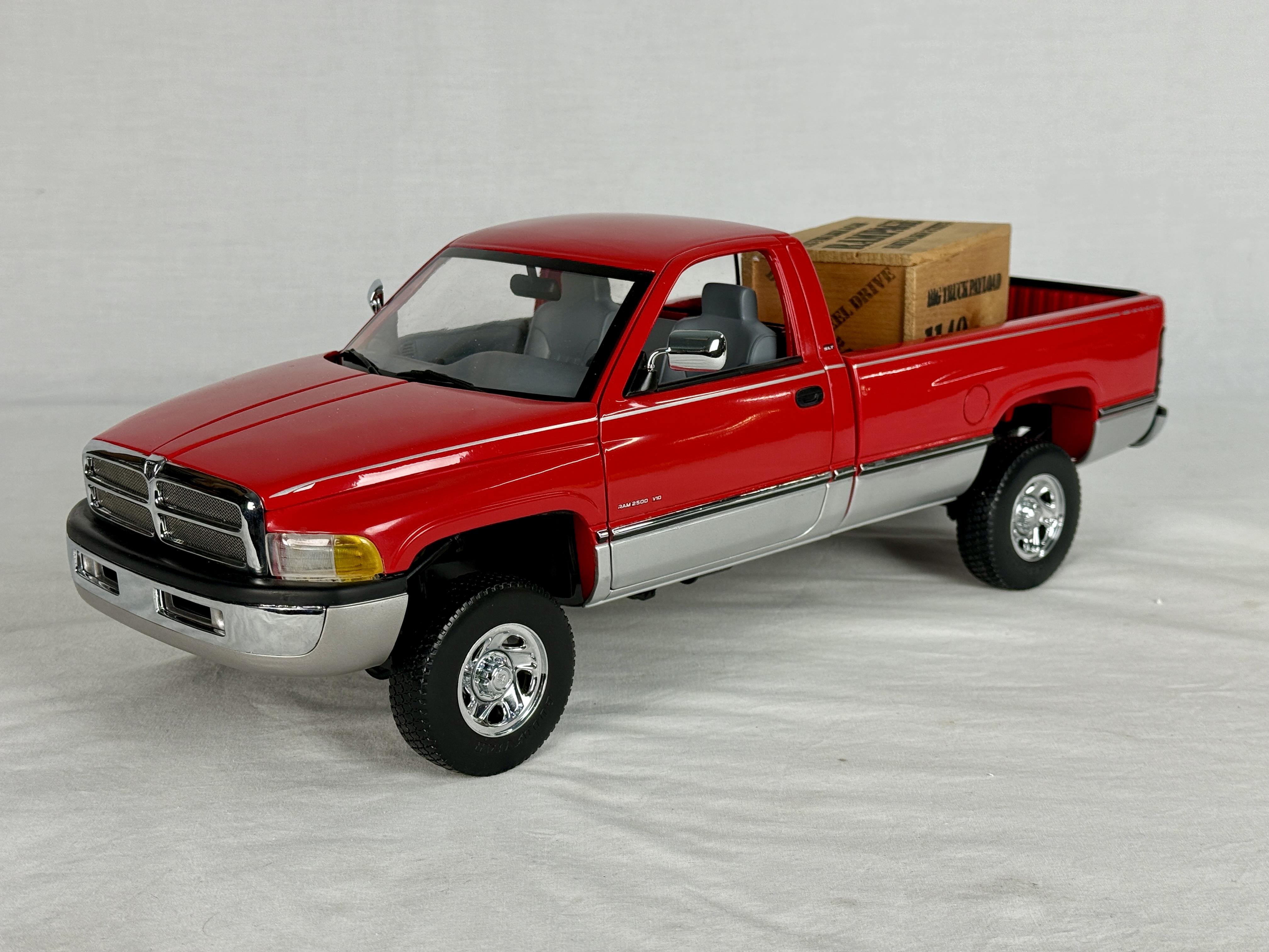 A red and silver Dodge Ram V-10 commemorative 18 inch model truck featuring a clear display case, wooden crate accessory, and original shipping box, C9.