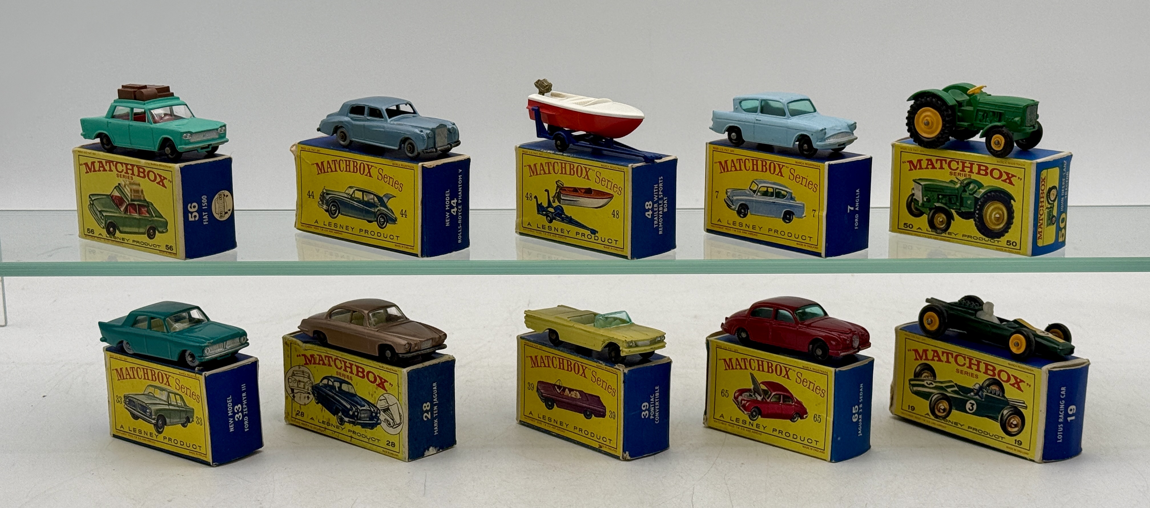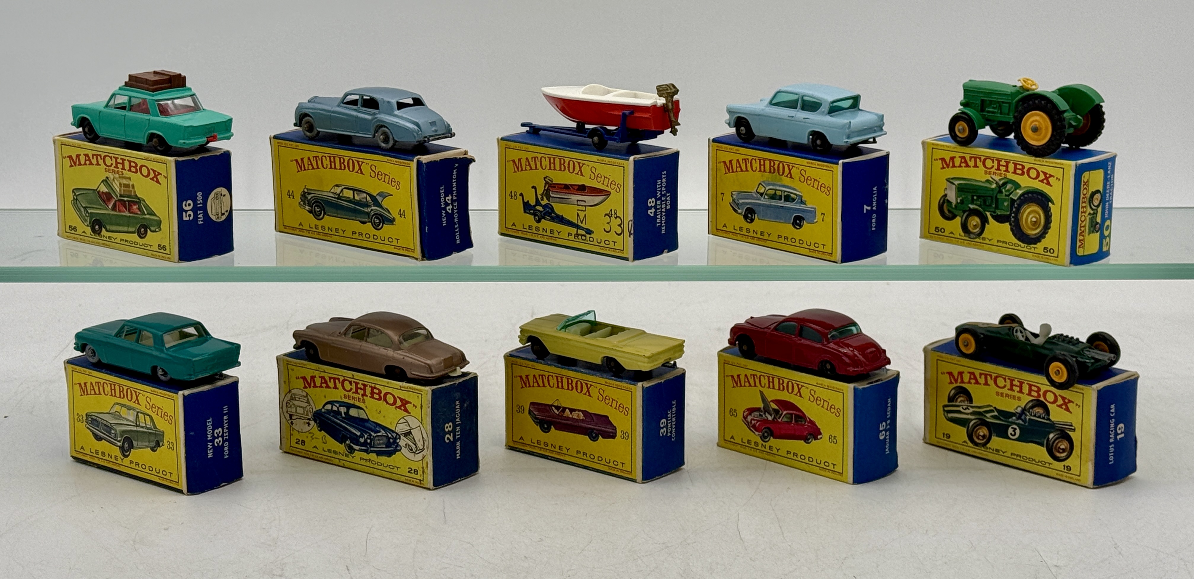 56B1 Fiat, 28C3 Jaguar, 19B4 Lotus missing side labels, 7B3 Ford, 65B4 Jaguar, 33B2 Ford, 4483 Rolls-Royce, 39B9 Pontiac, 48B3 Speedboat, 50B2 Tractor, original boxes, minor wear two are worn, C 7–9.