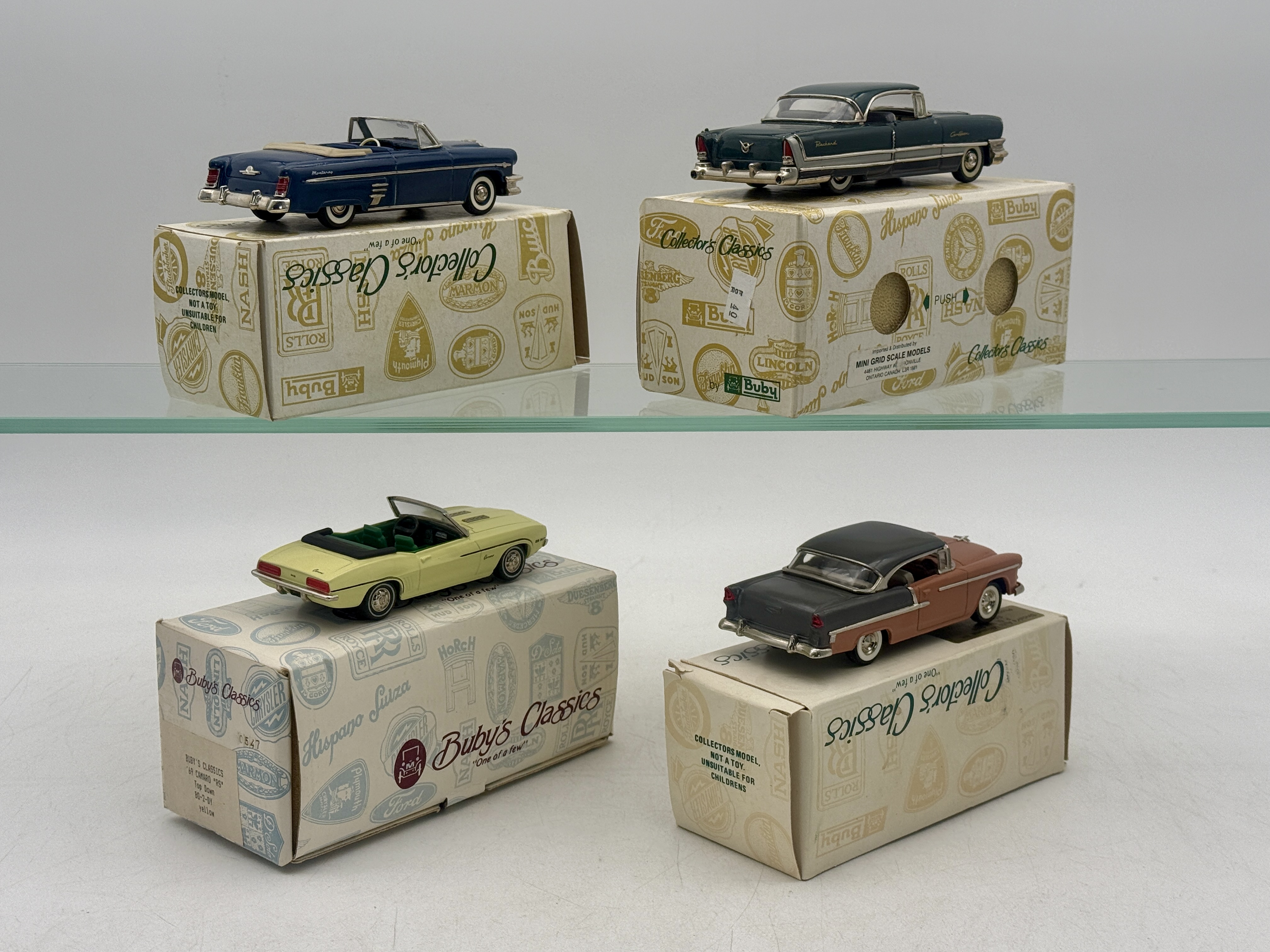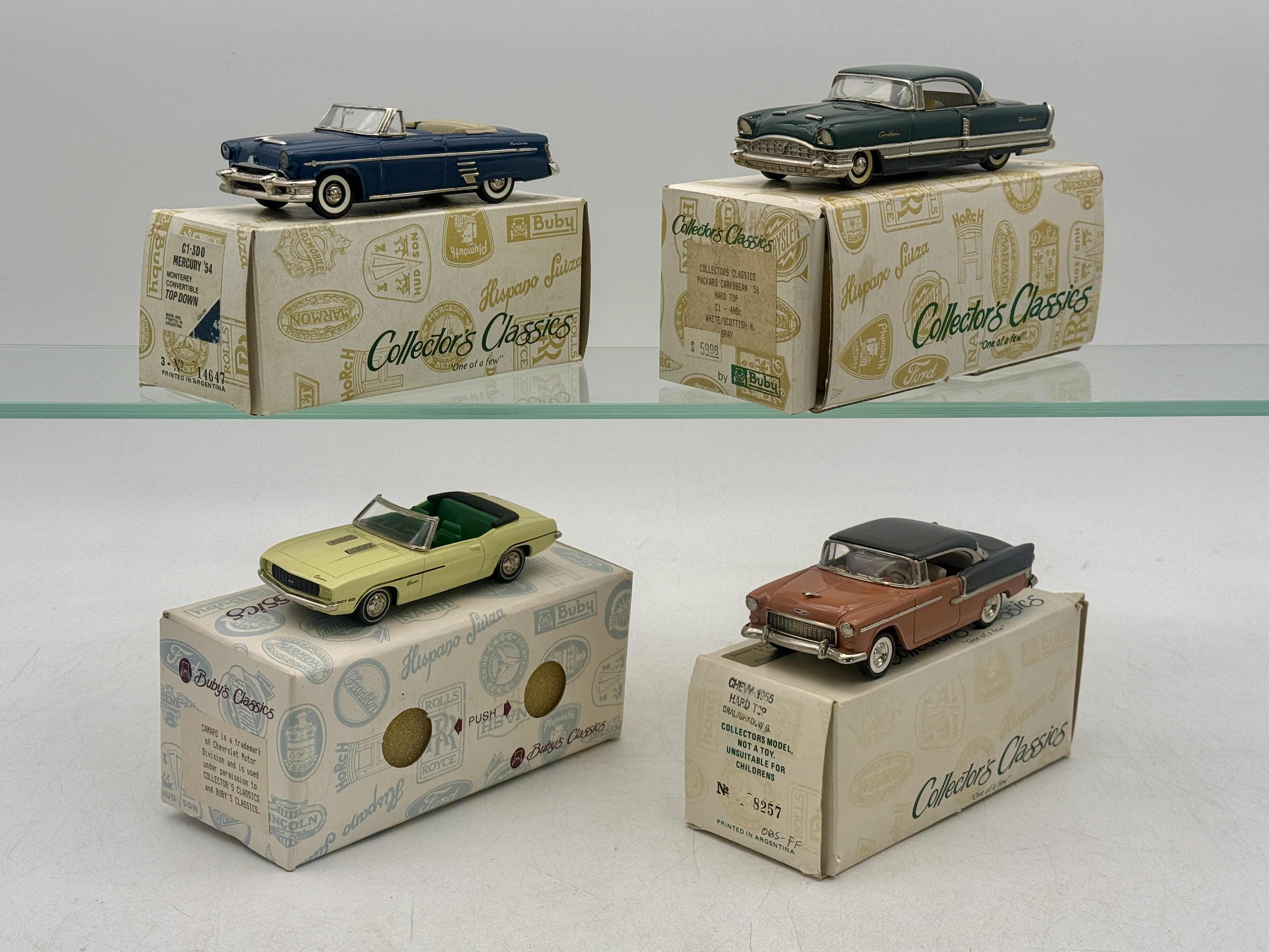 A collection of four die-cast model cars including a 1954 Mercury Monterey, 1956 Packard Caribbean, 1969 Camaro RS, and 1955 Chevy, each in original boxes, C9.