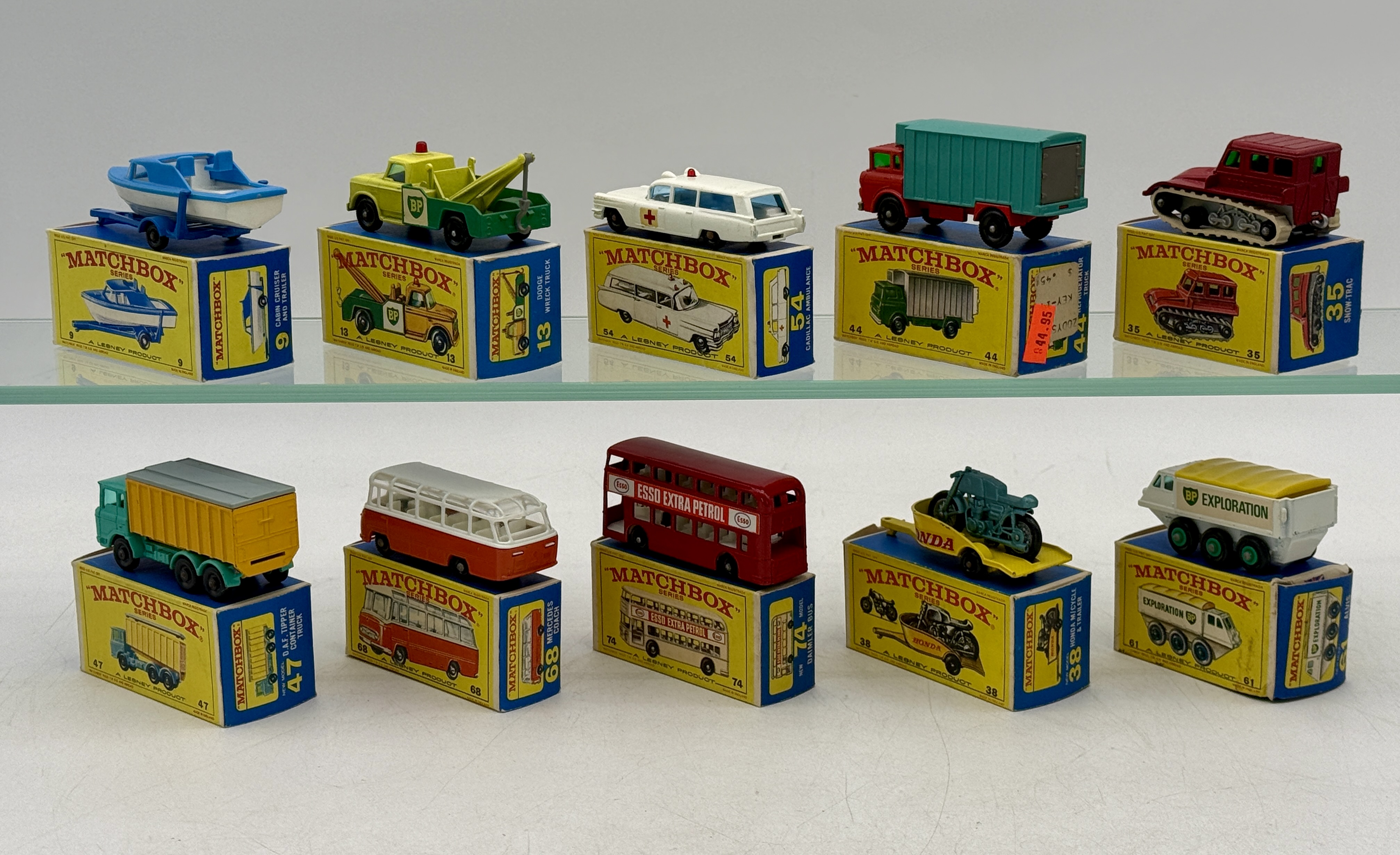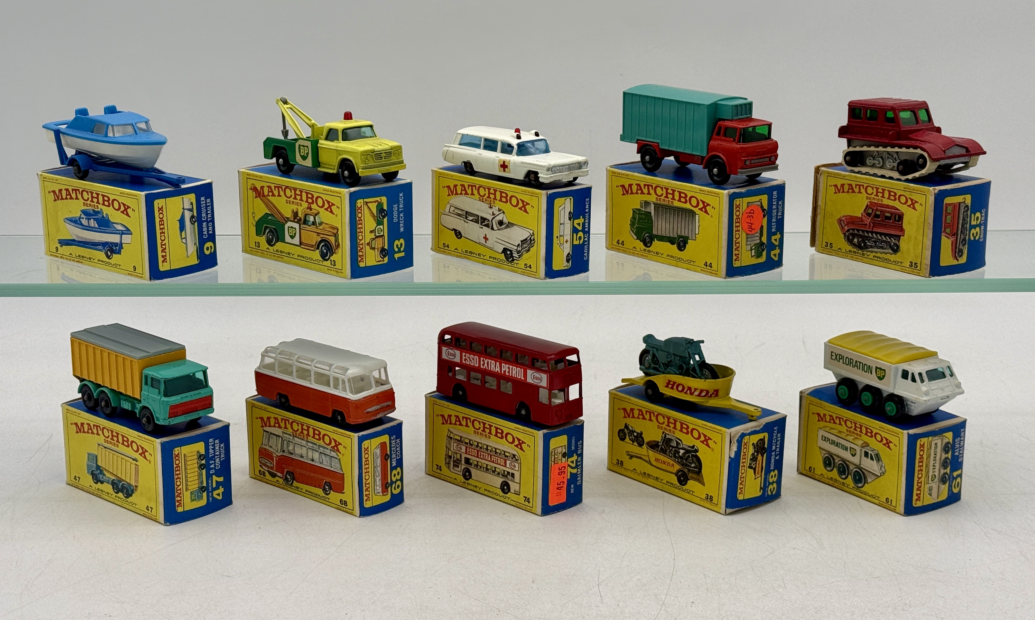 10. Matchbox vehicles, 74B4 bus, 68B2 Mercedes coach, 35B3 snow track, 44C1 refrigerator truck, 54B2 Cadillac, 13D2 wrecker, 9D2 boat, 61B2 Alvis Stewart, 38C3 motorcycle, 47C1 DAF tipper, OB’s mw C8–9.