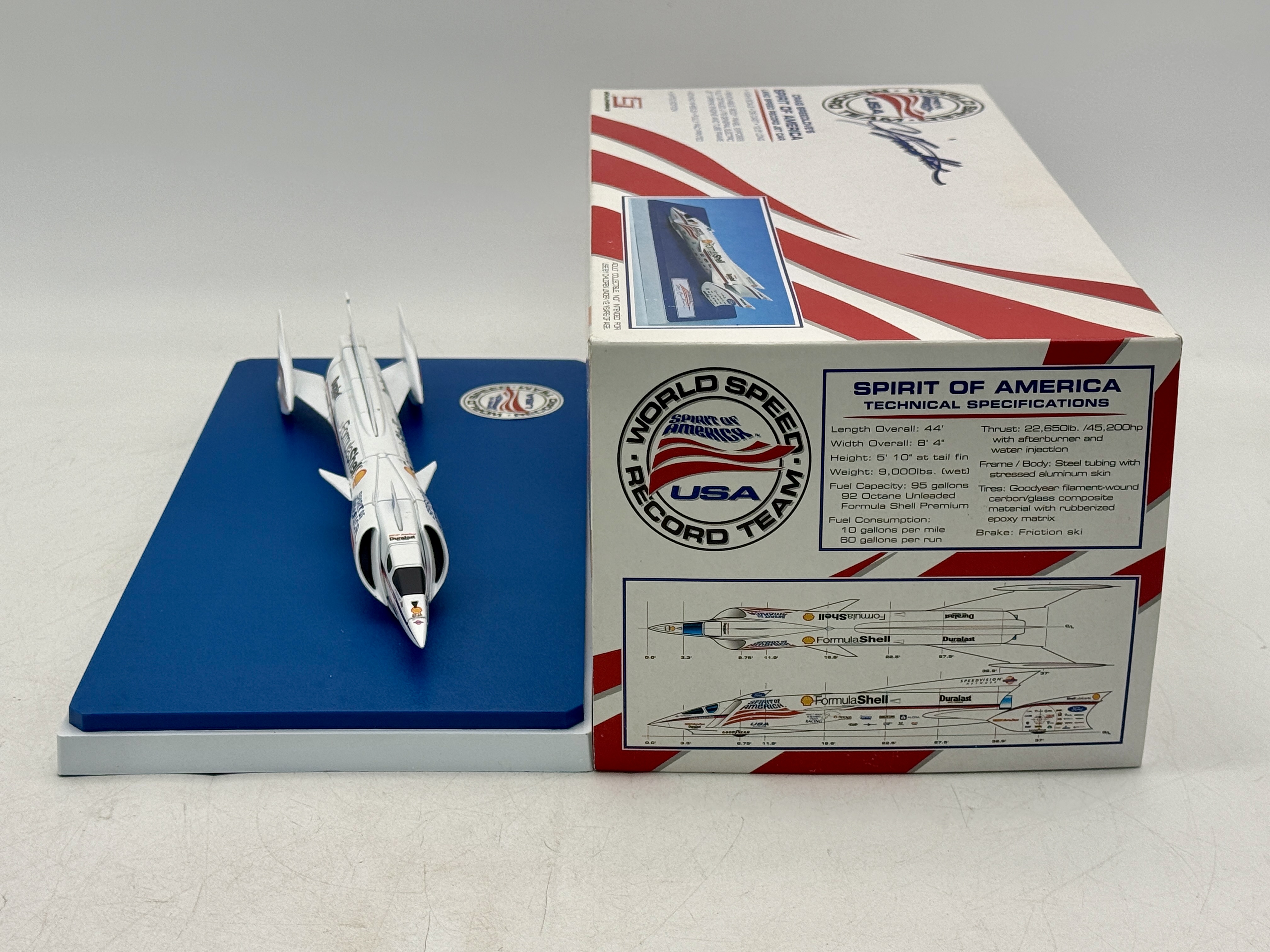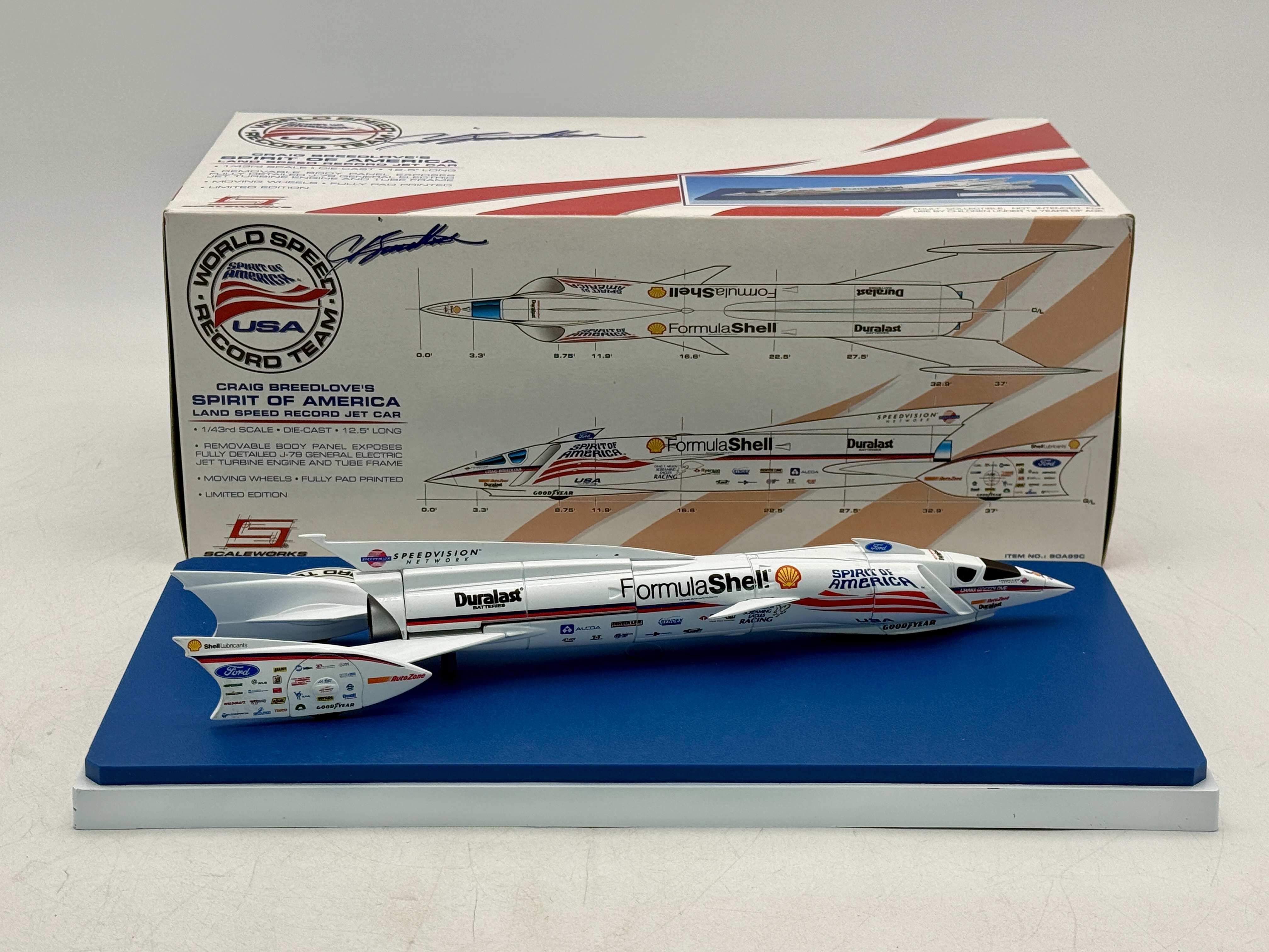A 1/43rd scale die-cast model of the white Spirit of America jet car featuring FormulaShell and Duralast logos, measuring 12.5 inches long, and including its original box. OB, C9.