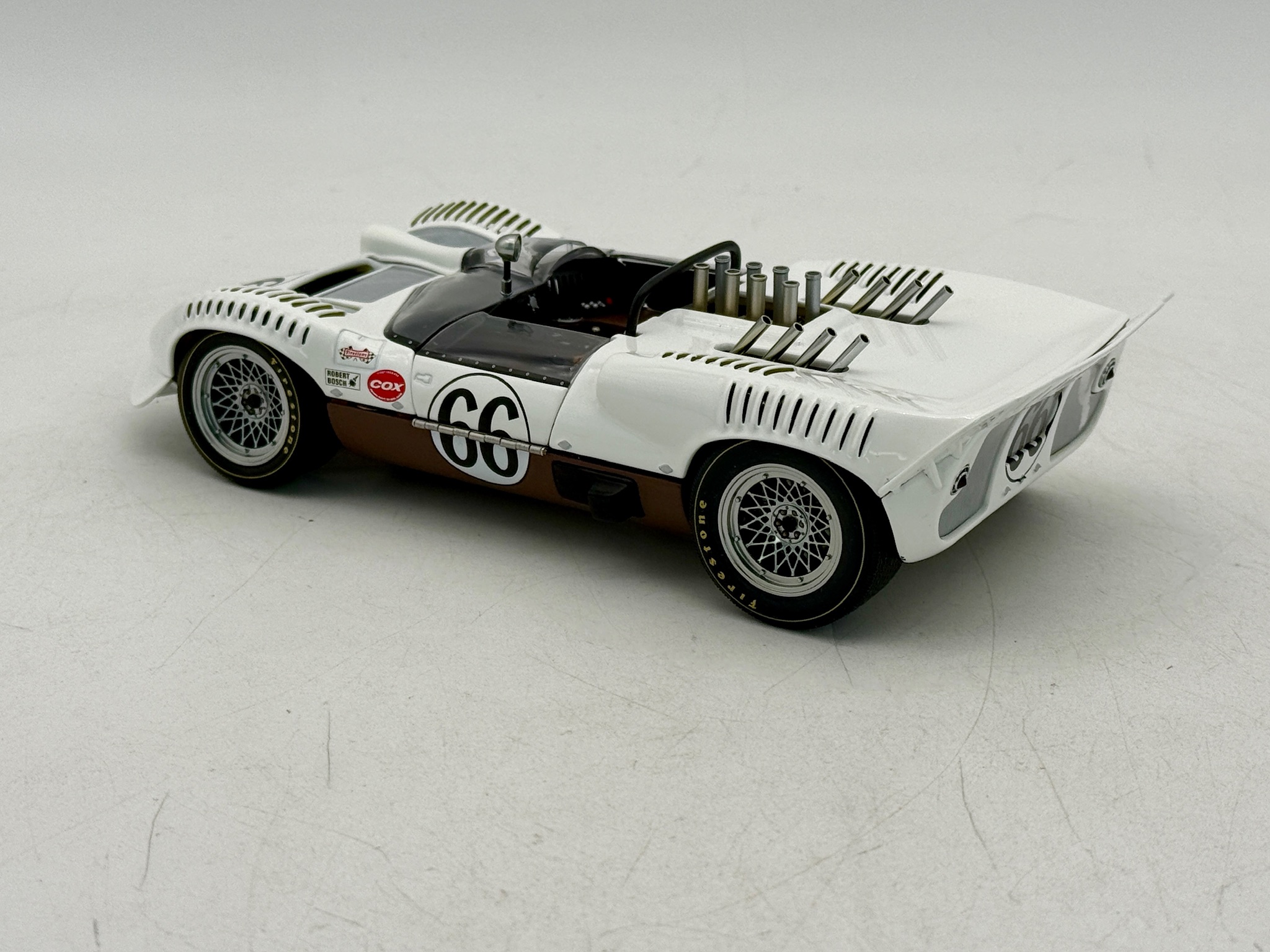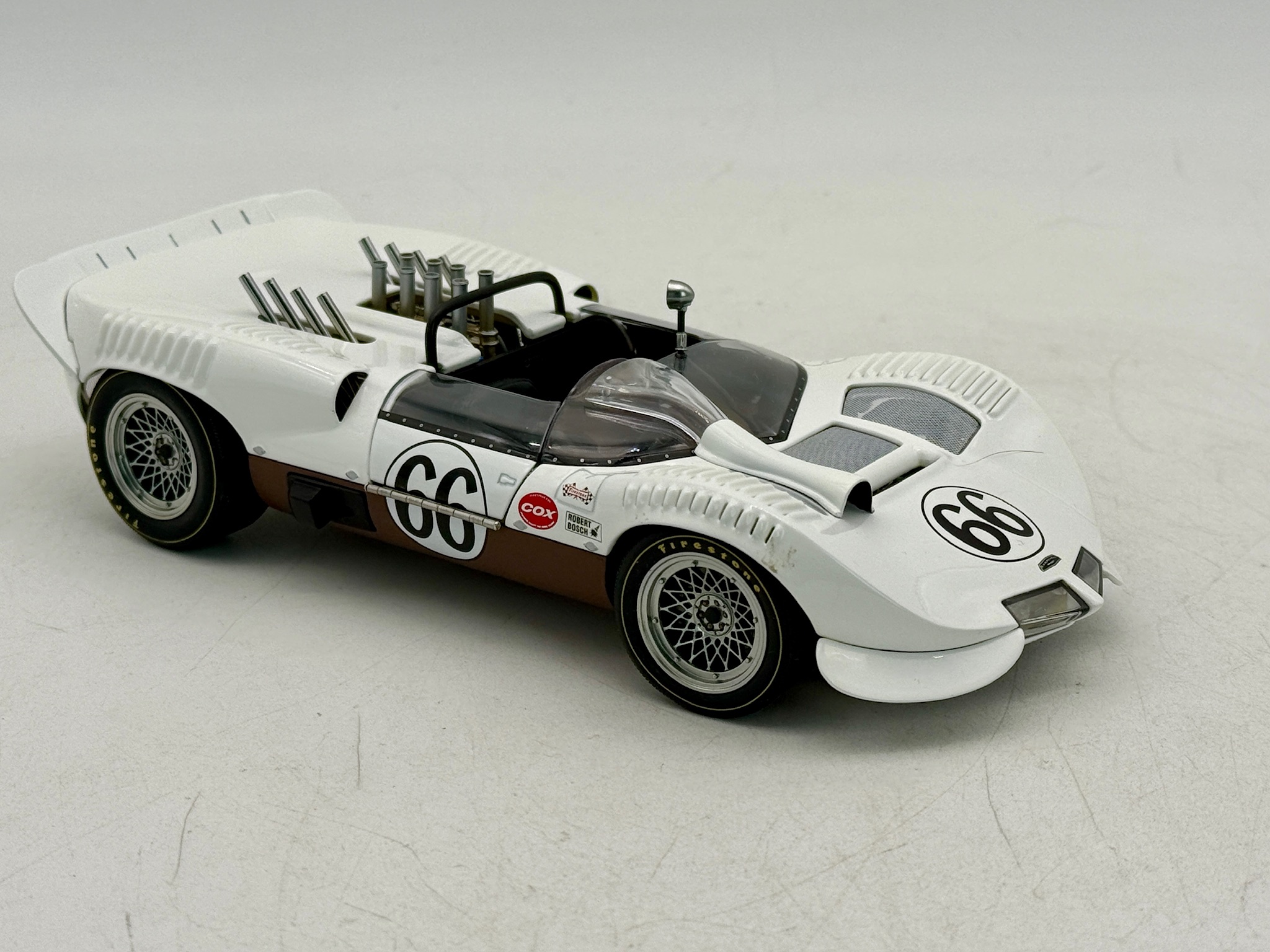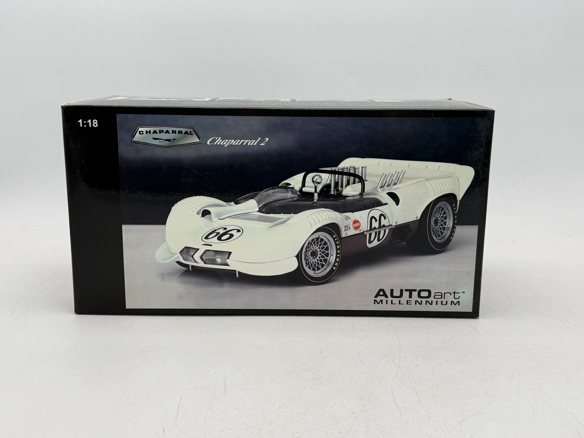 A 1:18 scale diecast model of the Chaparral 2 racing car in white and brown with number 66 and Firestone decals, including its original packaging. 9 inches long, OB and insert, C9.
