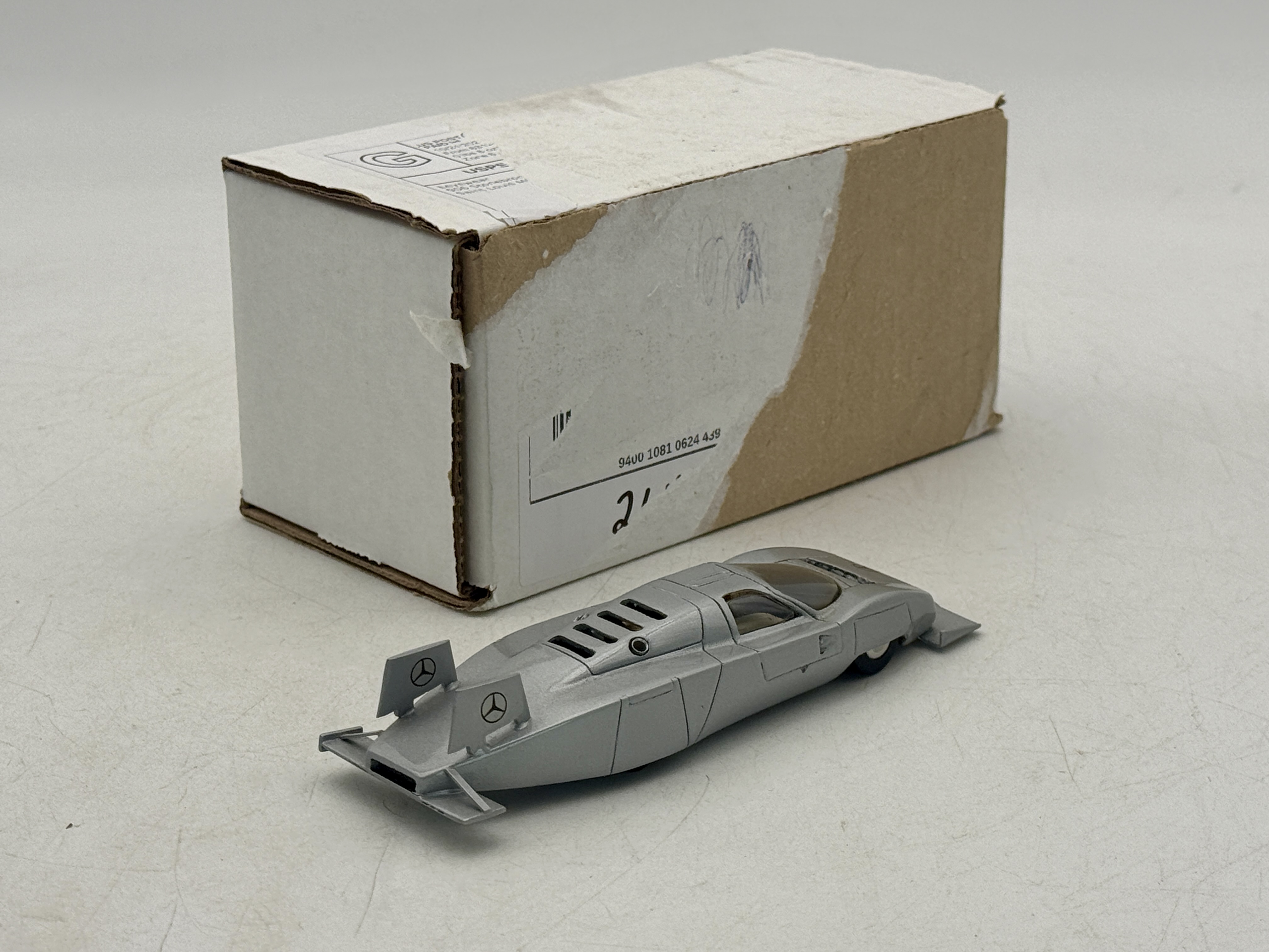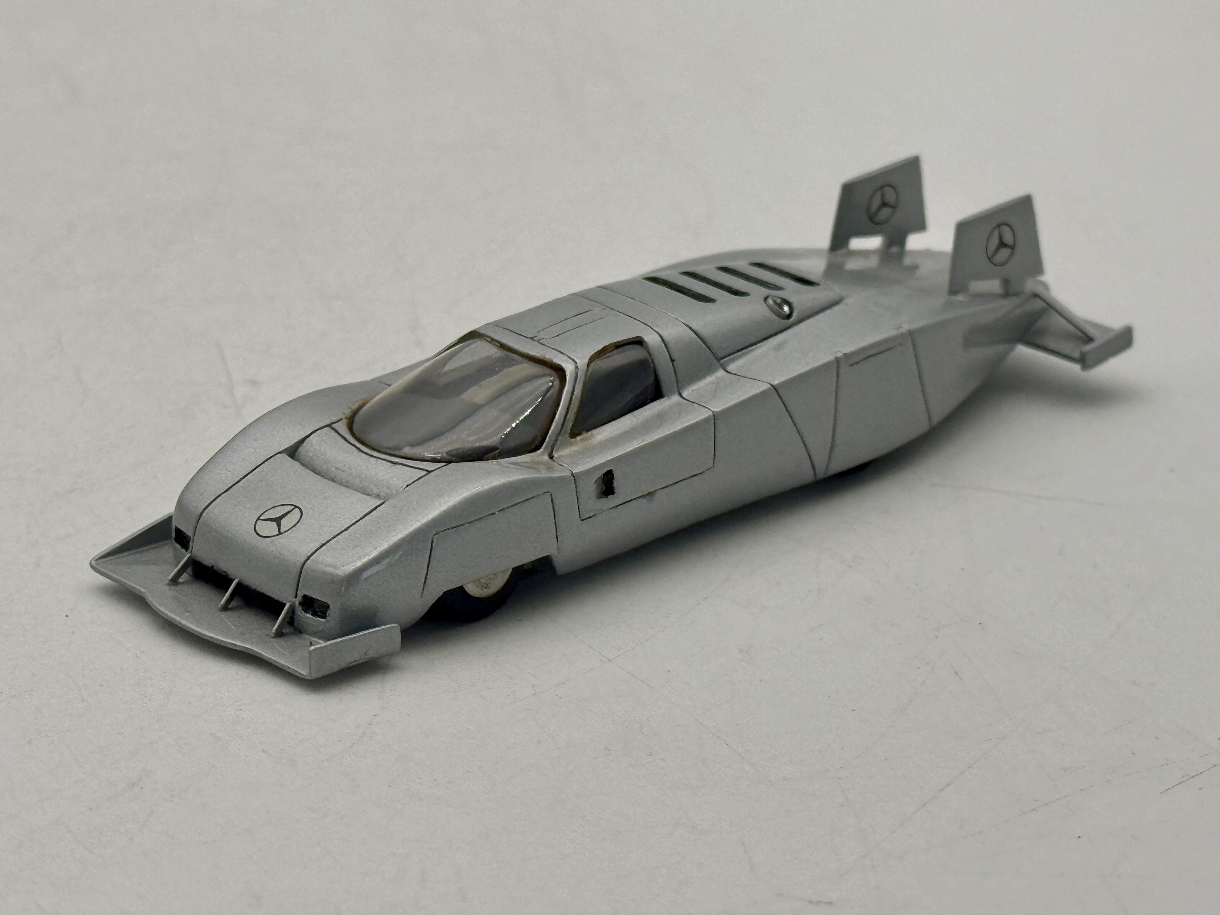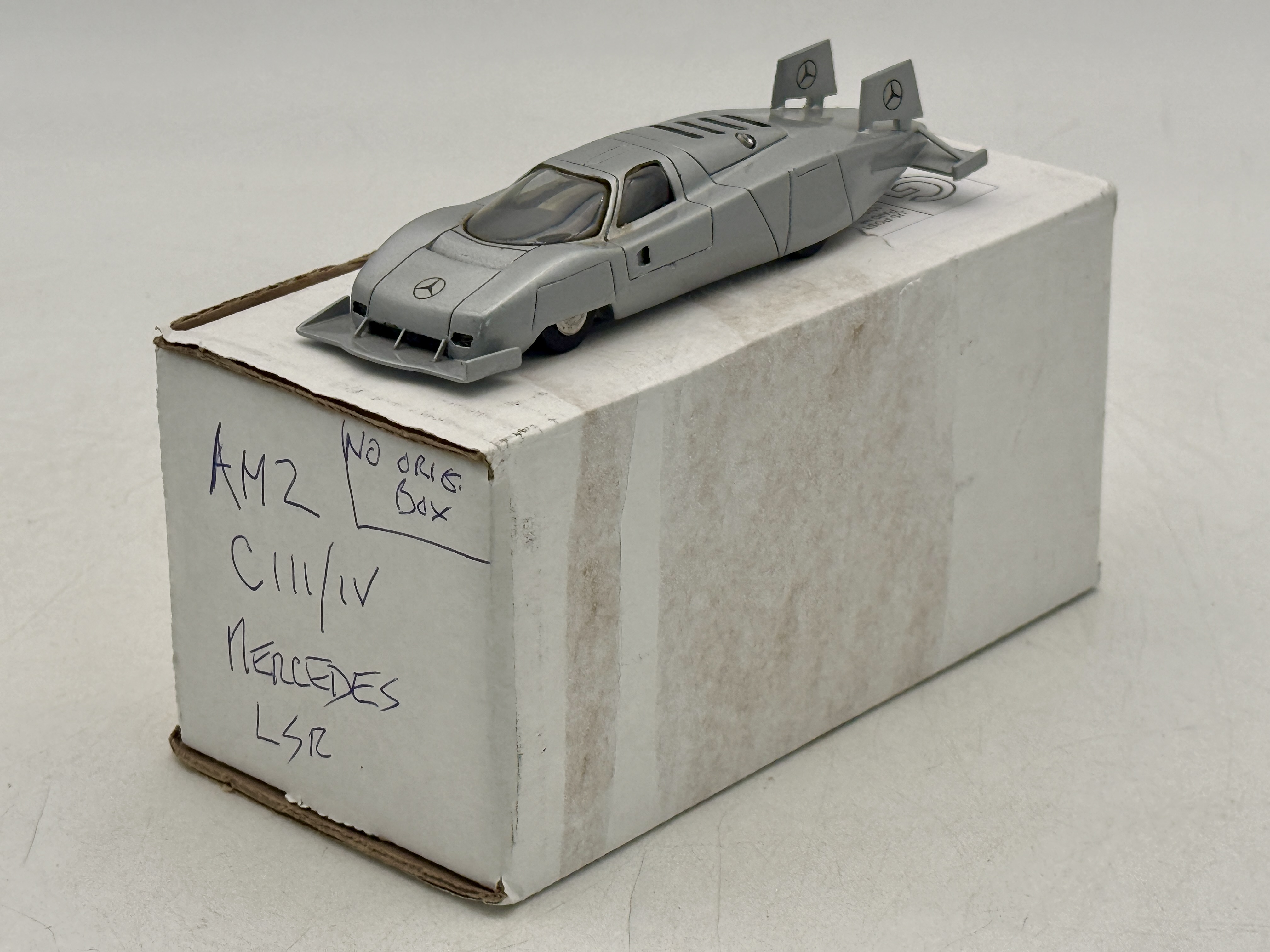 A silver rersin Mercedes-Benz C111-IV Land Speed Record model car featuring Mercedes logos and accompanied by a handwritten storage box. resin, 5.25″ long, OB, C9.
