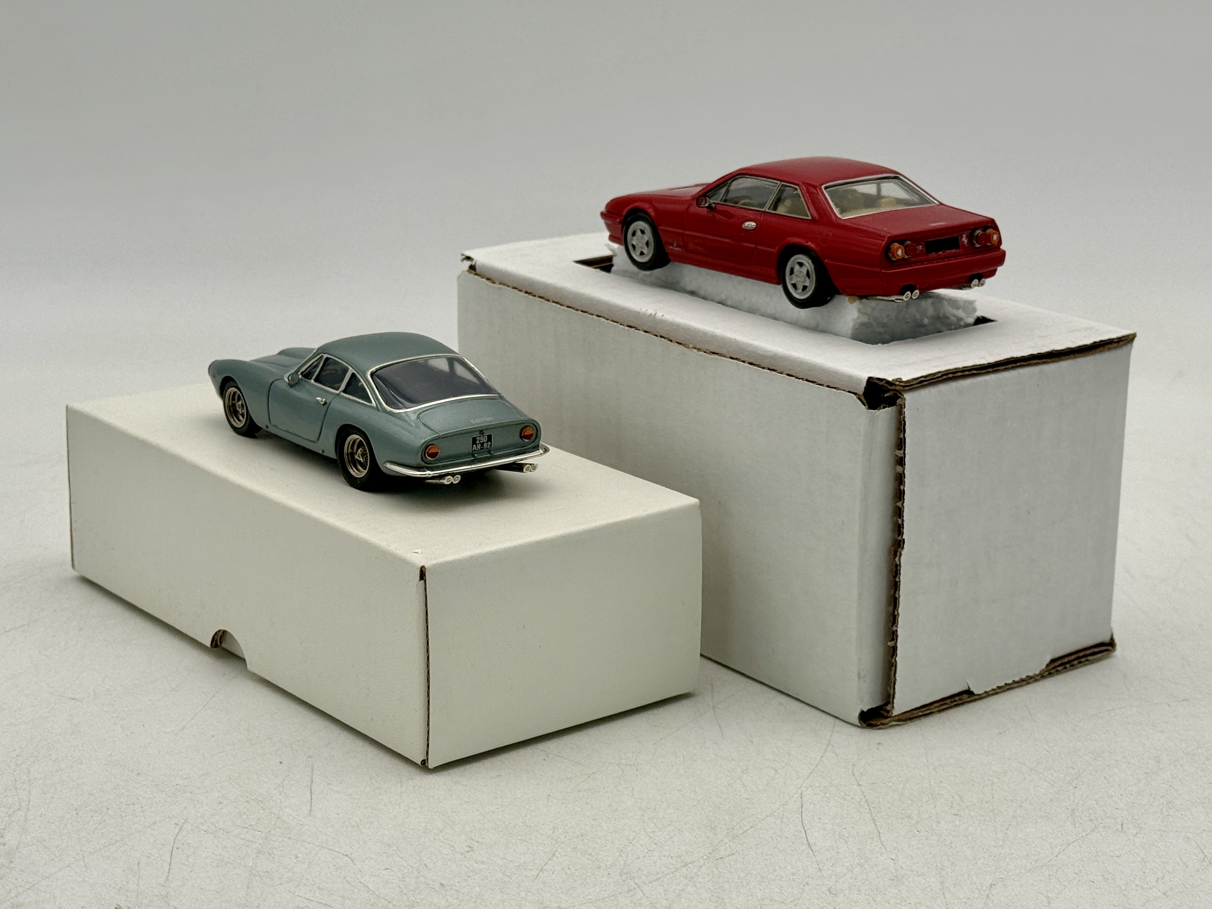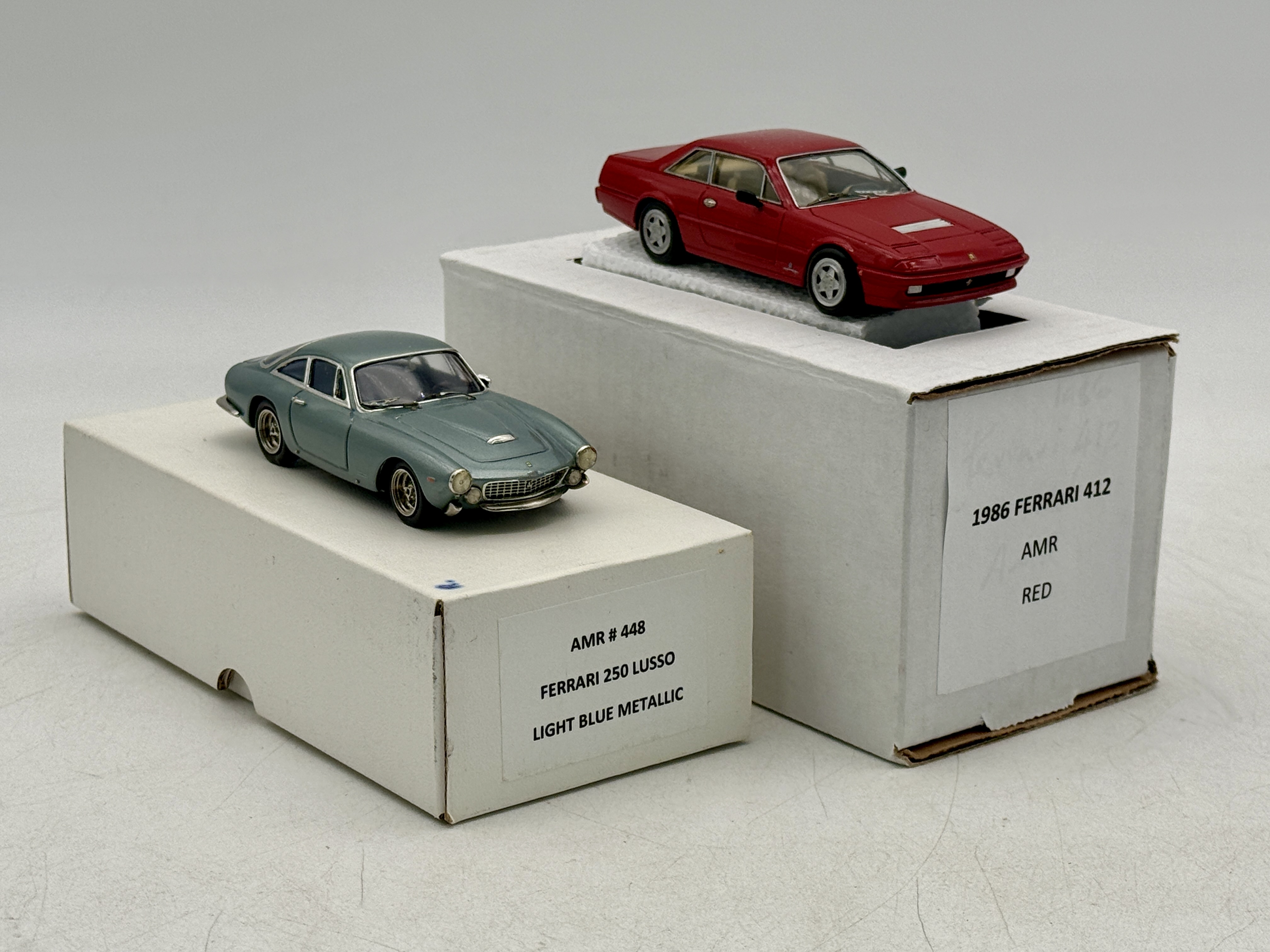 Two AMR model cars including a light blue metallic #448 Ferrari 250 Lusso and a red #250 1986 Ferrari 412 with their respective labeled boxes. resin, 1:43 scale, OB’s C9.