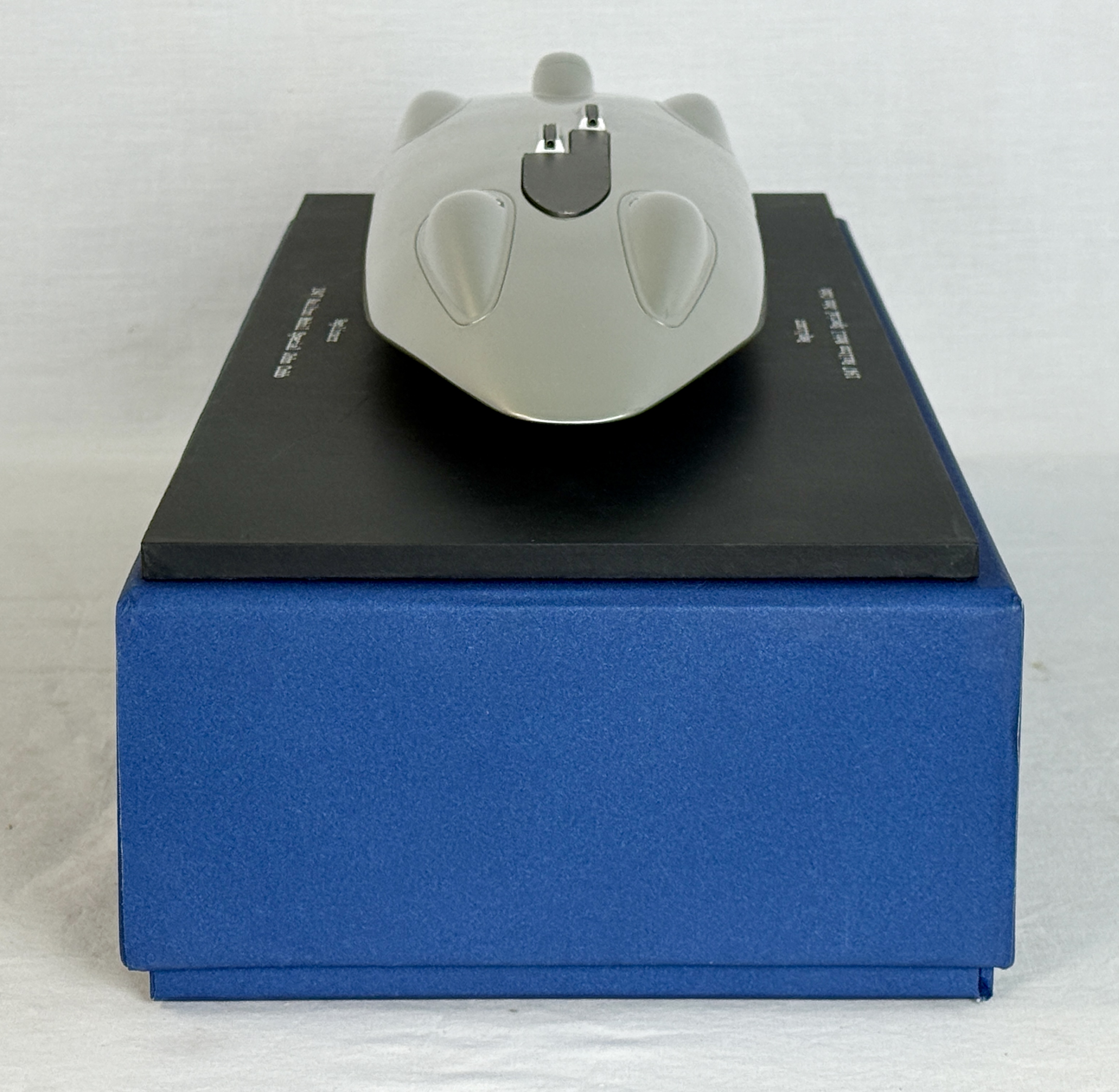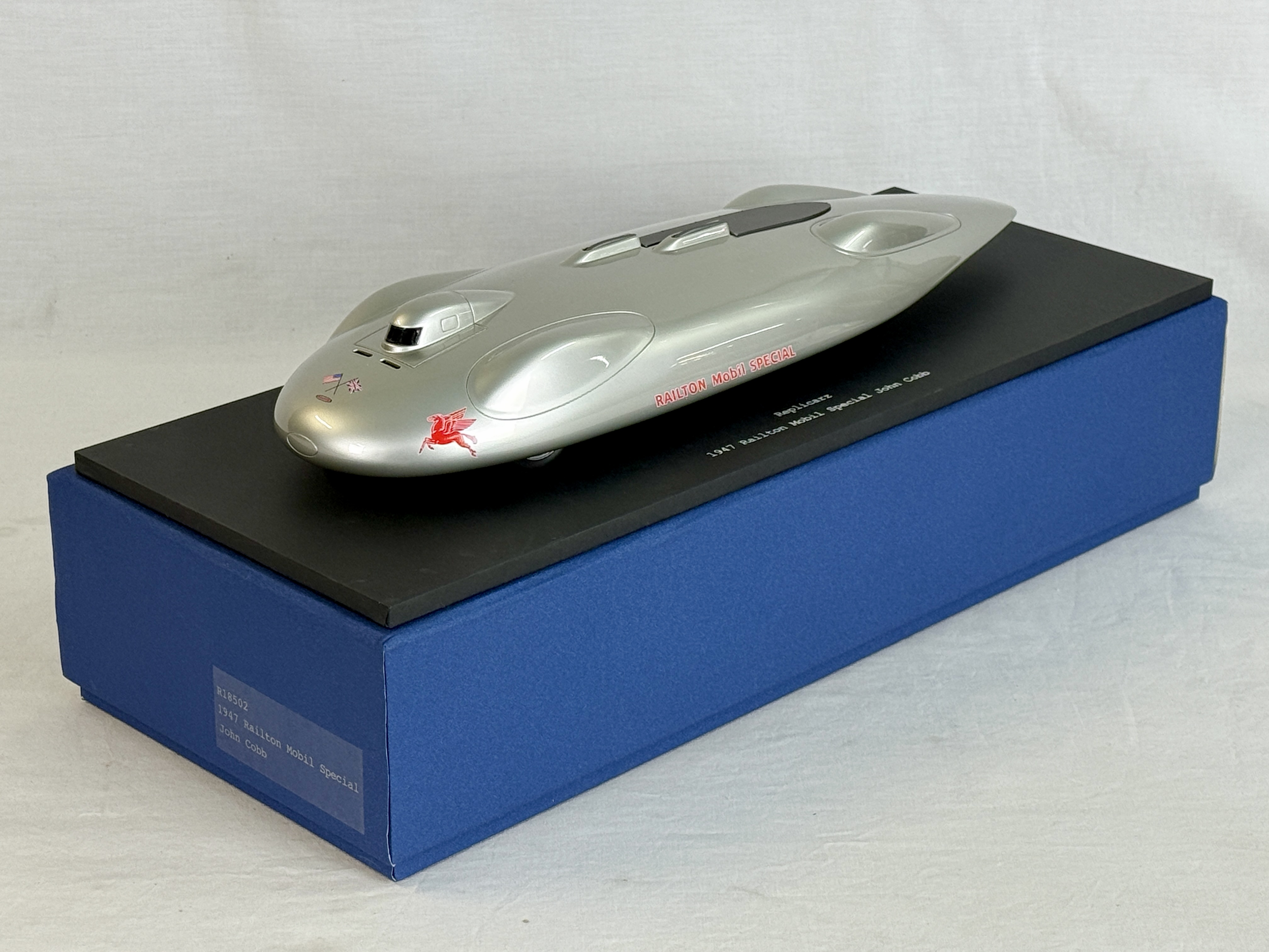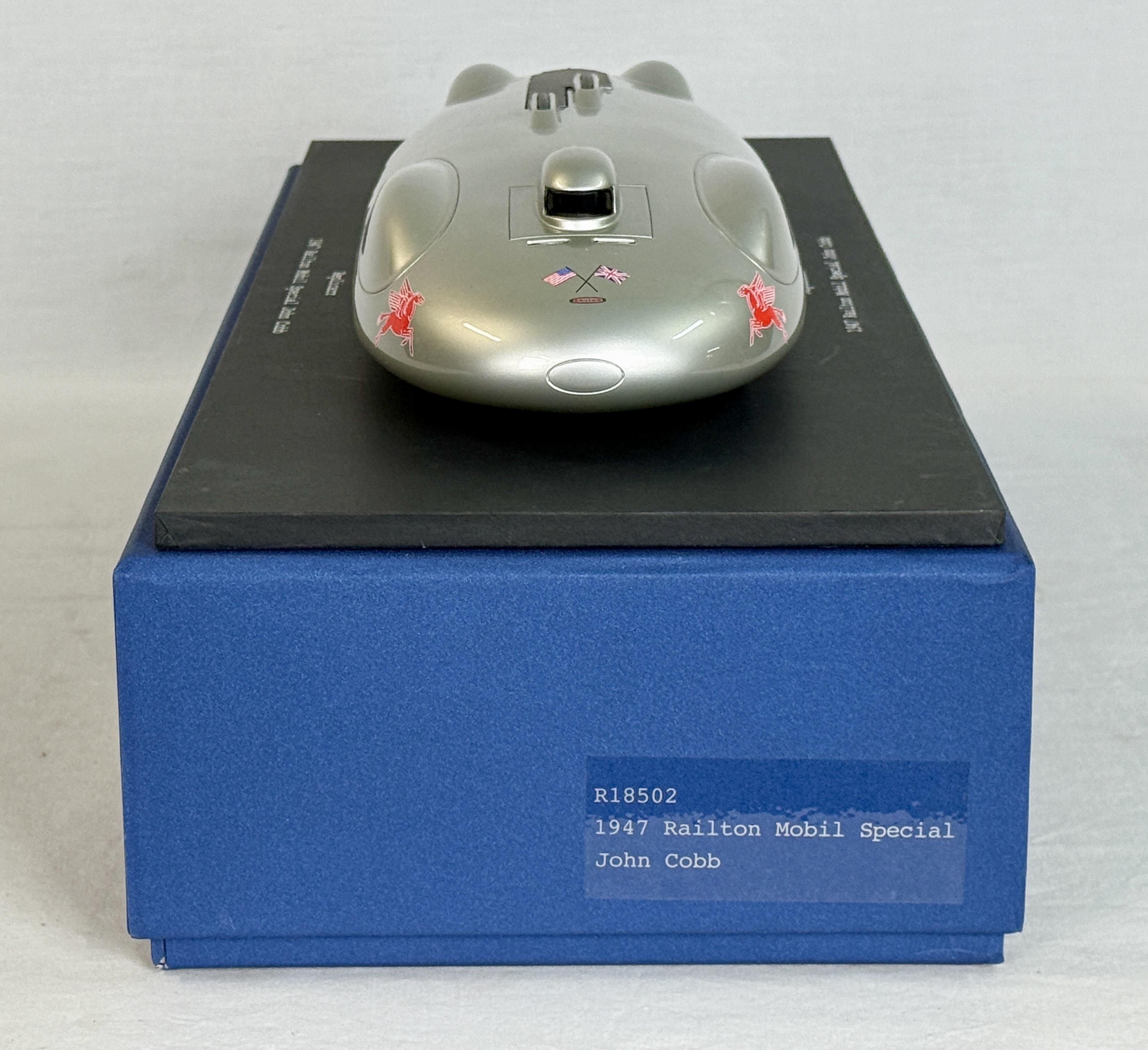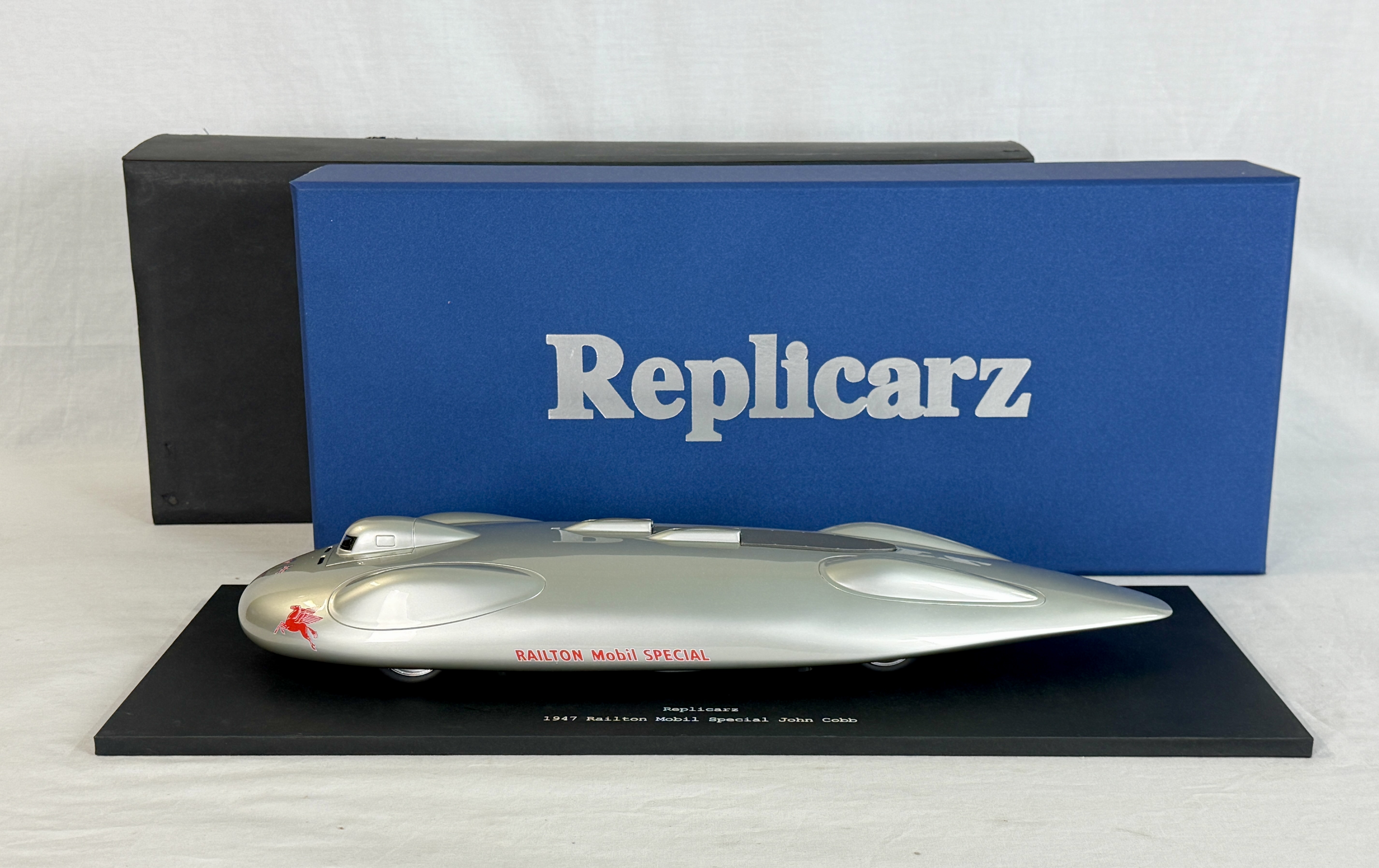A 1:18 scale silver Replicarz model of the 1947 Railton Mobil Special land speed record car driven by John Cobb, featuring a black display base and original blue box. Resin 19″ long on wood plinth, OB mw C9.