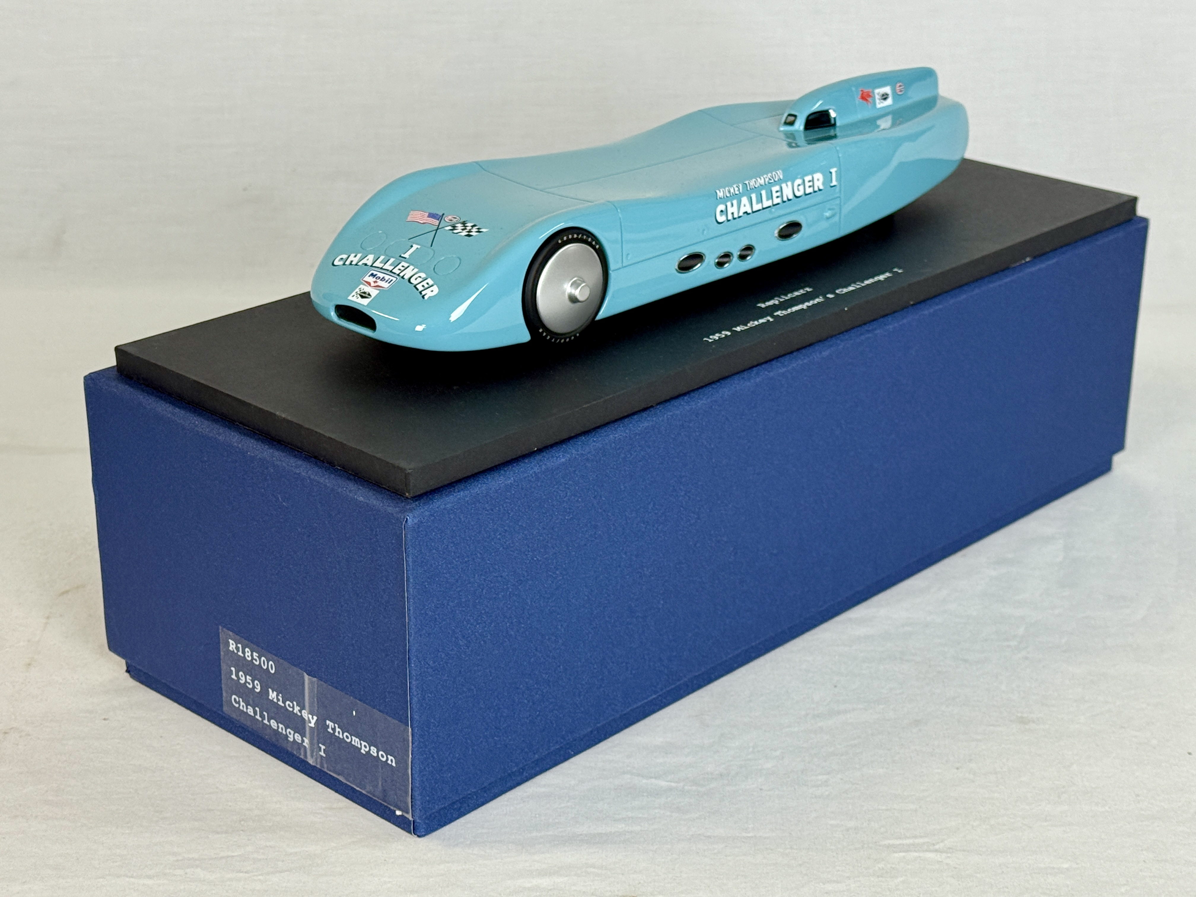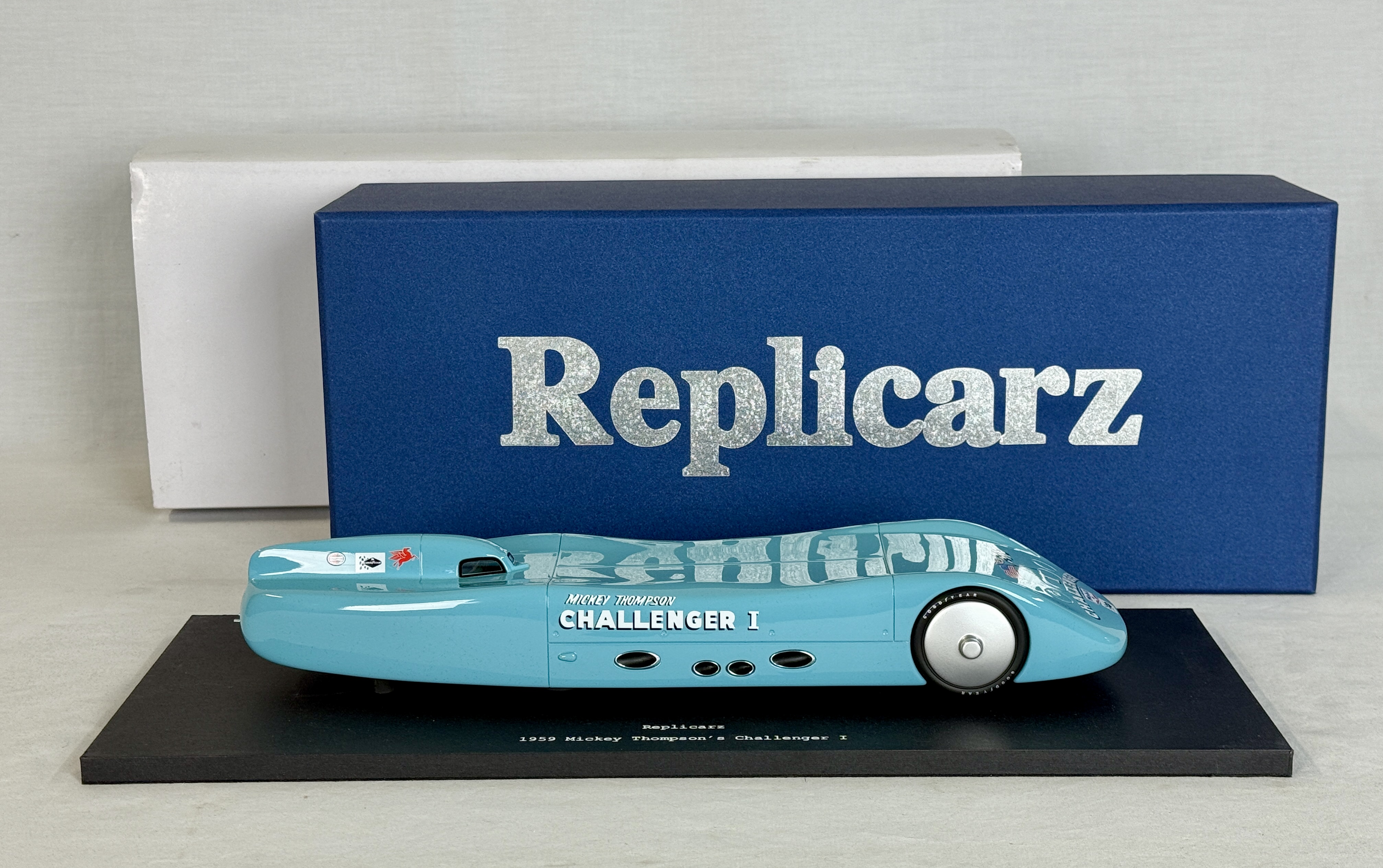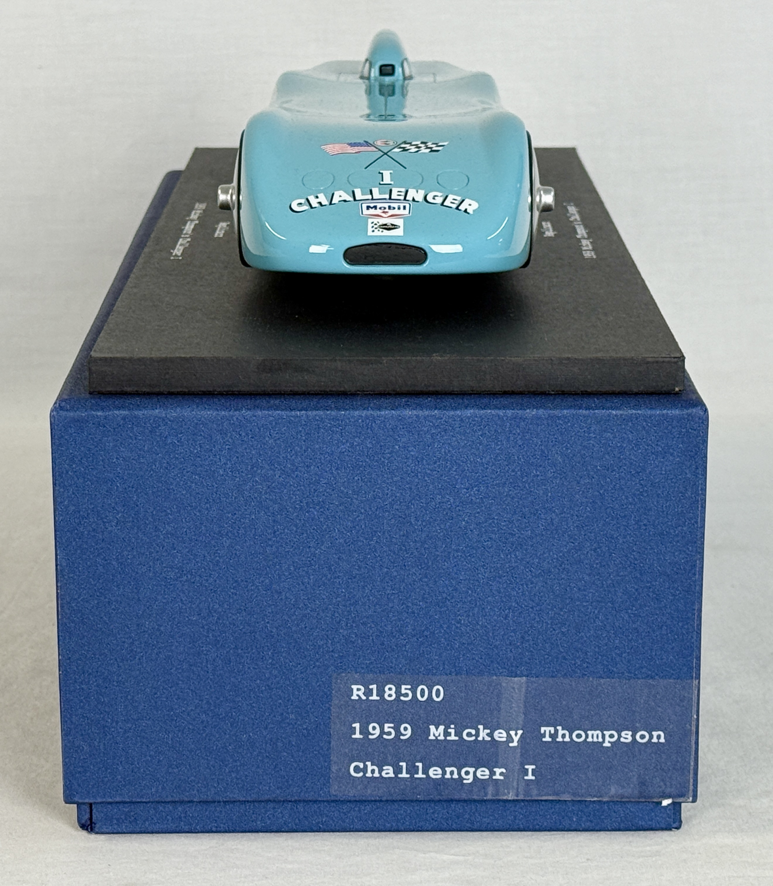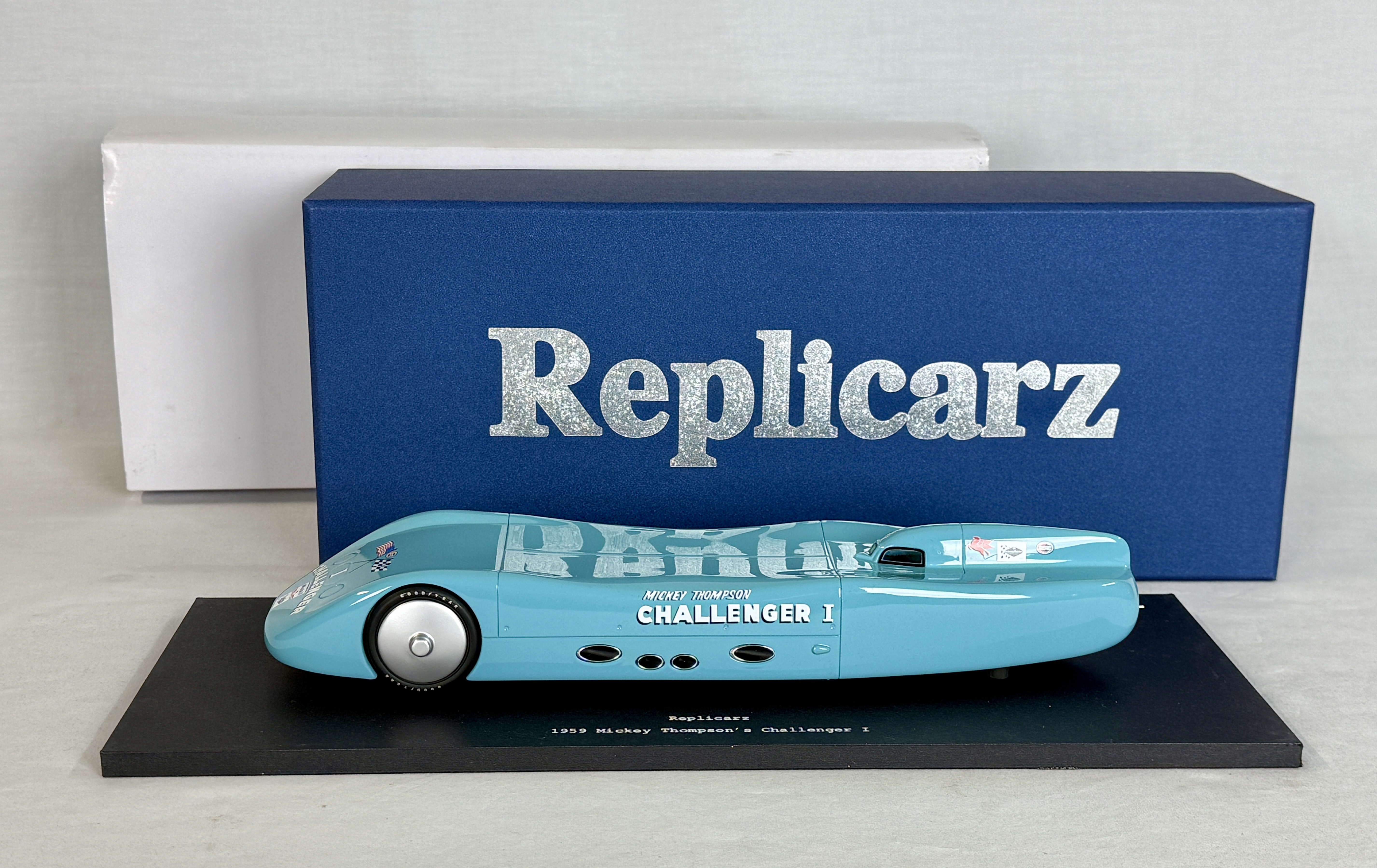 A light blue Replicarz scale model of Mickey Thompson’s 1959 Challenger I land speed record car featuring Mobil logos and original packaging. Resin, 1:18 scale, OB C9.