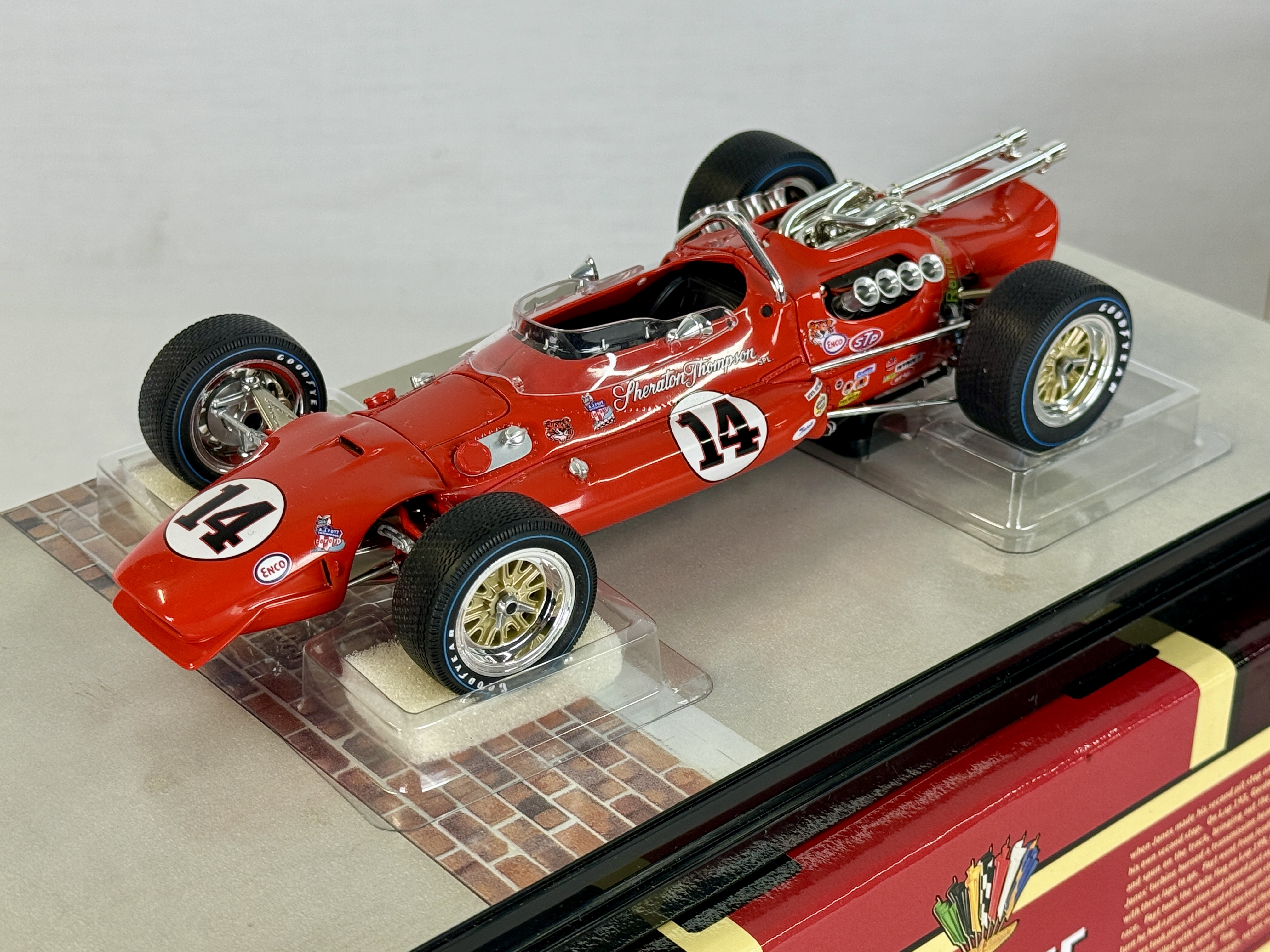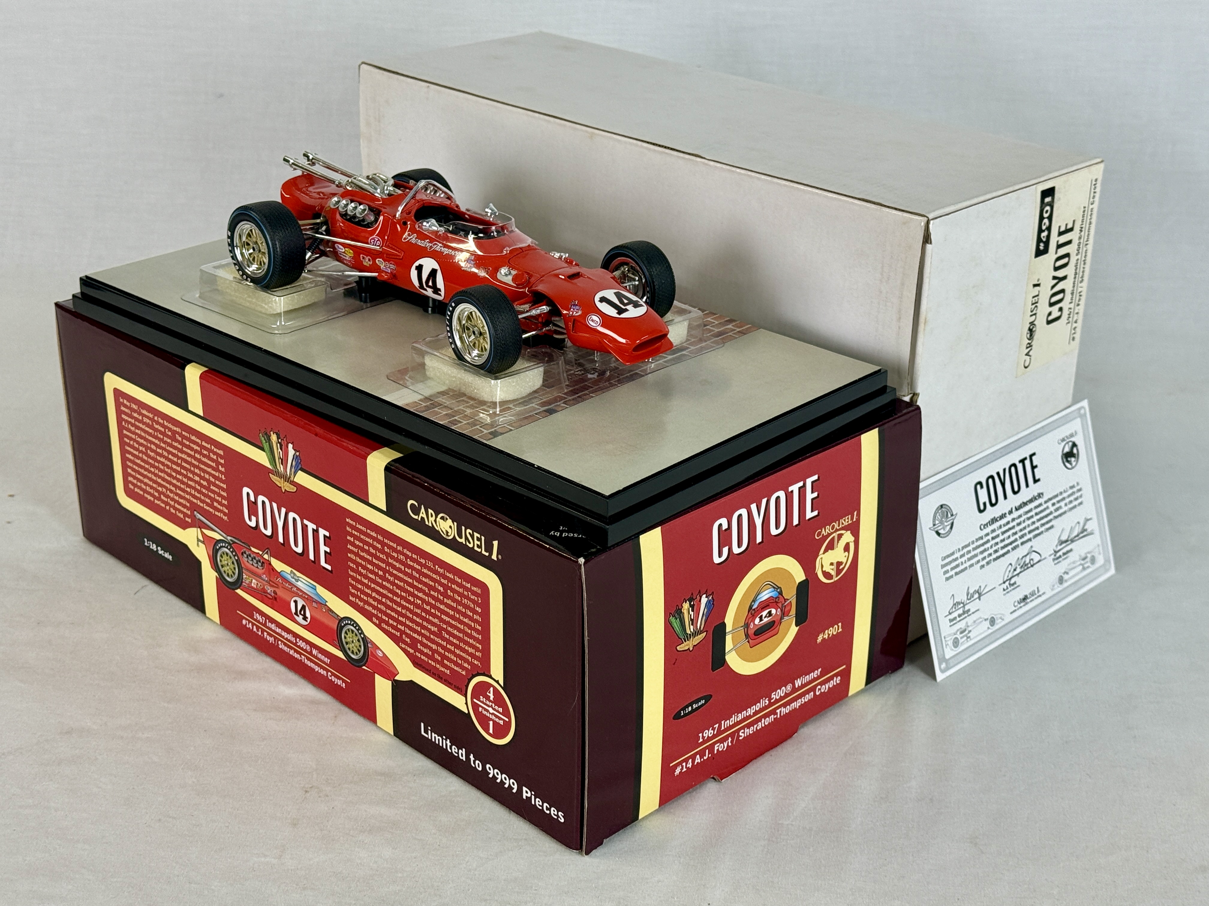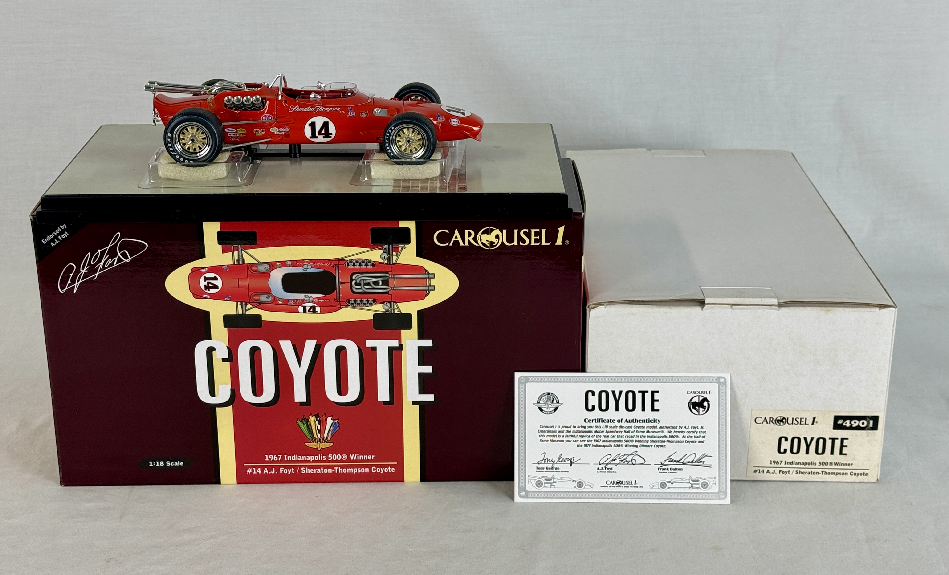 A red Carousel 1 1:18 scale die-cast model of the #14 A.J. Foyt Sheraton-Thompson Coyote 1967 Indianapolis 500 winner with original box and certificate of authenticity. 9″ long OB and insert, shipping box and certificate C9.