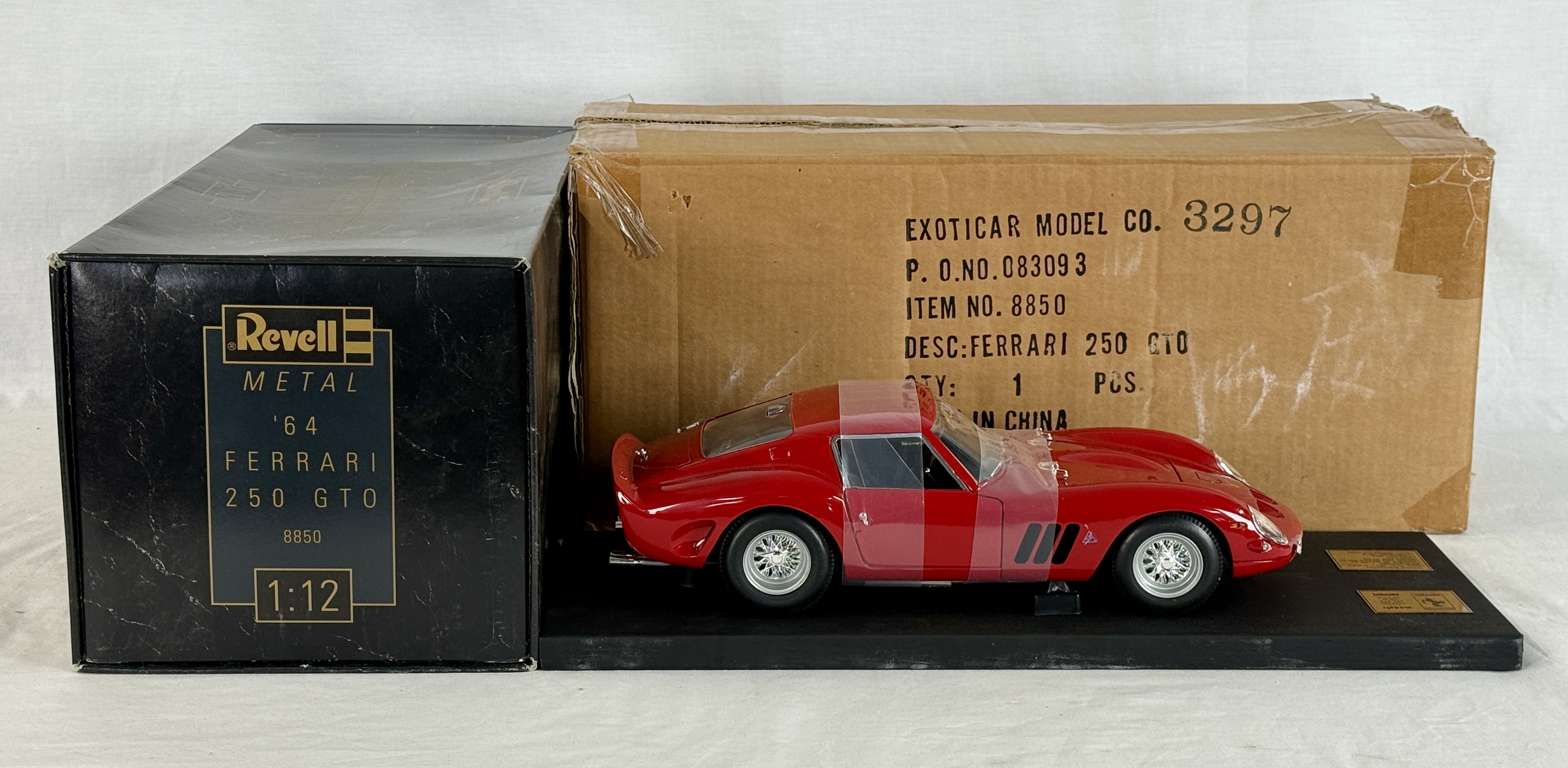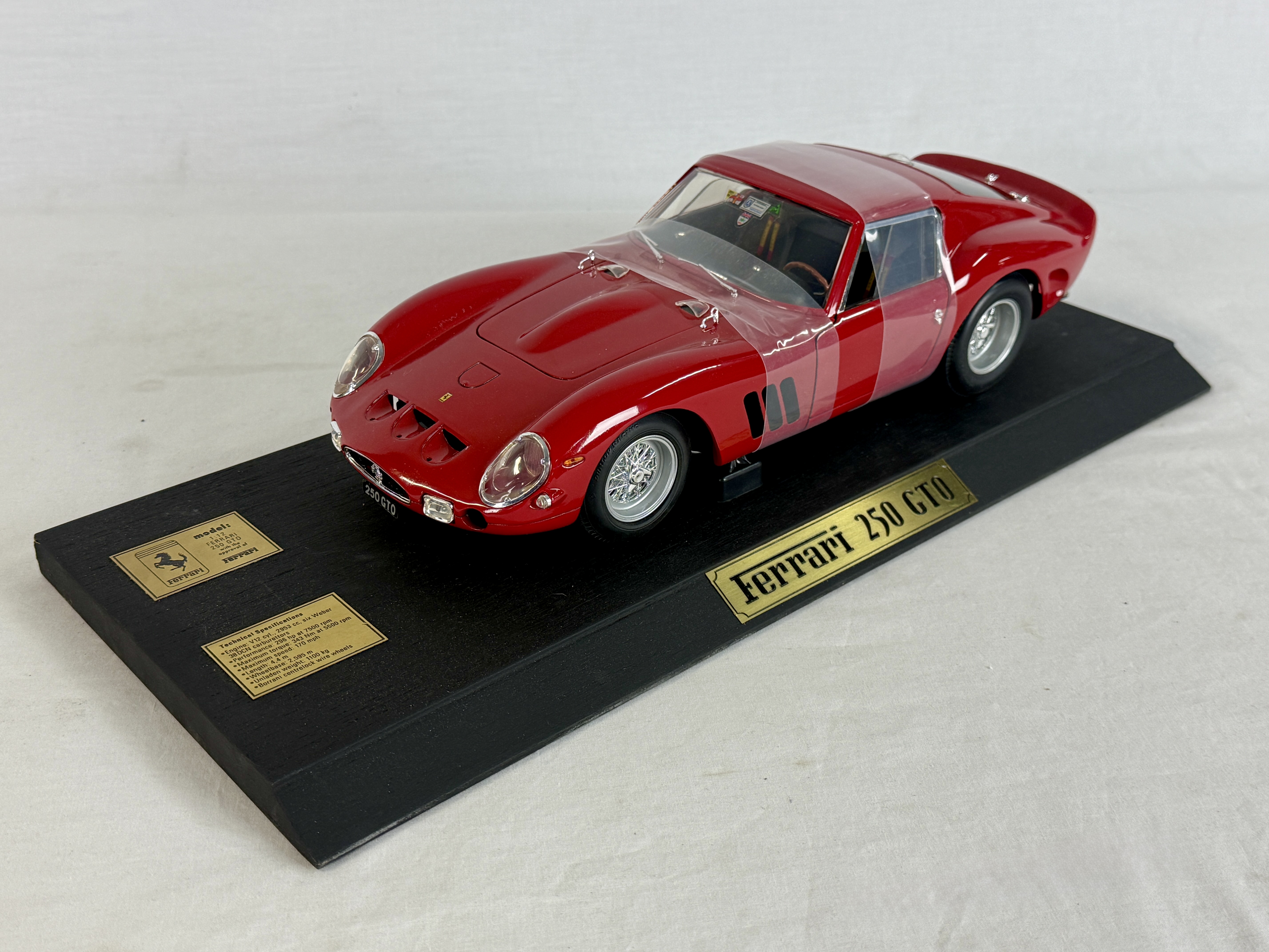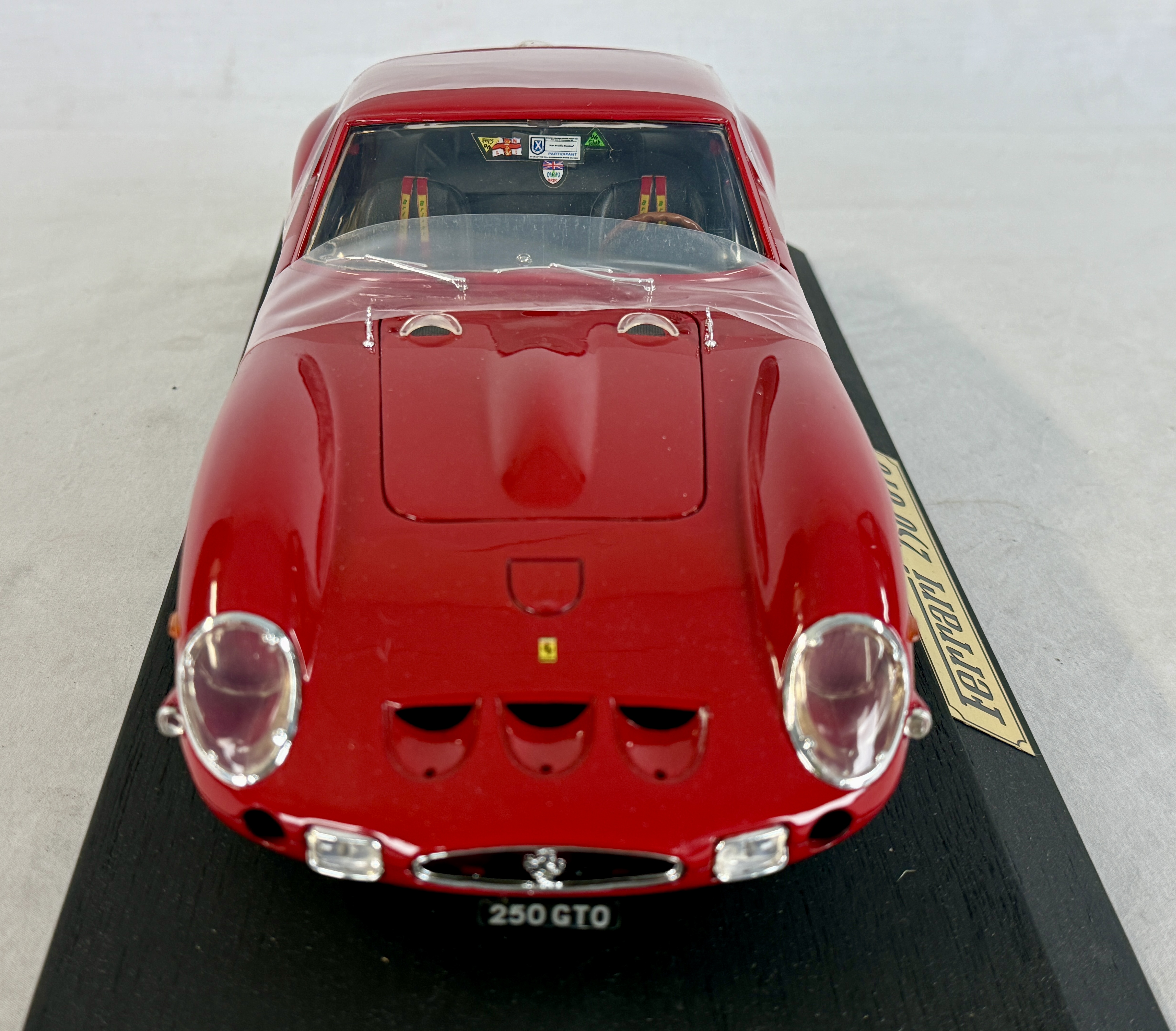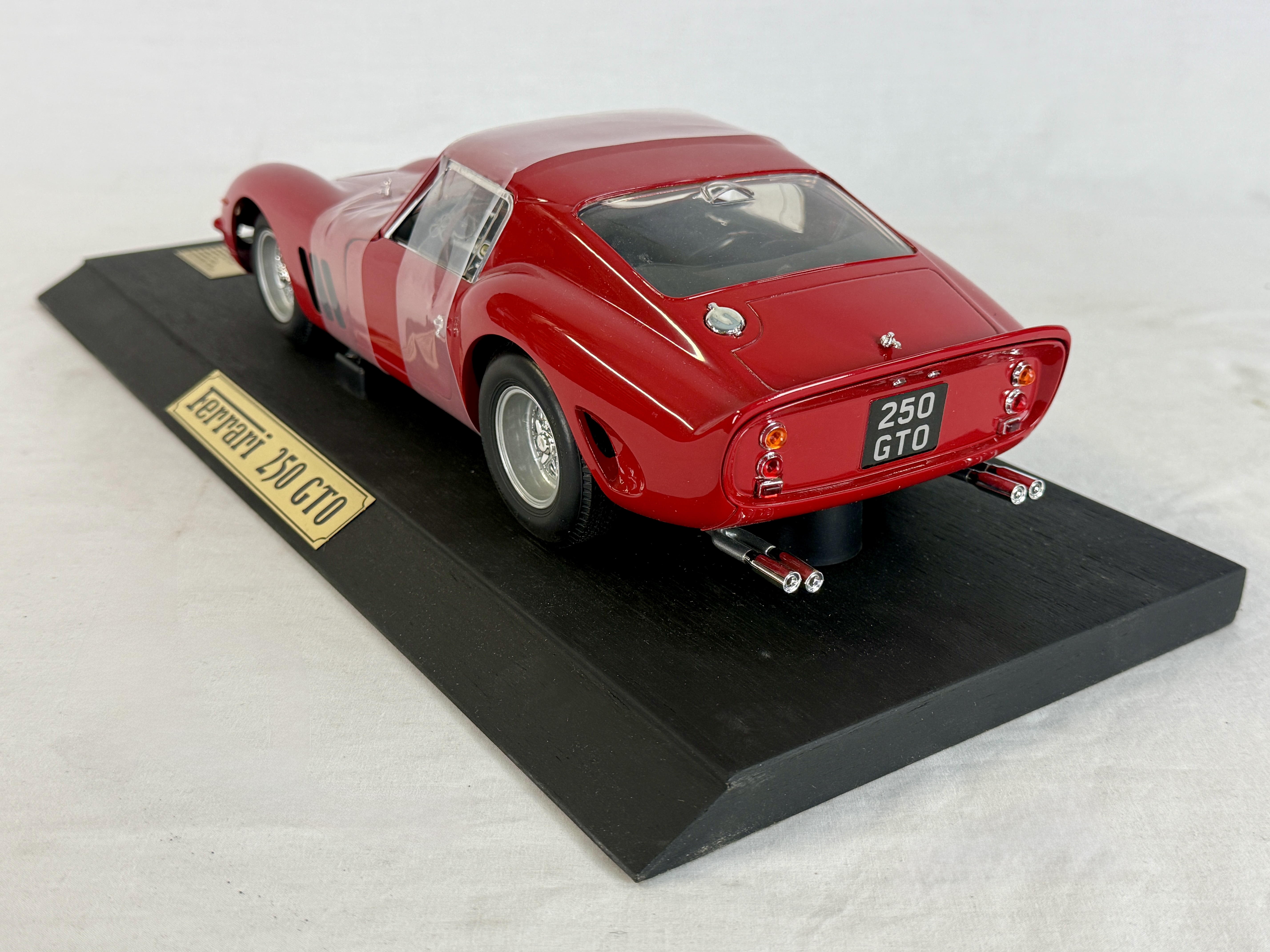 A red 1:12 scale die-cast metal model of a 1964 Ferrari 250 GTO mounted on a black display base with original packaging. 14″ long OB and shipping box C9.