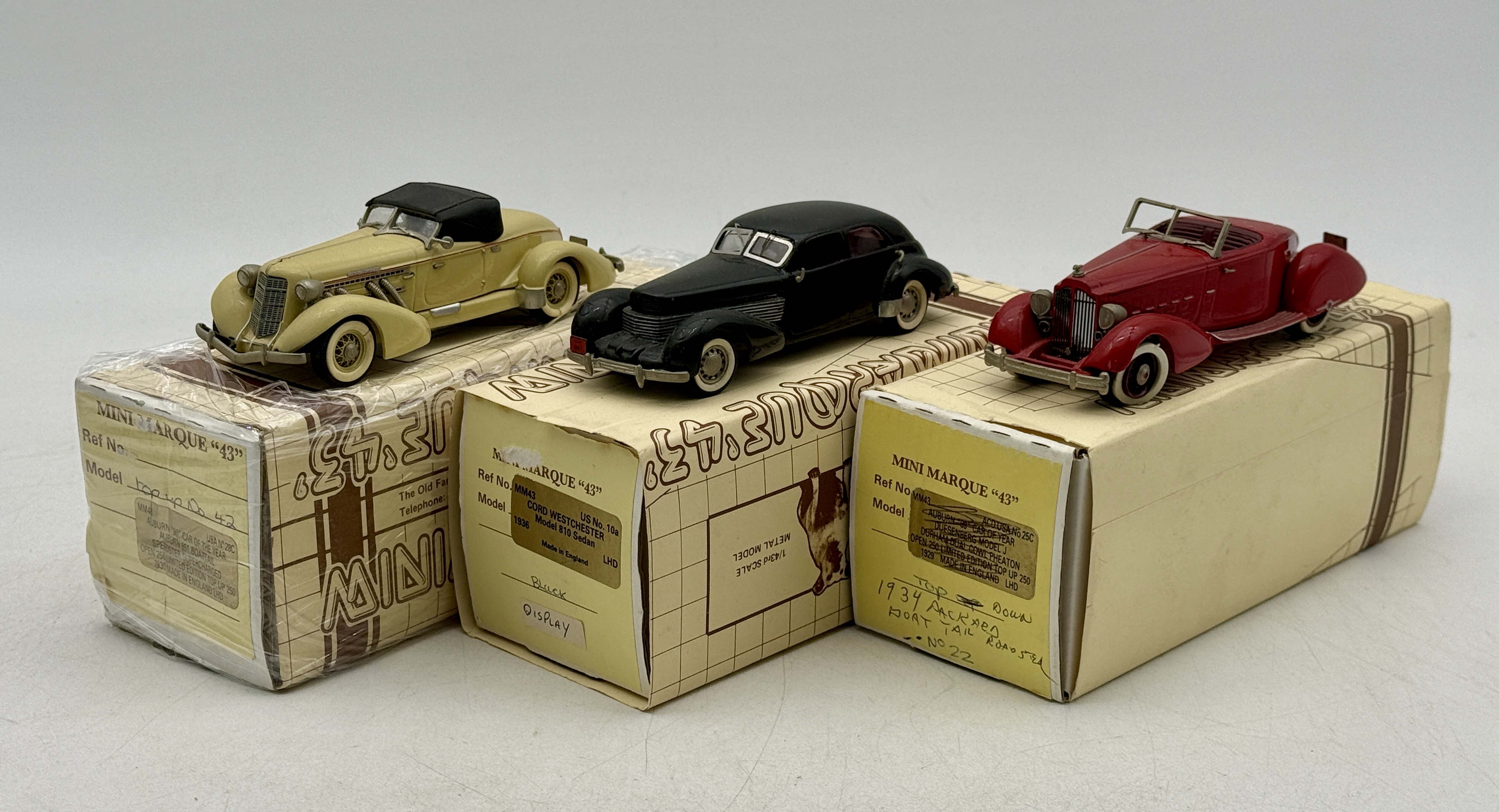 A trio of 1:43 scale white metal models in yellow, black, and red including a #28c  Auburn 851 Speedster, a #10a 1936 Cord 810 Sedan, and a #22 1934 Packard Roadster with original boxes. OB’s mw C7-8.