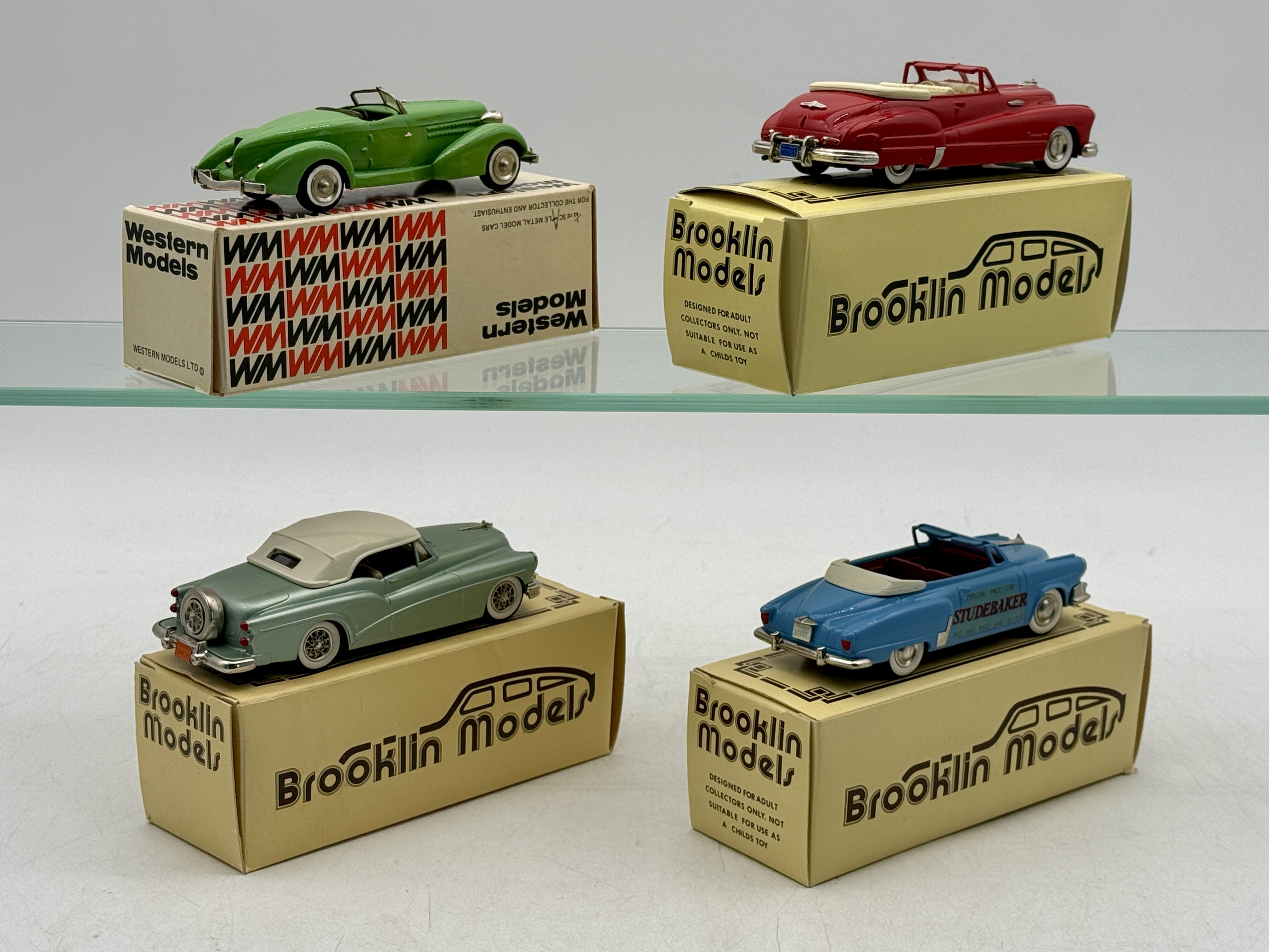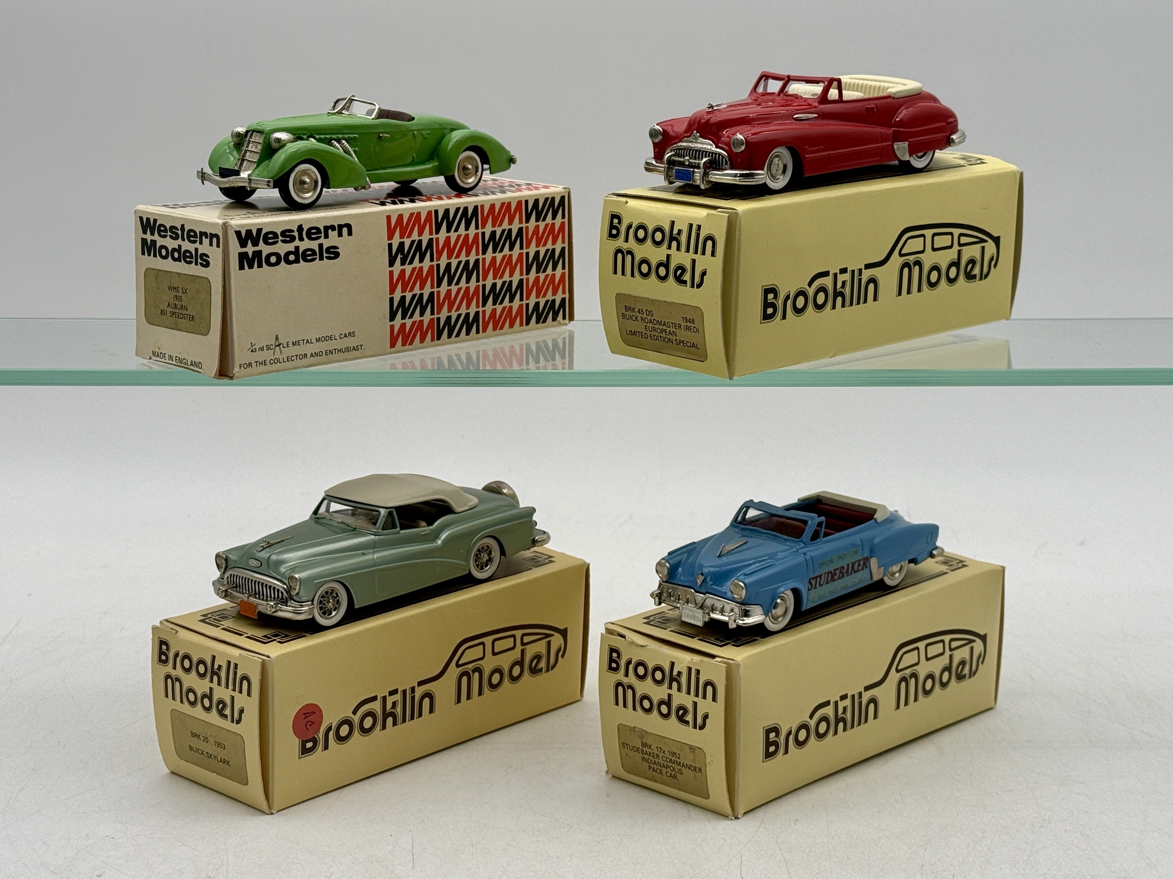 A collection of four boxed white metal model cars including a Western Models WMS-5x 1935 Auburn 851 Speedster and three Brooklin Models featuring a 1948 Buick Roadmaster BRK45DS, a 1953 Buick Skylark BRK20, and a 1952 Studebaker Commander Indianapolis Pace Car BRK17x. OB’s MW C8-9.