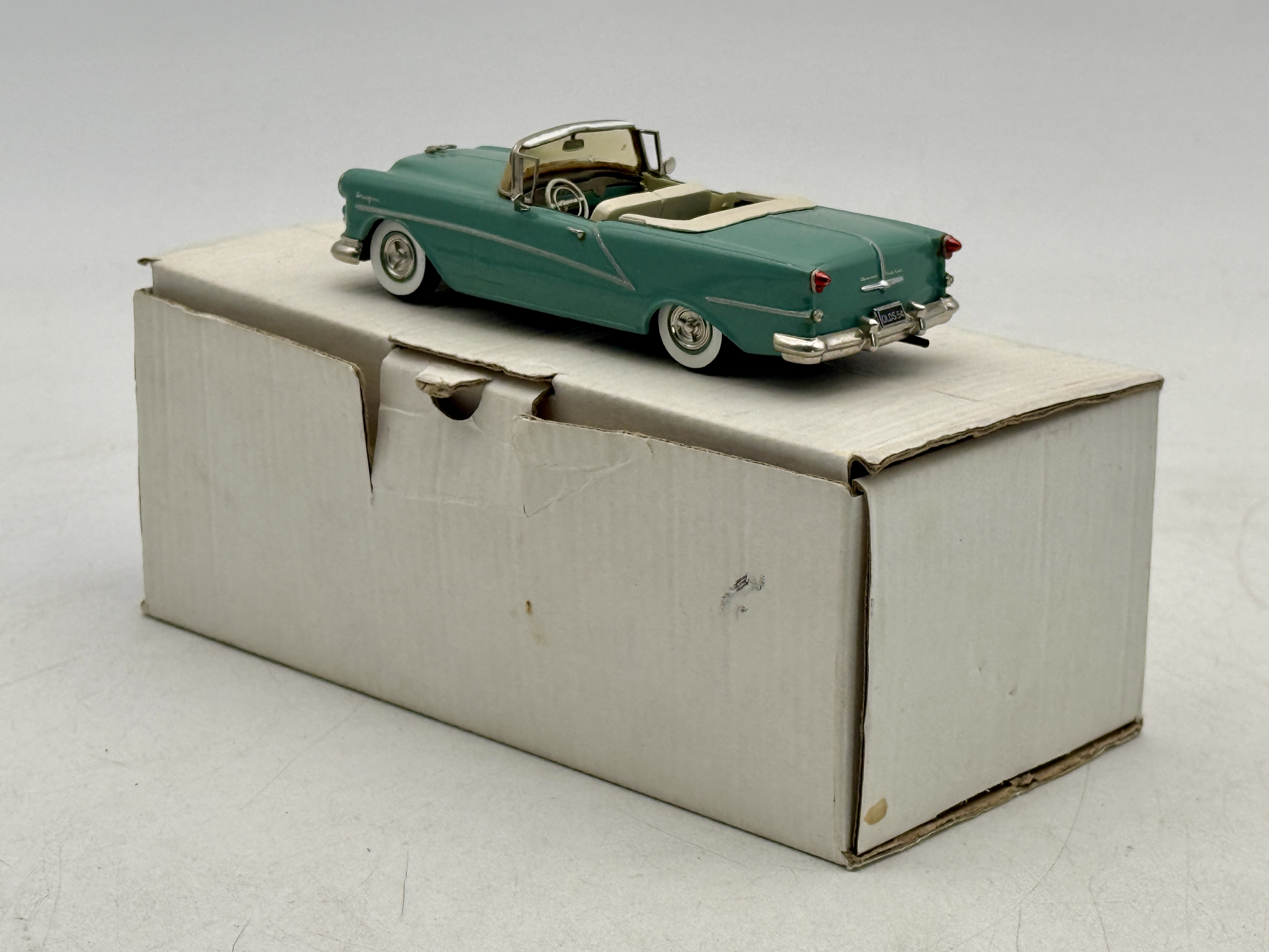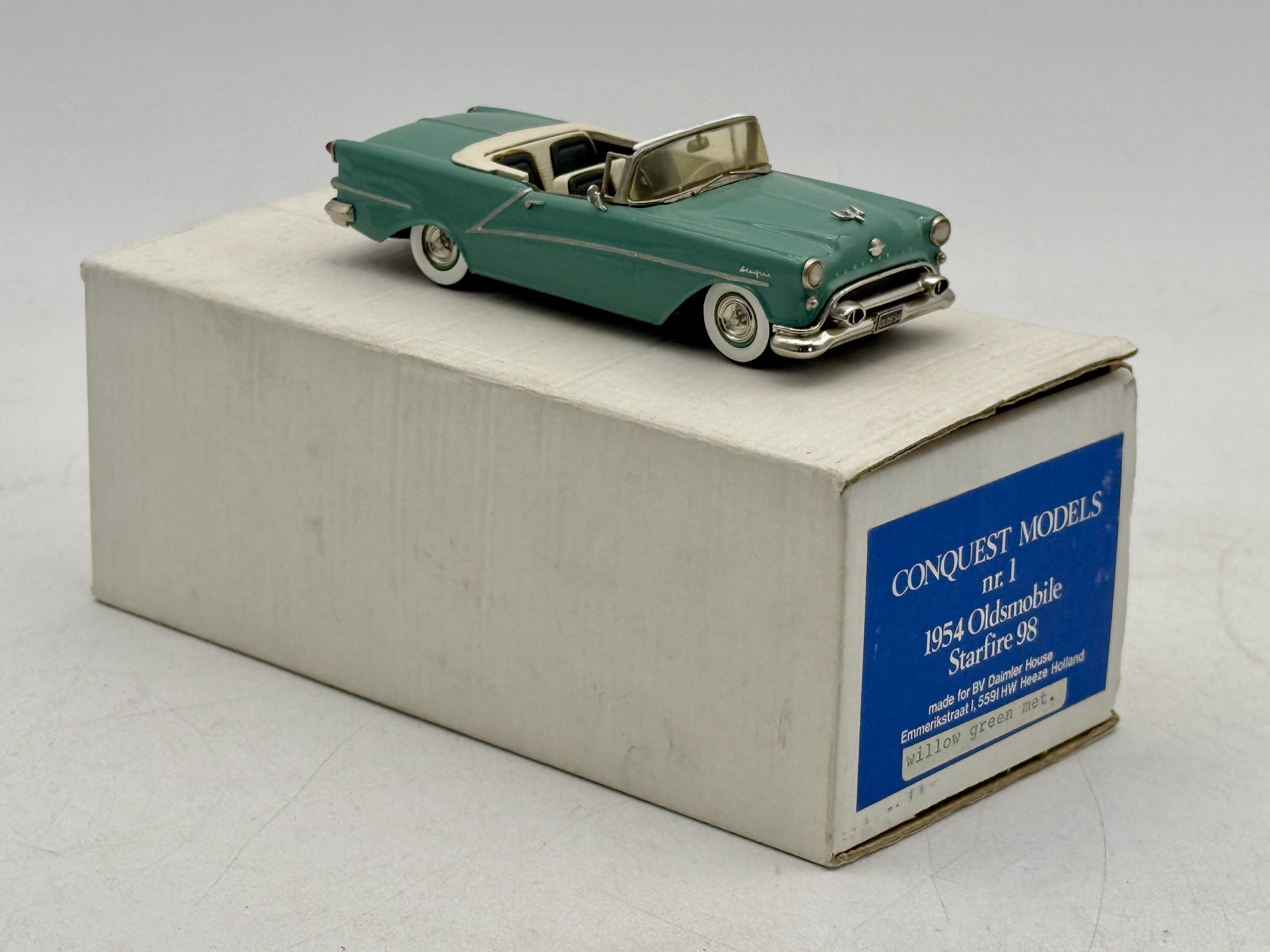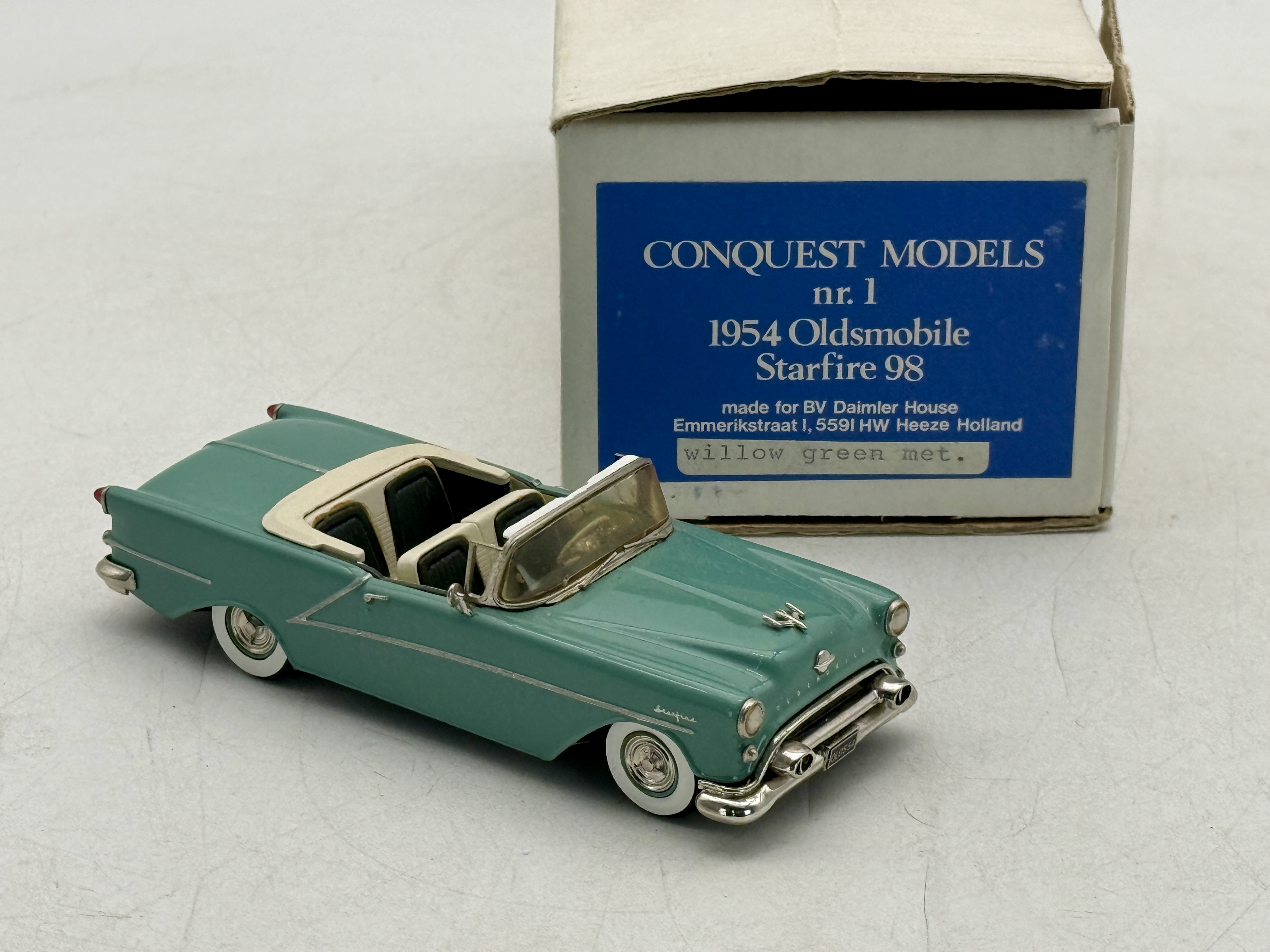 A willow green metallic and white 1954 Oldsmobile Starfire 98 model car by Conquest Models with its original box. white metal, 1:43 scale, OB mw C9.