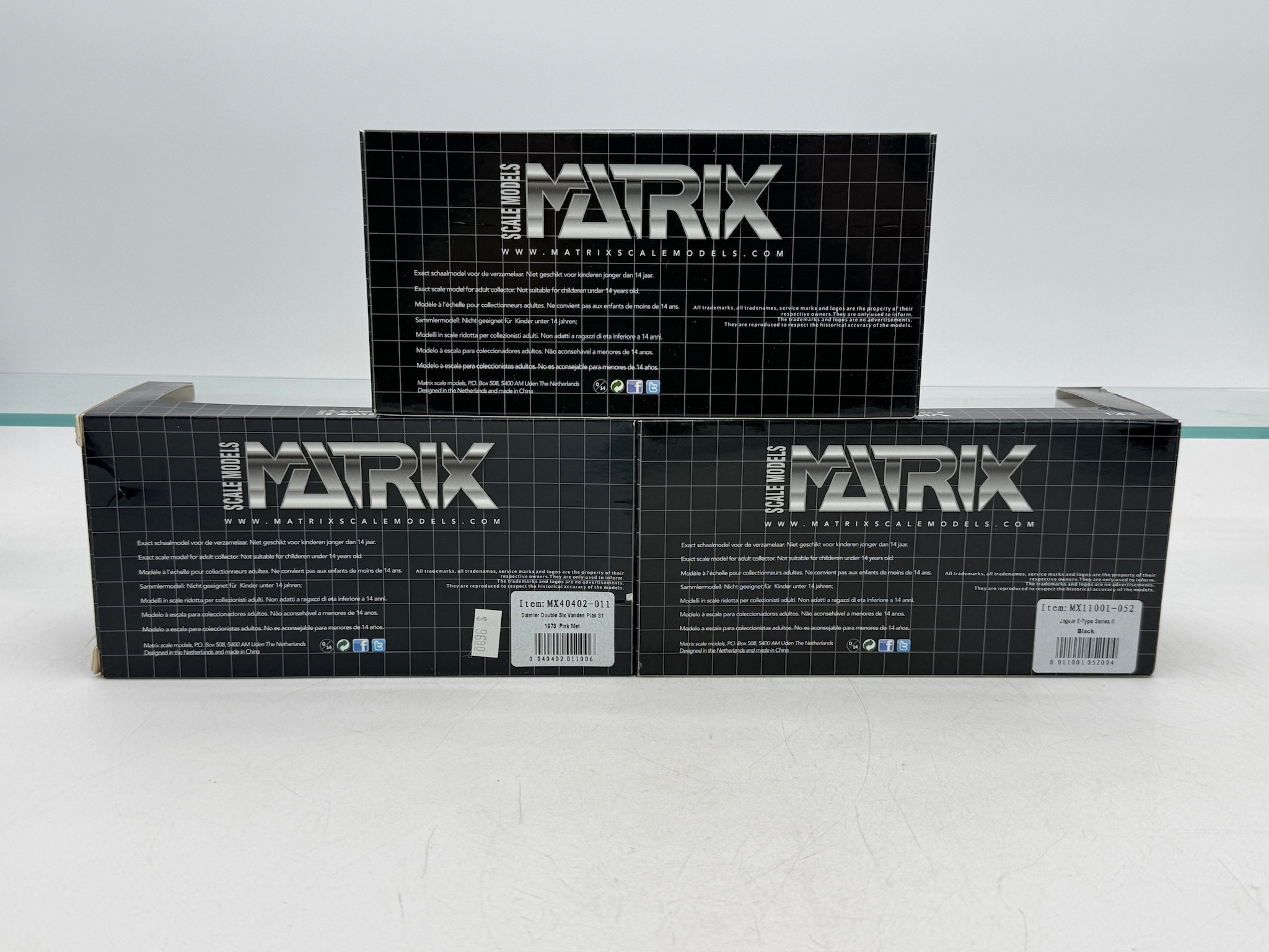 3 1:43 scale model vehicles including a pink 1973 Daimler Double Six MX 40402–011, a black Jaguar E-Type MX 11001–052, and a 1956 Bentley Packward (missing label) , all in original display boxes. OB and inserts C9.