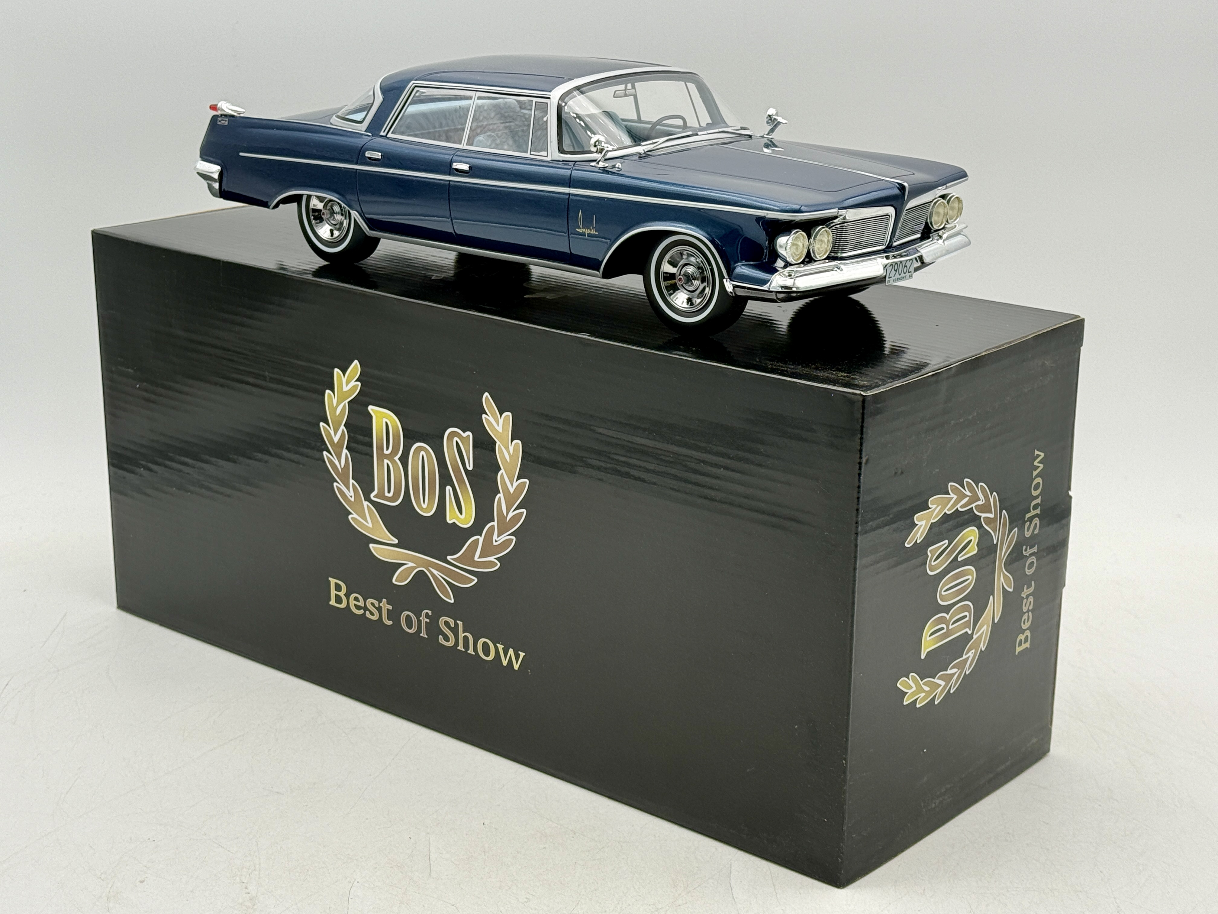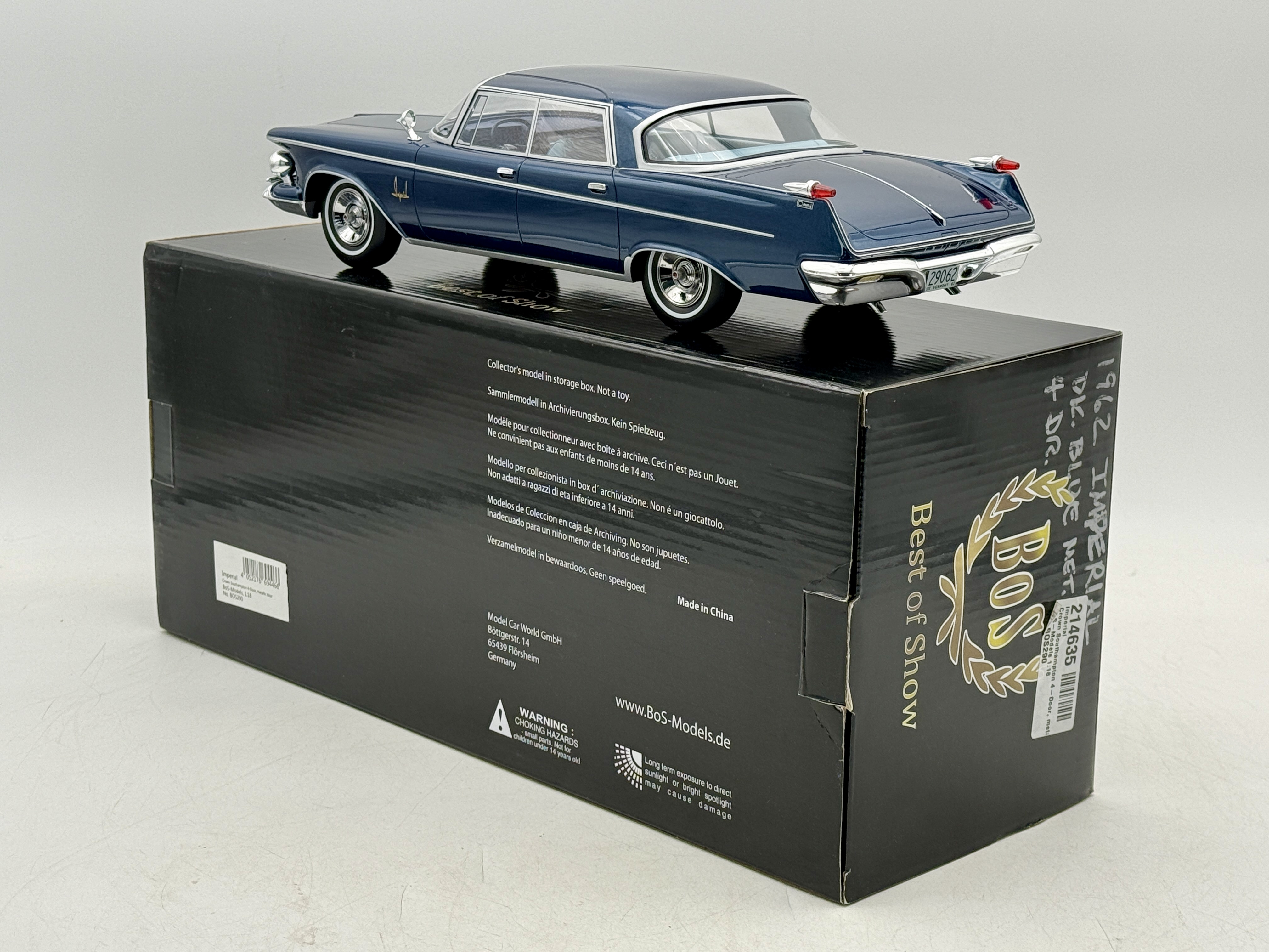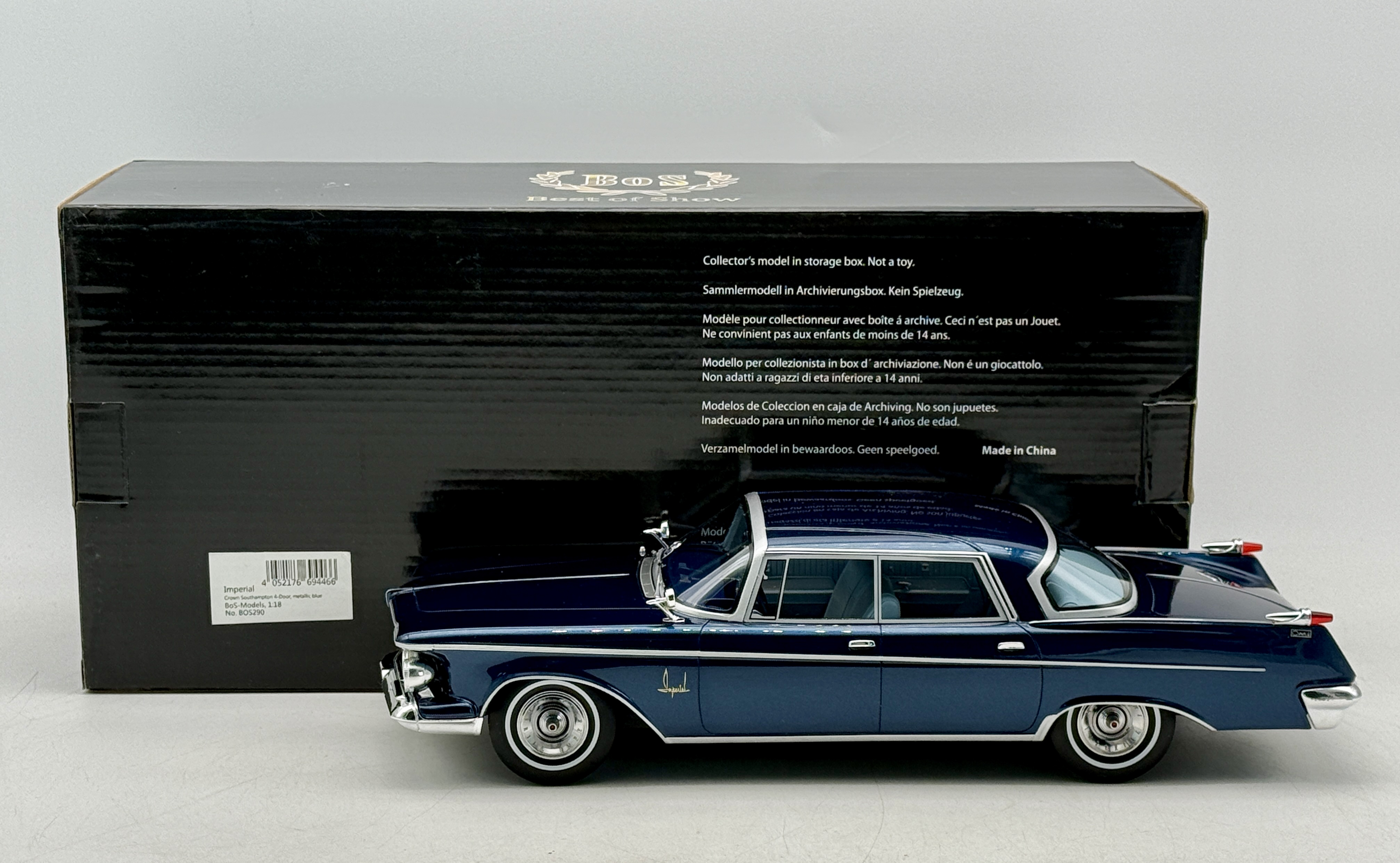 A dark blue metallic 1:18 scale model of a 1962 Imperial Crown Southampton 4-door sedan with its original BoS box. resin, 12.5″ long #406 of 504, OB mw C9.