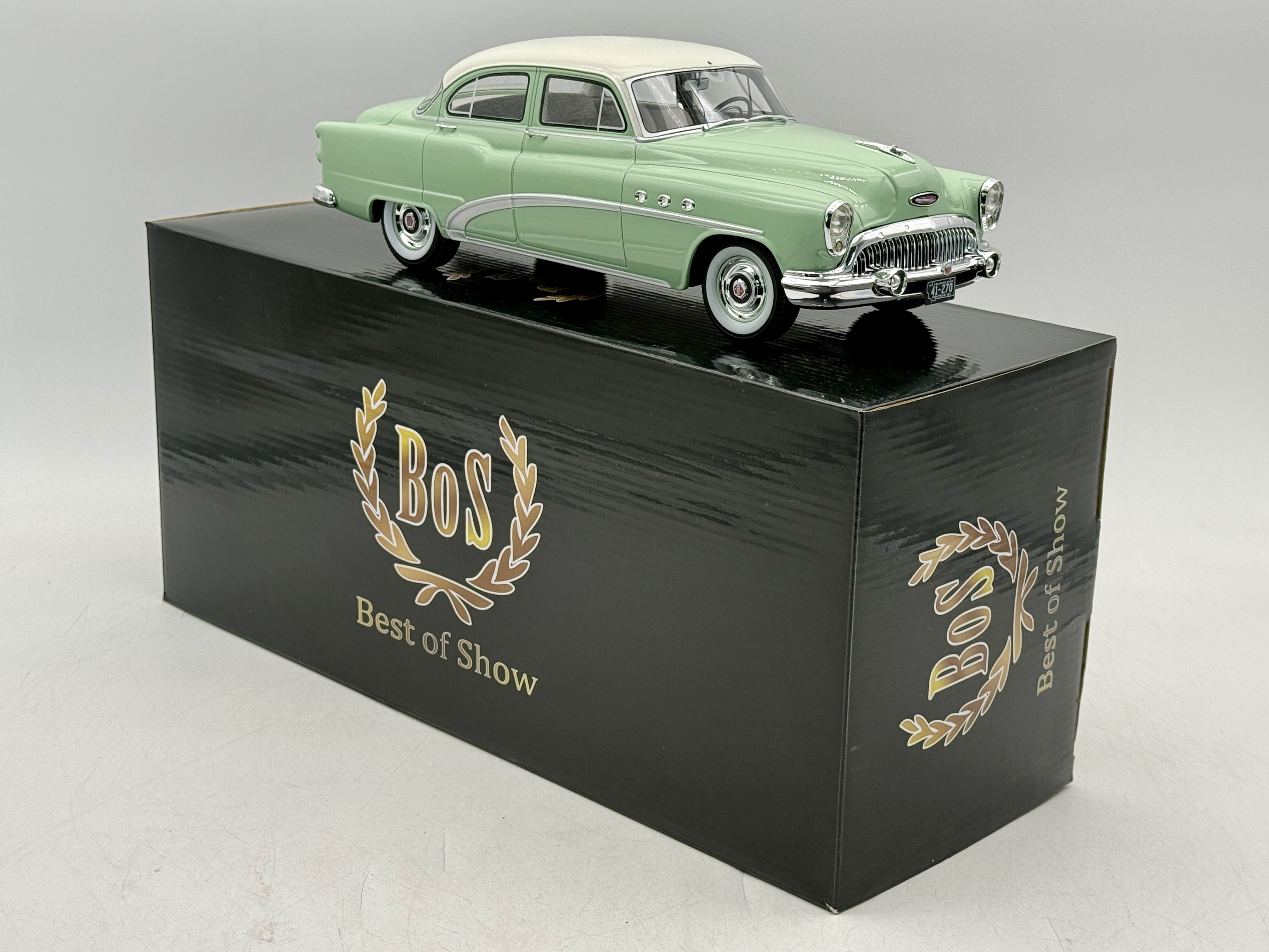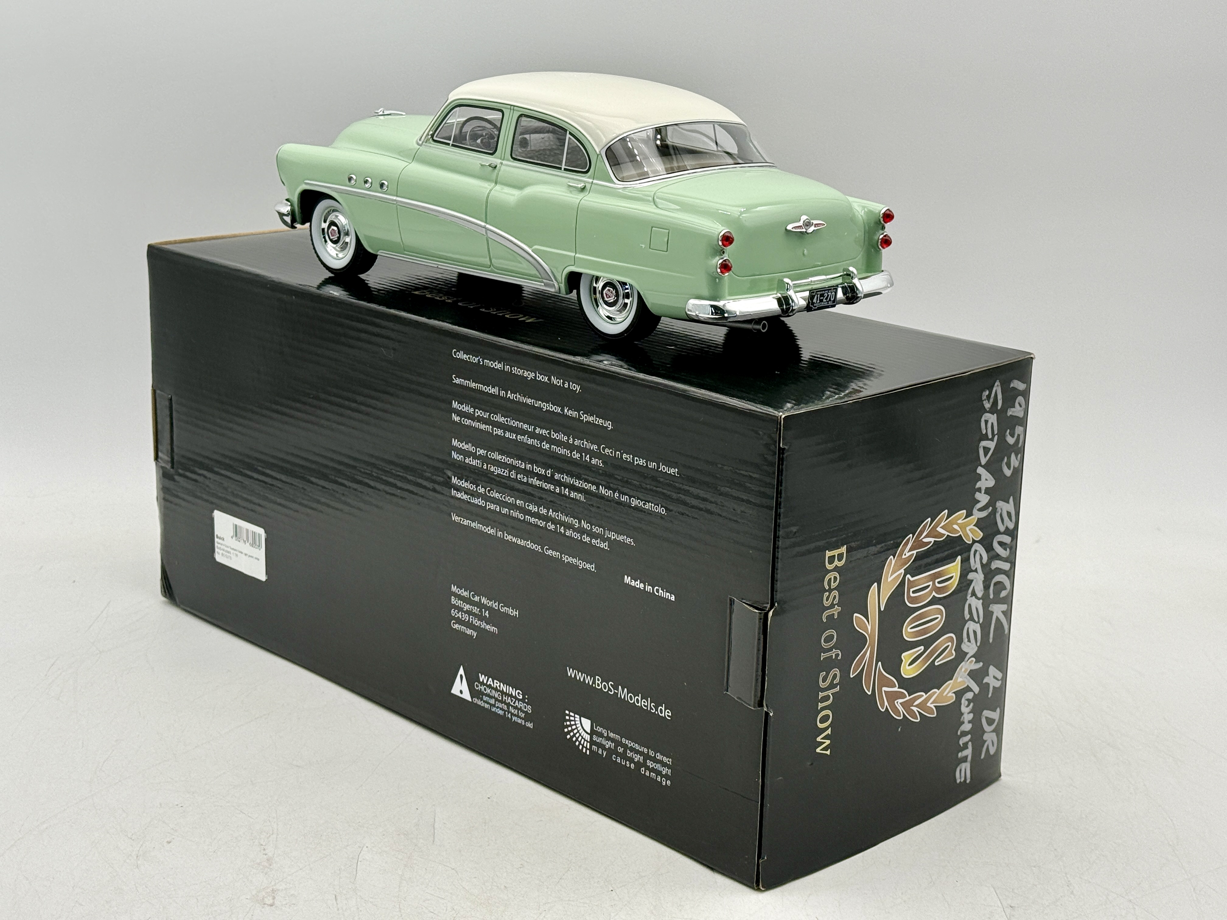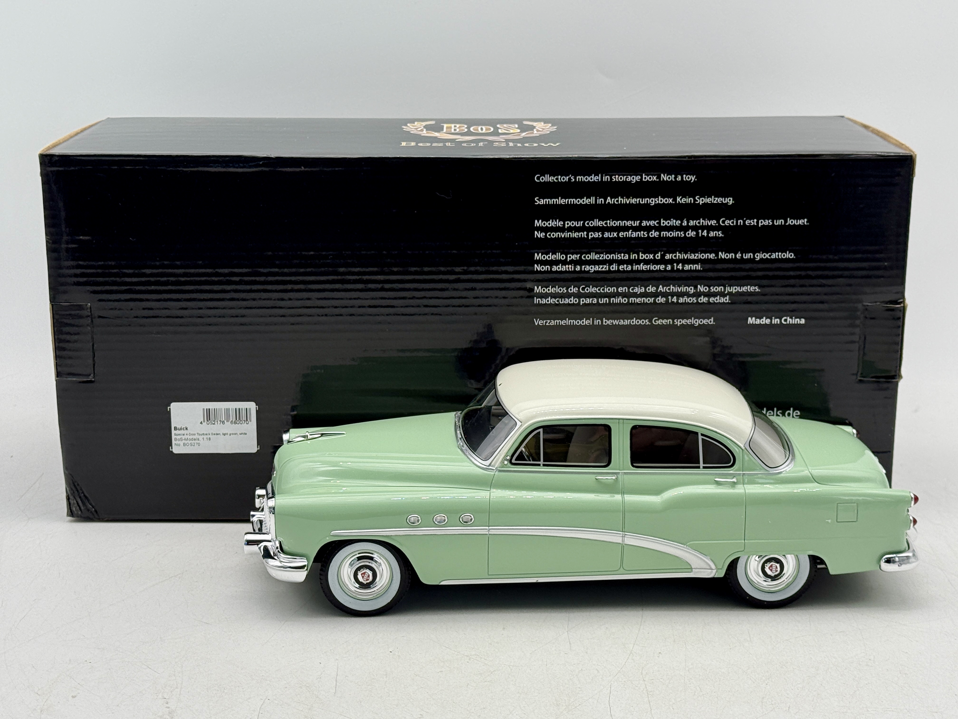 A 1:18 scale resin model of a 1953 Buick Special 4-Door Tourback Sedan in light green and white with its original box. 11″ long #68 of 504 OB mw C9.