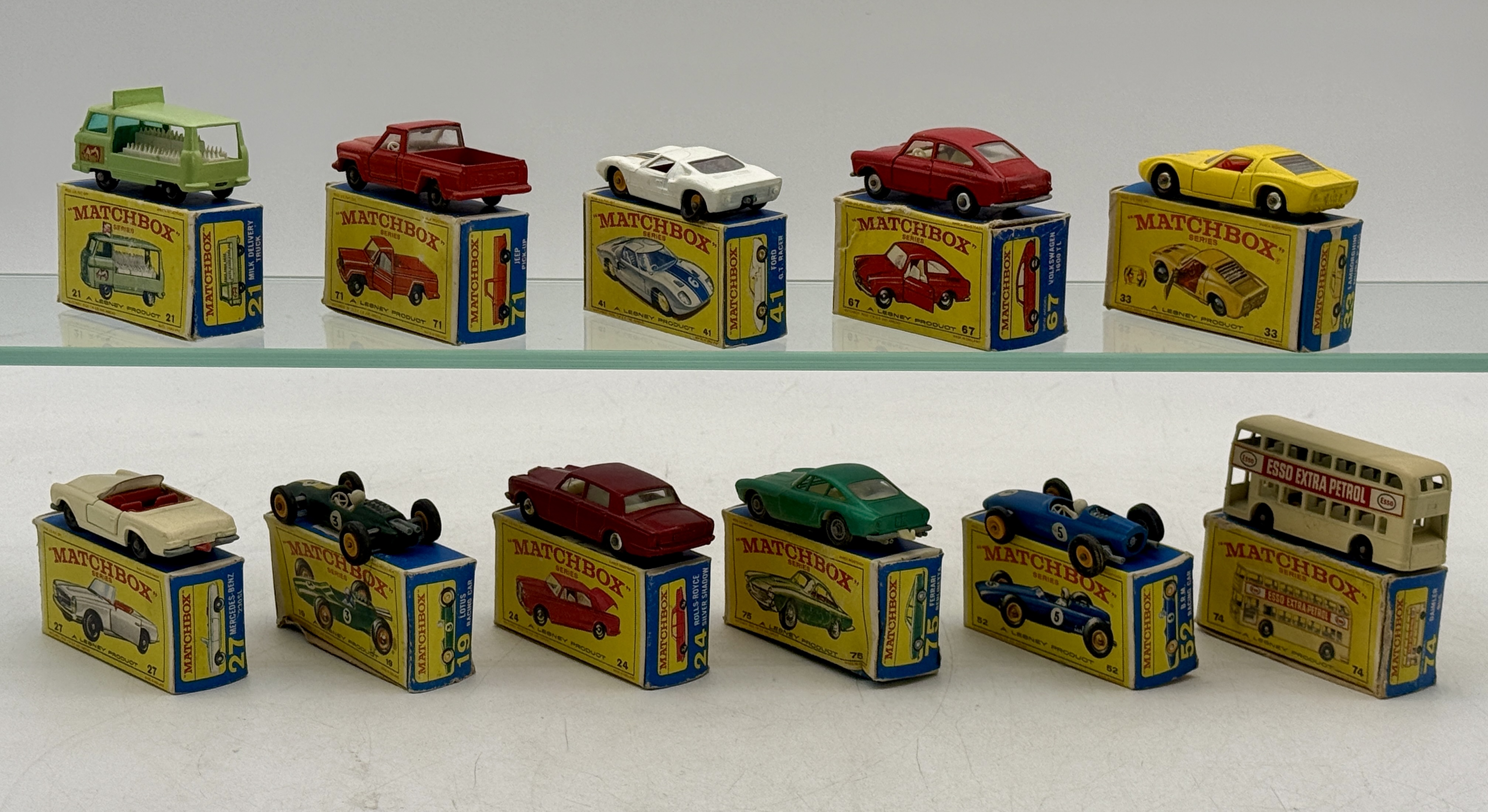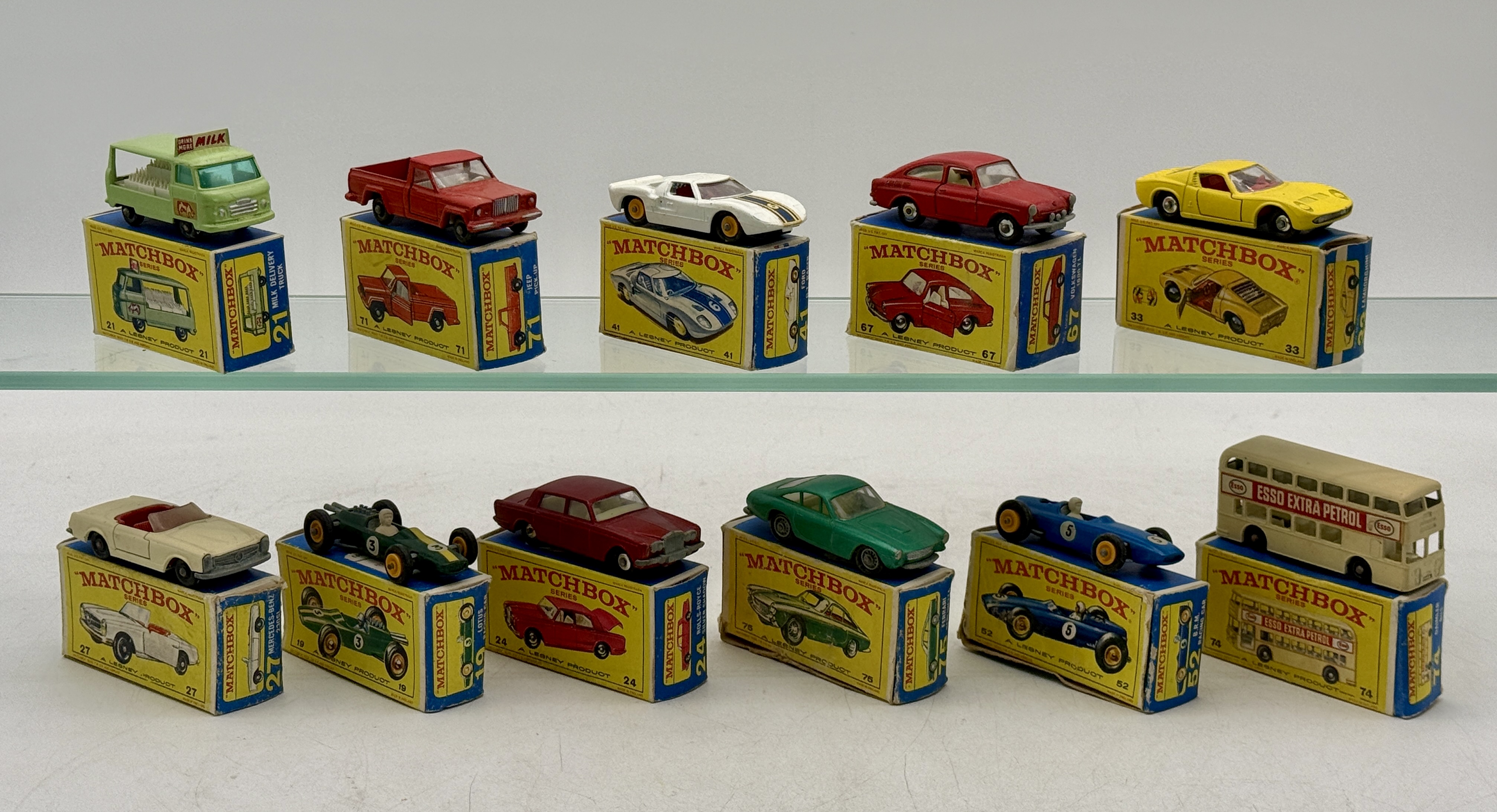11 Lesney Matchbox Series die-cast toy vehicles including: 21C8 milk truck, 71B2 Jeep, 41C2 four GT, 67B2 Volkswagen, 33C2 Lamborghini, 27D1 Mercedes, 24C1 Rolls-Royce, 75B2 Ferrari, 19D3 lotus, 52B1BRM, 74B1 bus, OB’s worn C6-8.