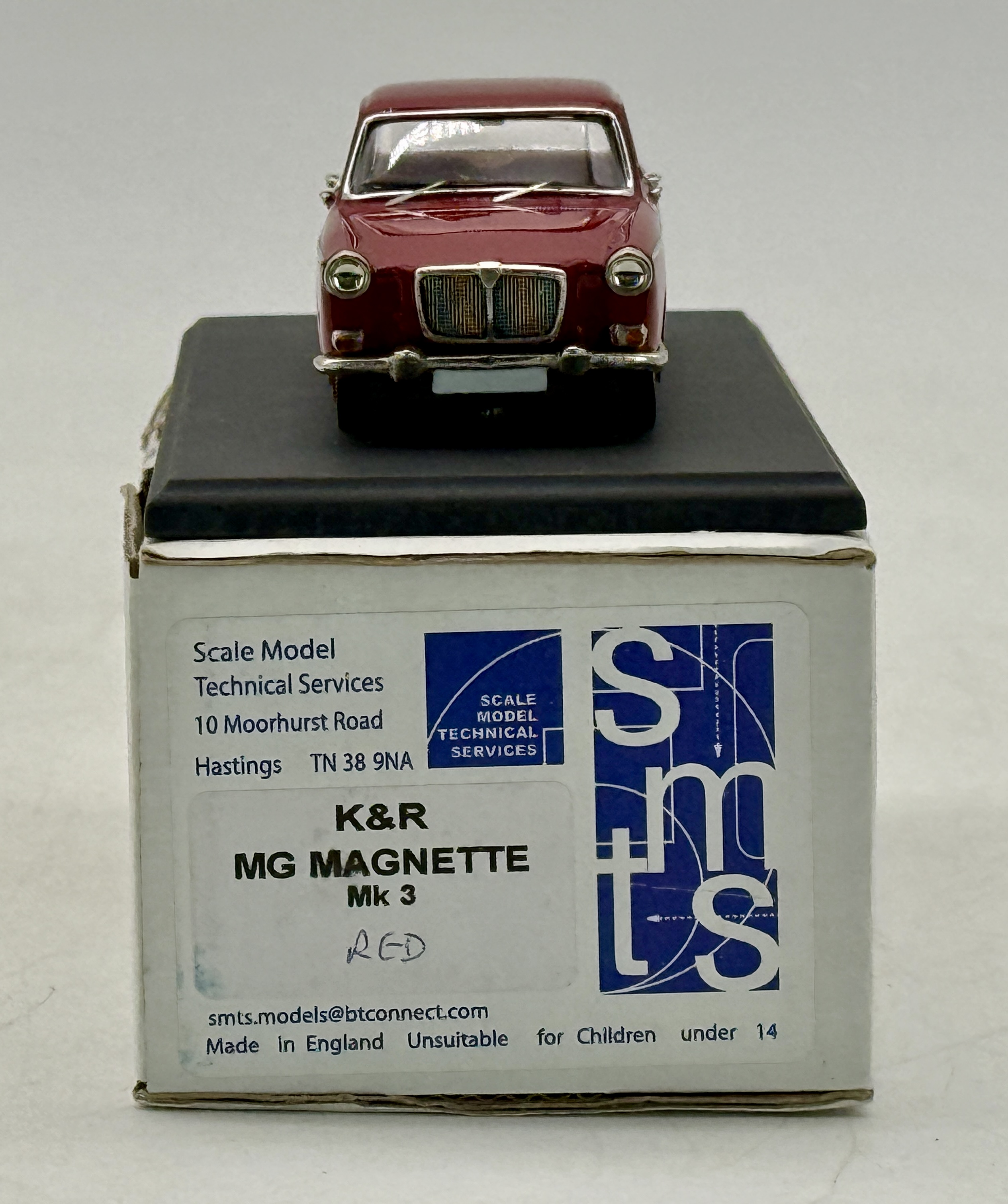A red 1:43 scale, white metal, K&R MG Magnette Mk 3 model car by Scale Model Technical Services (SMTS) including its original box and display base. OB C9.